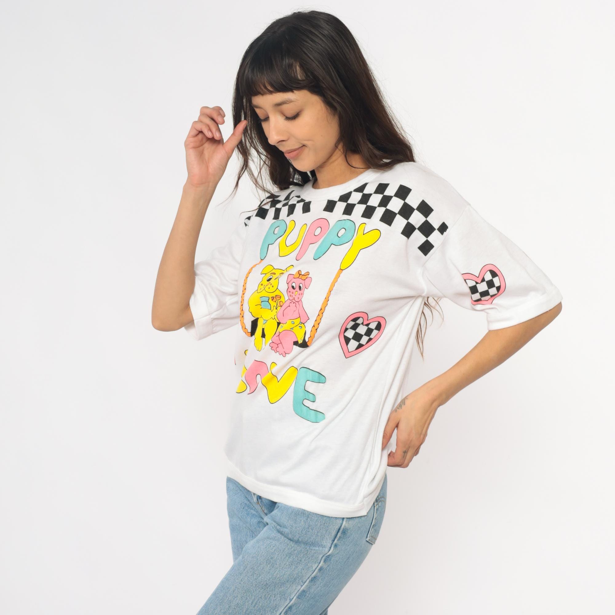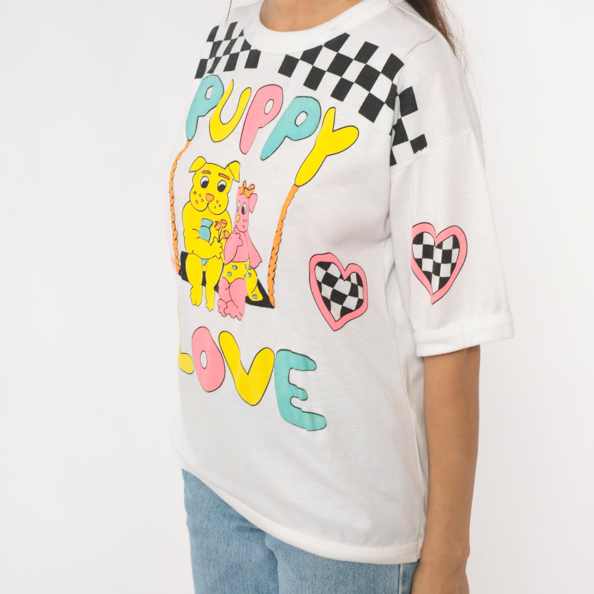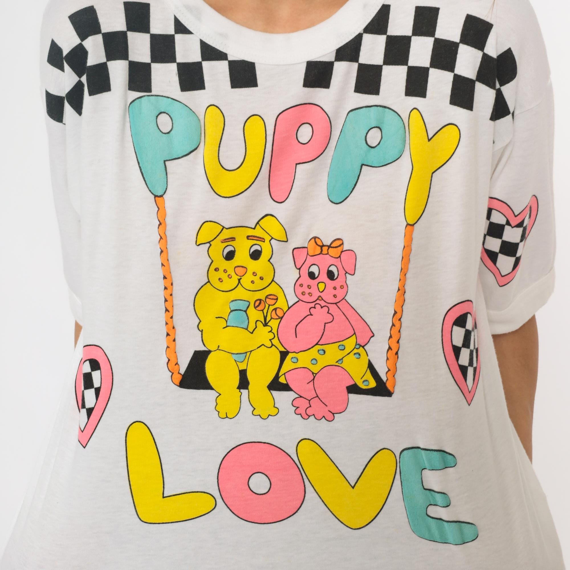 90s white graphic tee from just the three pf us with "PUPPY LOVE" text in multicolored bubble letters and two cartoon puppies on a swing. Black and white checkered racing flag pattern across shoulders and pink checkered hearts on sleeves. Short sleeves with rolled cuffs.
