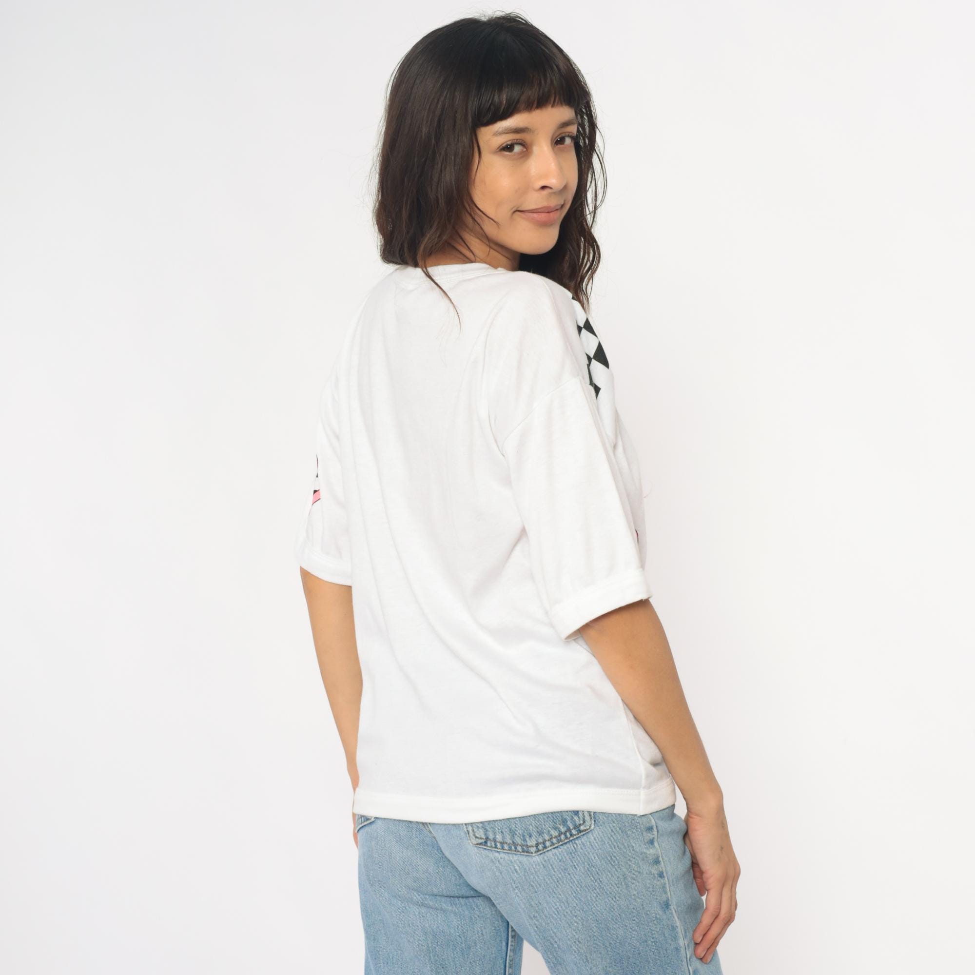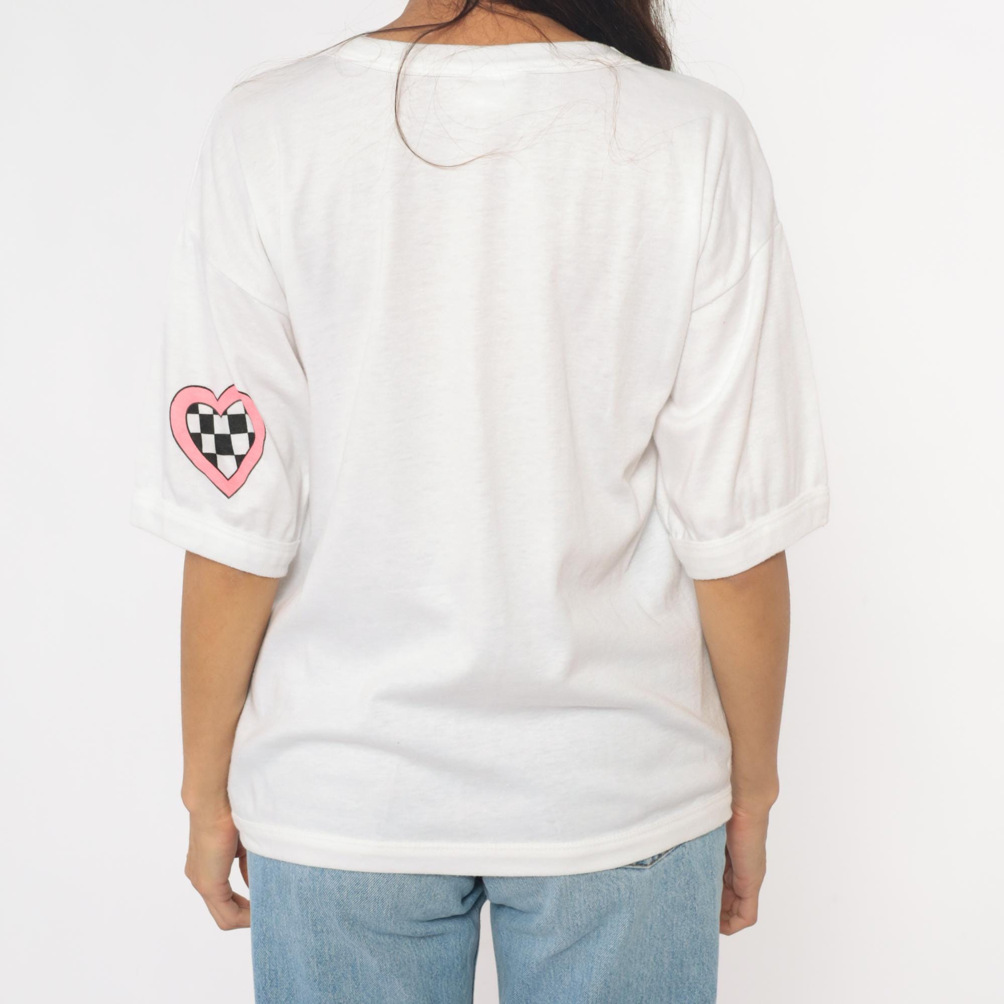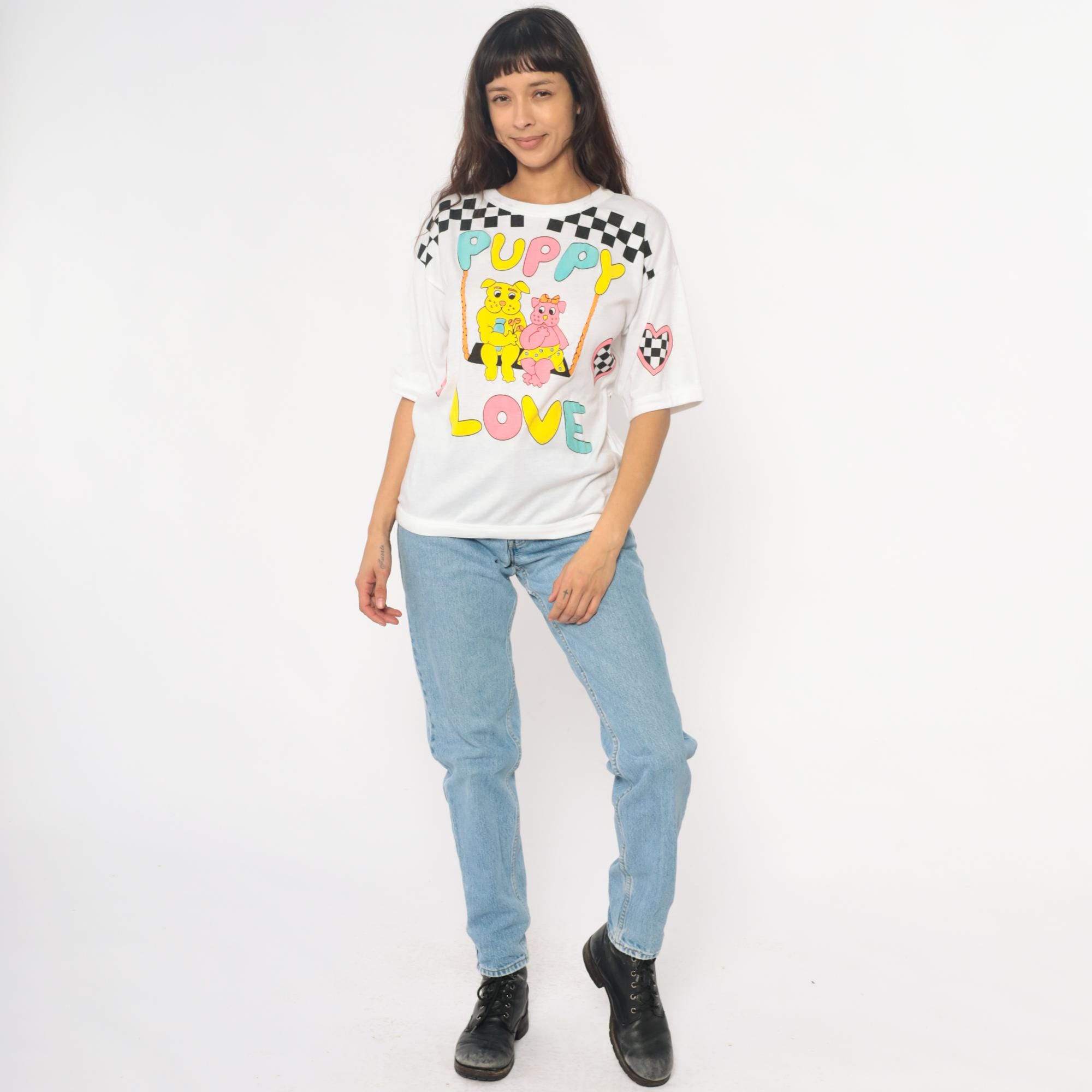 90s white graphic tee from just the three pf us with "PUPPY LOVE" text in multicolored bubble letters and two cartoon puppies on a swing. Black and white checkered racing flag pattern across shoulders and pink checkered hearts on sleeves. Short sleeves with rolled cuffs.