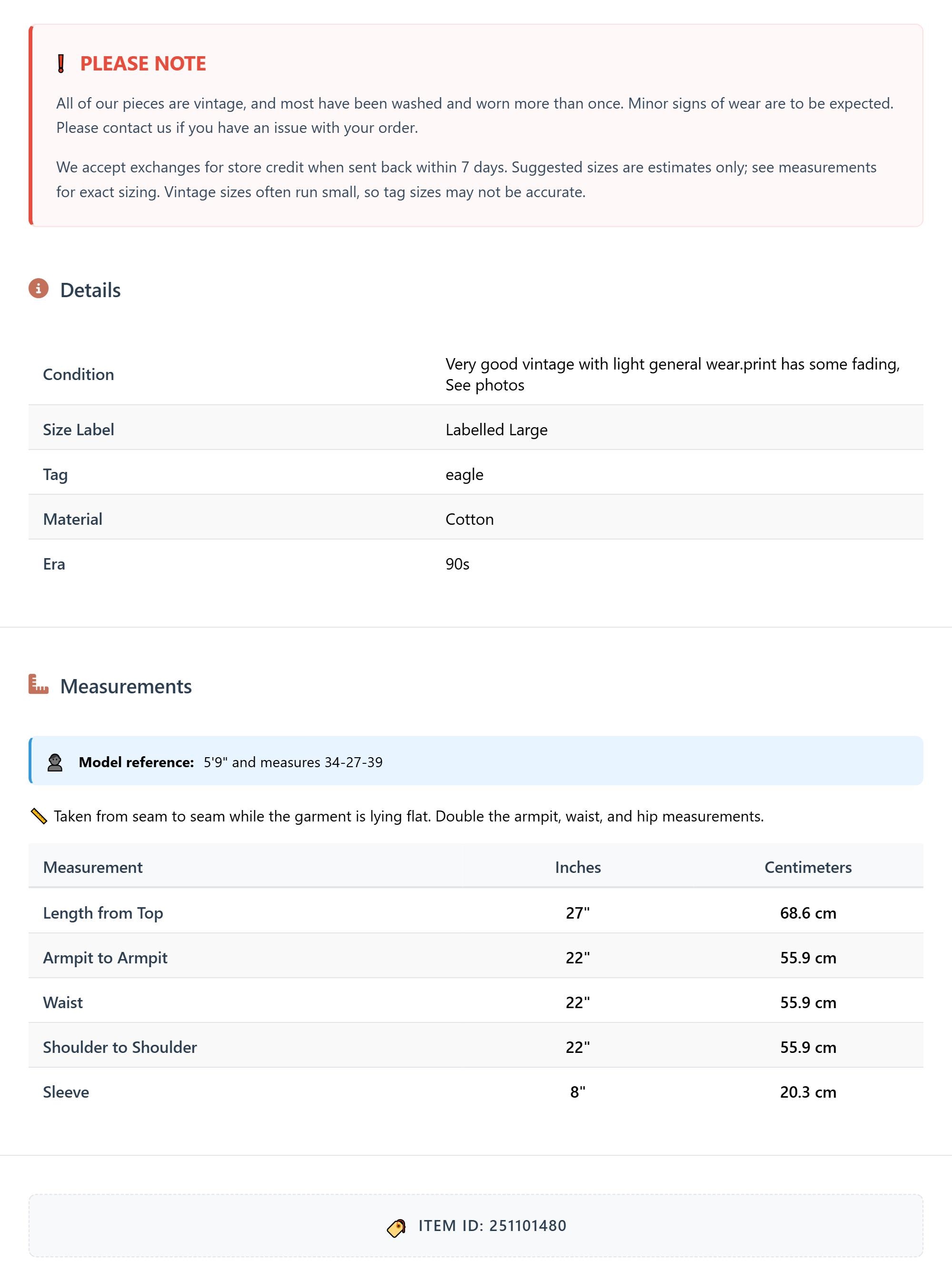 All of our pieces are vintage, and most have been washed and worn more than once. Minor signs of wear are to be expected. Please contact us if you have an issue with your order. We accept exchanges for store credit when sent back within 7 days.