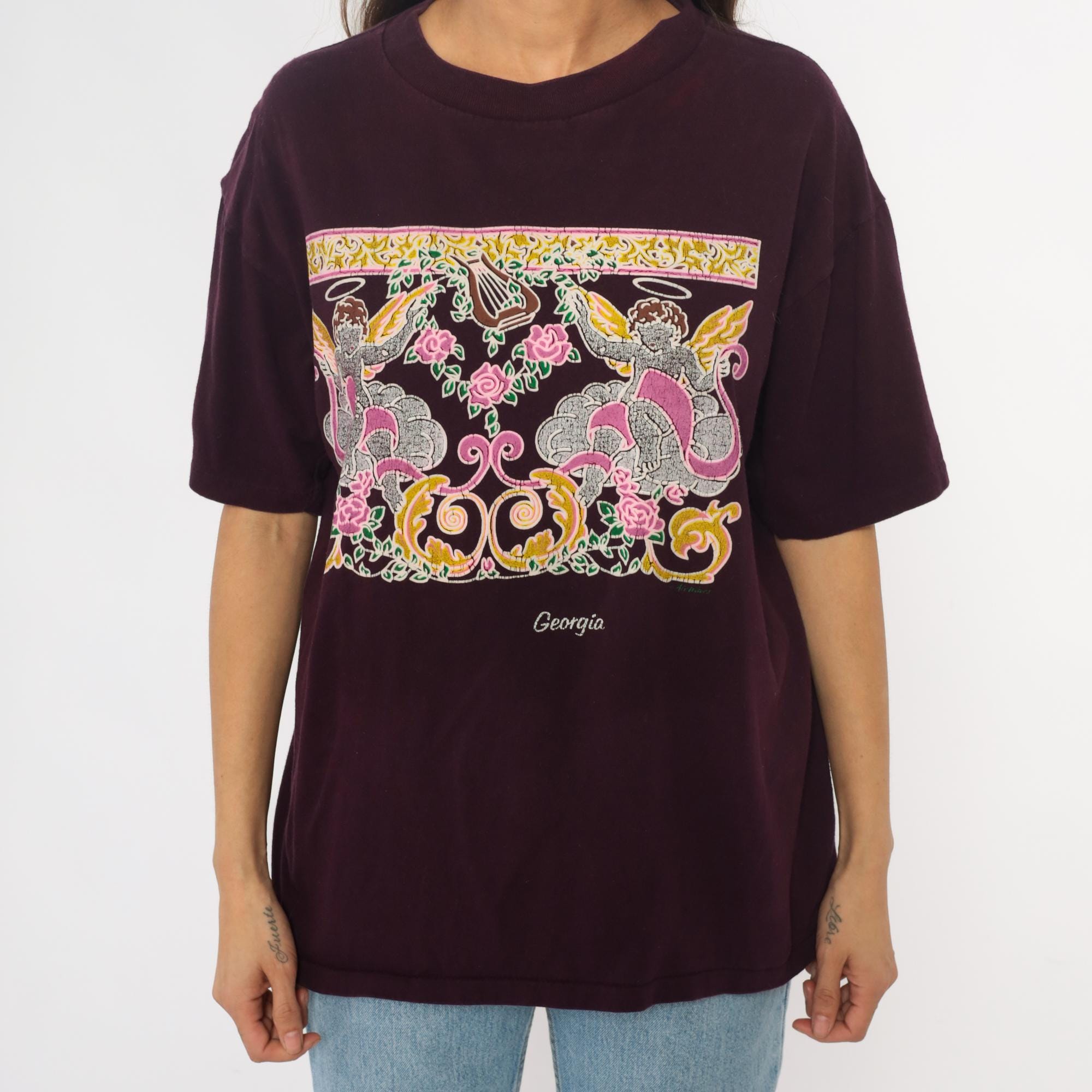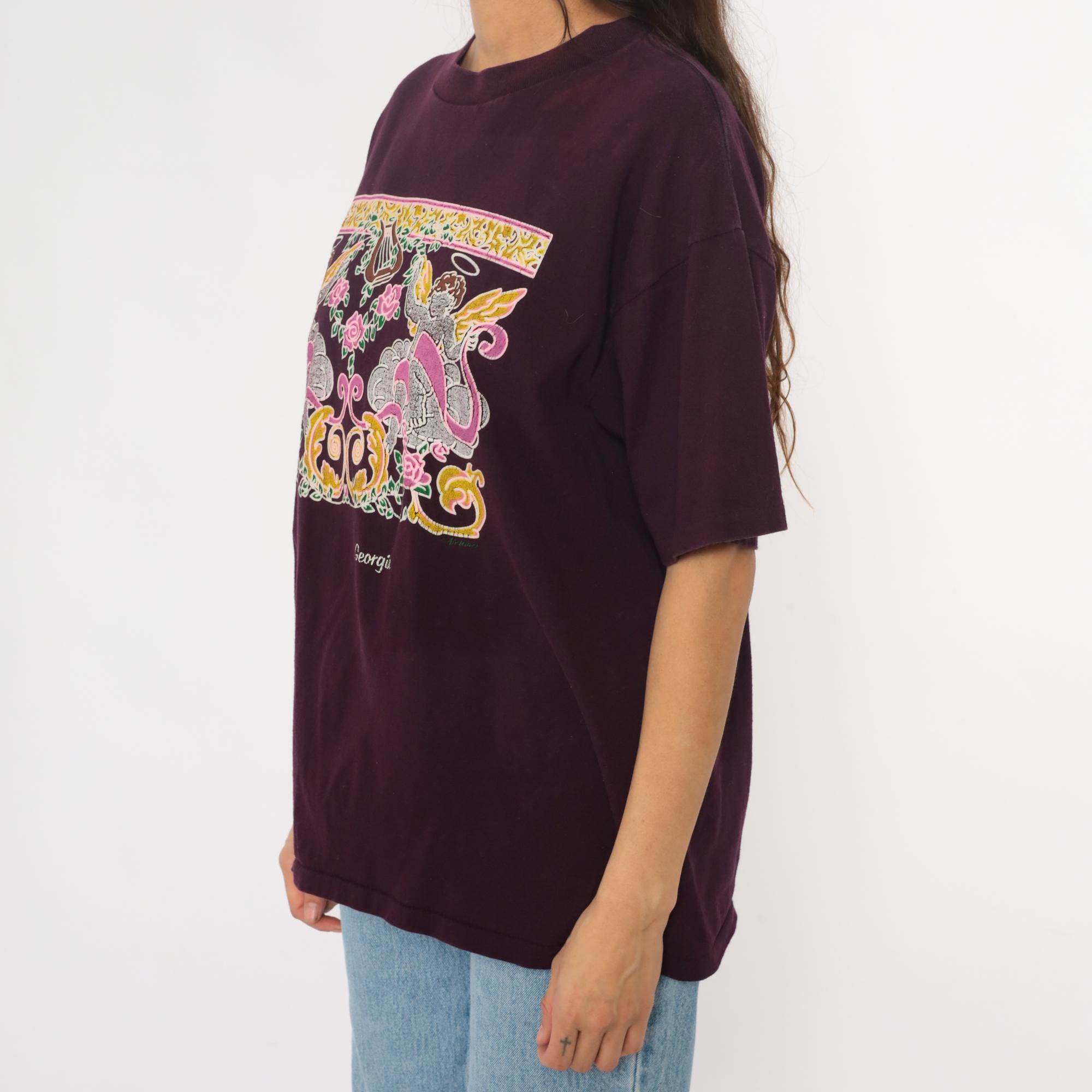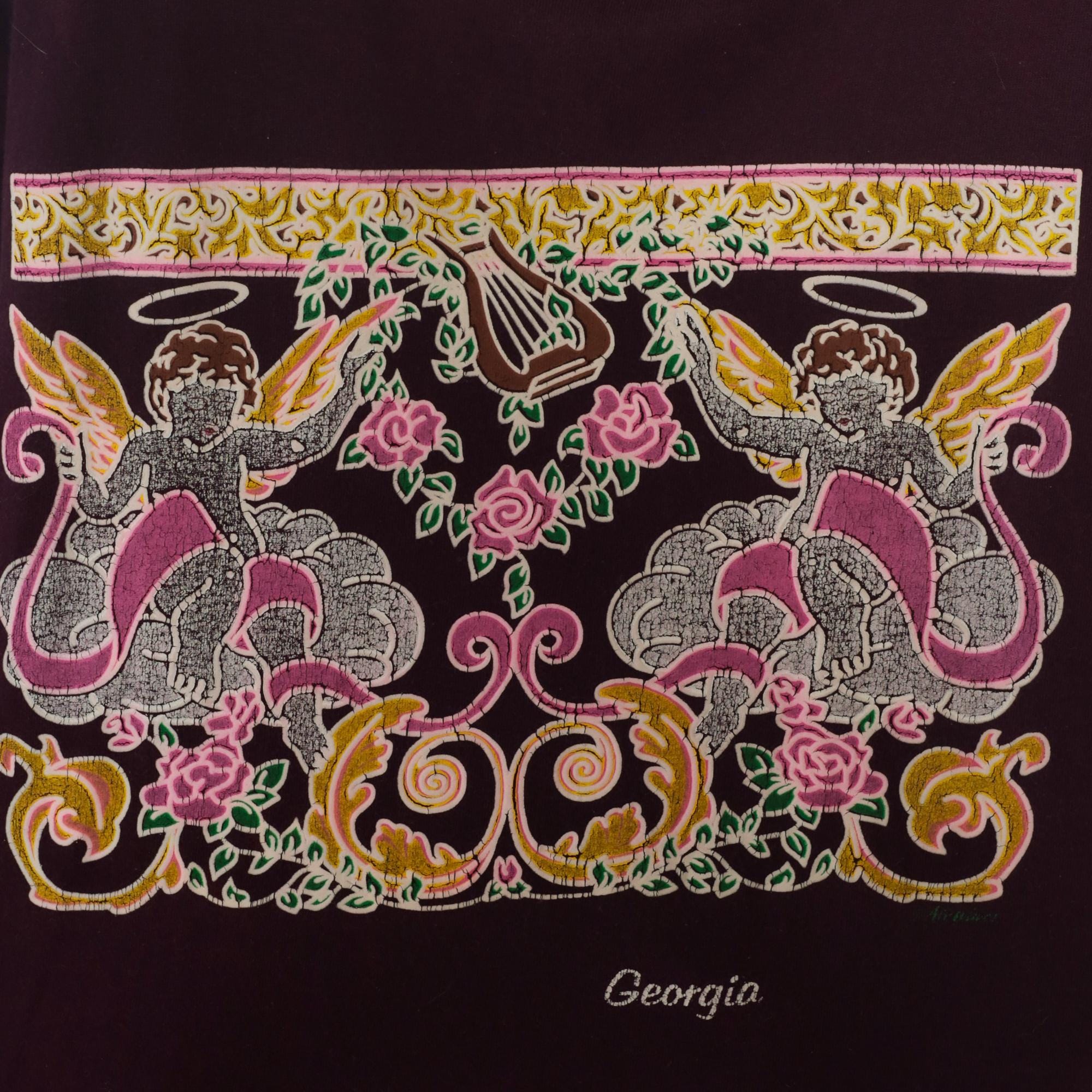 90s burgundy graphic tee from eagle featuring ornate print with angels, wings, roses, and decorative scrollwork with "Georgia" text below. Short sleeves, crew neckline, all-over design in pink, yellow, green, and cream against dark plum background.