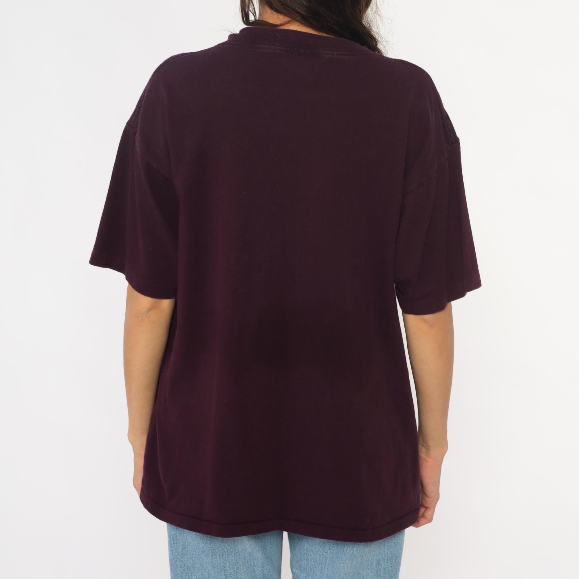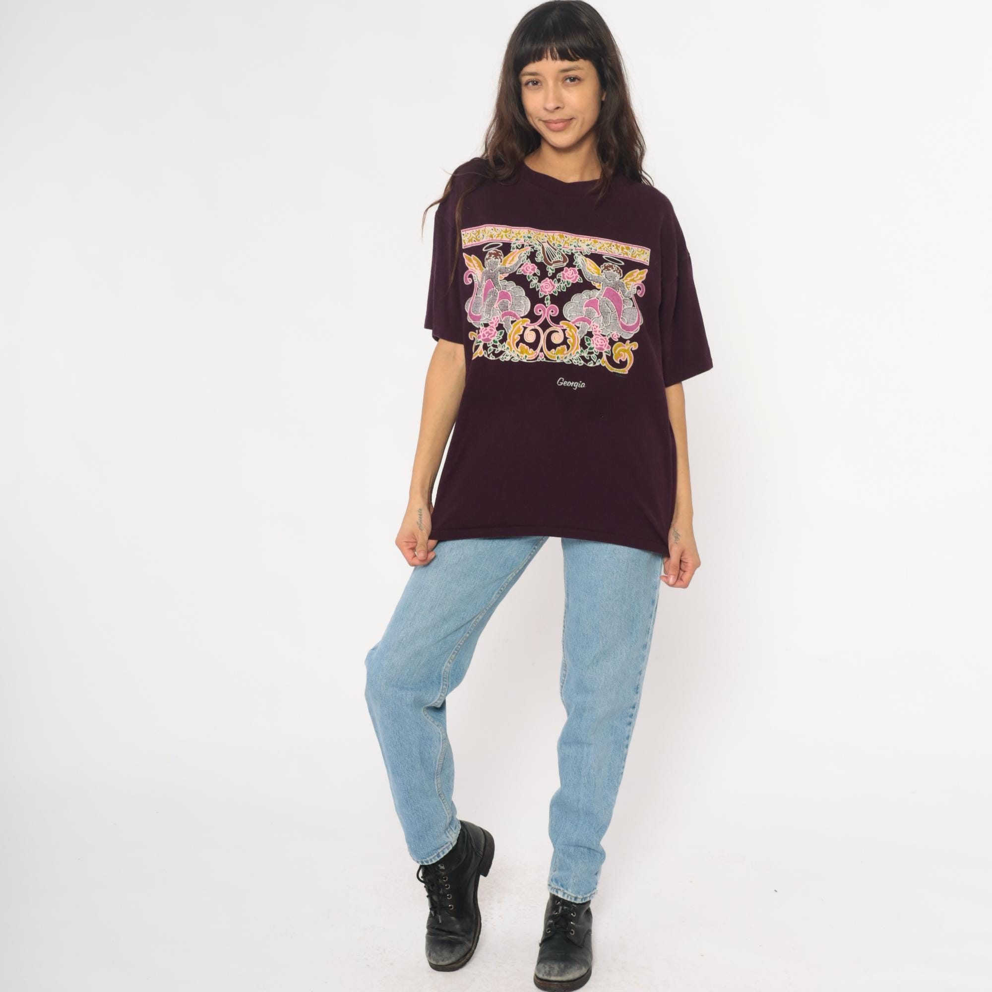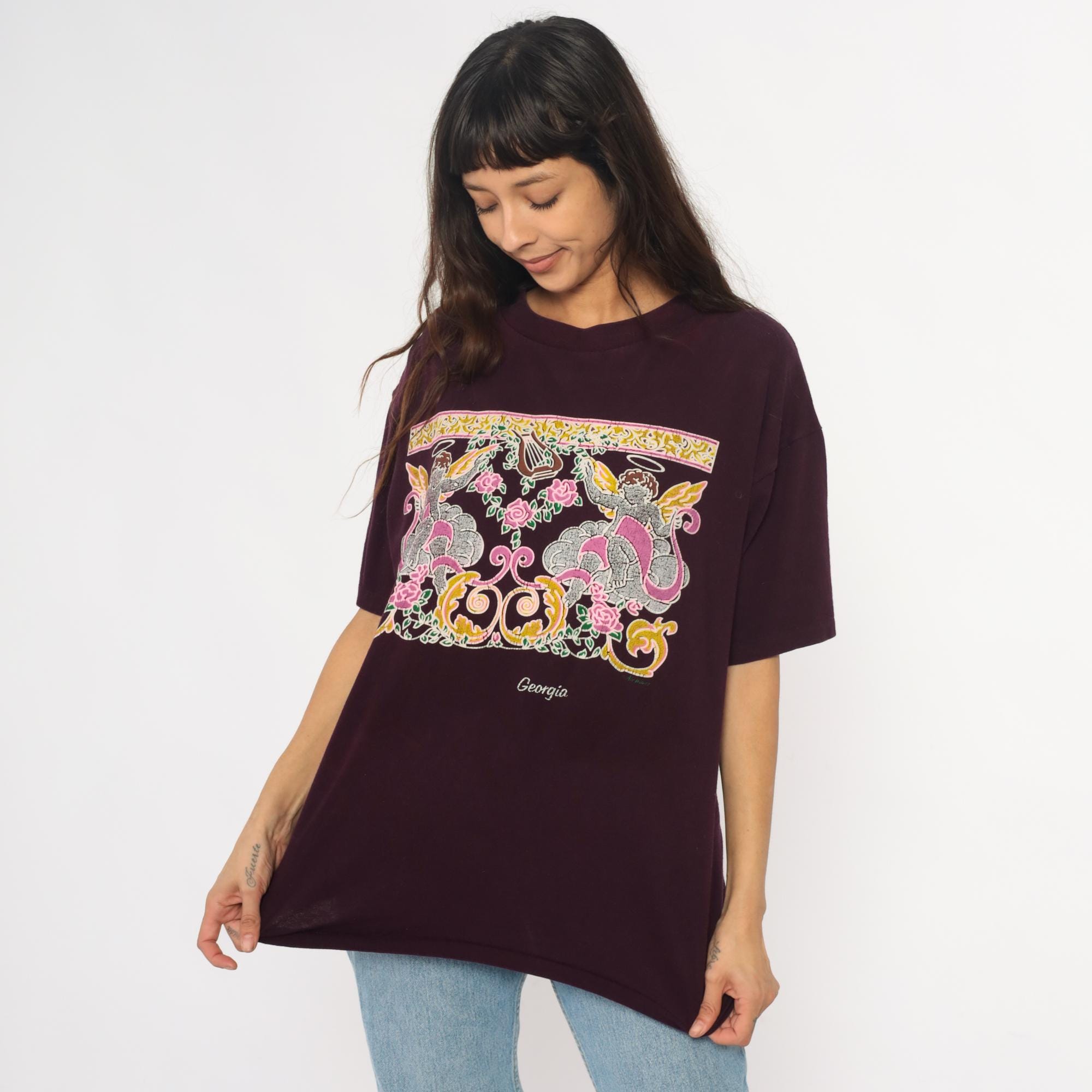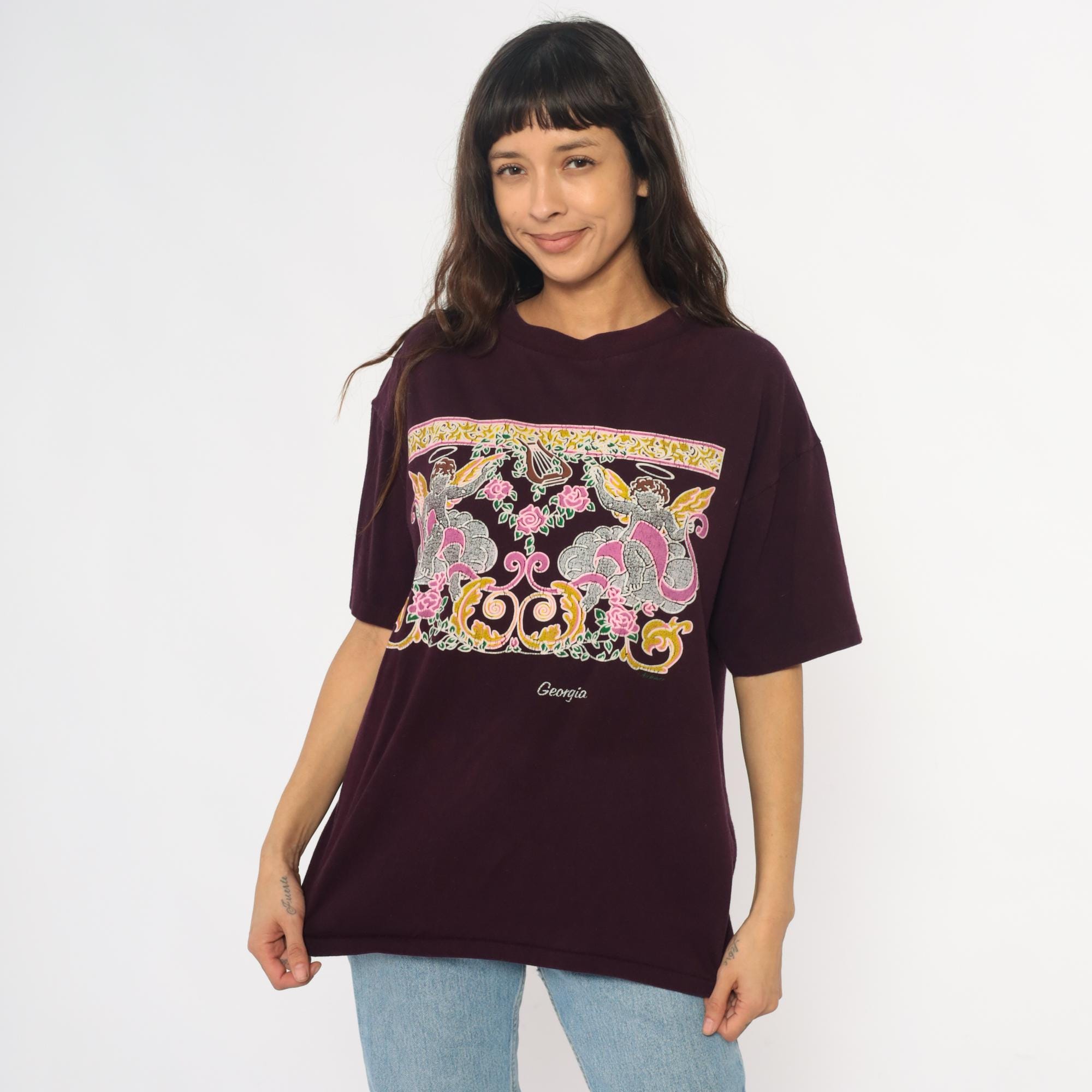 90s burgundy graphic tee from eagle featuring ornate print with angels, wings, roses, and decorative scrollwork with "Georgia" text below. Short sleeves, crew neckline, all-over design in pink, yellow, green, and cream against dark plum background.