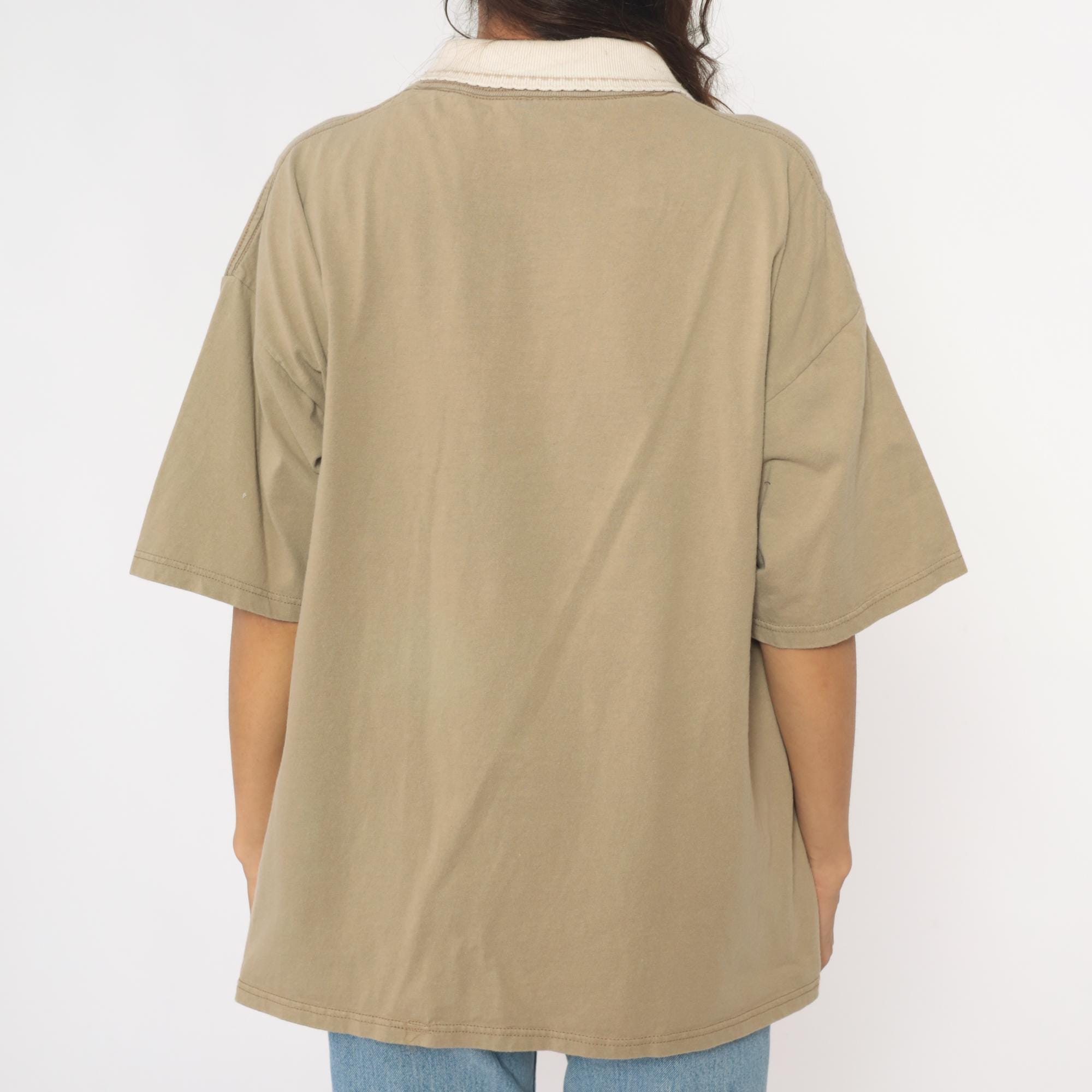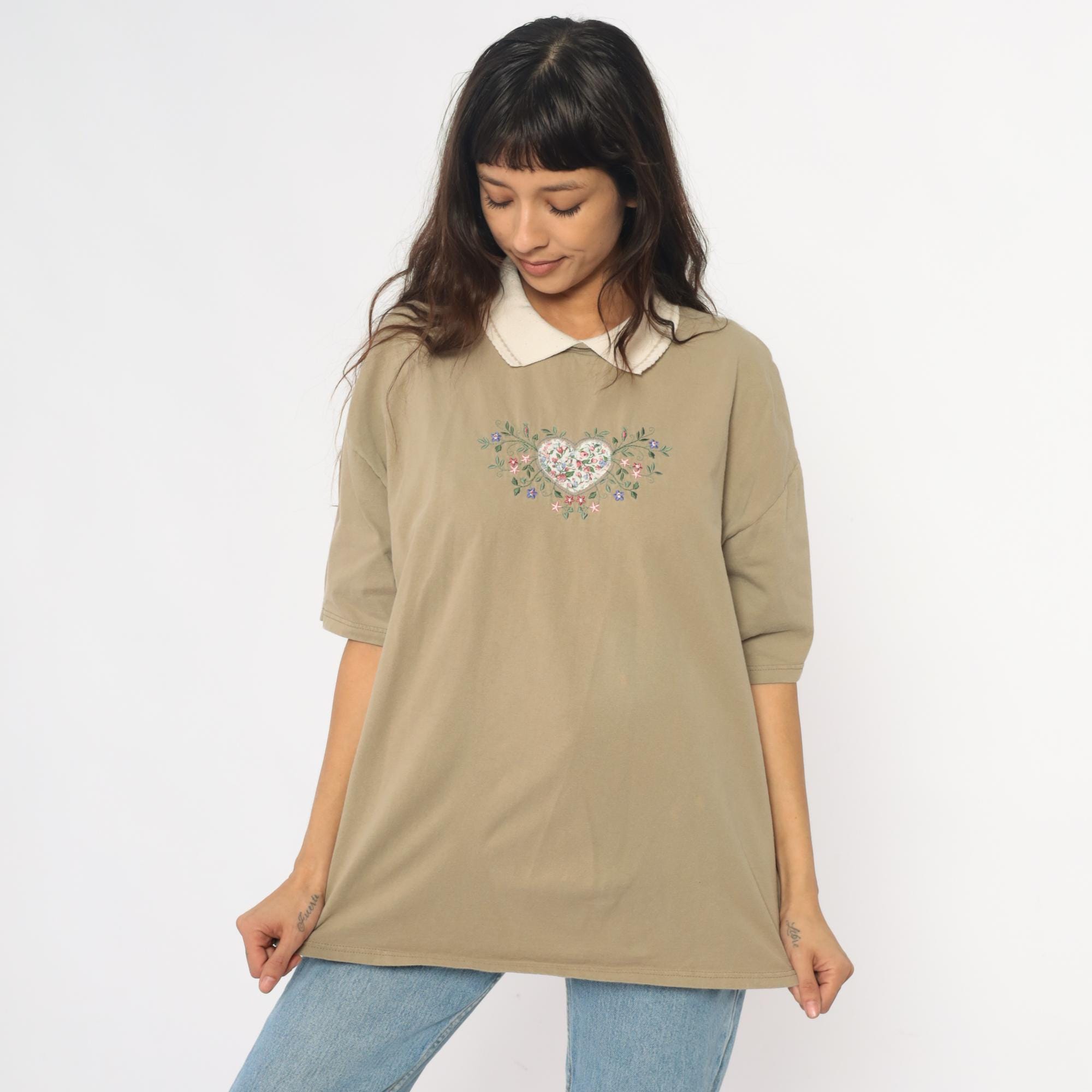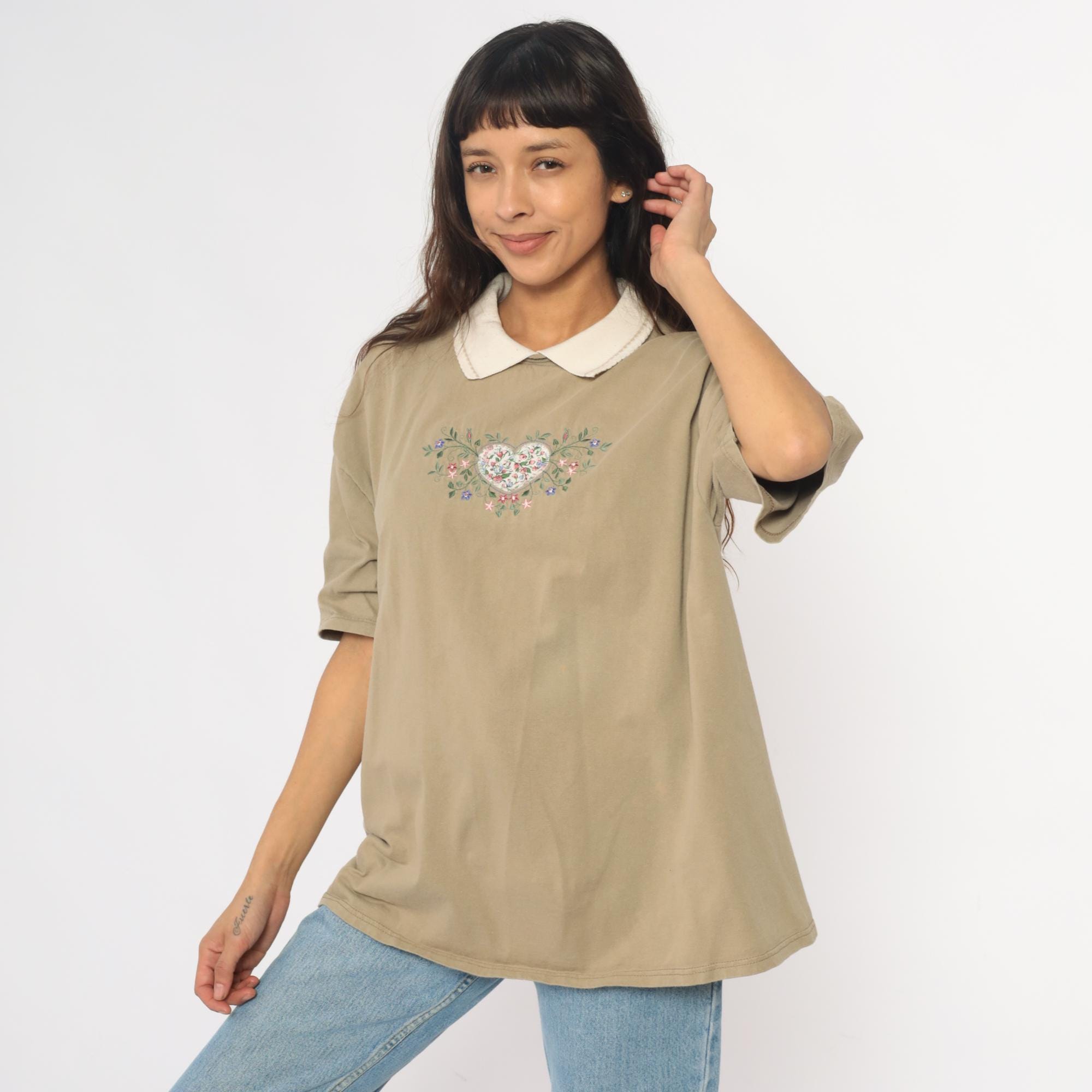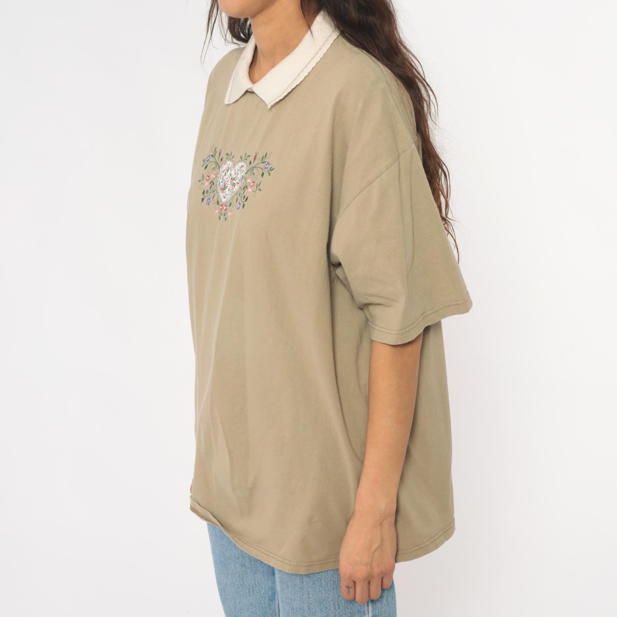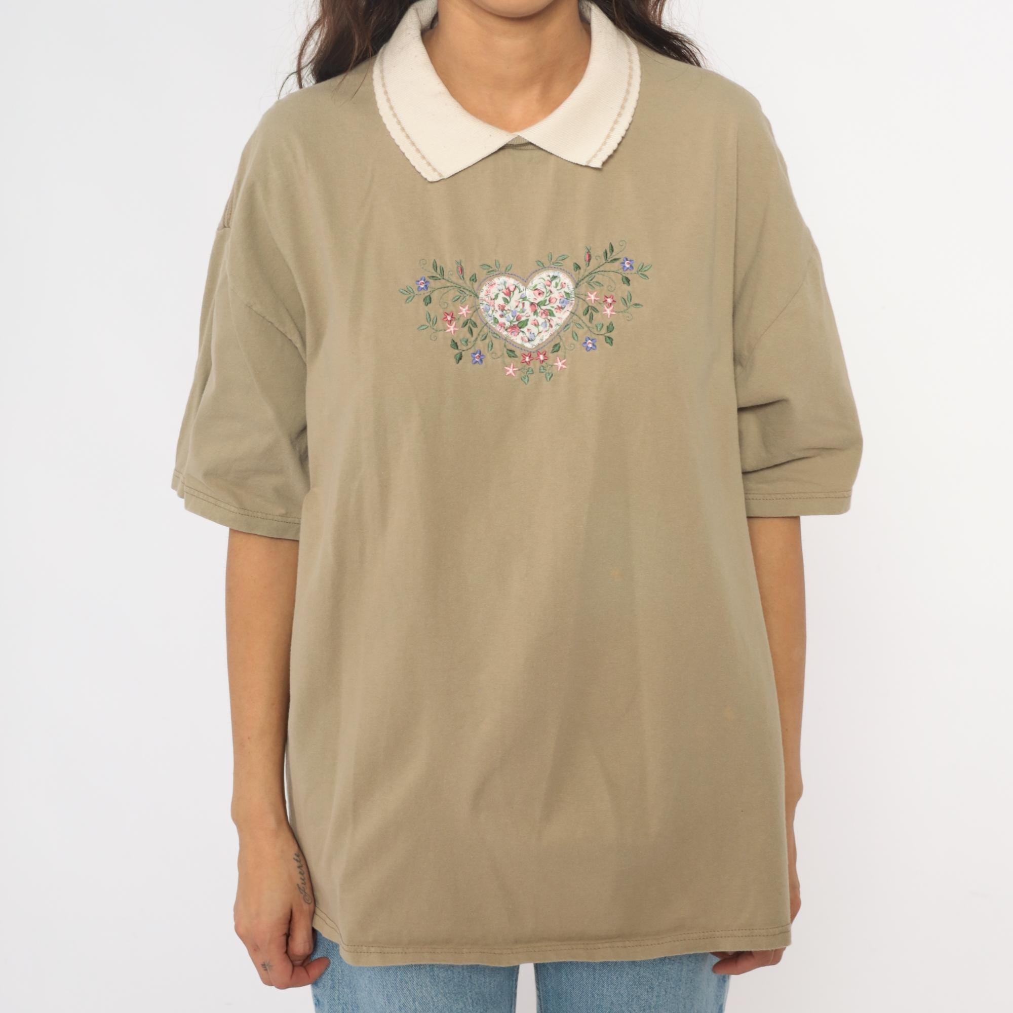 90s tan polo shirt with white ribbed collar and embroidered floral heart design on chest. Pink, blue, and green flowers surround and fill the heart embroidery with top stitch detailing.