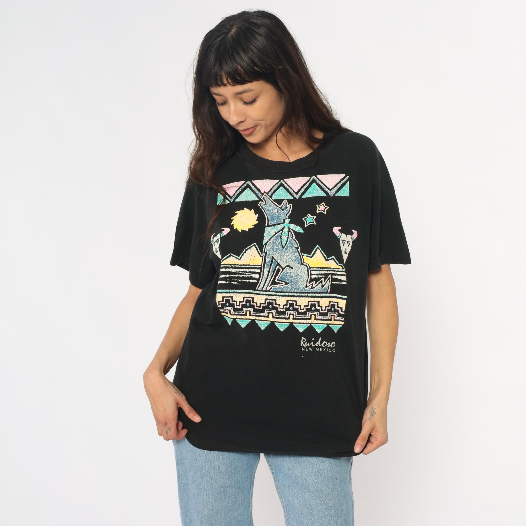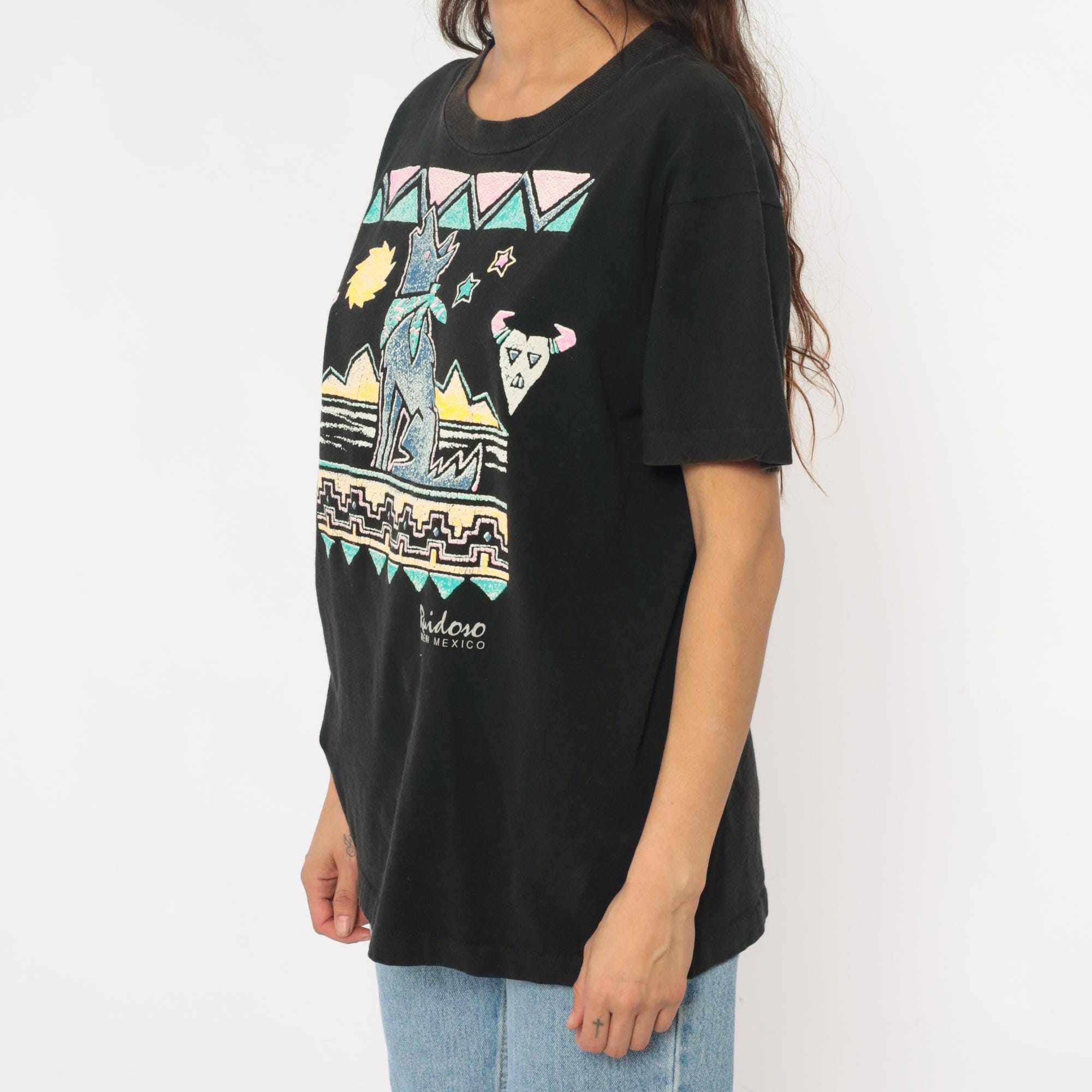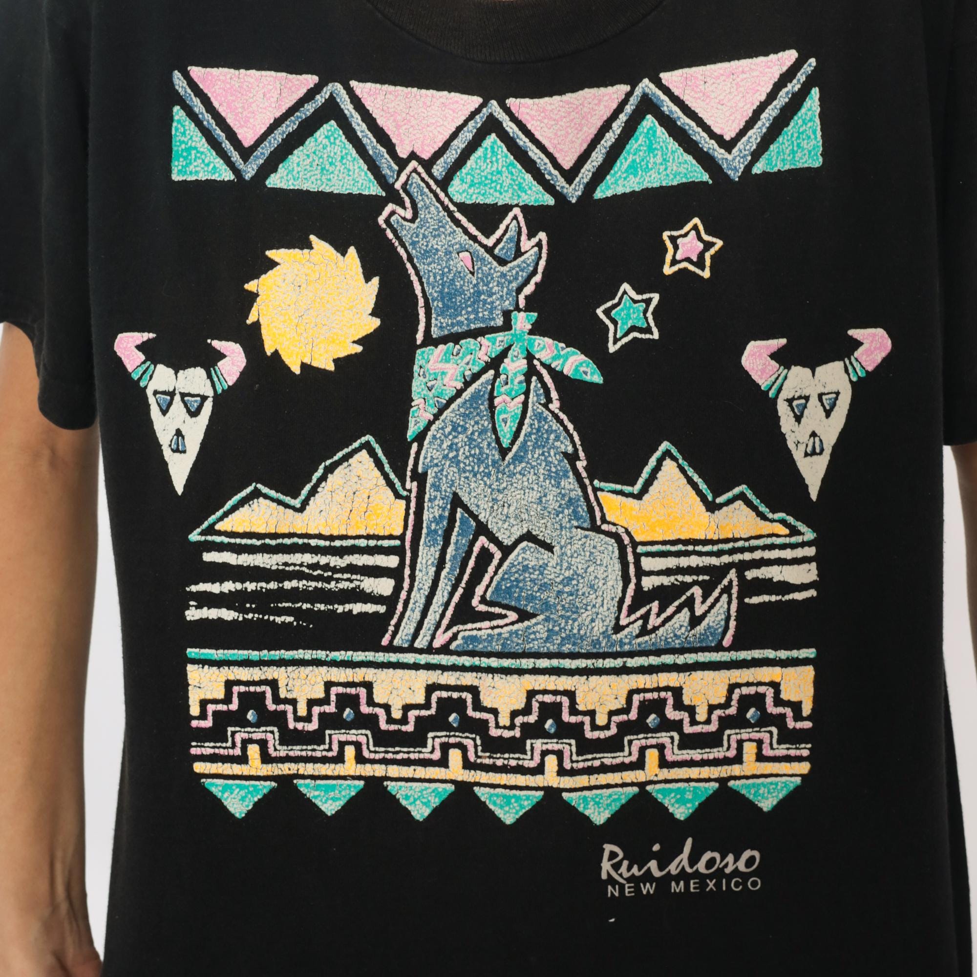 90s black t-shirt from Ruidoso, New Mexico with Southwestern graphic design across the chest. Pastel colored scene features howling coyote or wolf with sun, stars, mountains, geometric zigzag borders in pink, turquoise, yellow, and cream, flanked by two bull skulls with turquoise and pink horns.