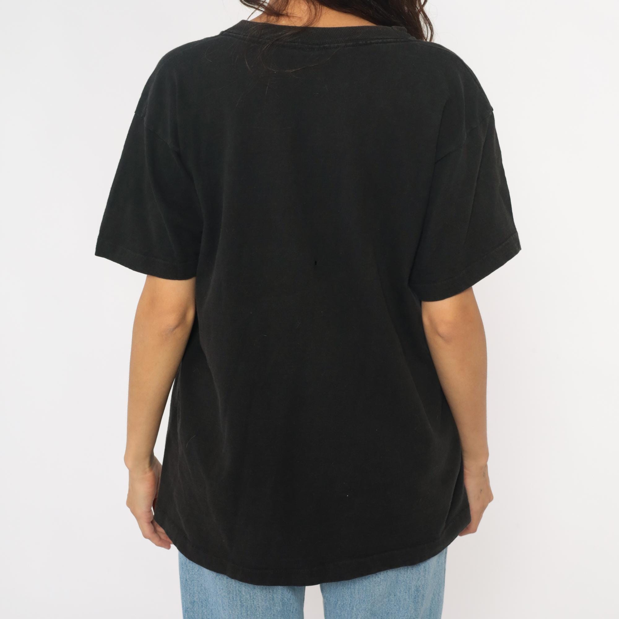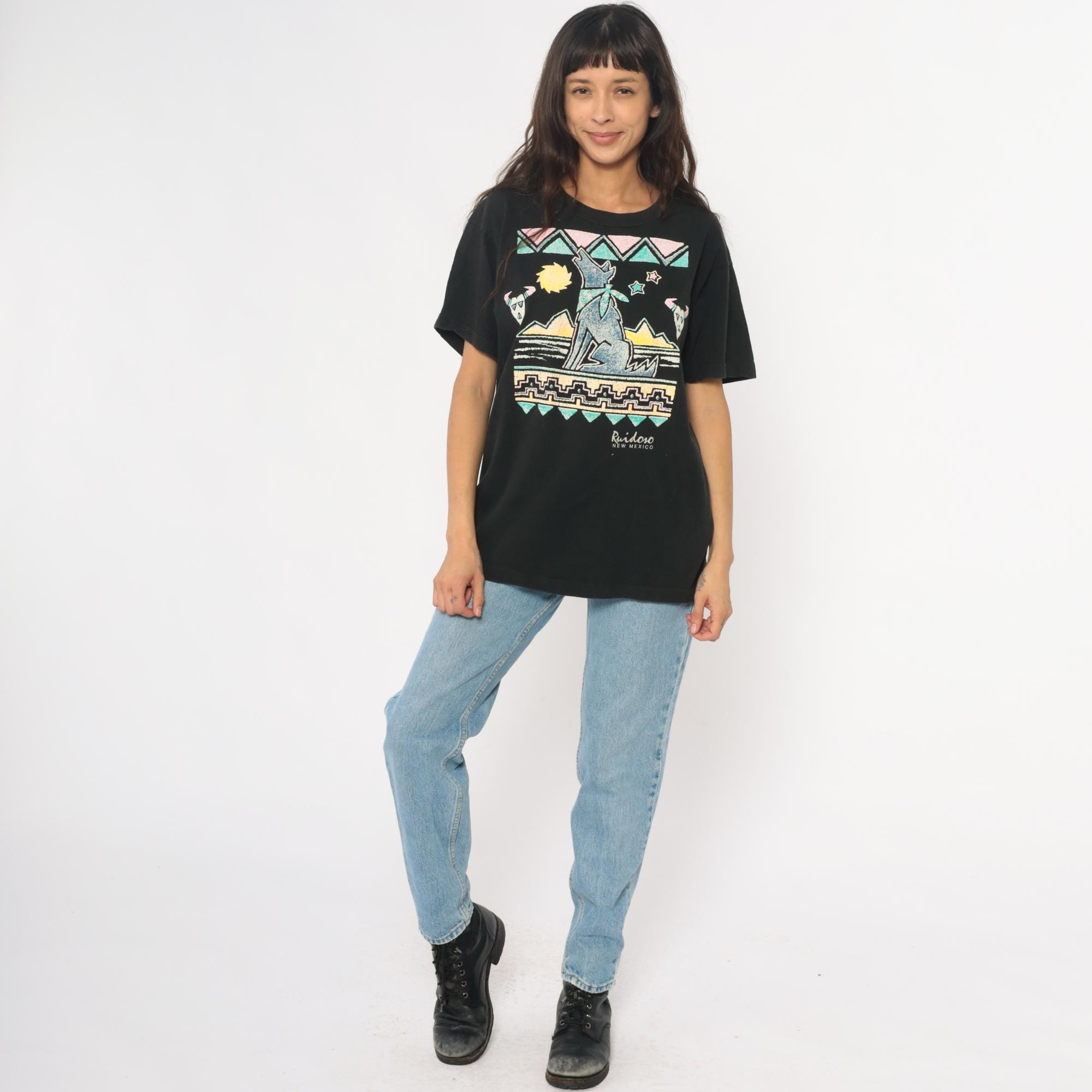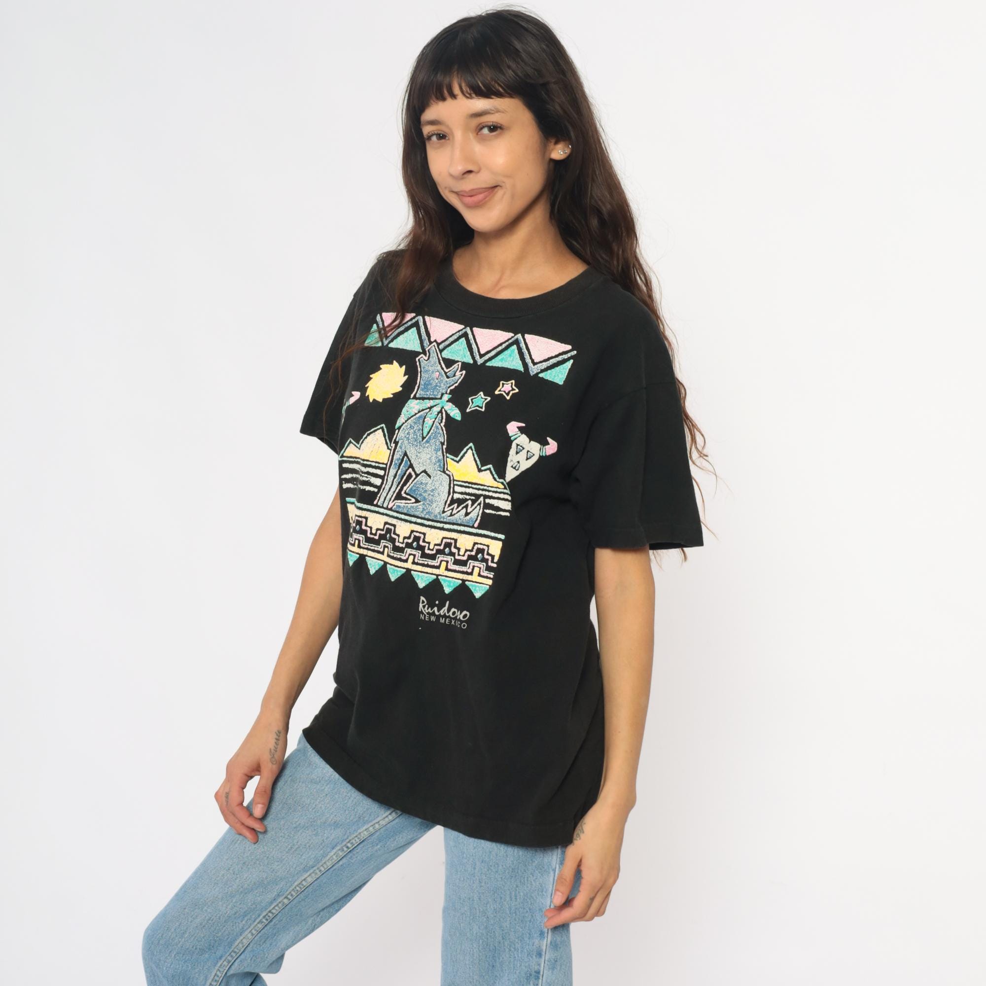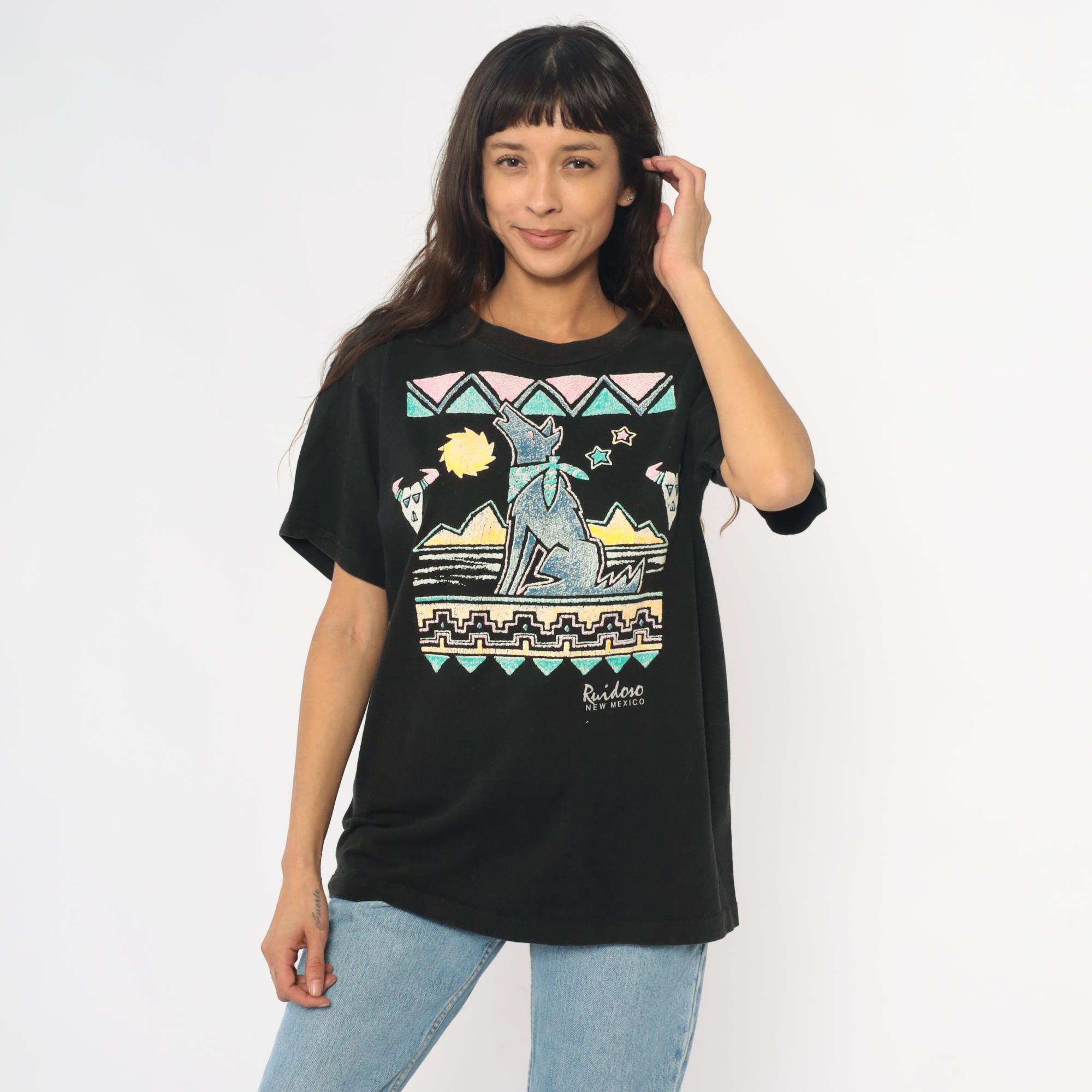 90s black t-shirt from Ruidoso, New Mexico with Southwestern graphic design across the chest. Pastel colored scene features howling coyote or wolf with sun, stars, mountains, geometric zigzag borders in pink, turquoise, yellow, and cream, flanked by two bull skulls with turquoise and pink horns.