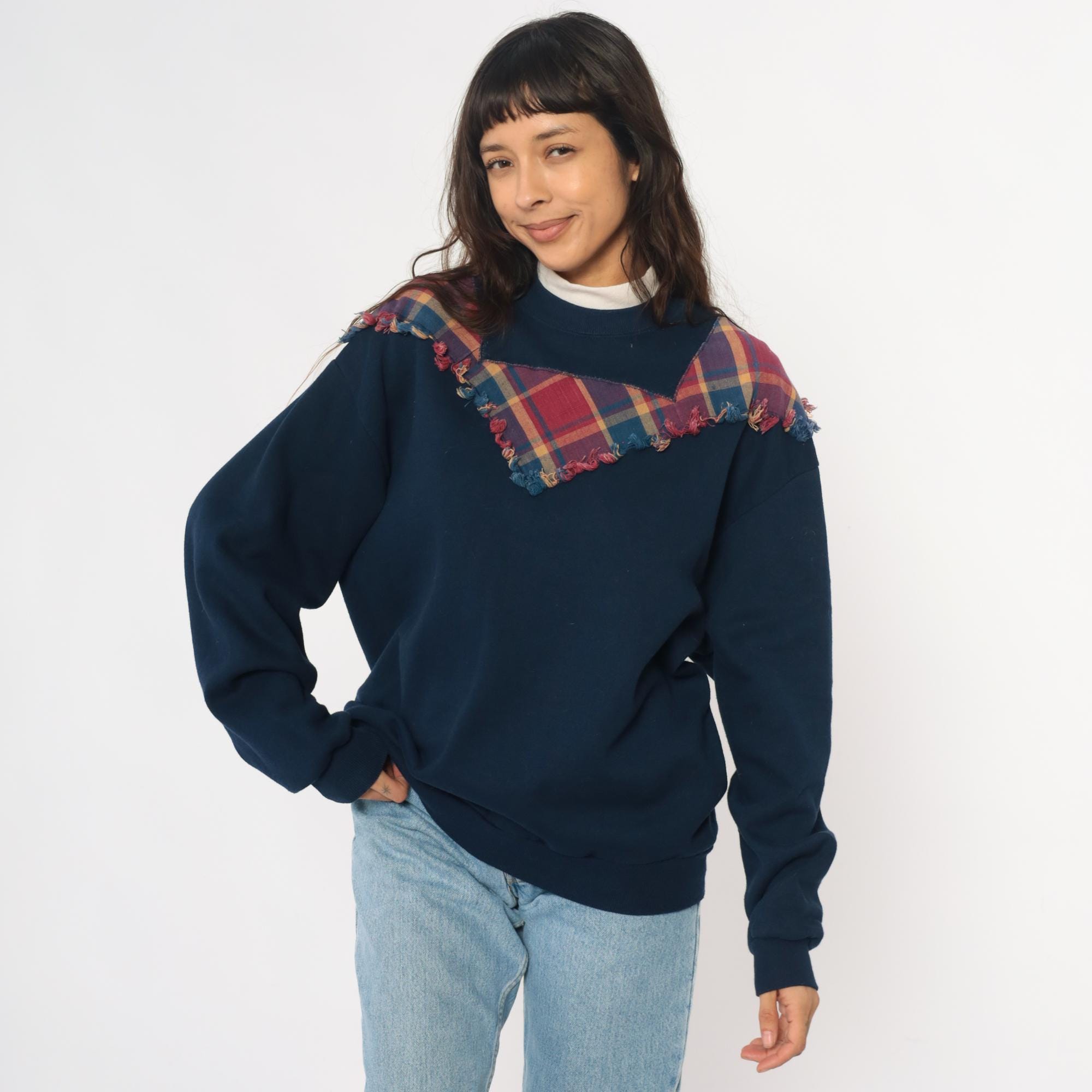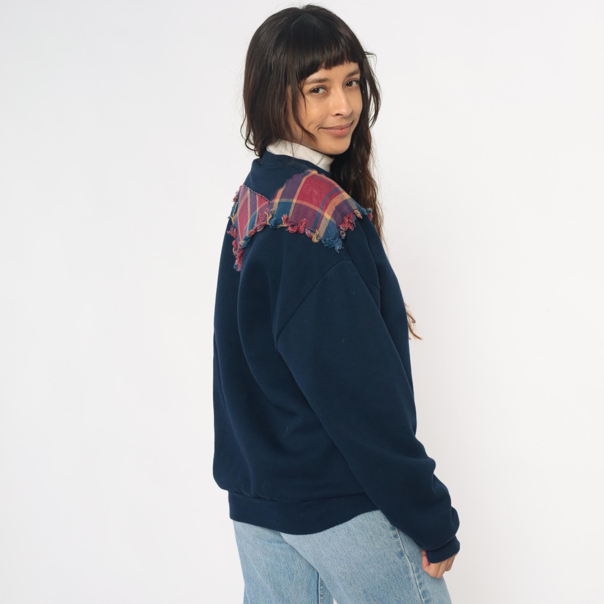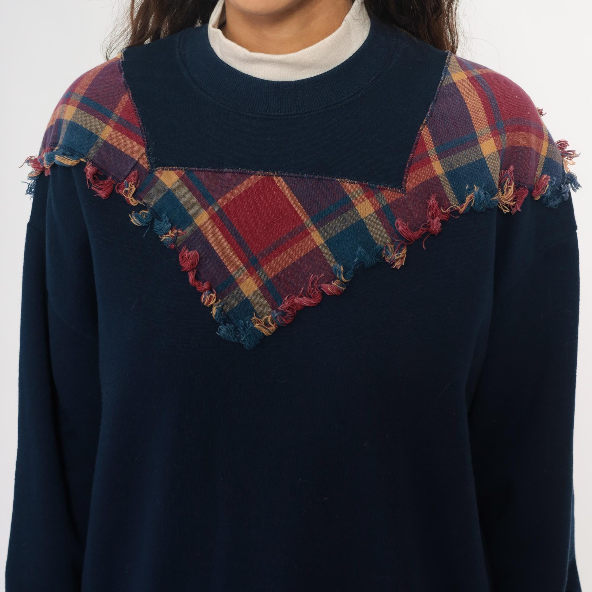 90s navy sweatshirt from jerzees with burgundy, teal, yellow, and red plaid panel across shoulders and upper chest. Frayed edges on plaid panel, crew neck, long sleeves with ribbed cuffs.