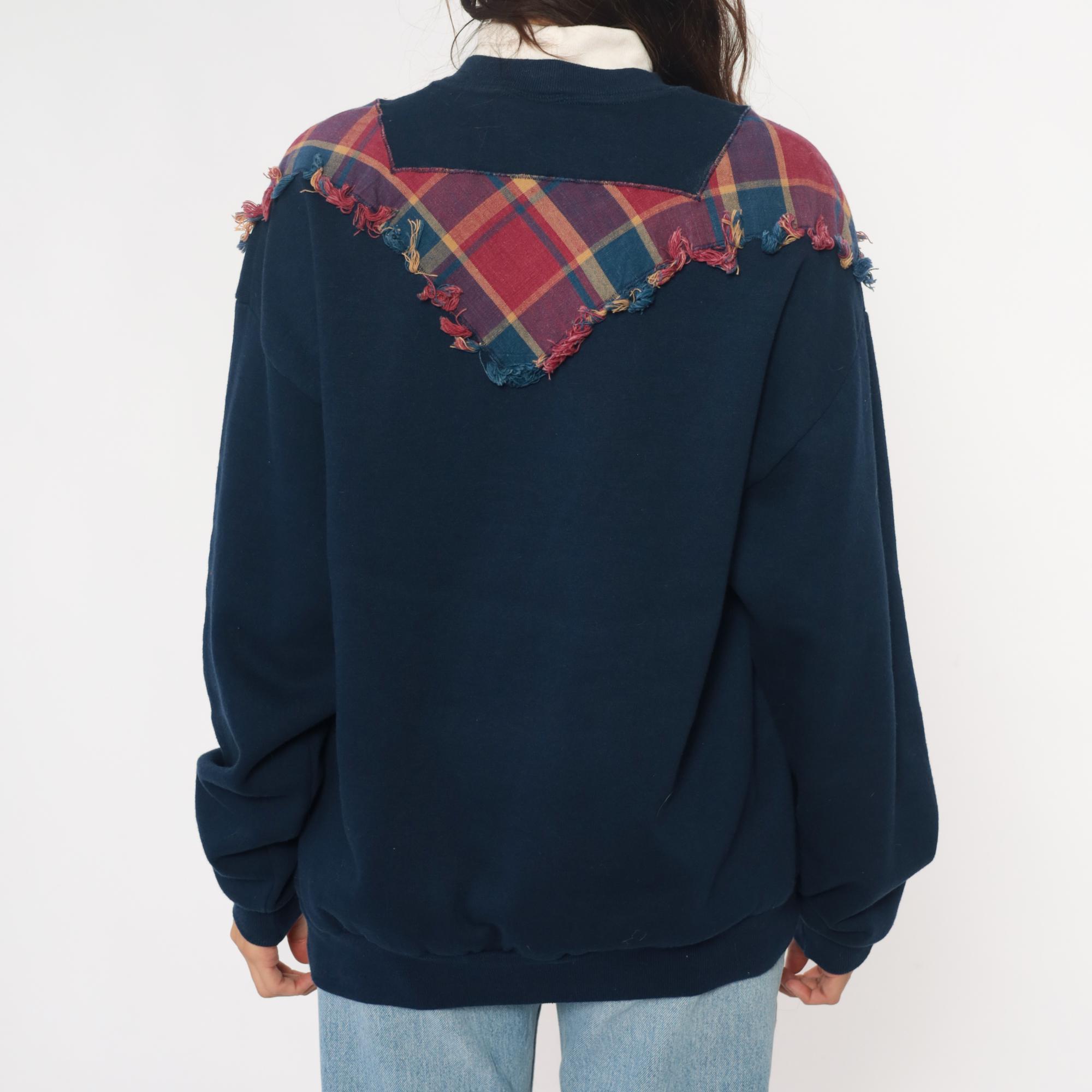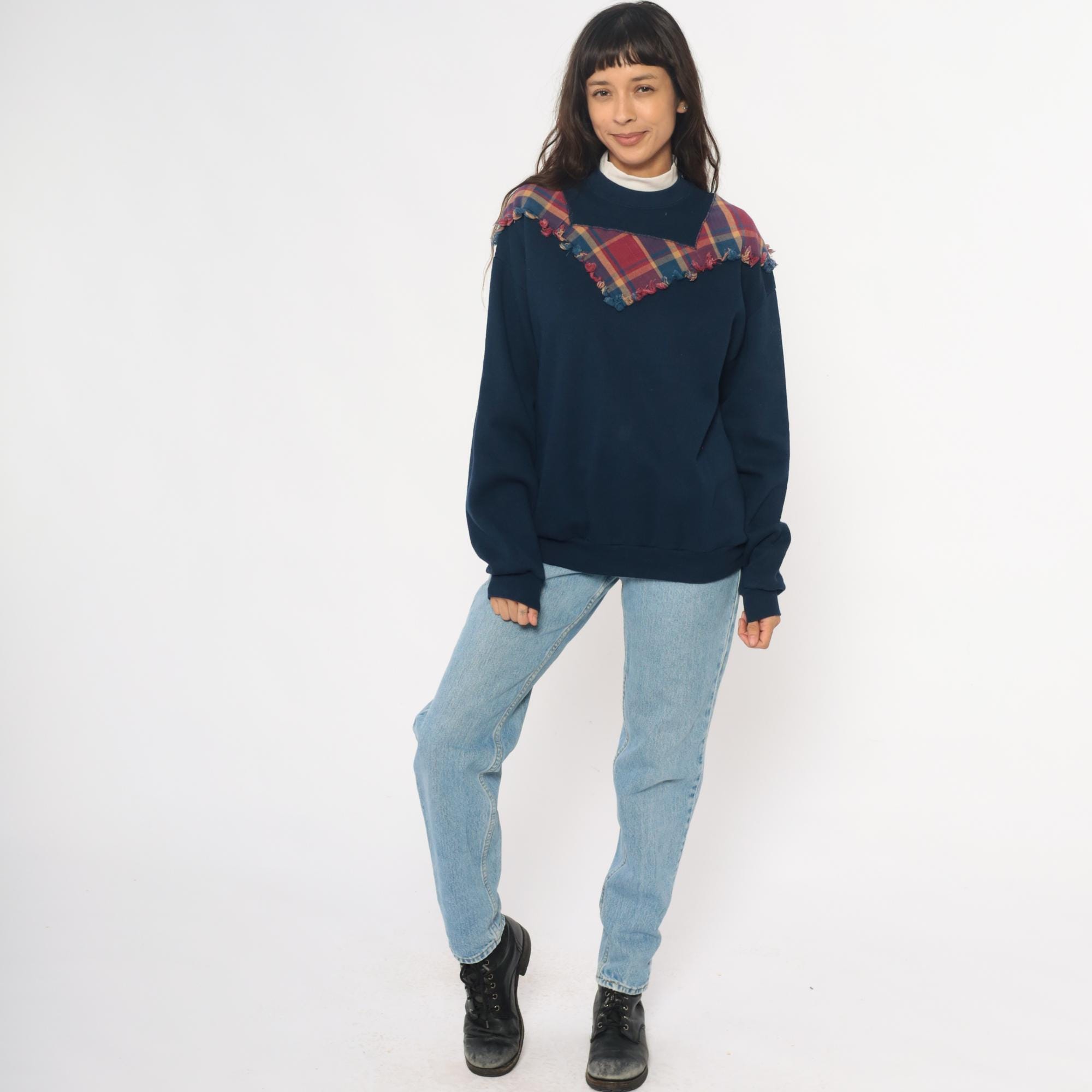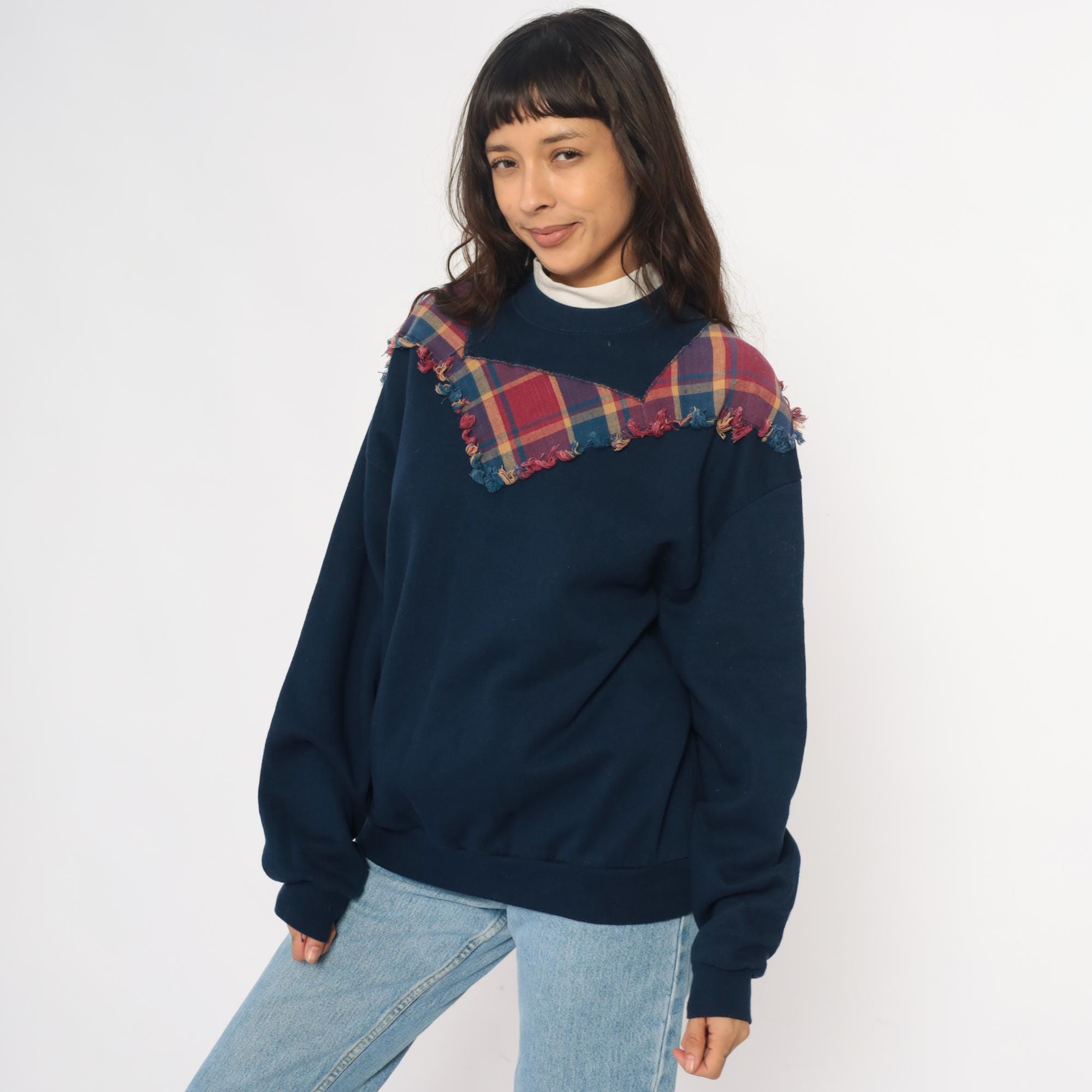 90s navy sweatshirt from jerzees with burgundy, teal, yellow, and red plaid panel across shoulders and upper chest. Frayed edges on plaid panel, crew neck, long sleeves with ribbed cuffs.