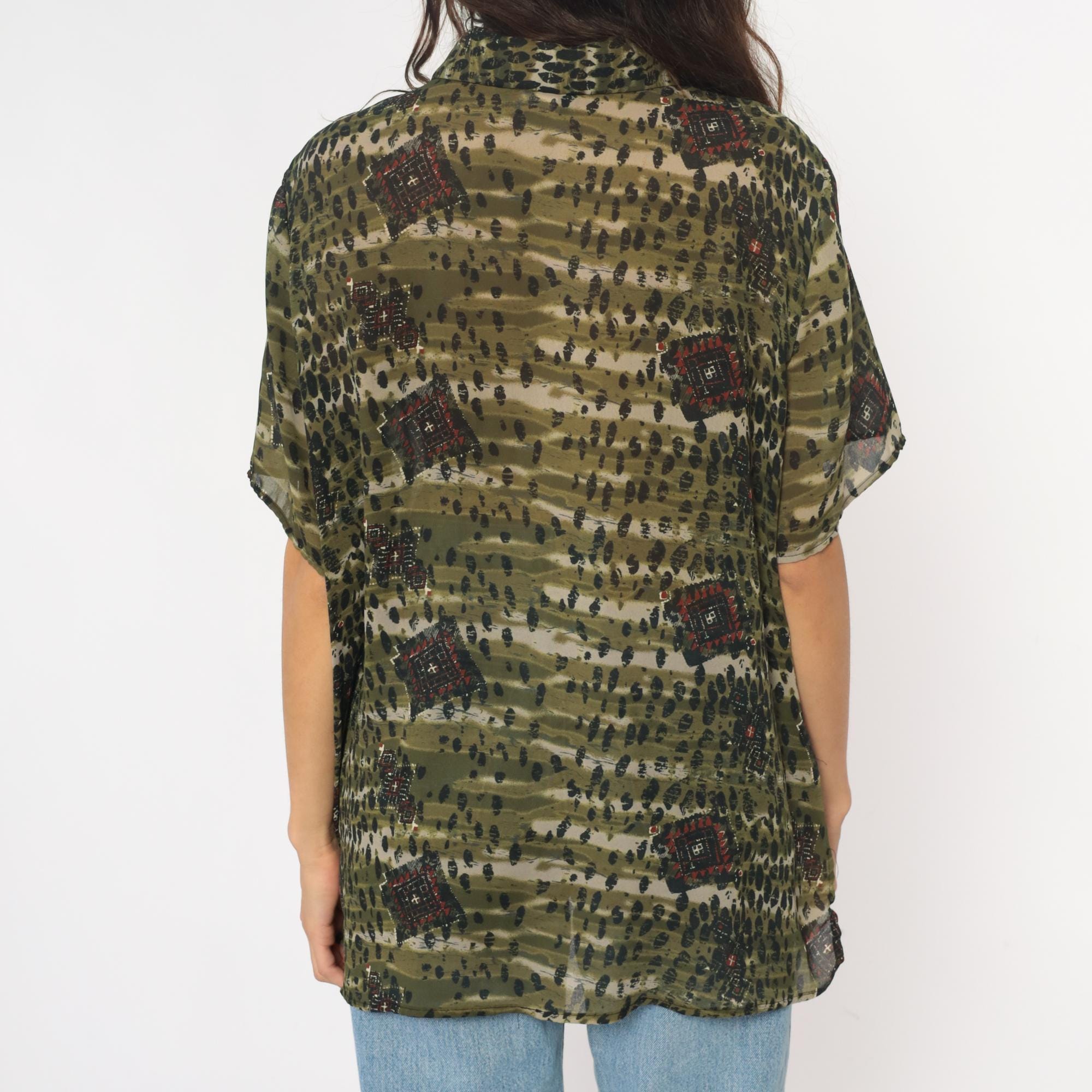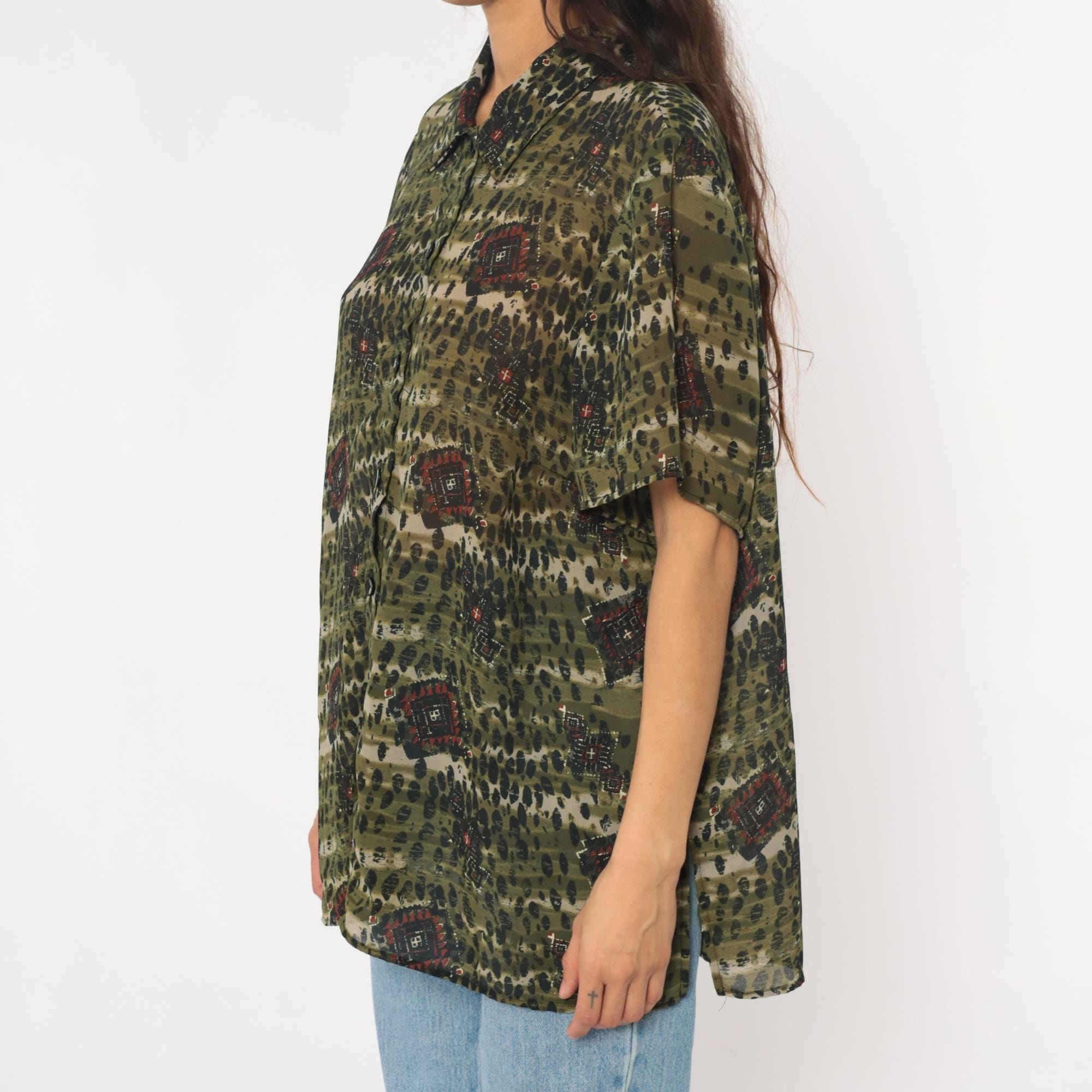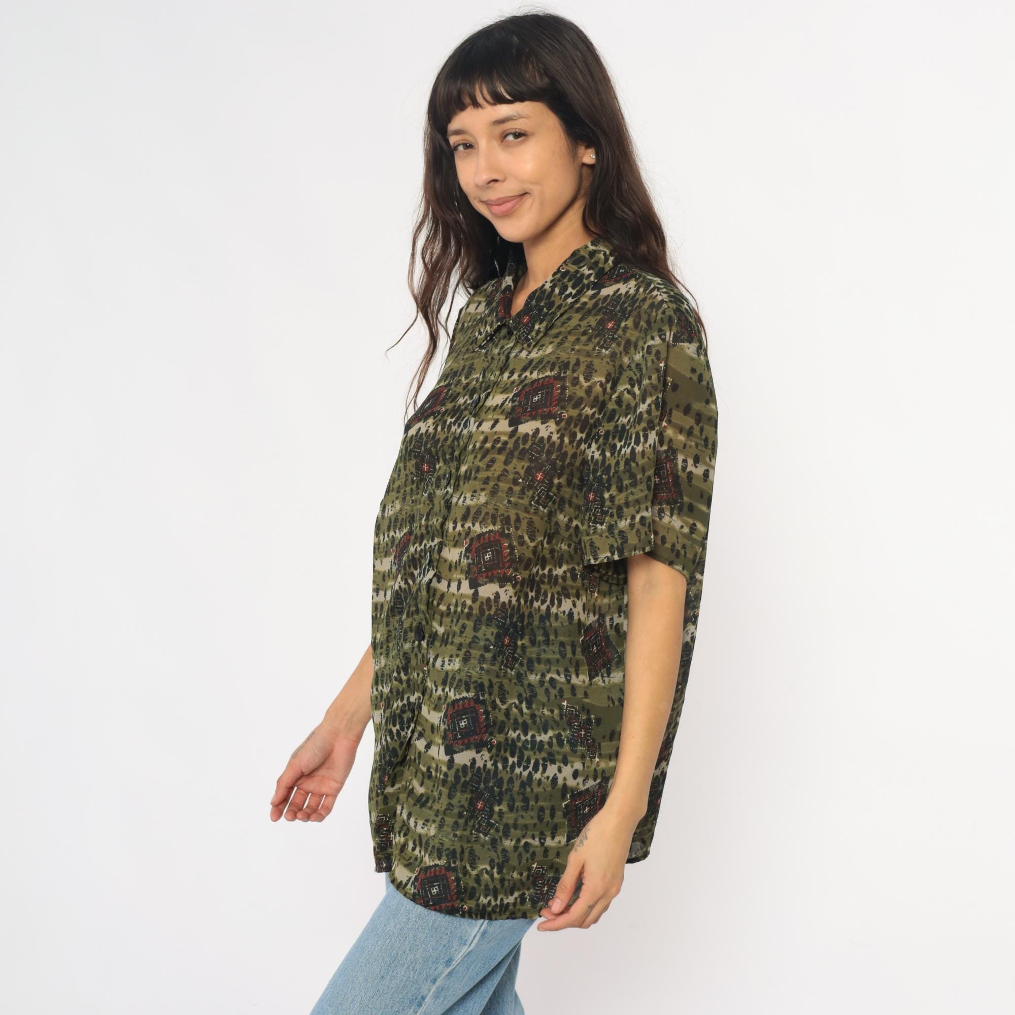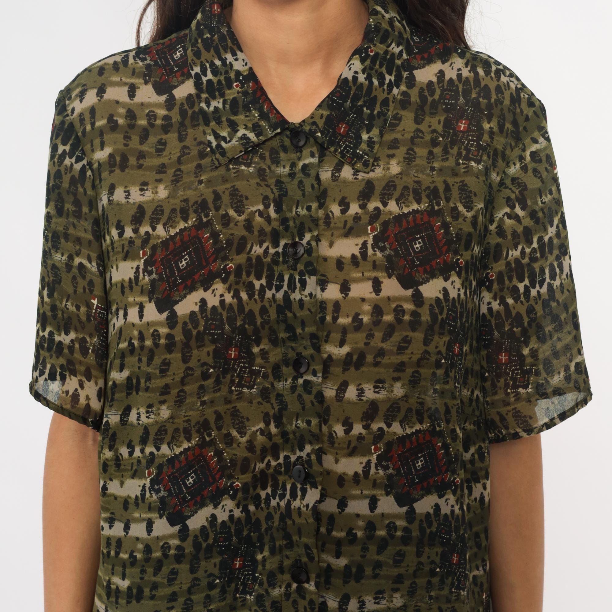 90s olive green button-up shirt with leopard spot print and scattered geometric medallions in black and red throughout. Semi-sheer construction with short sleeves, pointed collar, and black button front closure.