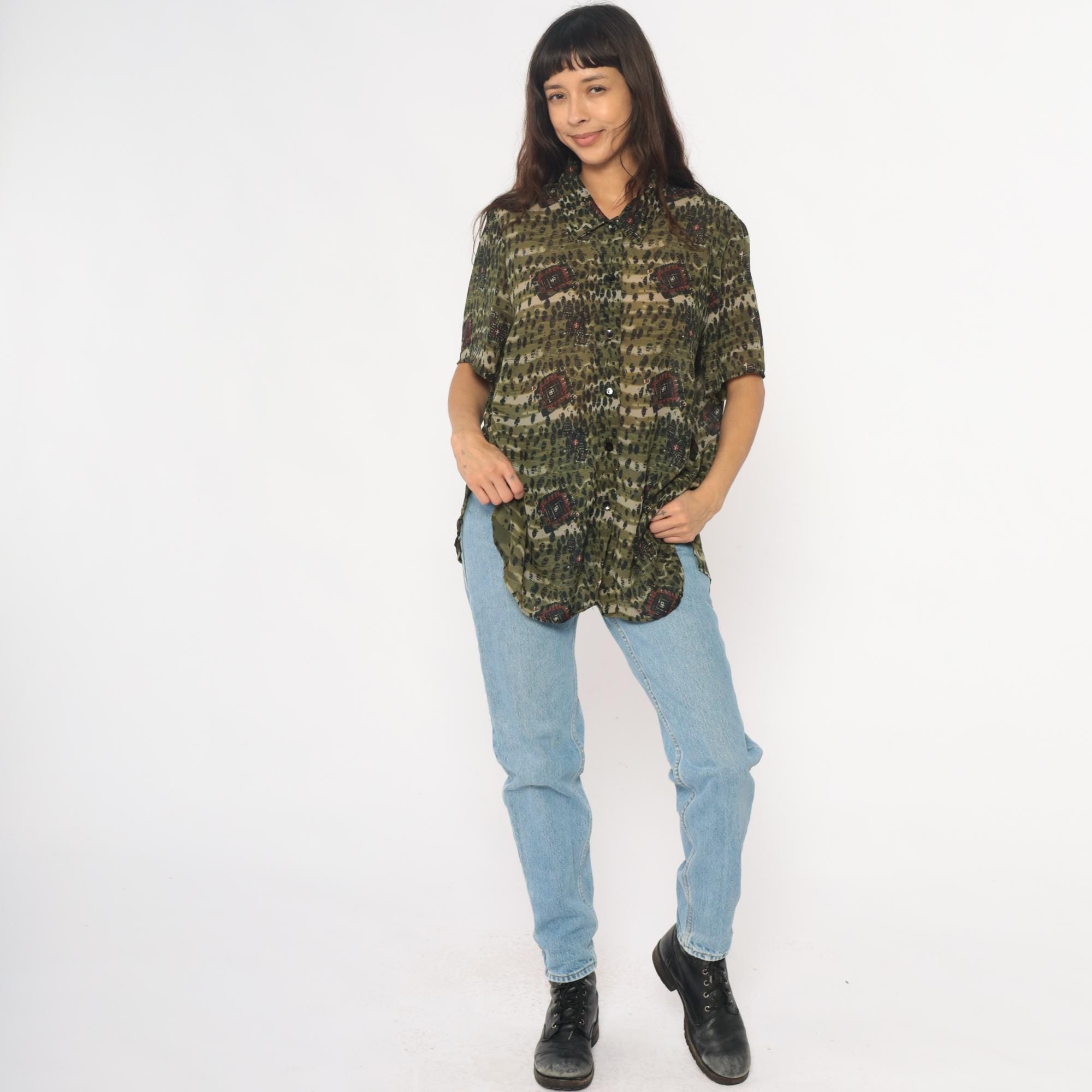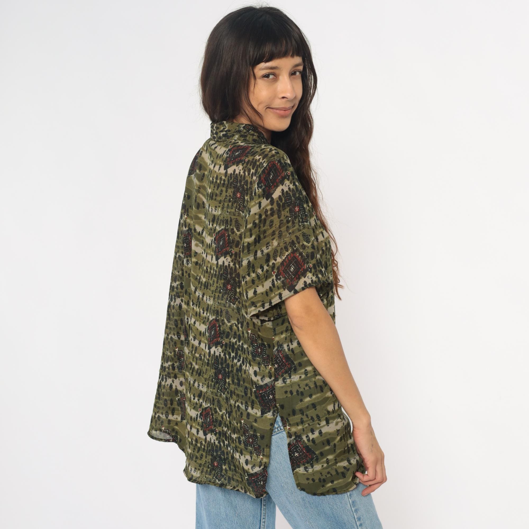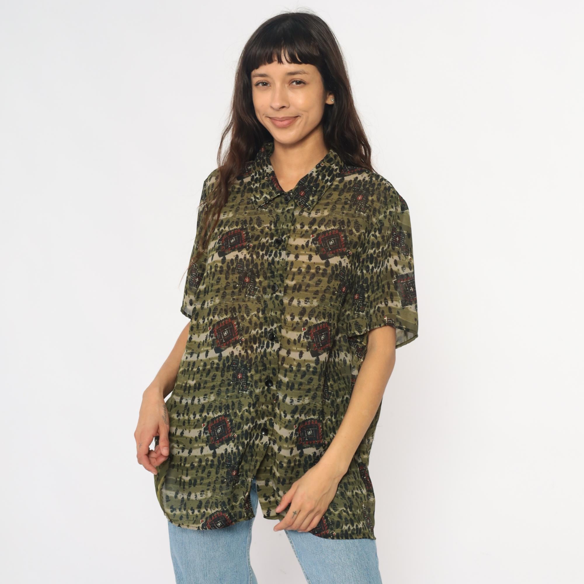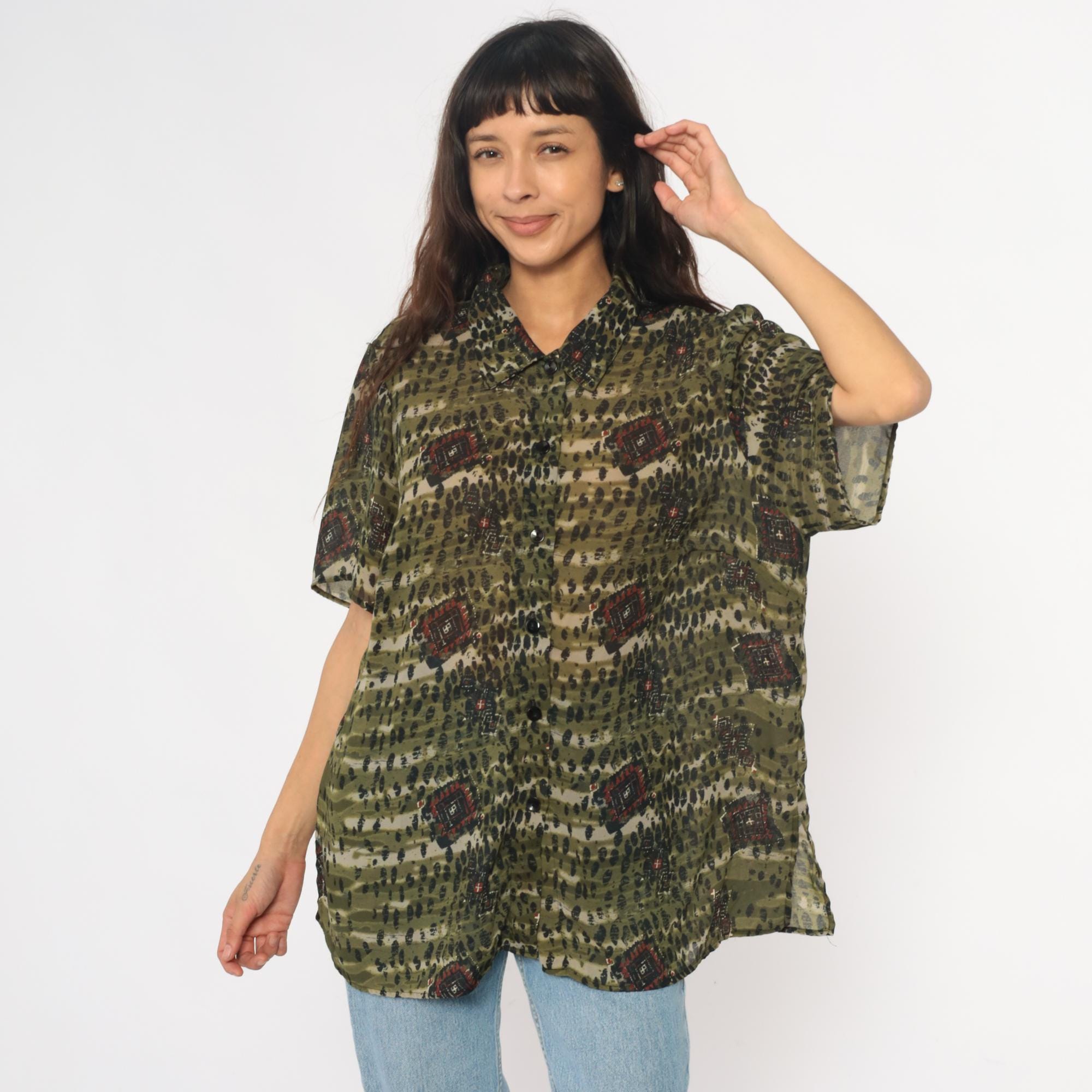 90s olive green button-up shirt with leopard spot print and scattered geometric medallions in black and red throughout. Semi-sheer construction with short sleeves, pointed collar, and black button front closure.