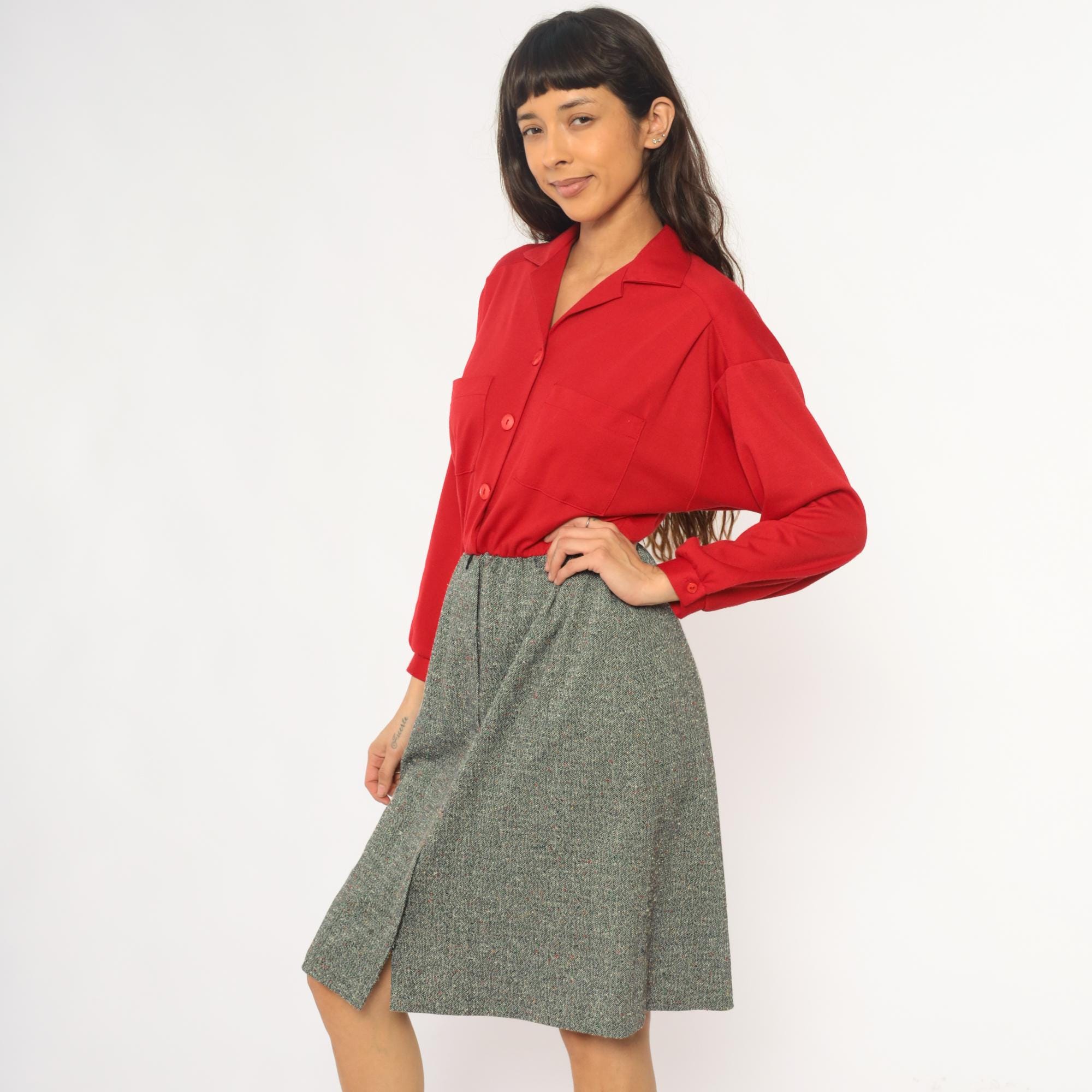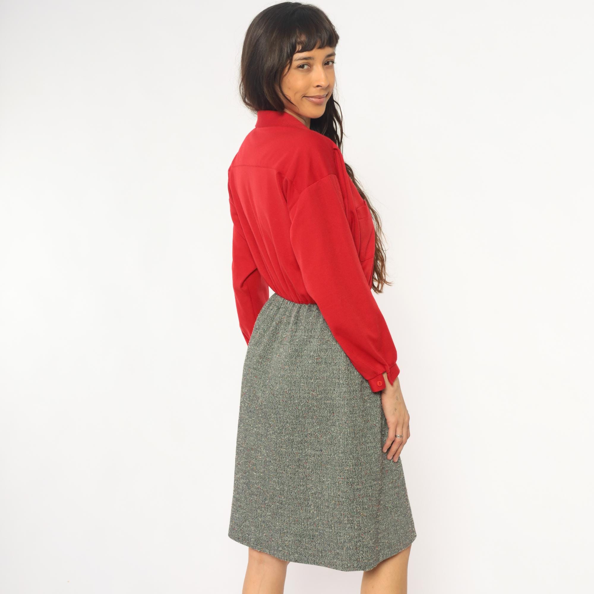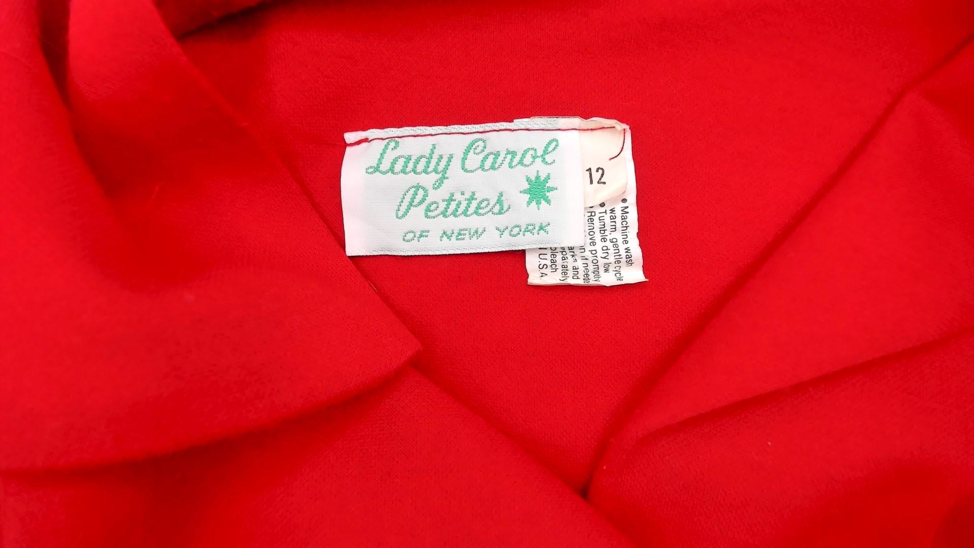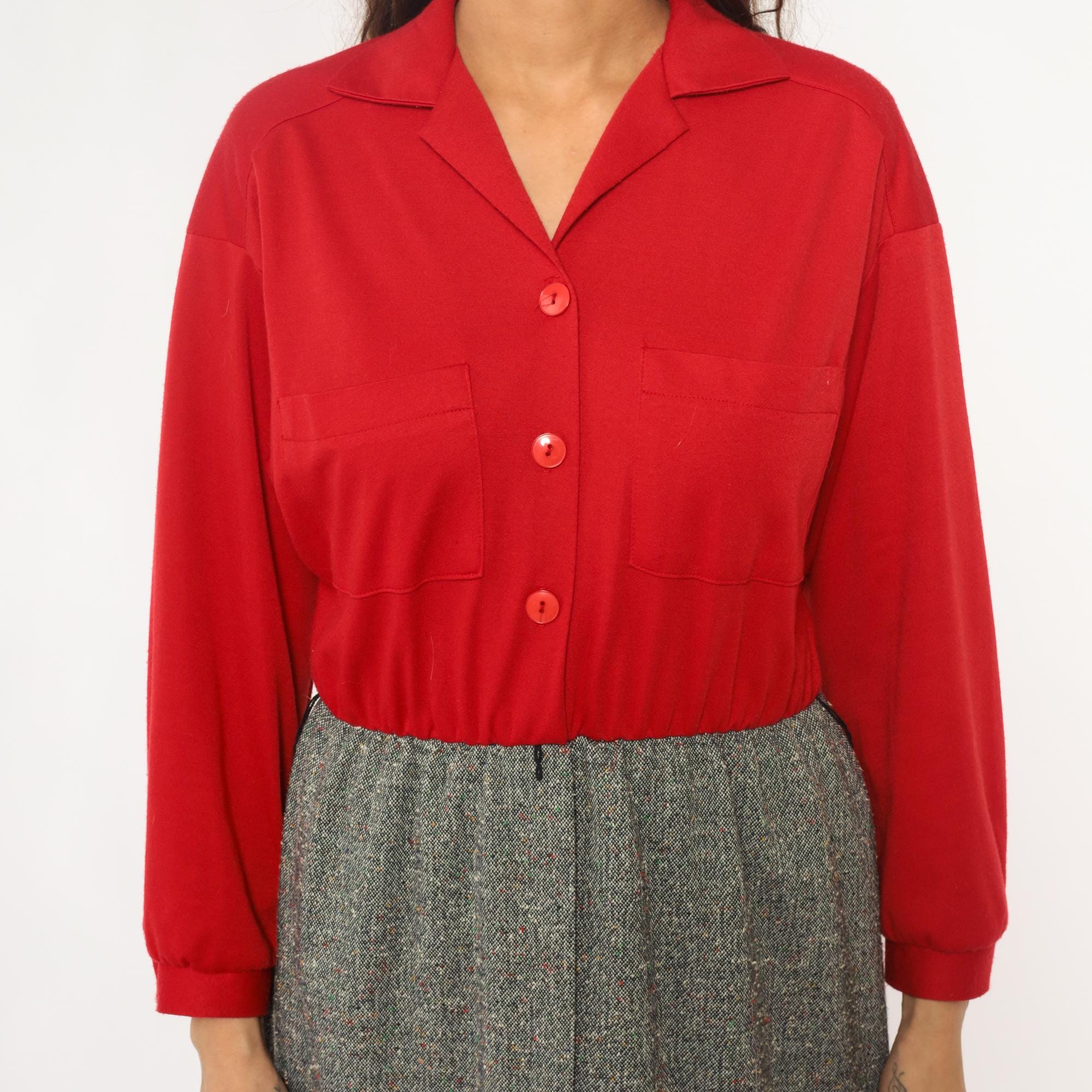 70s red button-front shirt from lady carol petites with notched collar and two chest pockets. Long sleeves with gathered cuffs, three-button closure down the front.