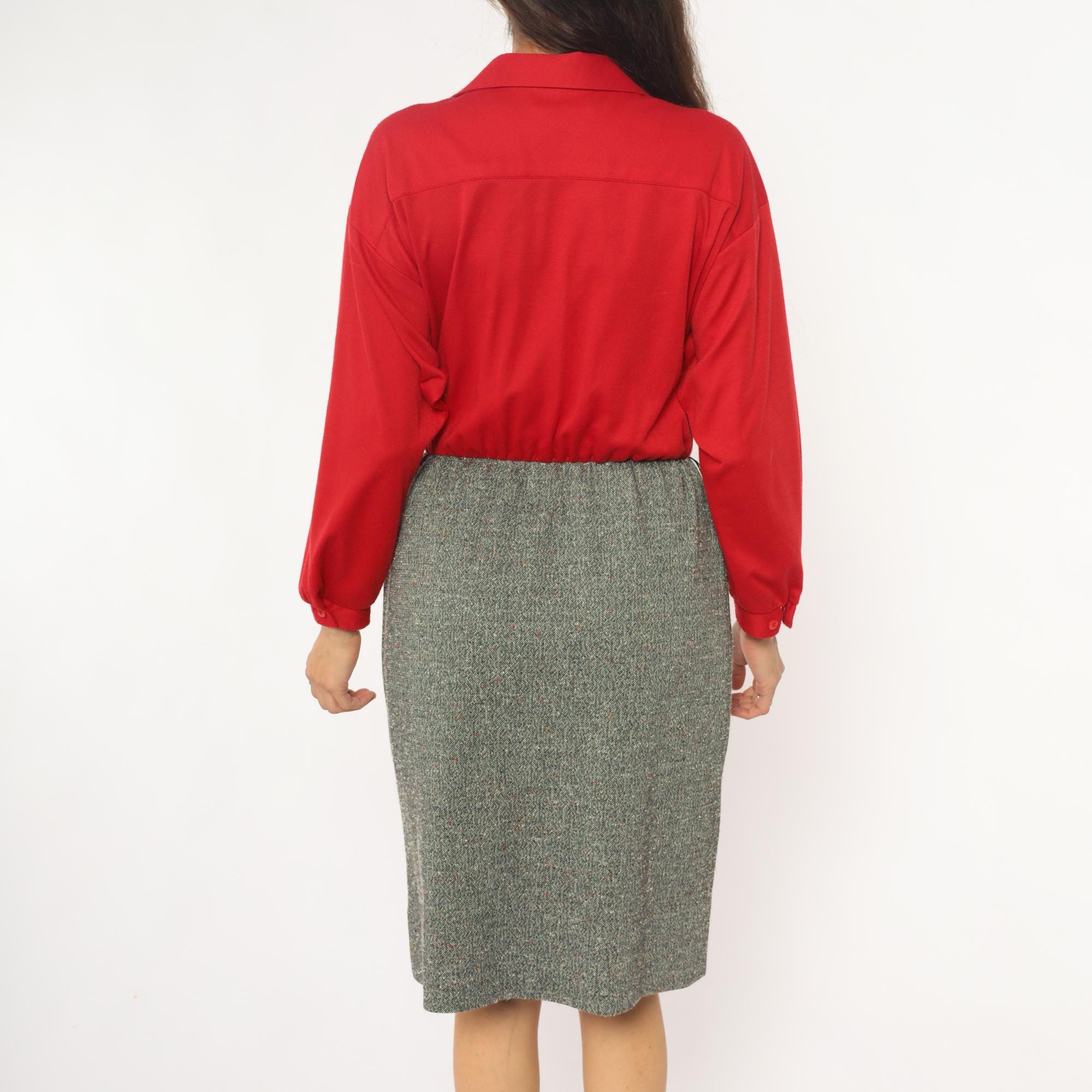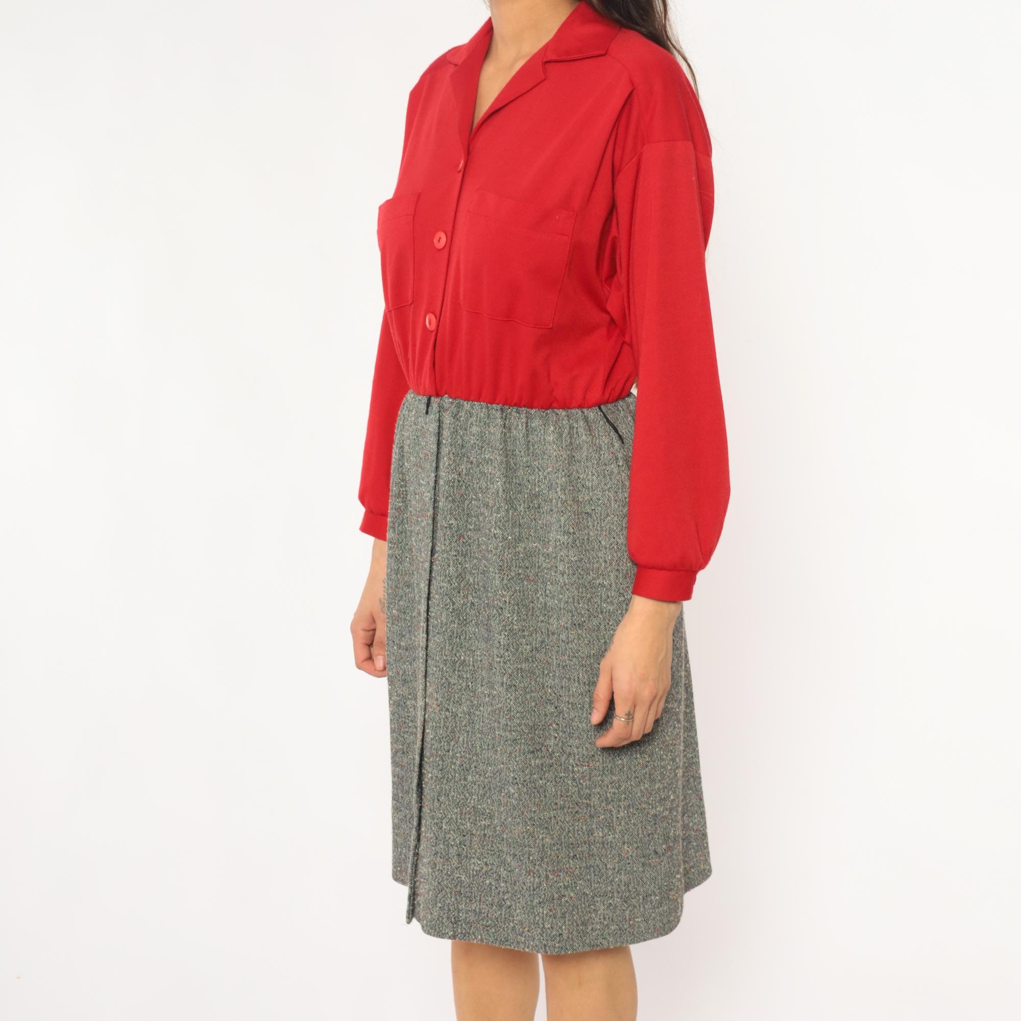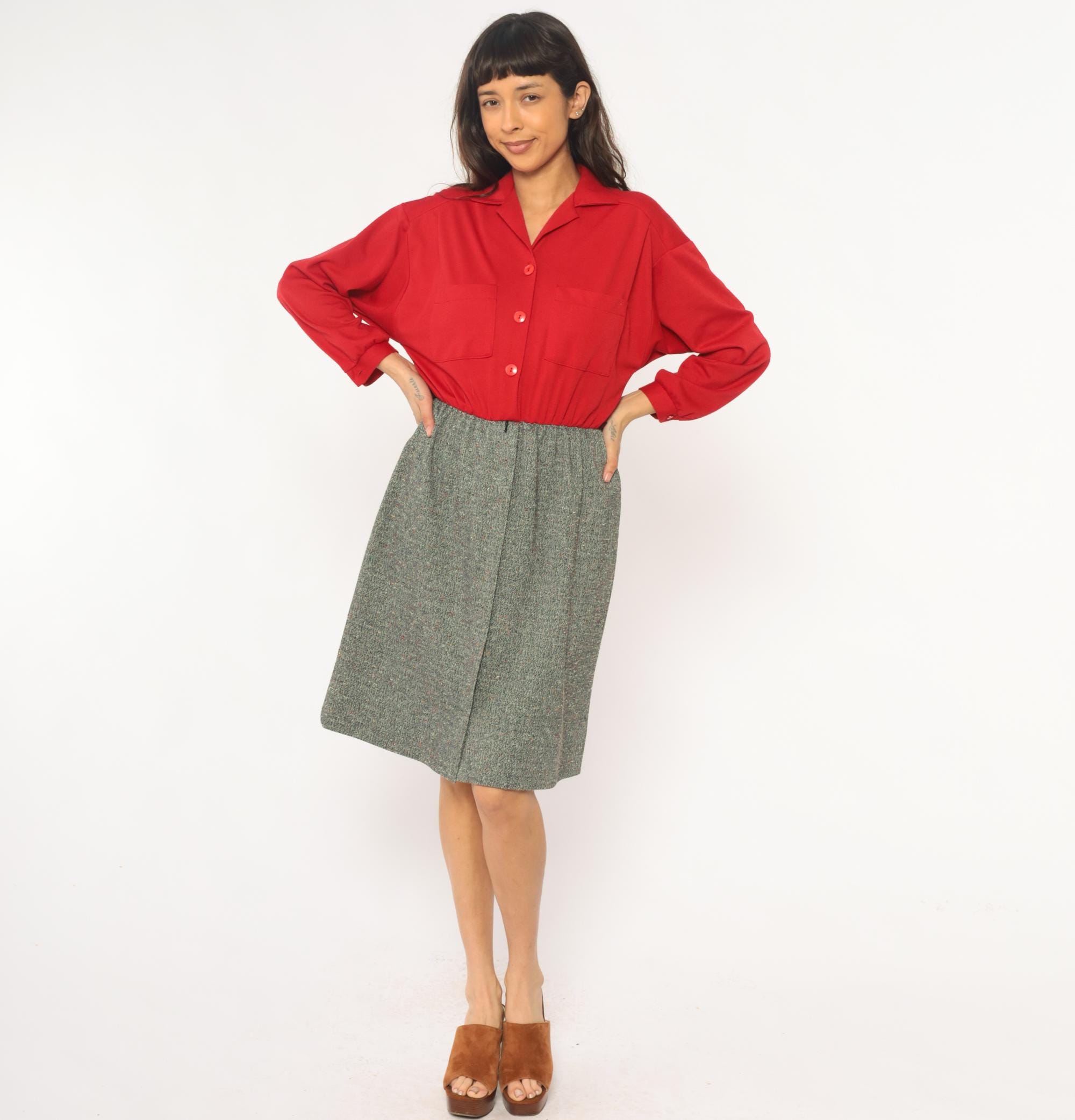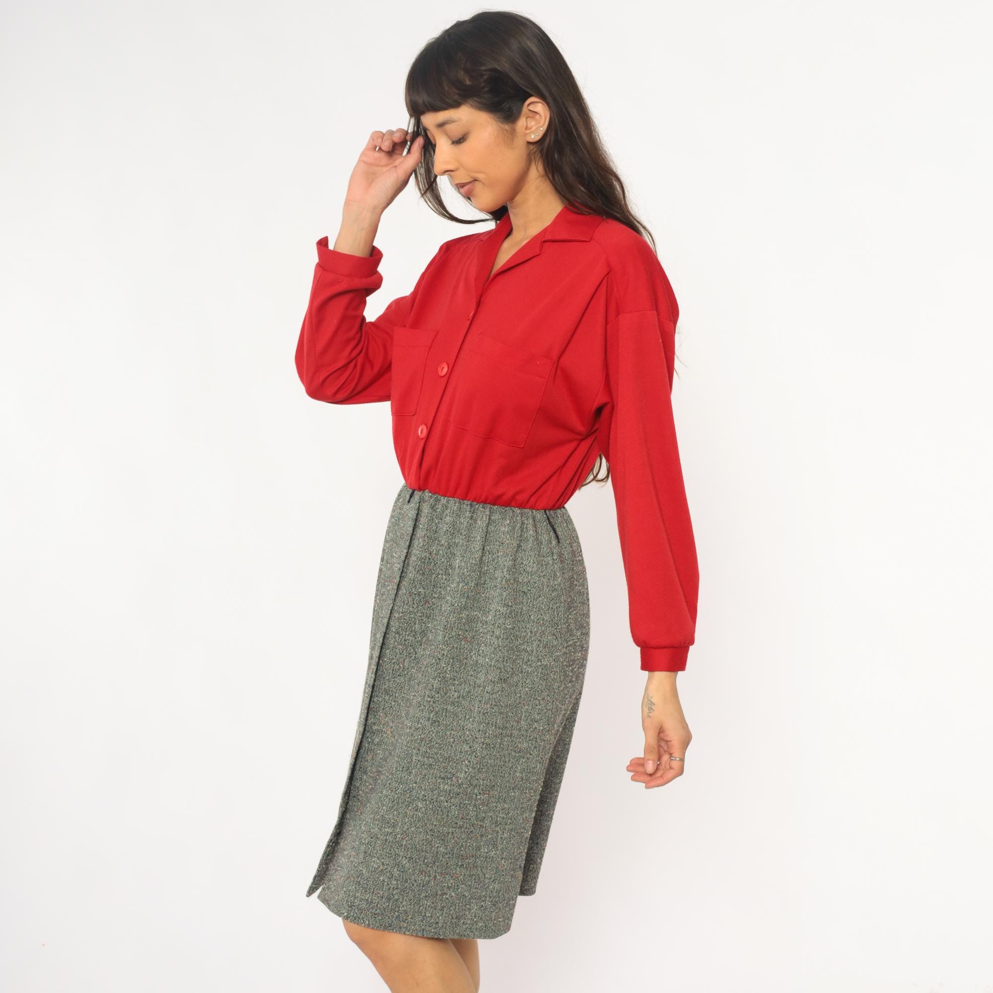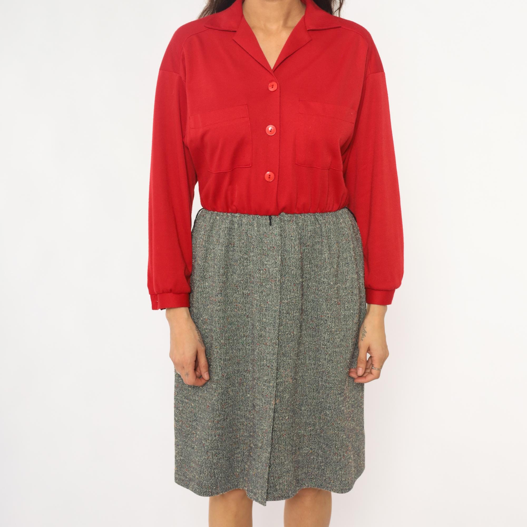 70s red button-front shirt from lady carol petites with notched collar and two chest pockets. Long sleeves with gathered cuffs, three-button closure down the front.