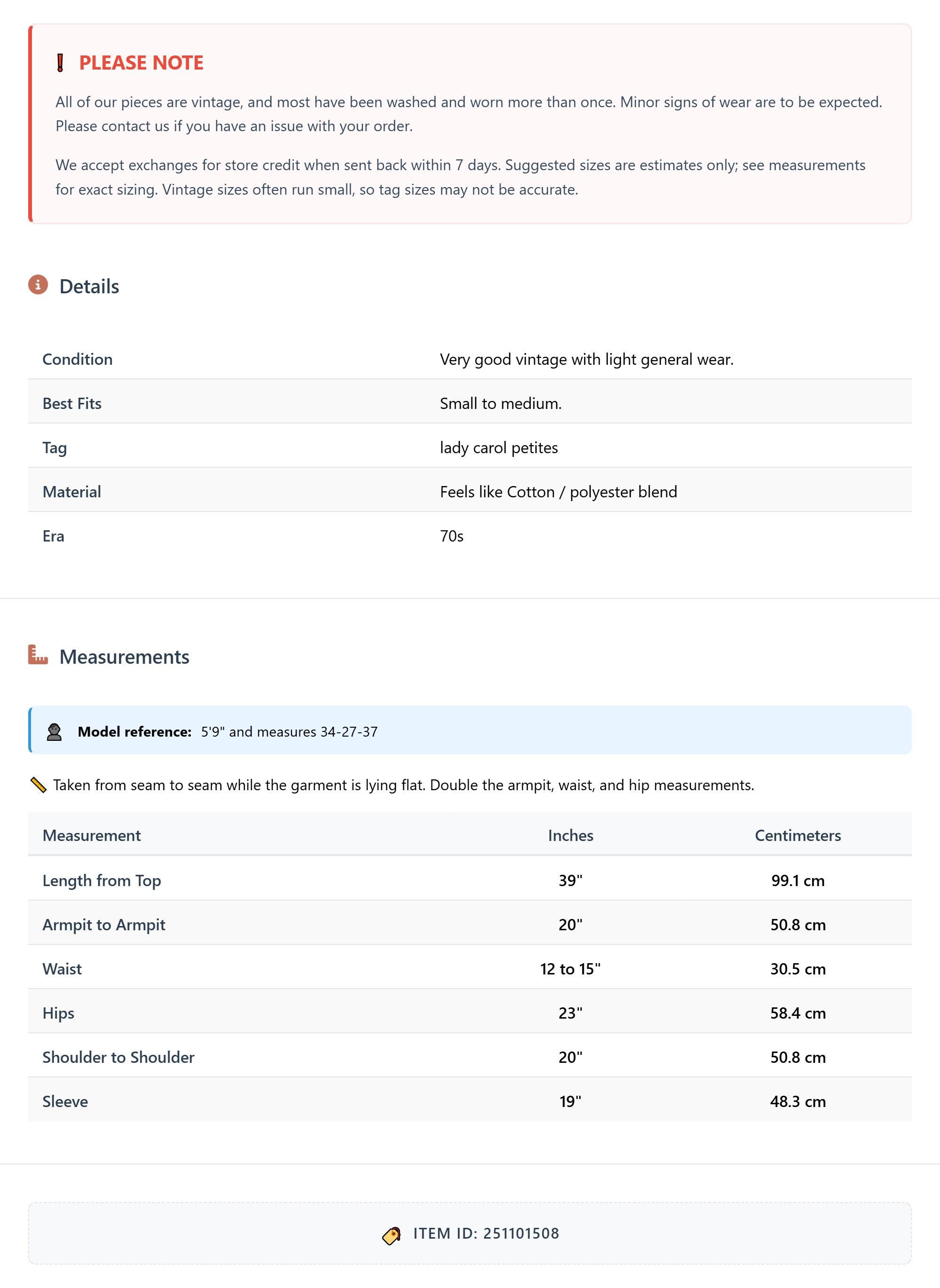 All of our pieces are vintage, and most have been washed and worn more than once. Minor signs of wear are to be expected. Please contact us if you have an issue with your order. We accept exchanges for store credit when sent back within 7 days.