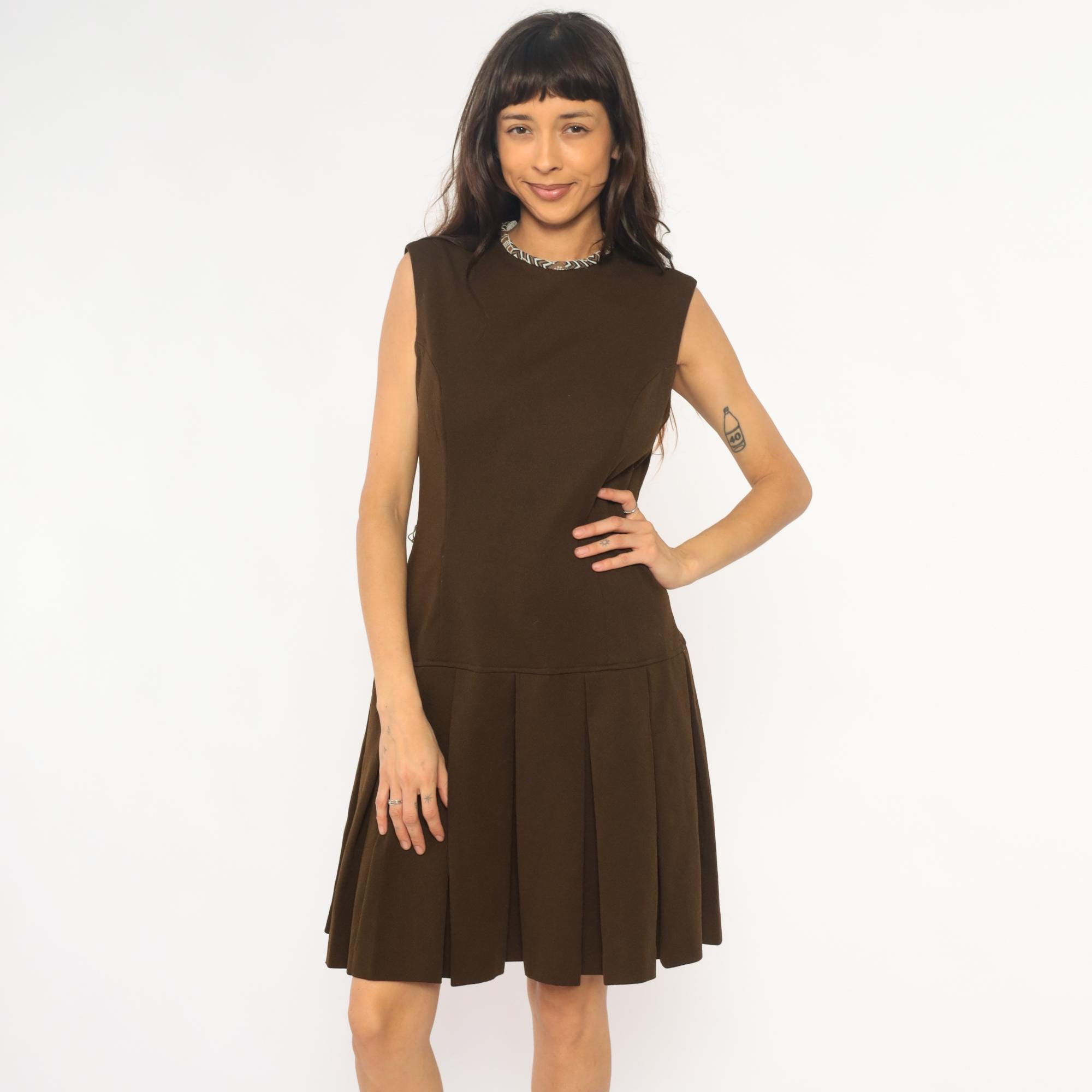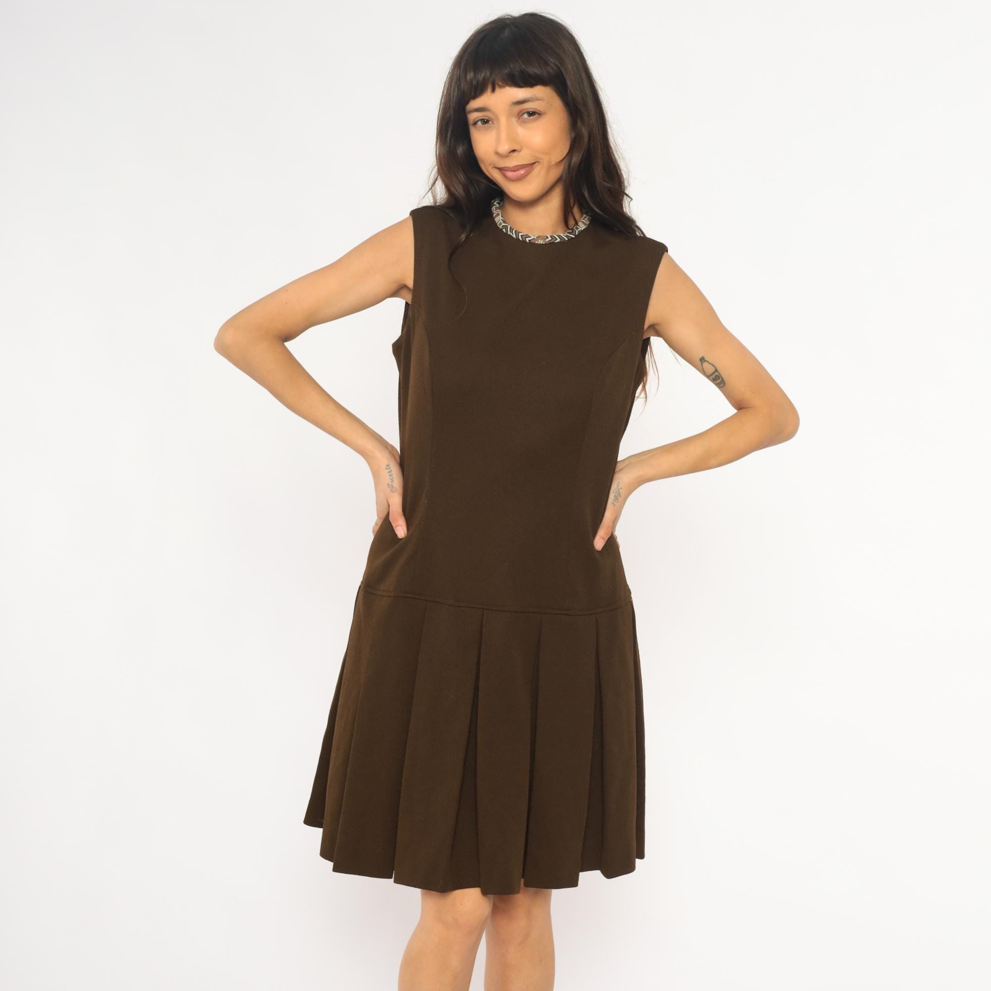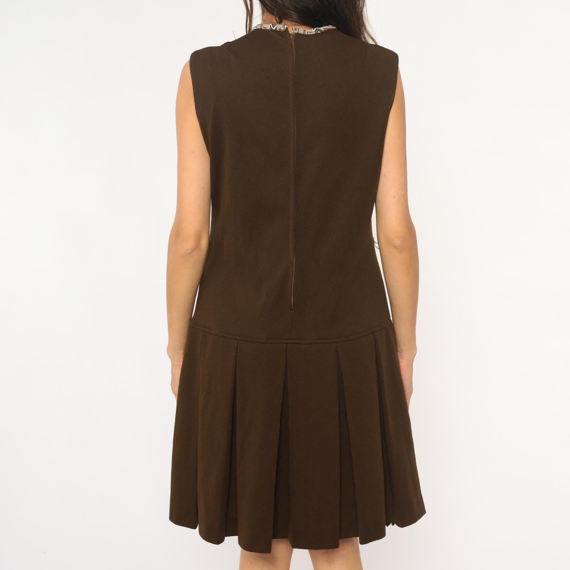 70s brown dress from its better with drop waist silhouette and sleeveless bodice. Geometric patterned trim at neckline in blue, brown, and cream. Fitted bodice with back zipper, pleated skirt below drop waist.