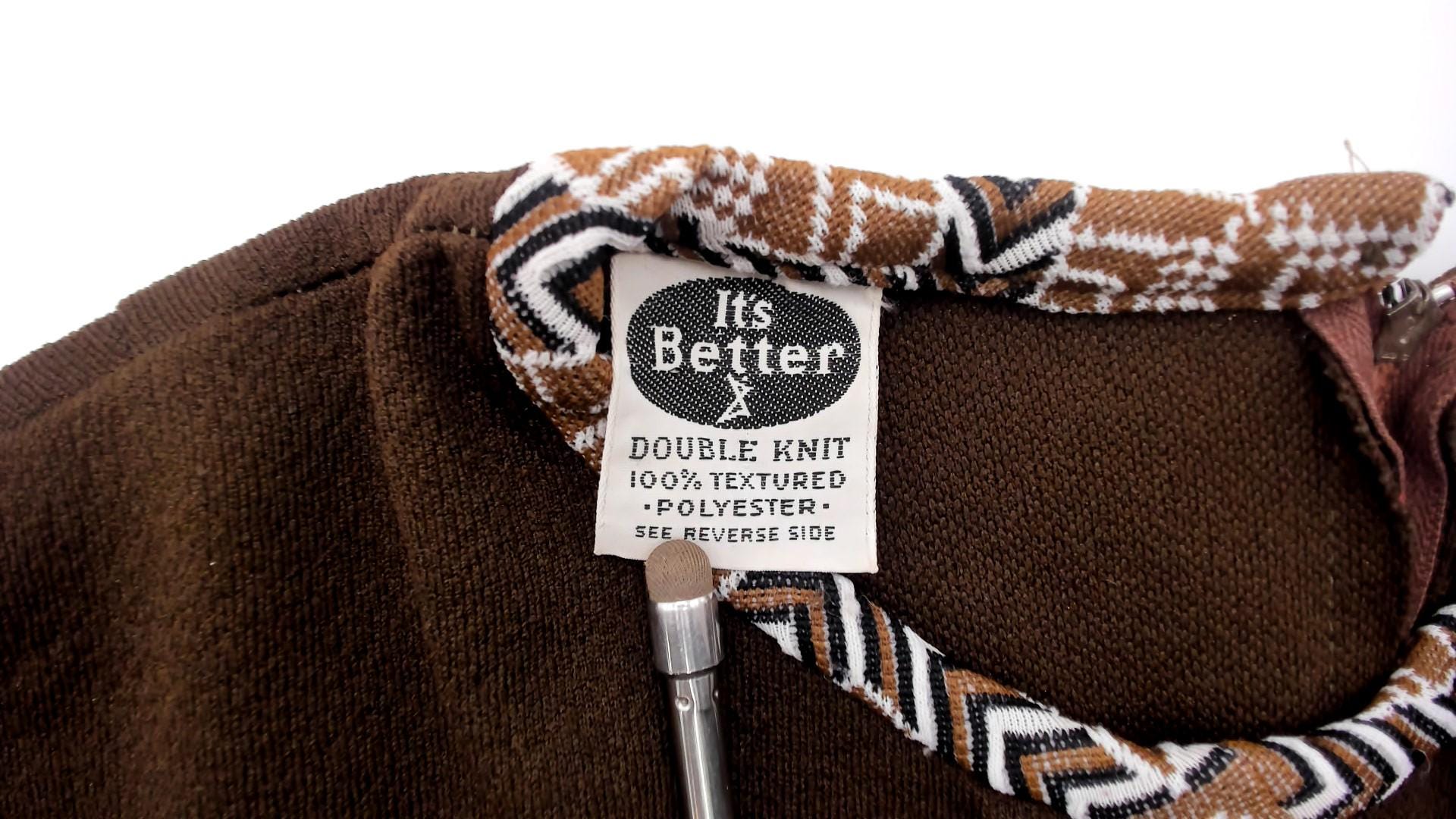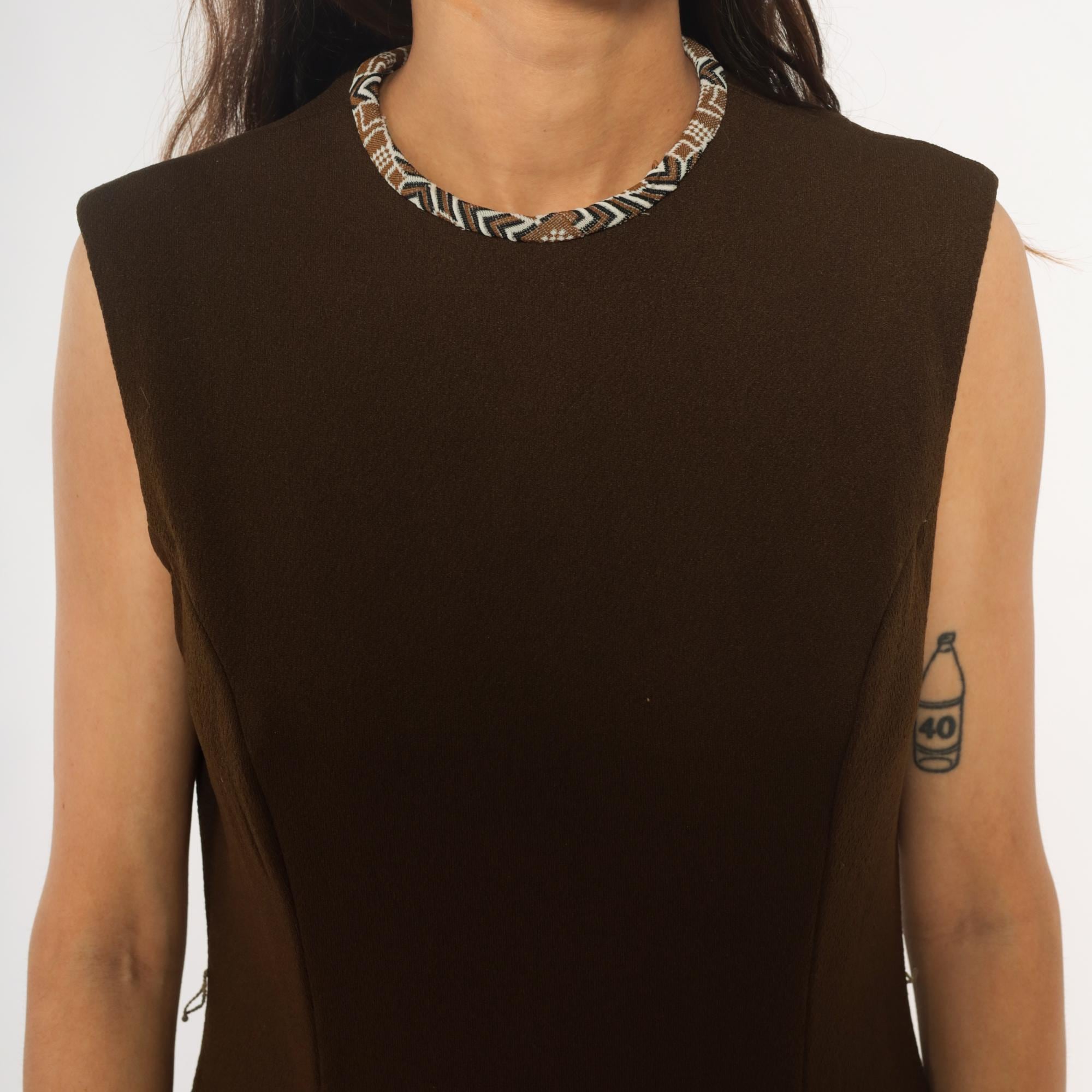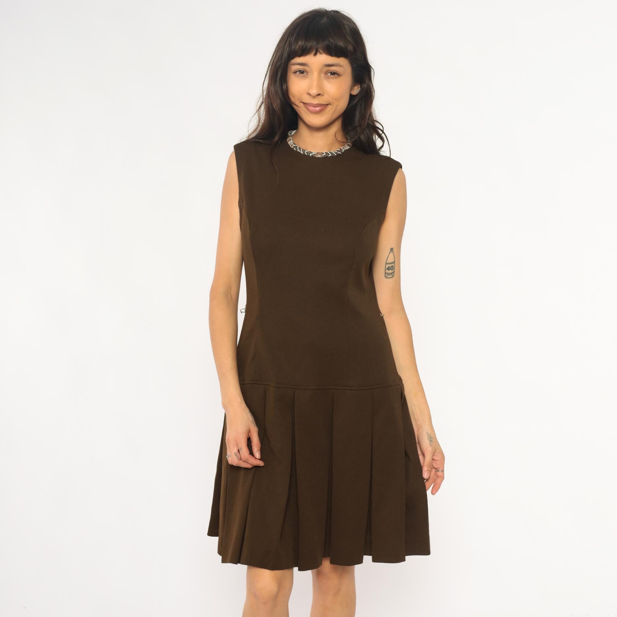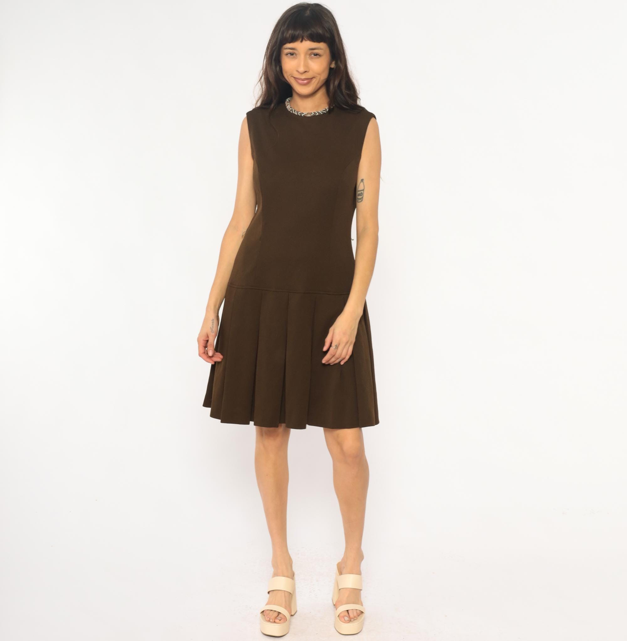 70s brown dress from its better with drop waist silhouette and sleeveless bodice. Geometric patterned trim at neckline in blue, brown, and cream. Fitted bodice with back zipper, pleated skirt below drop waist.
