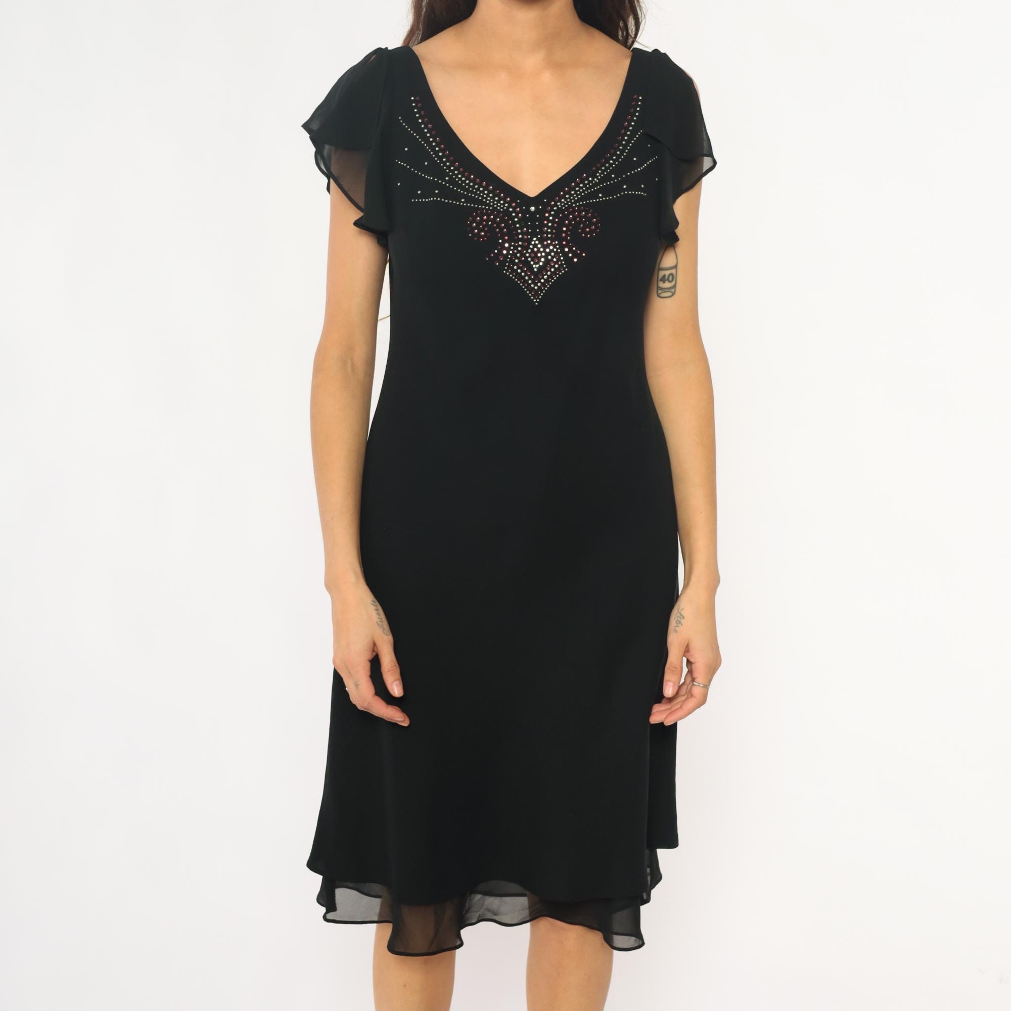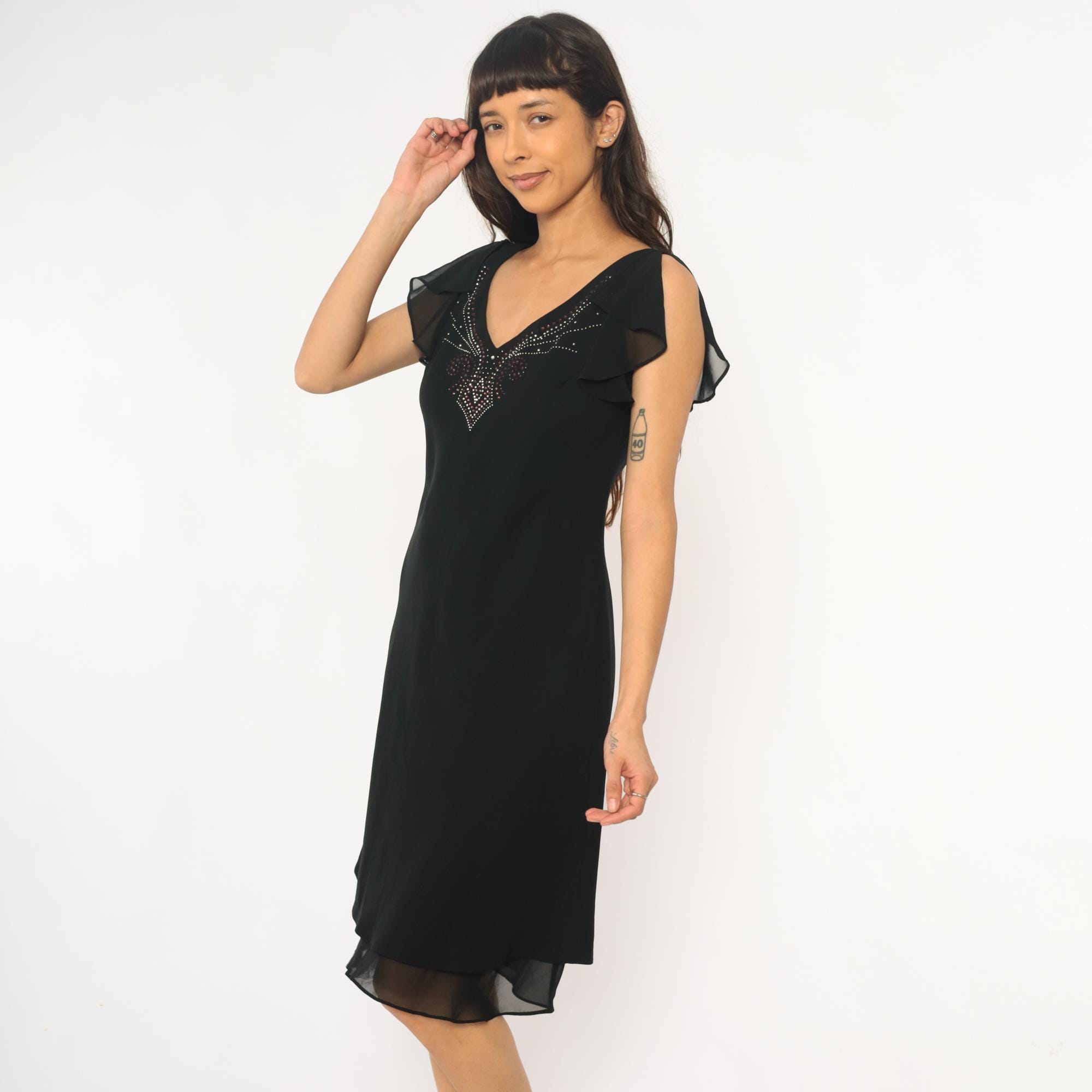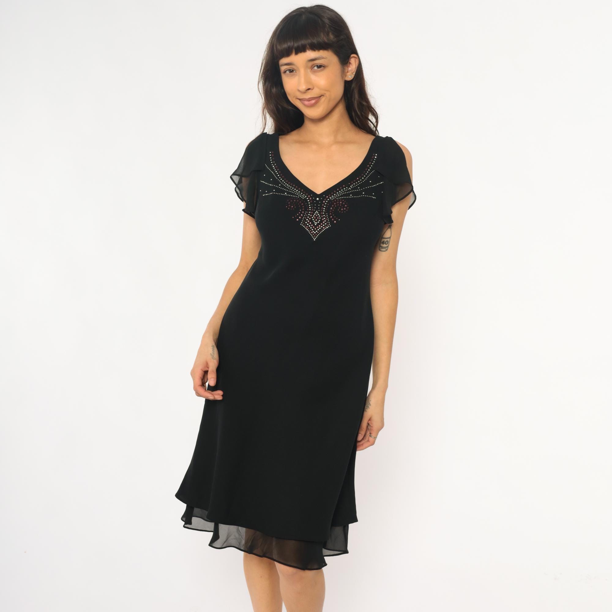90s black dress from sheri martin with rhinestone embellishment across the V-neckline in geometric pattern. Short sheer ruffled cap sleeves, fitted bodice, V-neck at front and back.