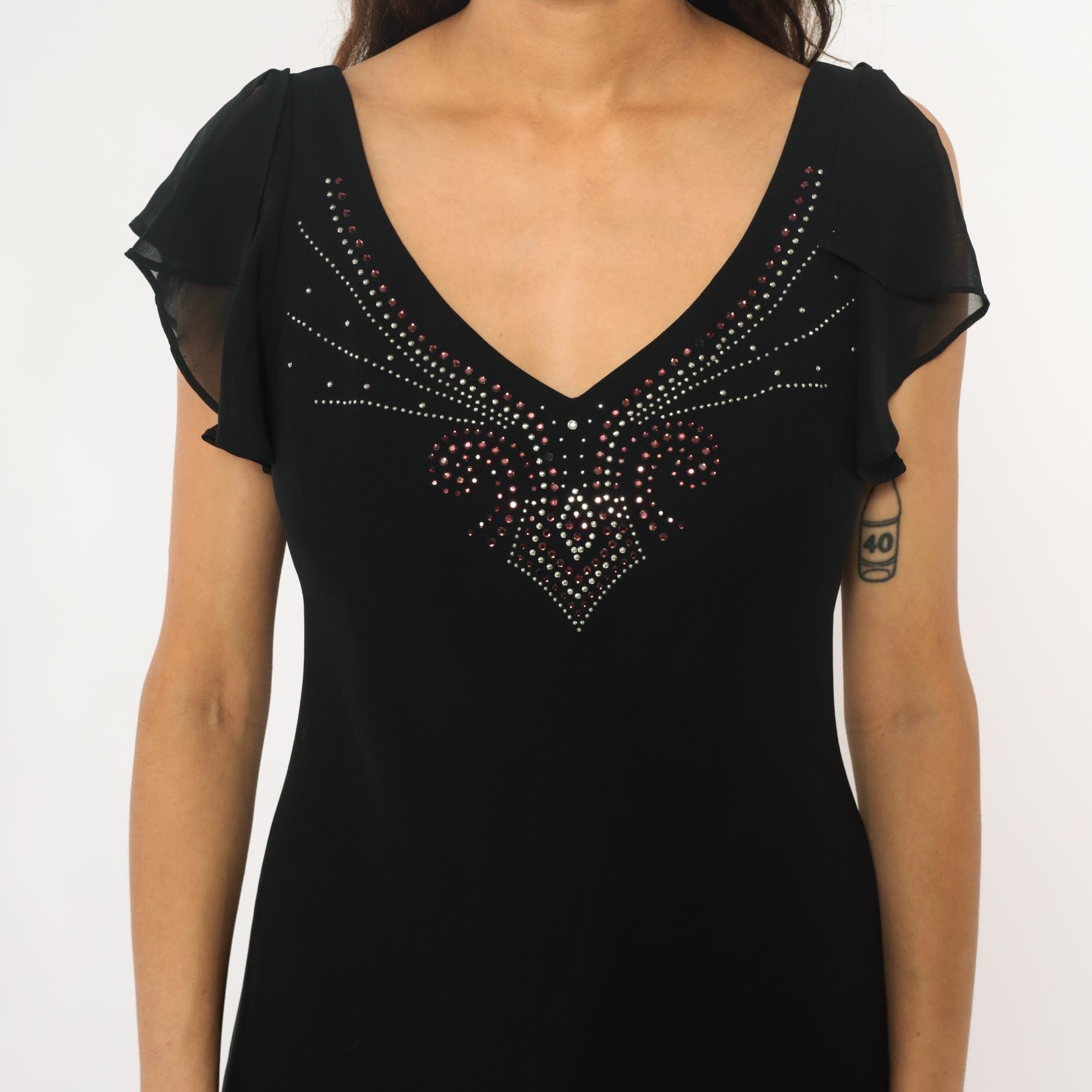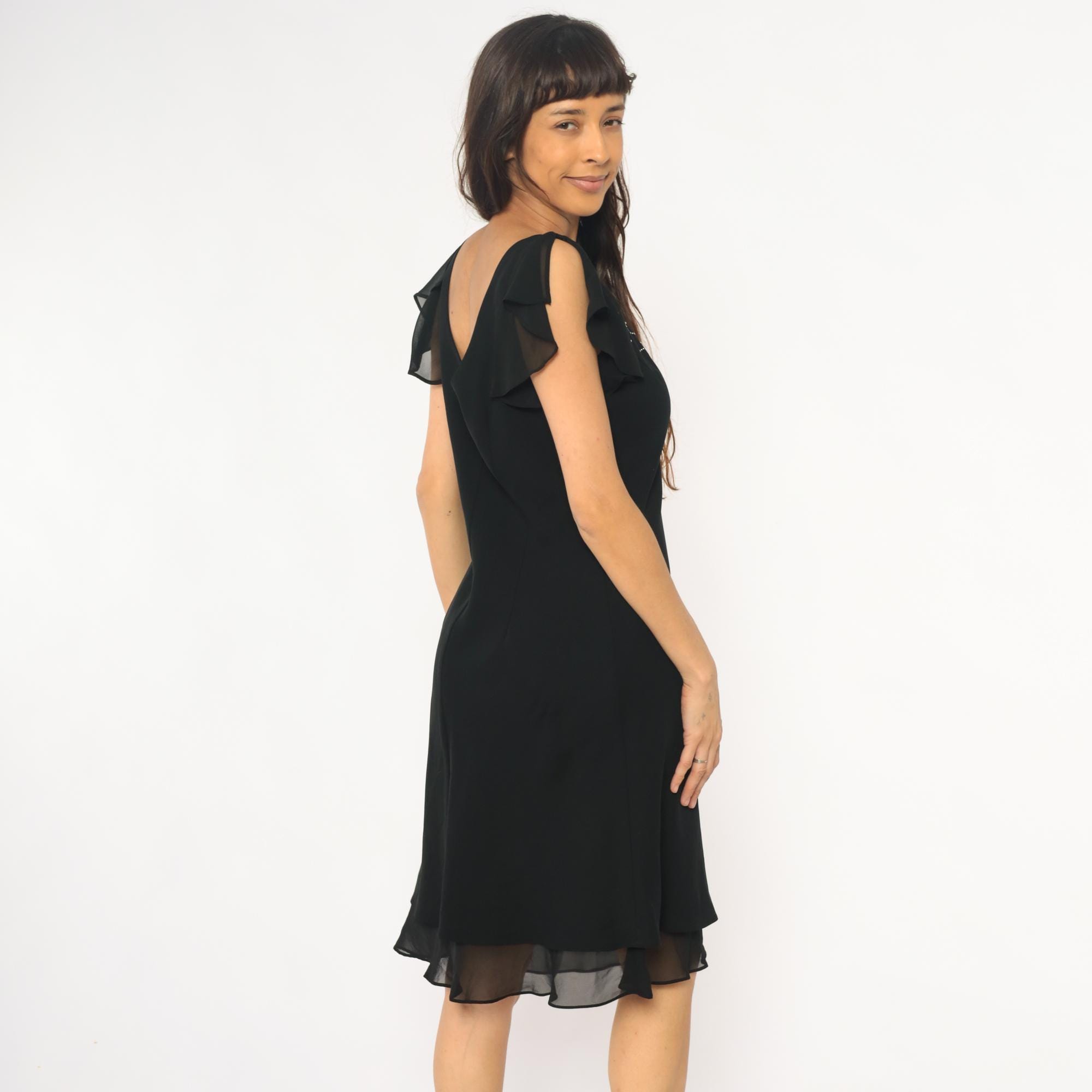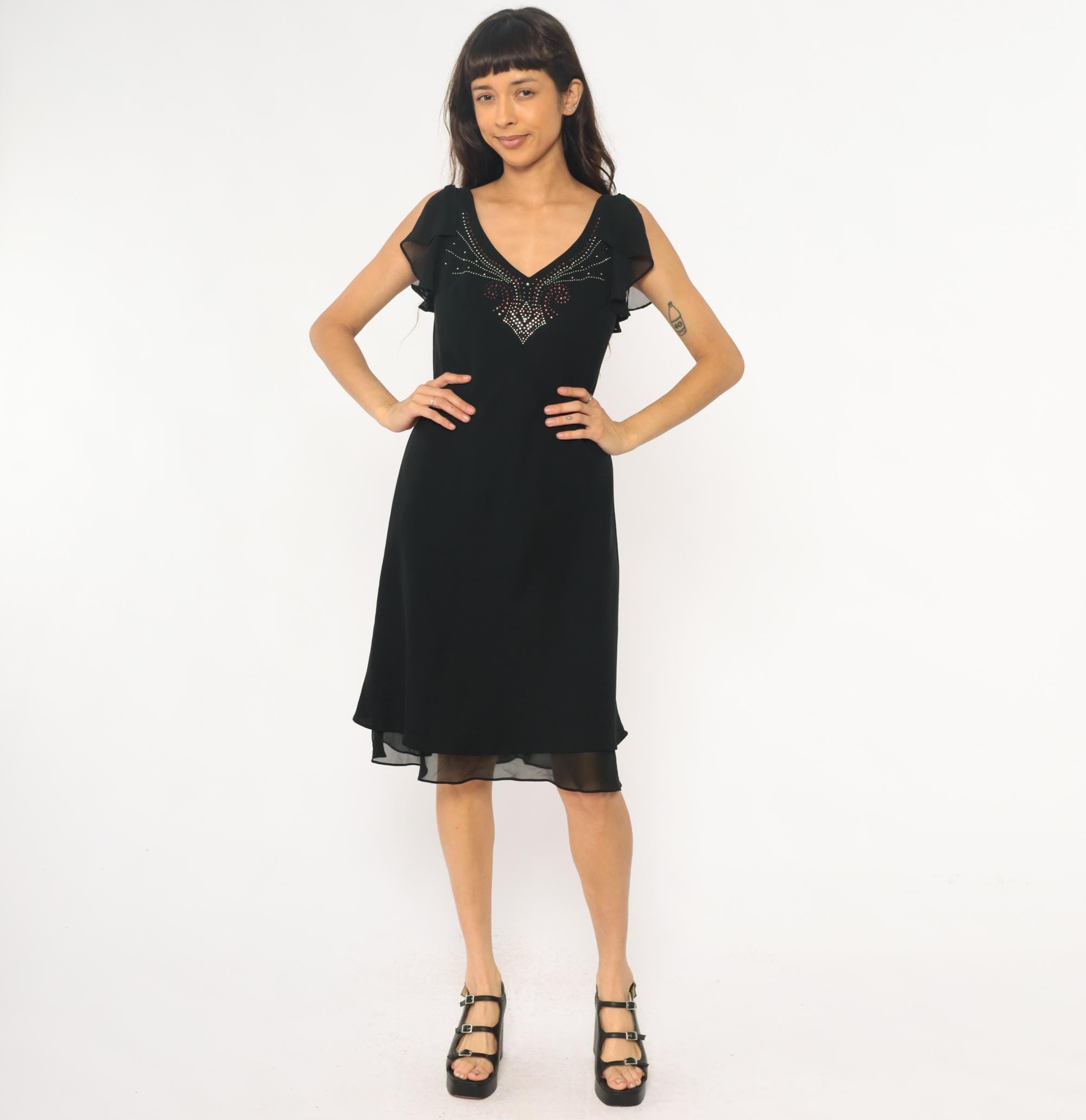 90s black dress from sheri martin with rhinestone embellishment across the V-neckline in geometric pattern. Short sheer ruffled cap sleeves, fitted bodice, V-neck at front and back.