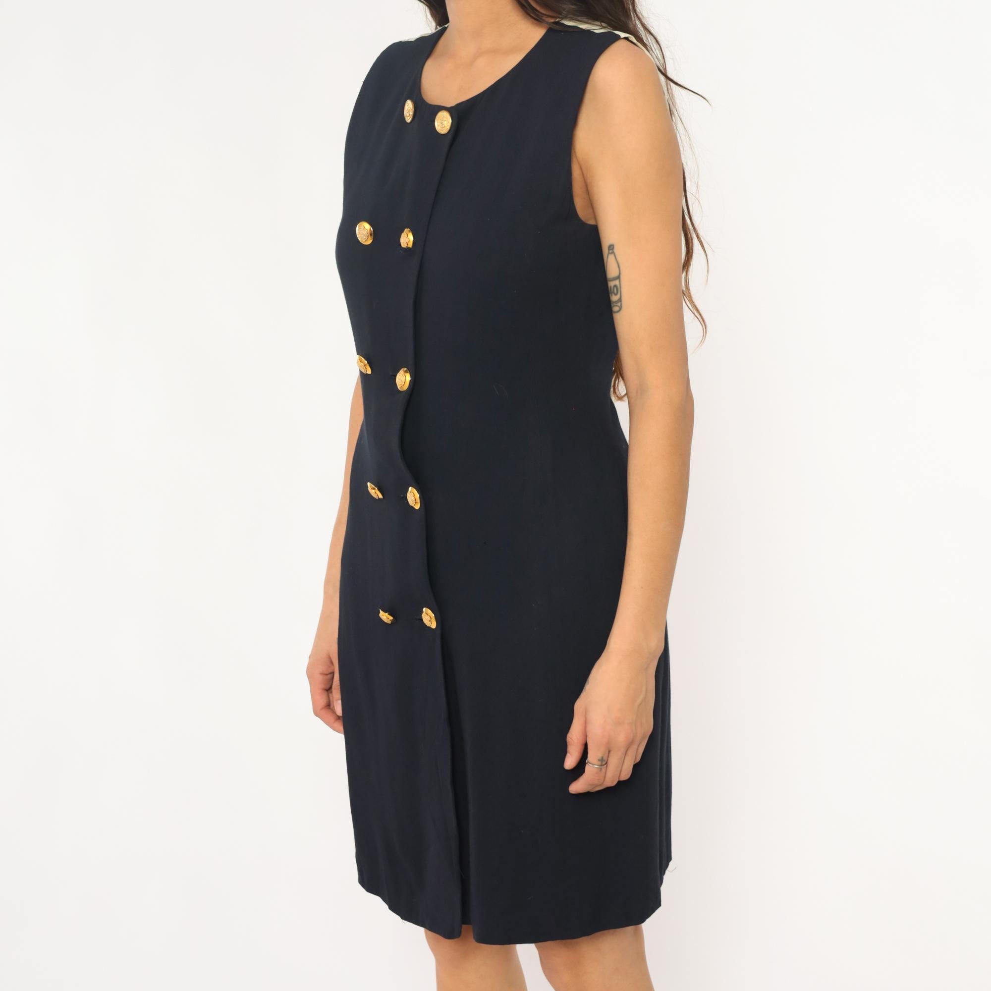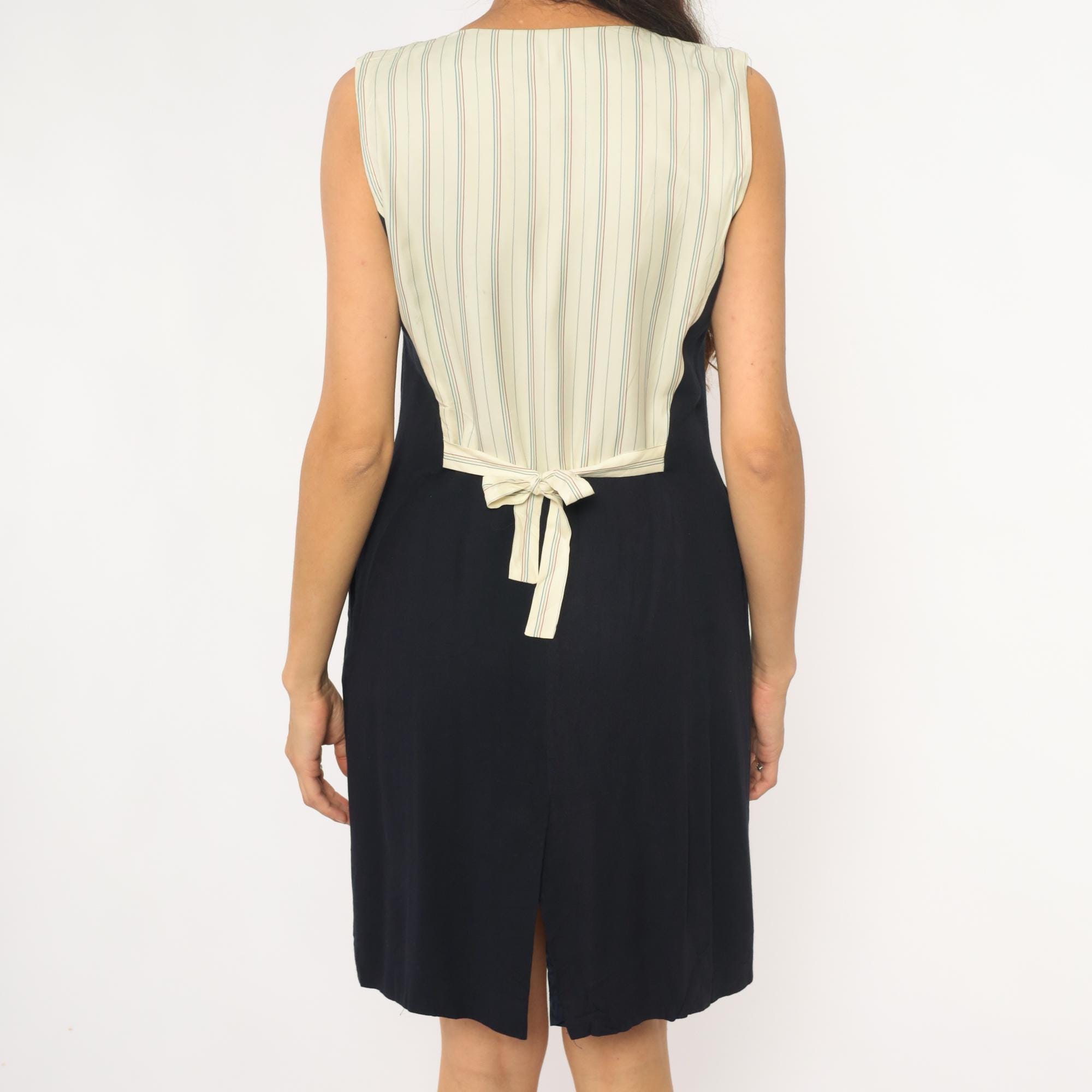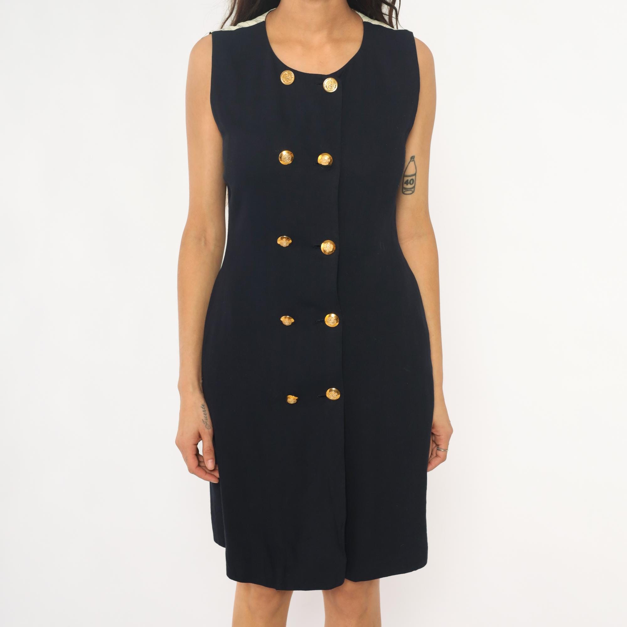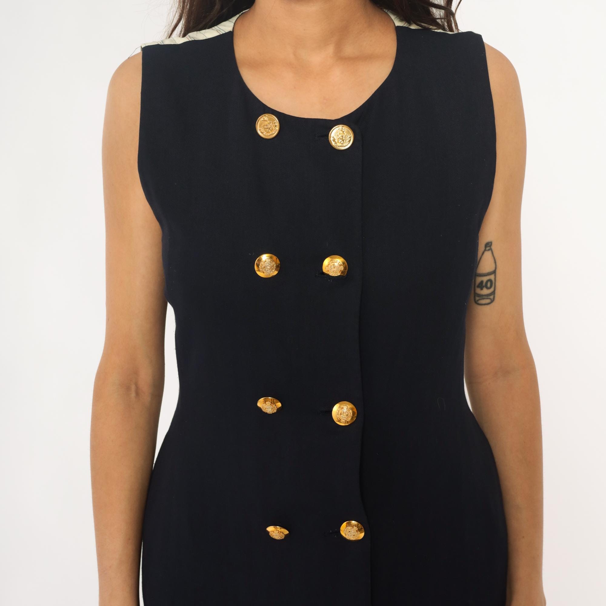 90s navy blue sleeveless dress from liz claiborne with double-breasted gold button front closure. Round neckline, fitted bodice and straight skirt with center back vent. Cream and black striped back panel with tie detail at waist.