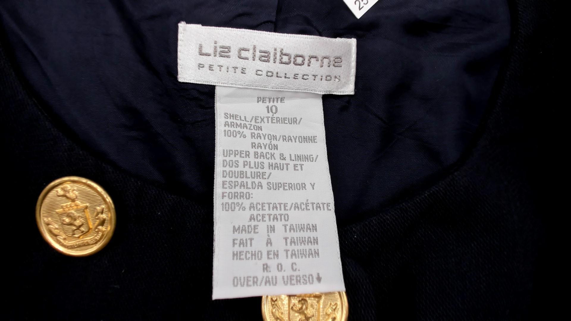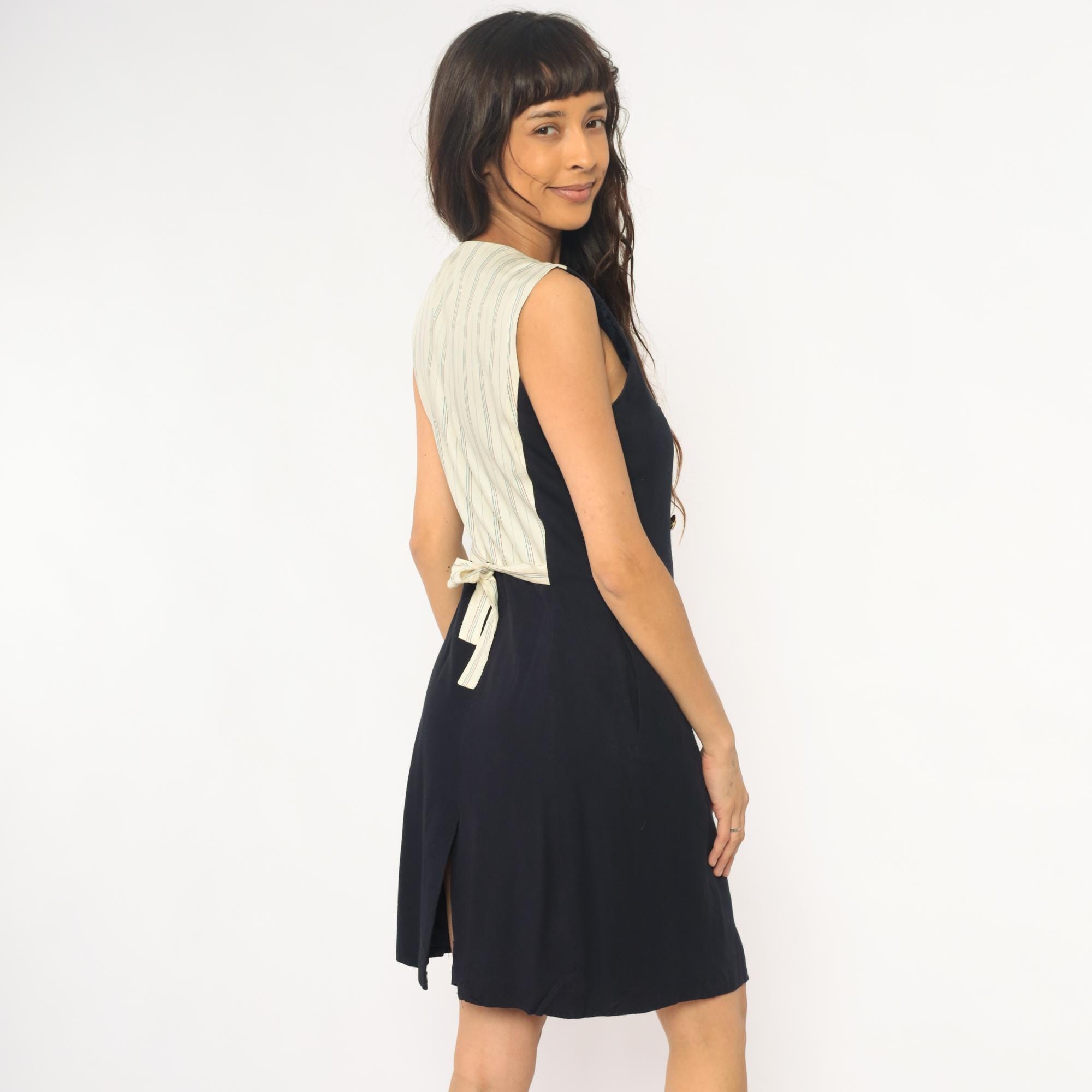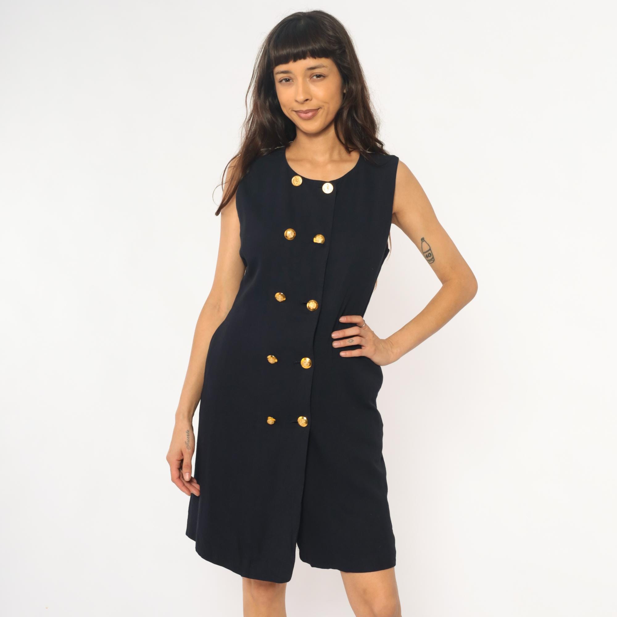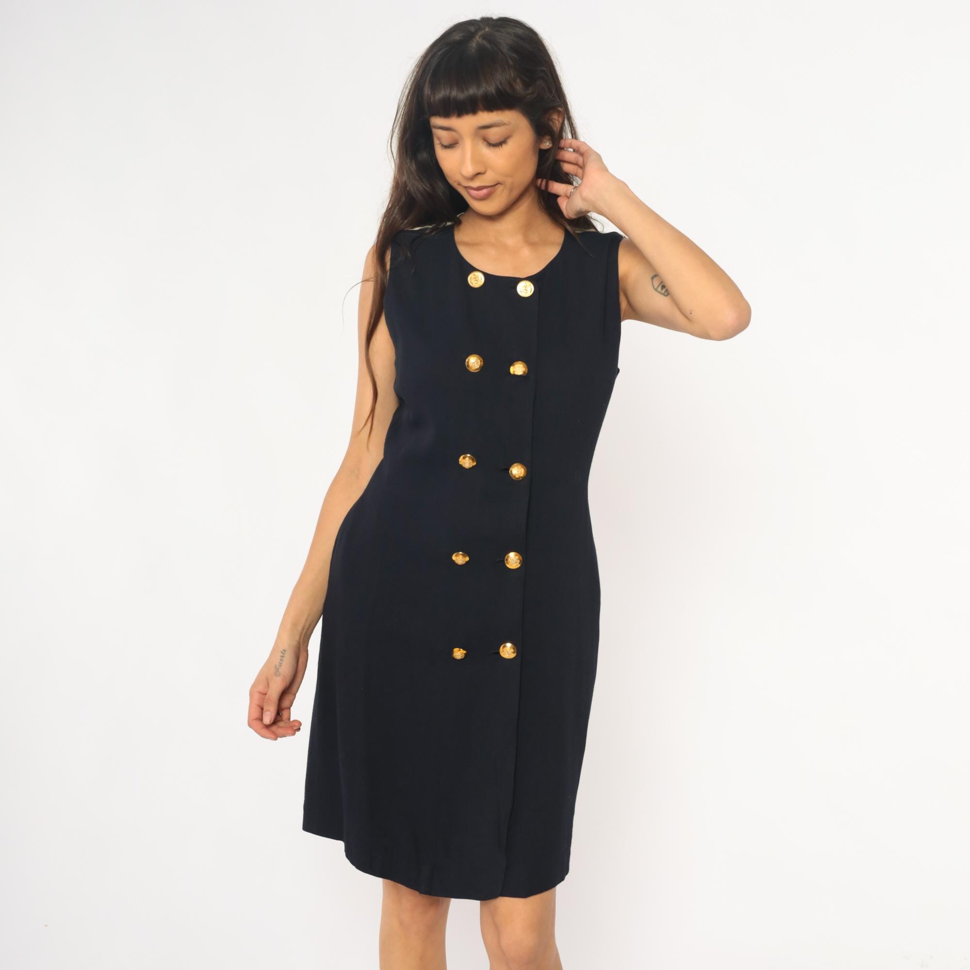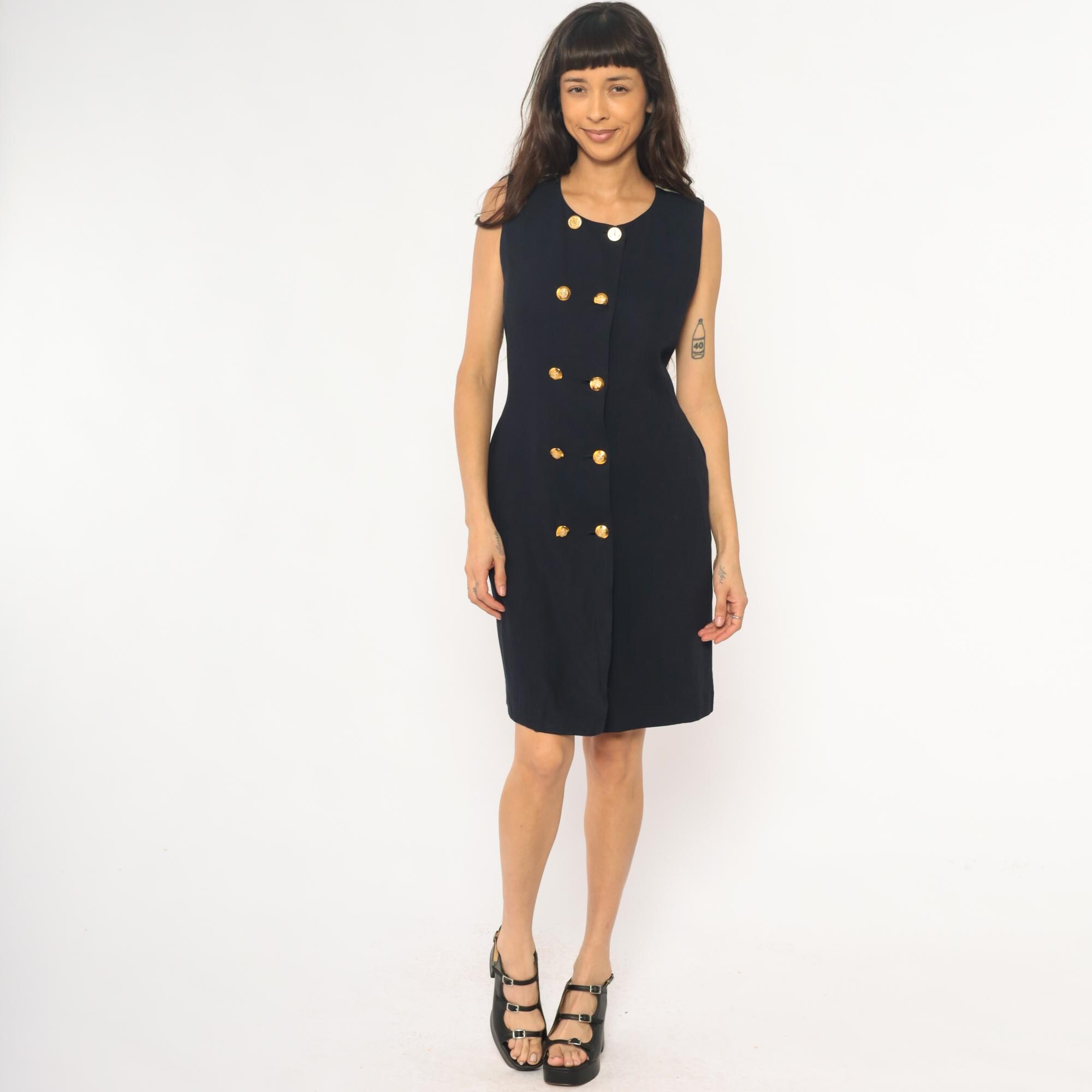 90s navy blue sleeveless dress from liz claiborne with double-breasted gold button front closure. Round neckline, fitted bodice and straight skirt with center back vent. Cream and black striped back panel with tie detail at waist.