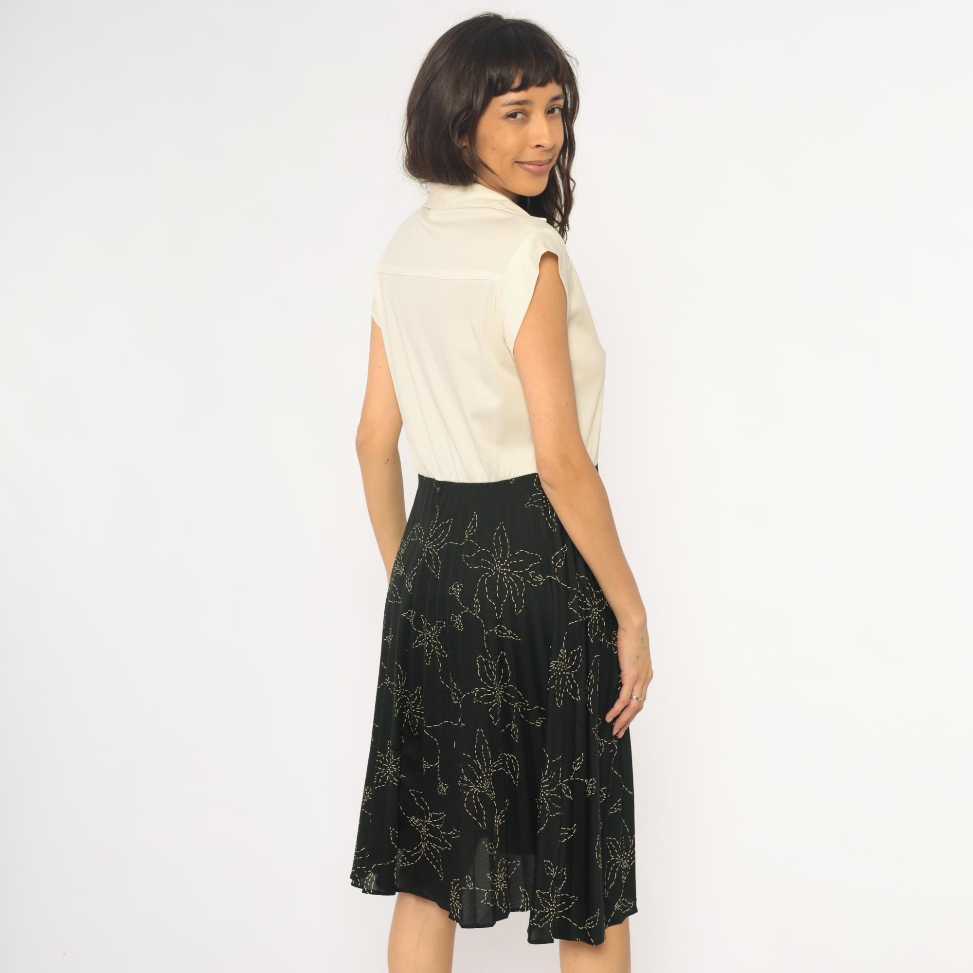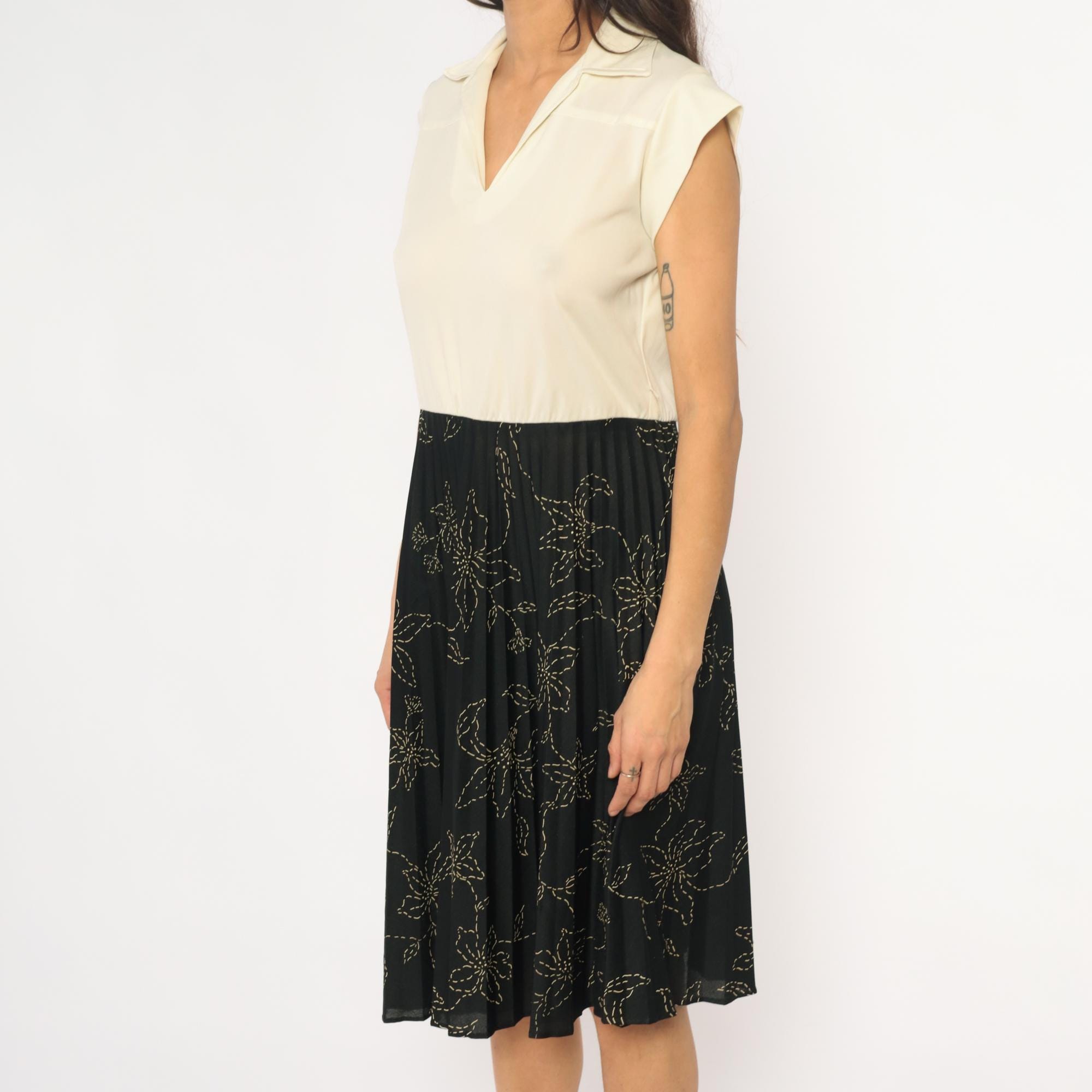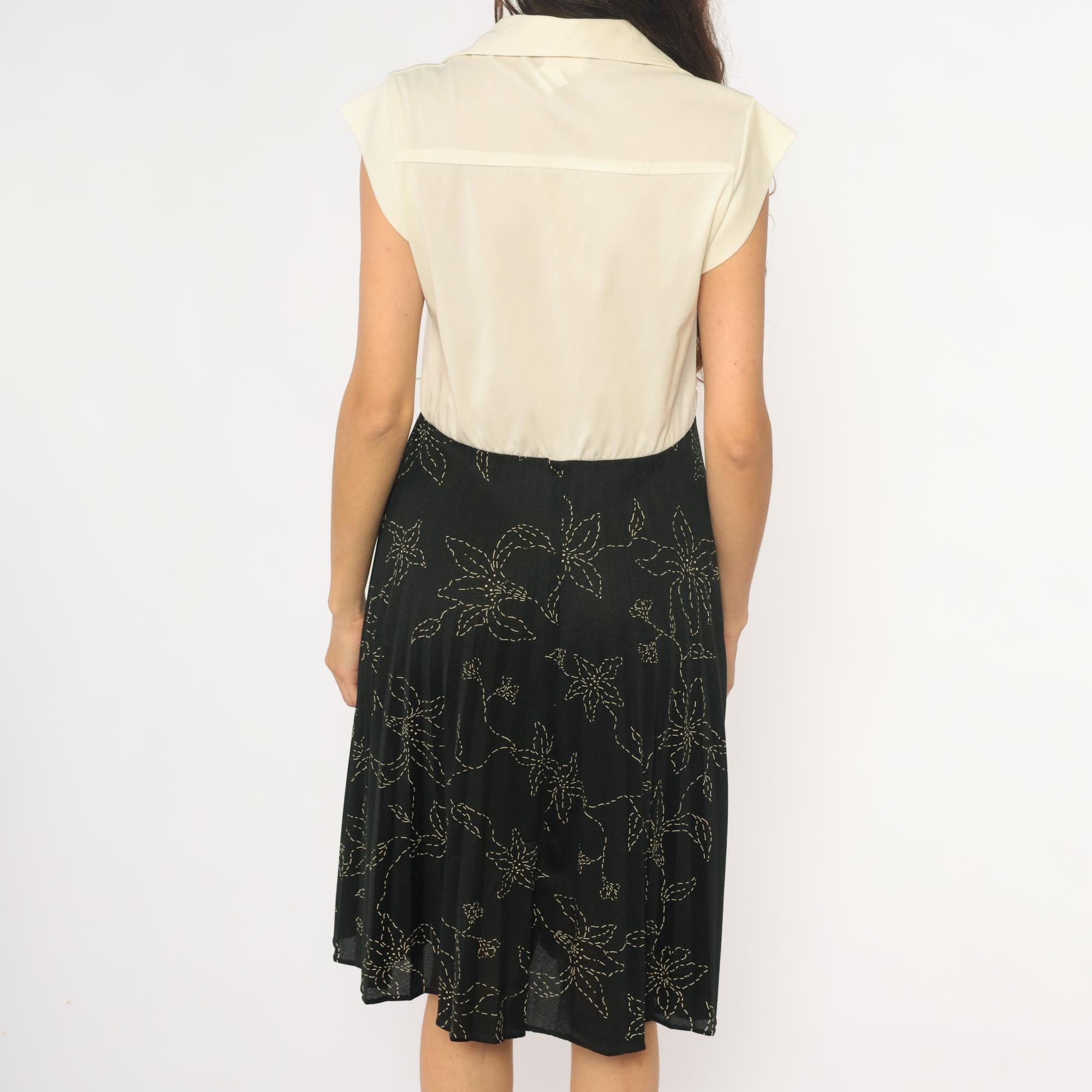 80s color-blocked dress with pale yellow polo collar bodice and black A-line skirt. V-neck with pointed collar, cap sleeves, fitted bodice. Black skirt portion features golden embroidered floral pattern throughout.