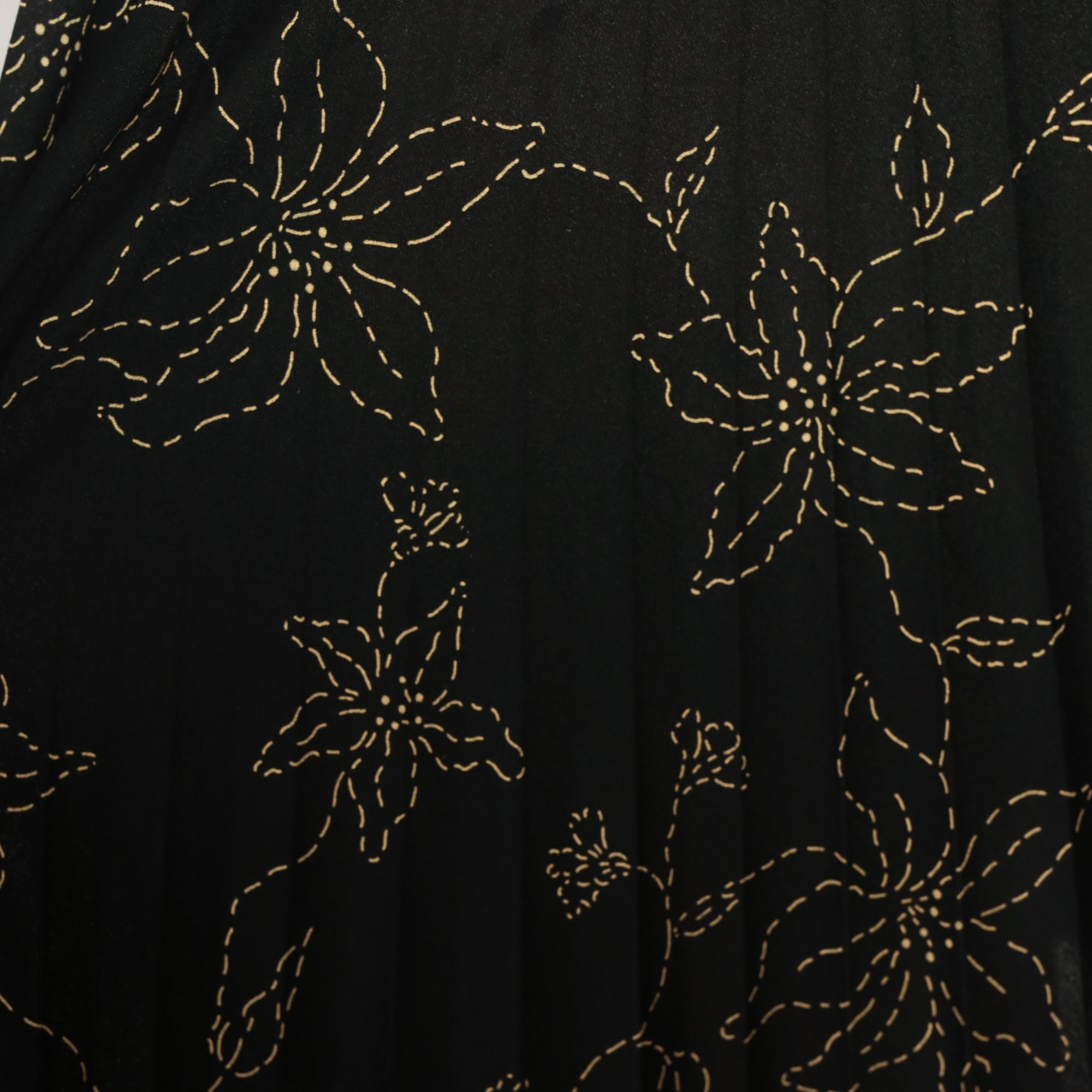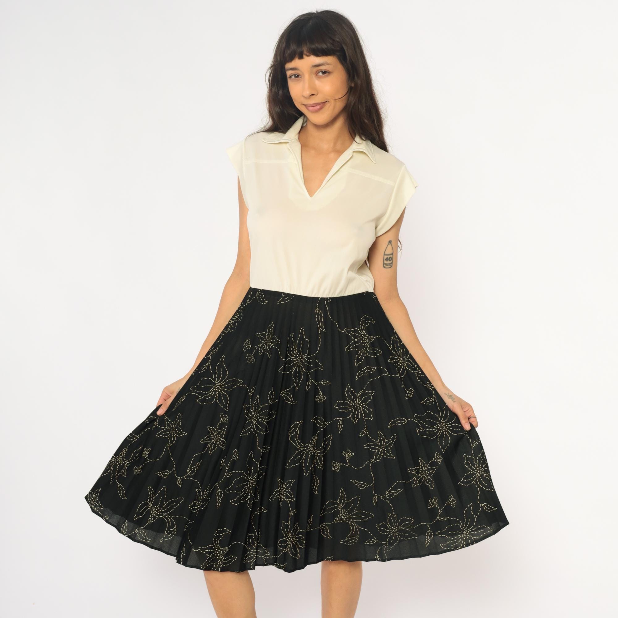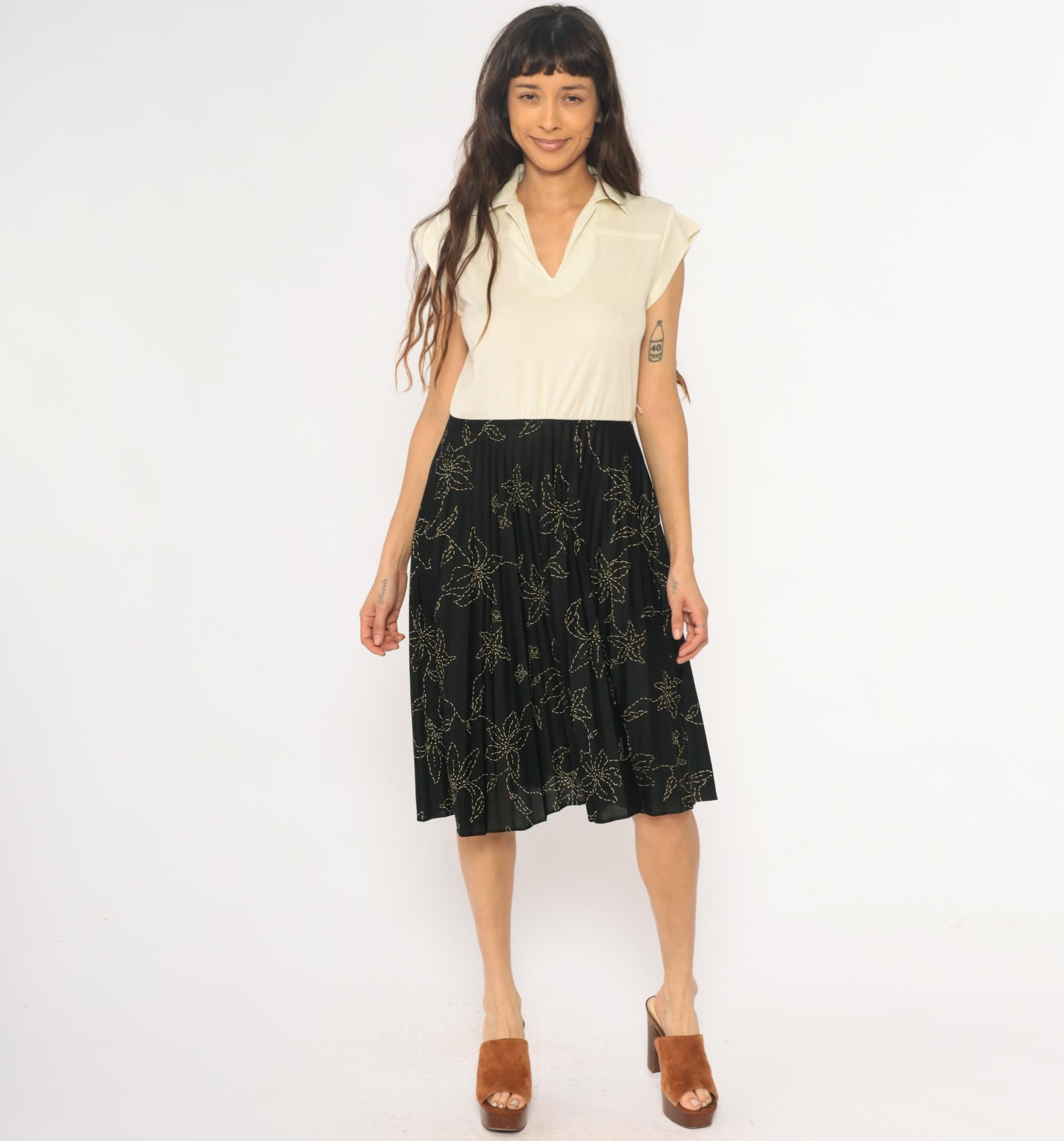 80s color-blocked dress with pale yellow polo collar bodice and black A-line skirt. V-neck with pointed collar, cap sleeves, fitted bodice. Black skirt portion features golden embroidered floral pattern throughout.