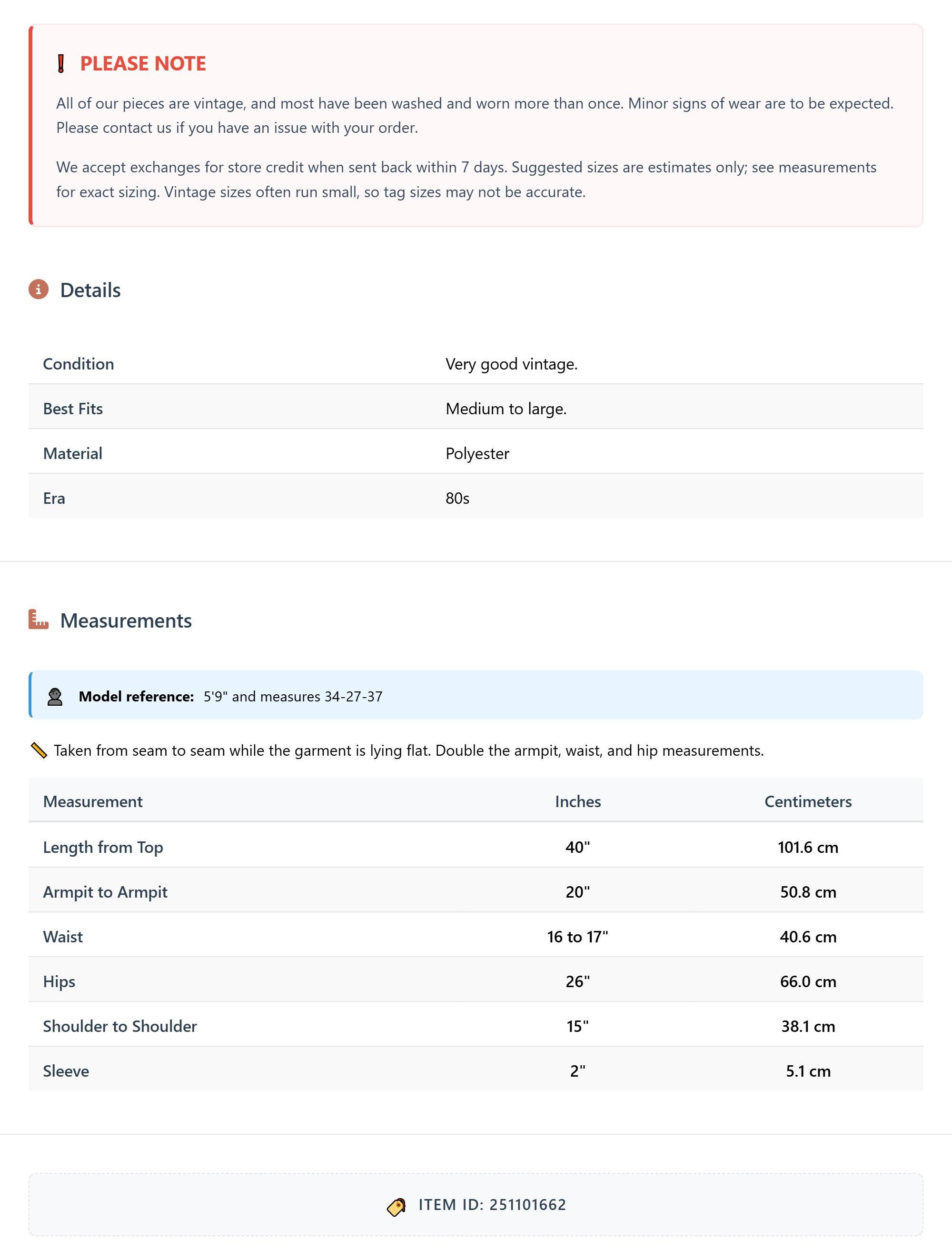 Suggested sizes are estimates only; see measurements for exact sizing. Vintage sizes often run small, so tag sizes may not be accurate.
