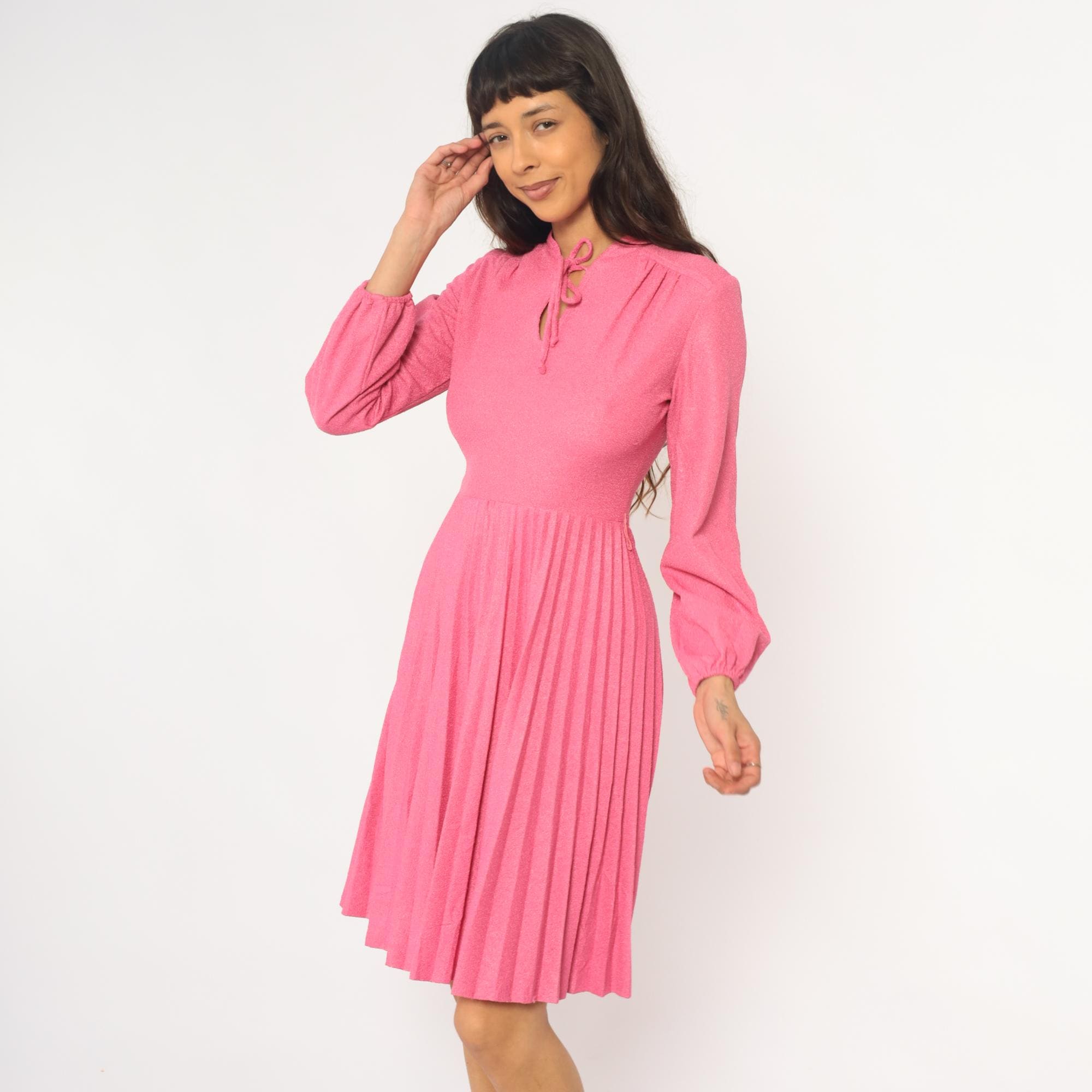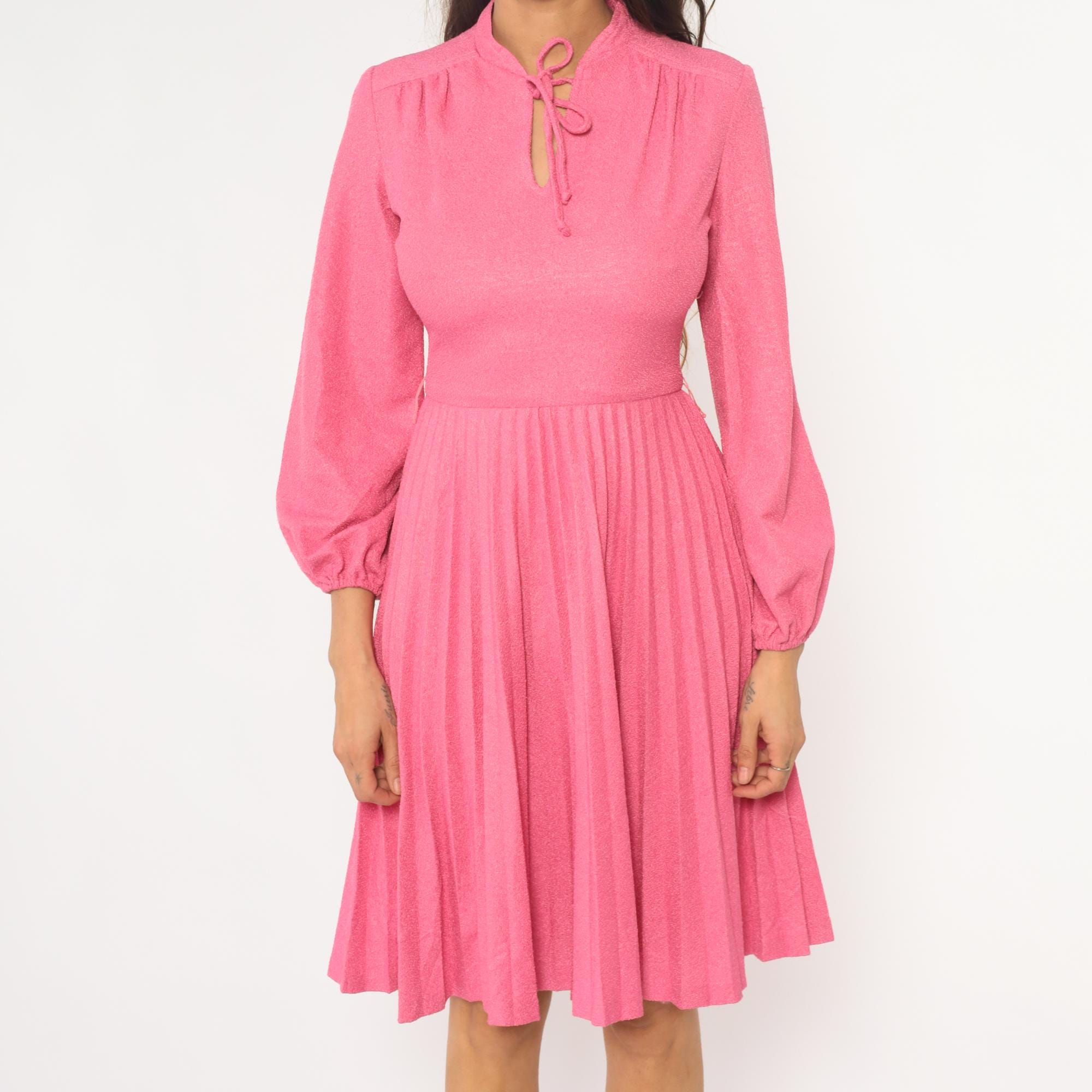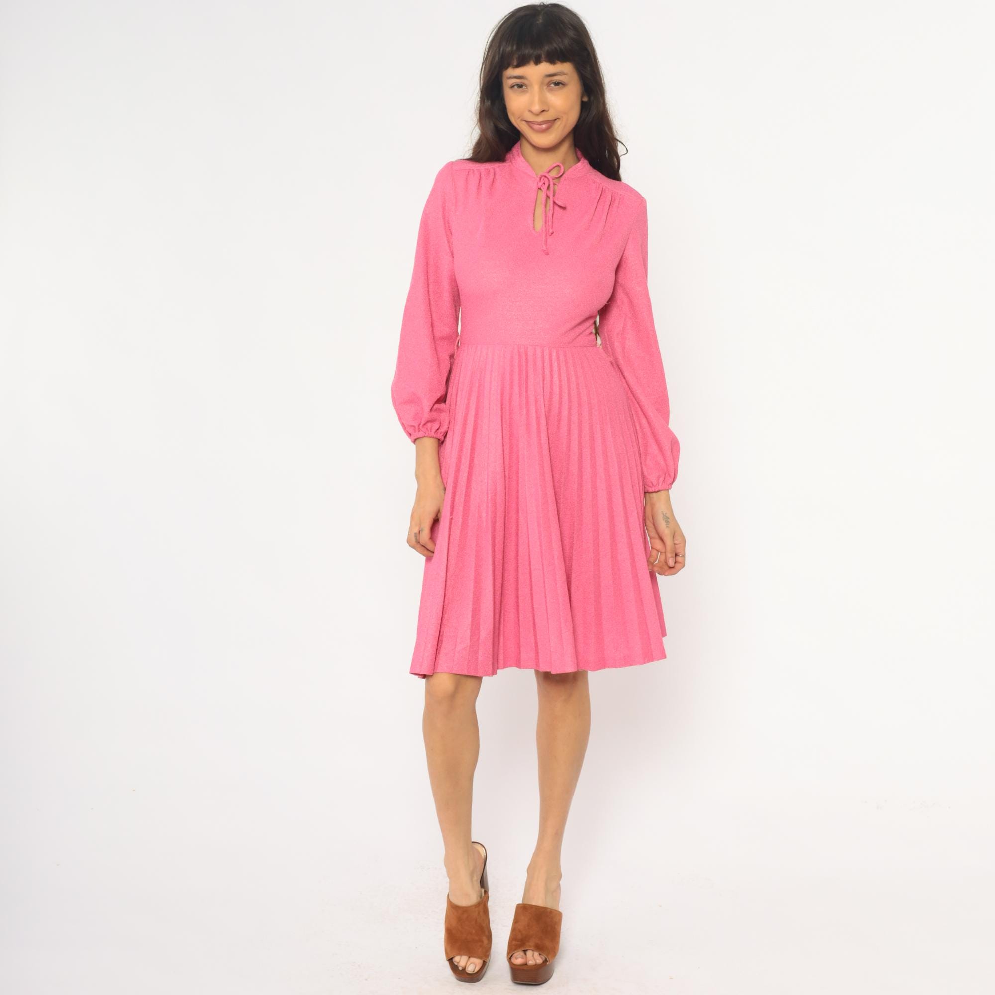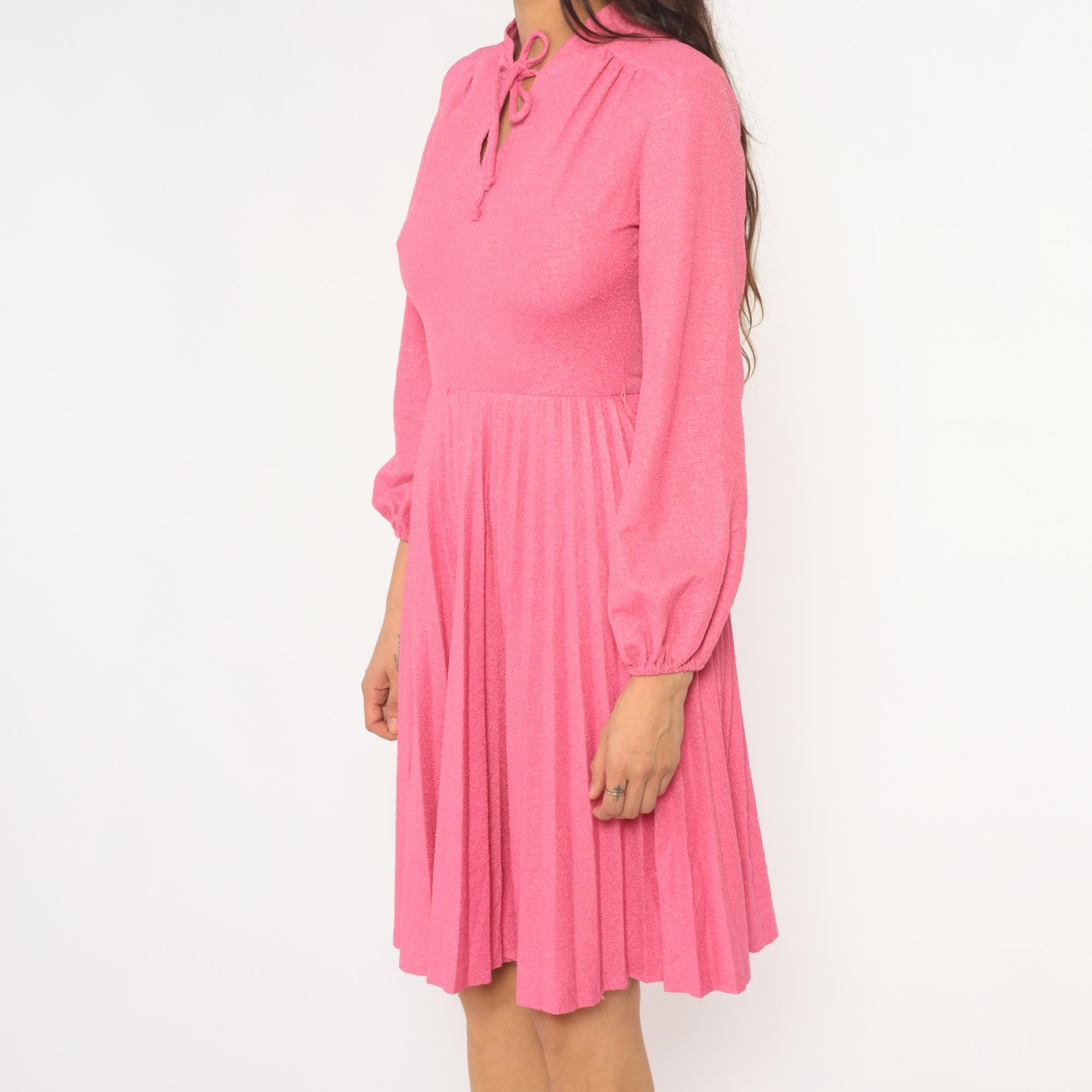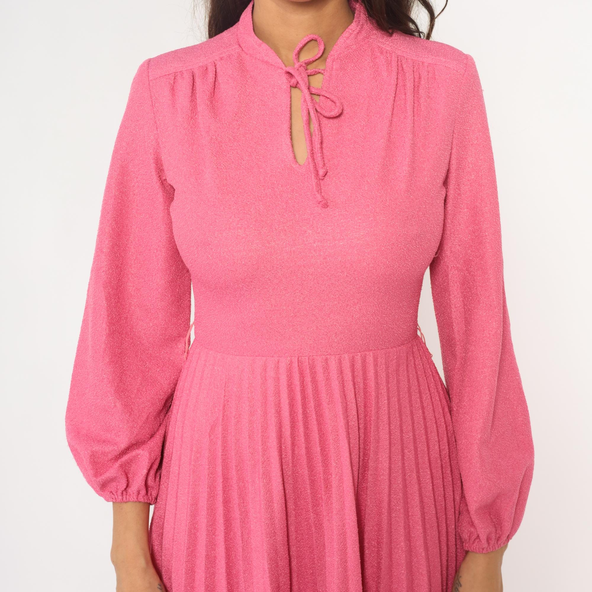 Hot pink 70s midi dress with mock neck, keyhole opening, and decorative tie closure at front. Long sleeves with gathered shoulders and elastic cuffs, fitted bodice, pleated skirt.