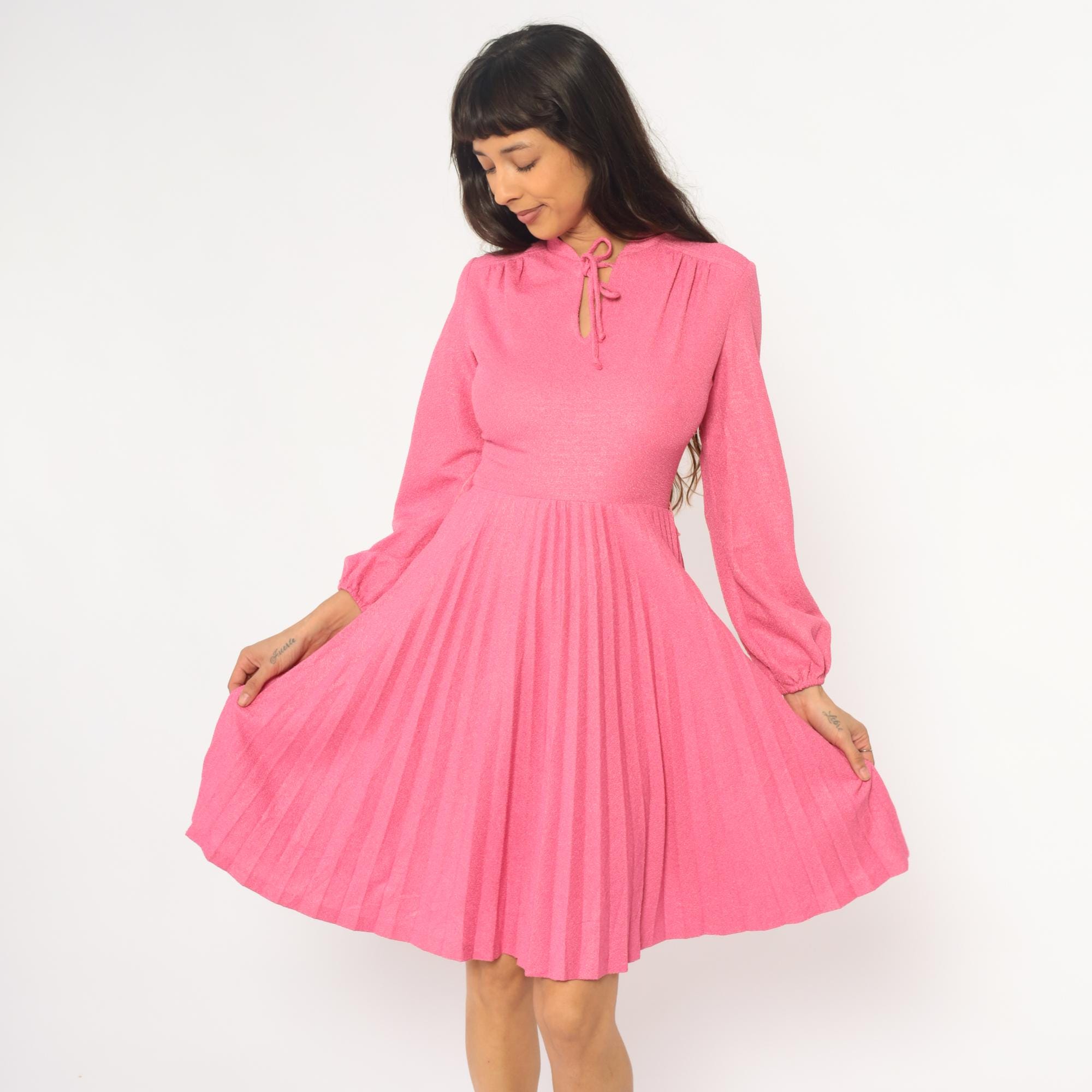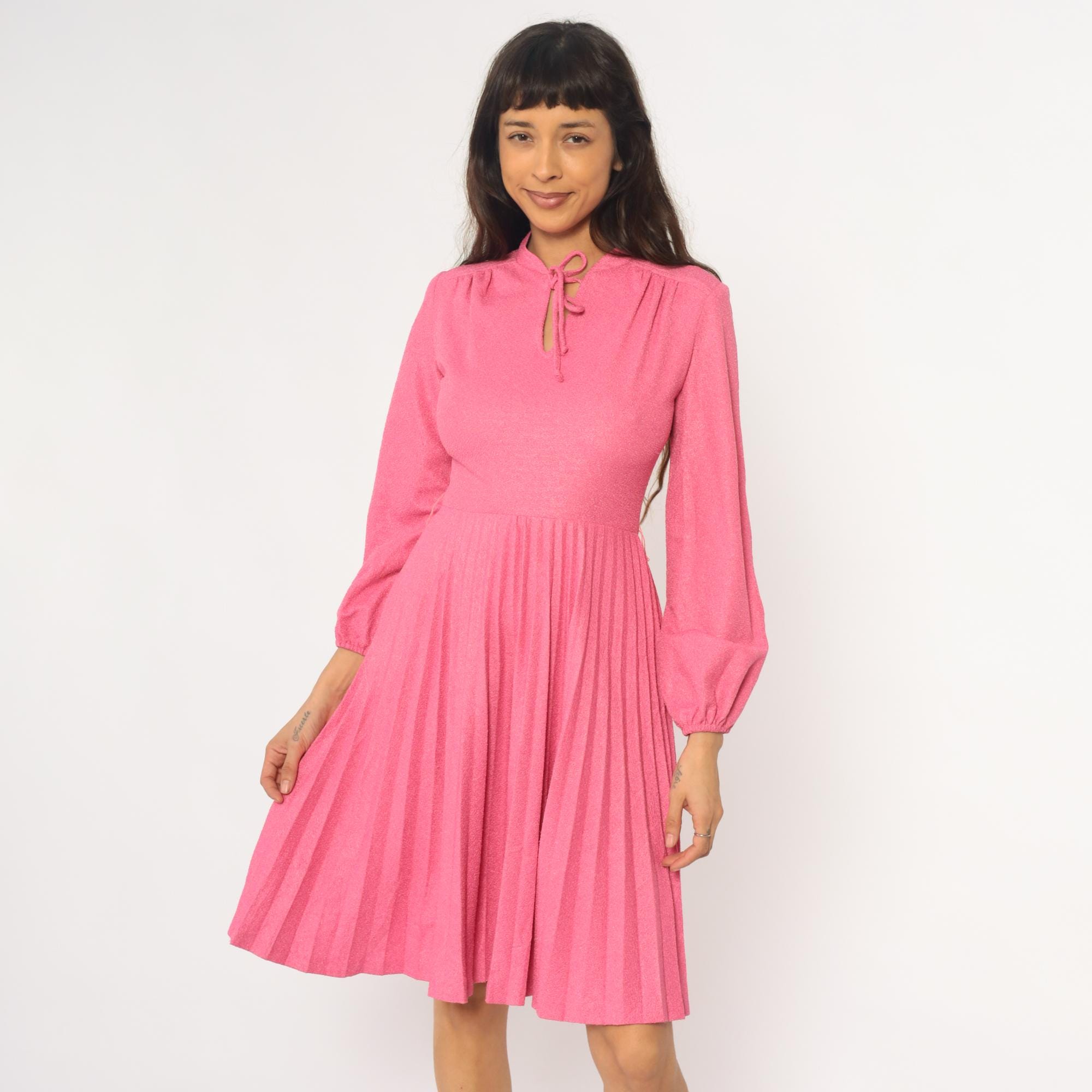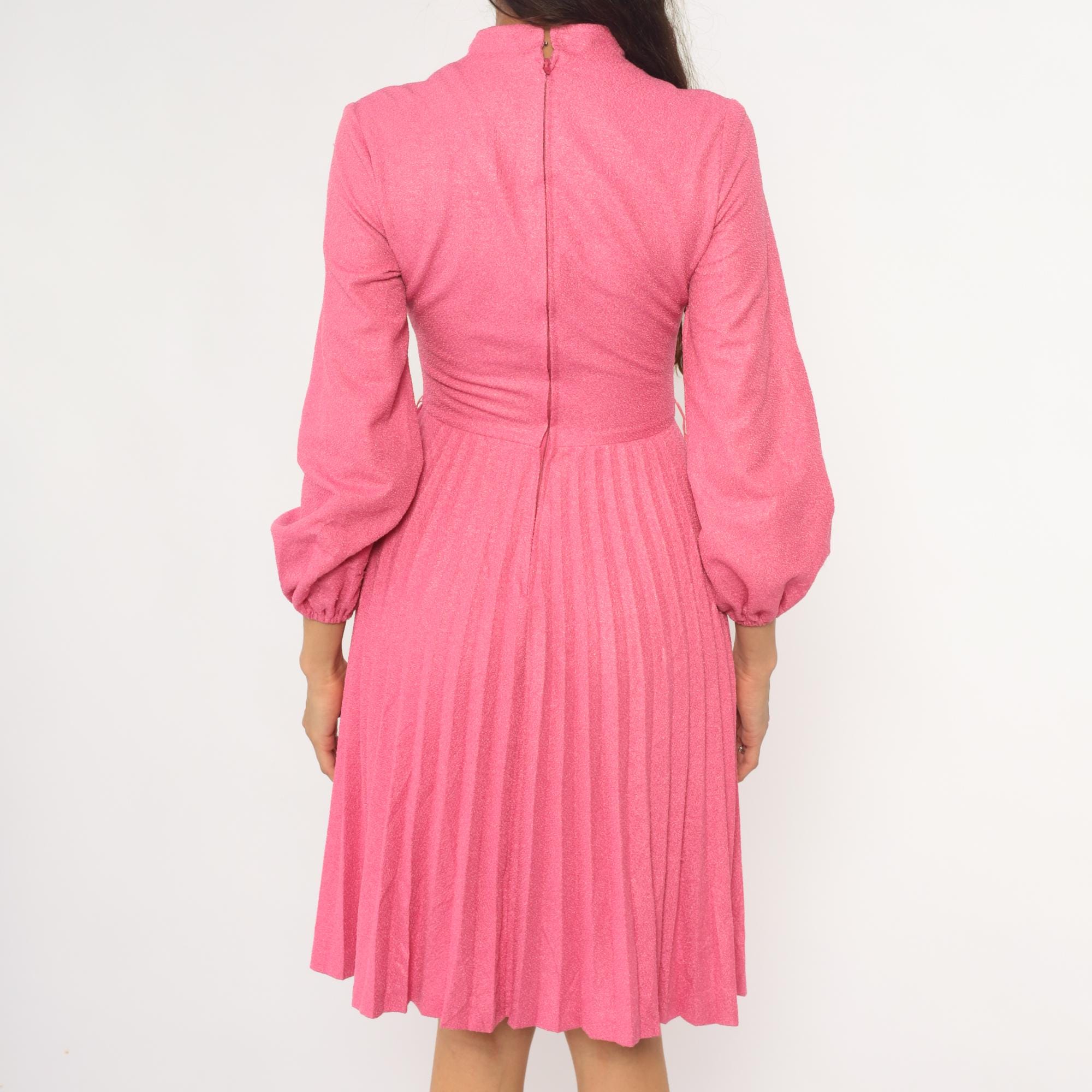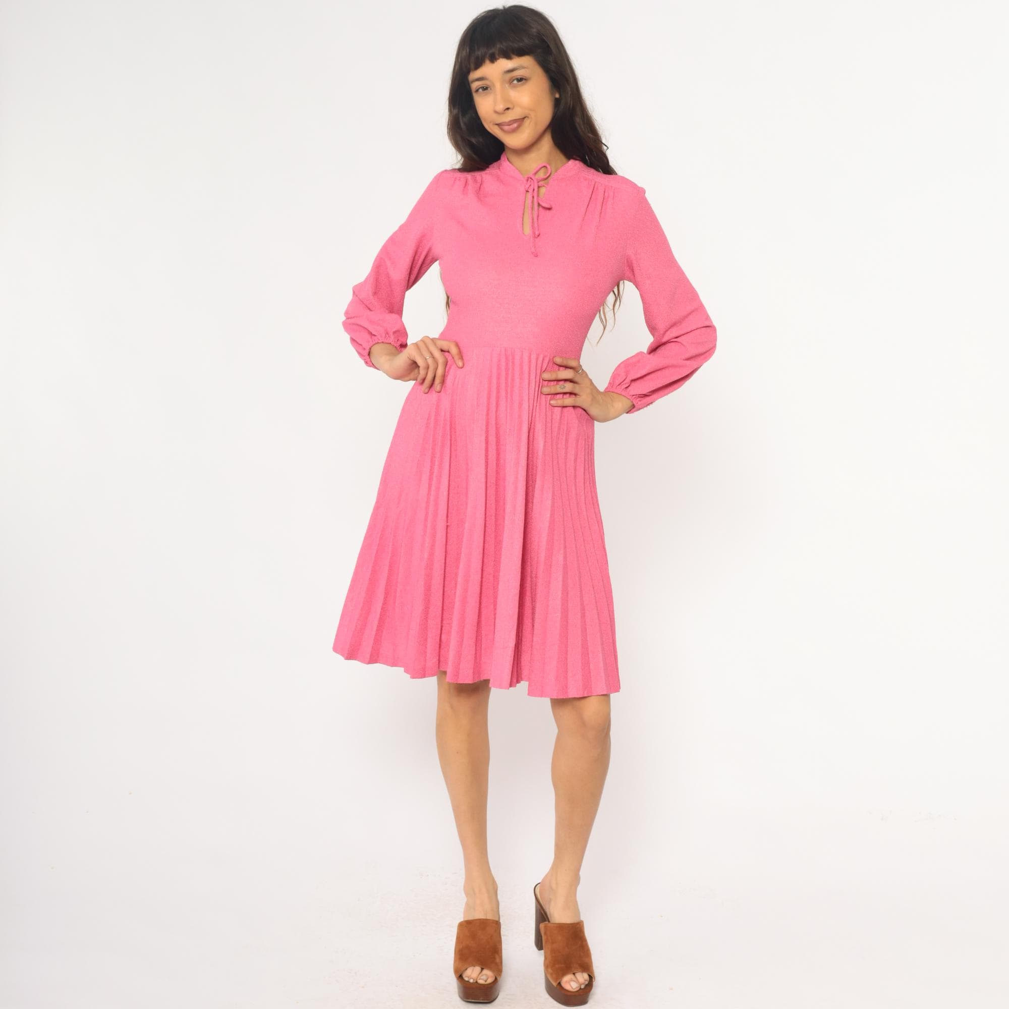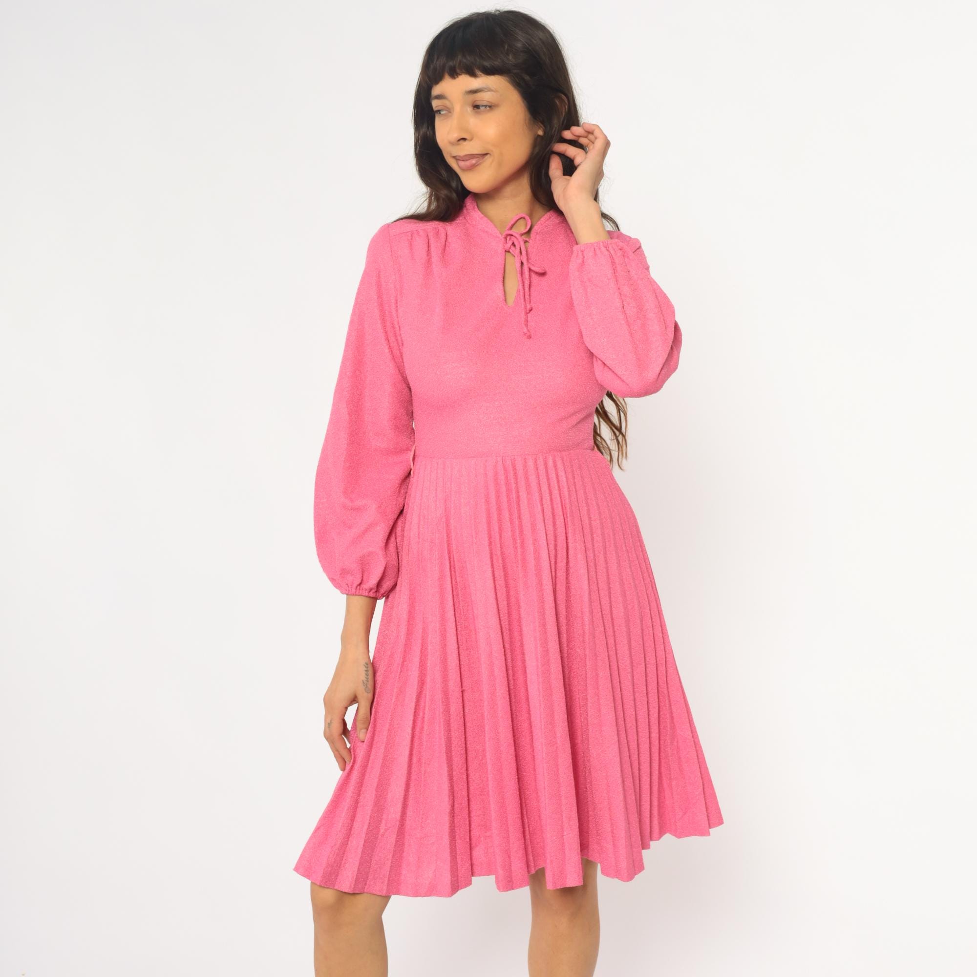 Hot pink 70s midi dress with mock neck, keyhole opening, and decorative tie closure at front. Long sleeves with gathered shoulders and elastic cuffs, fitted bodice, pleated skirt.