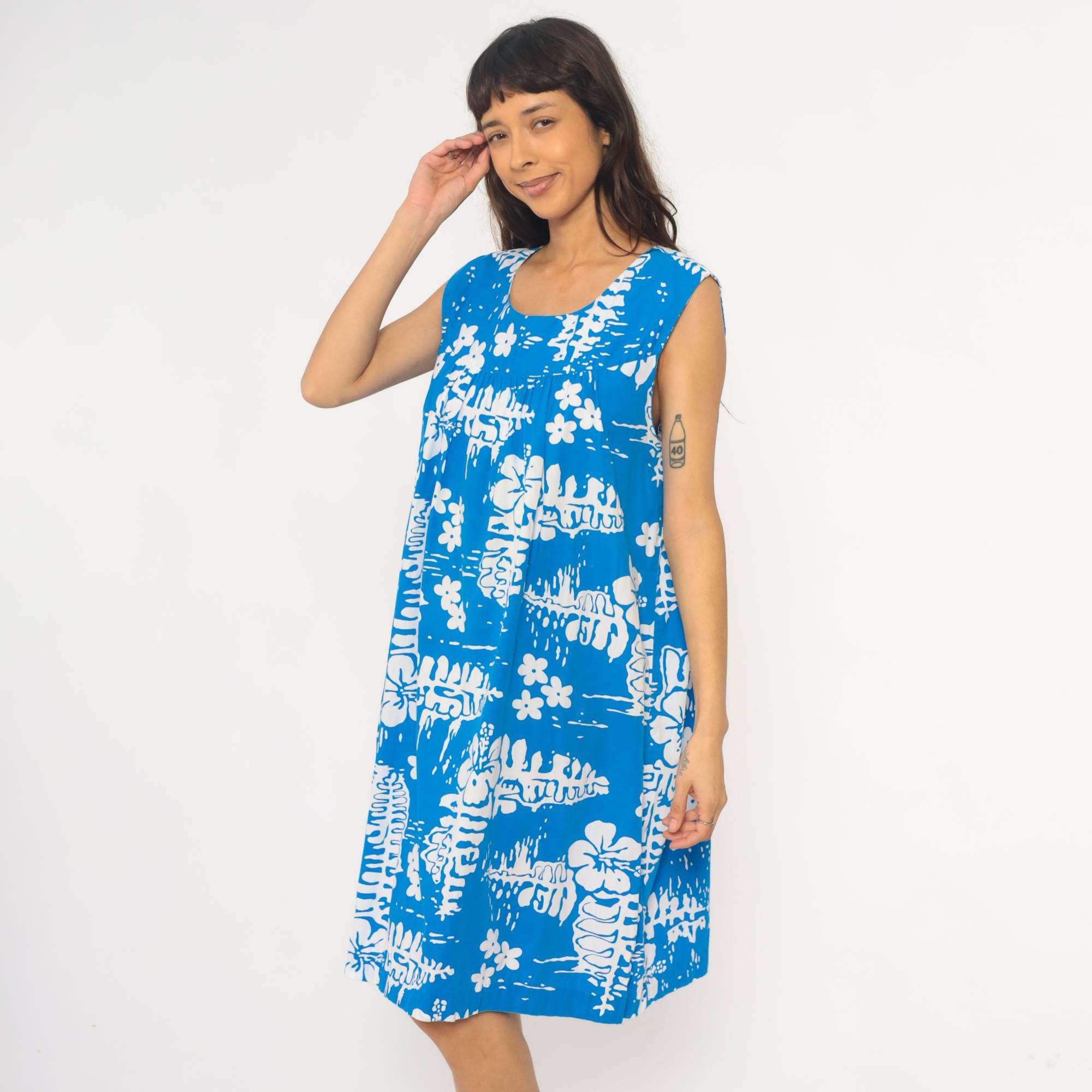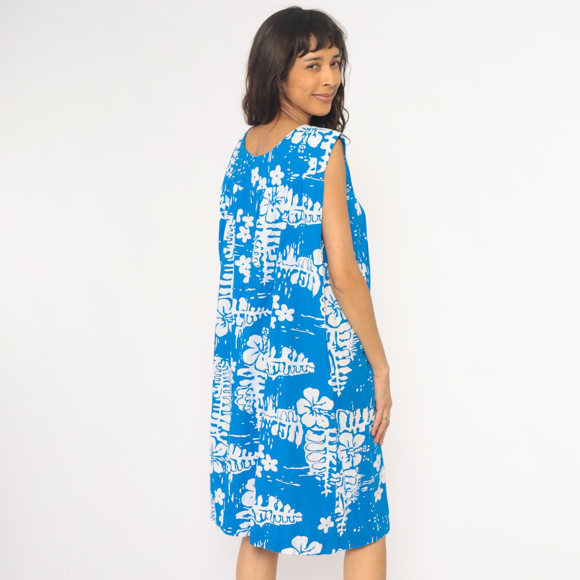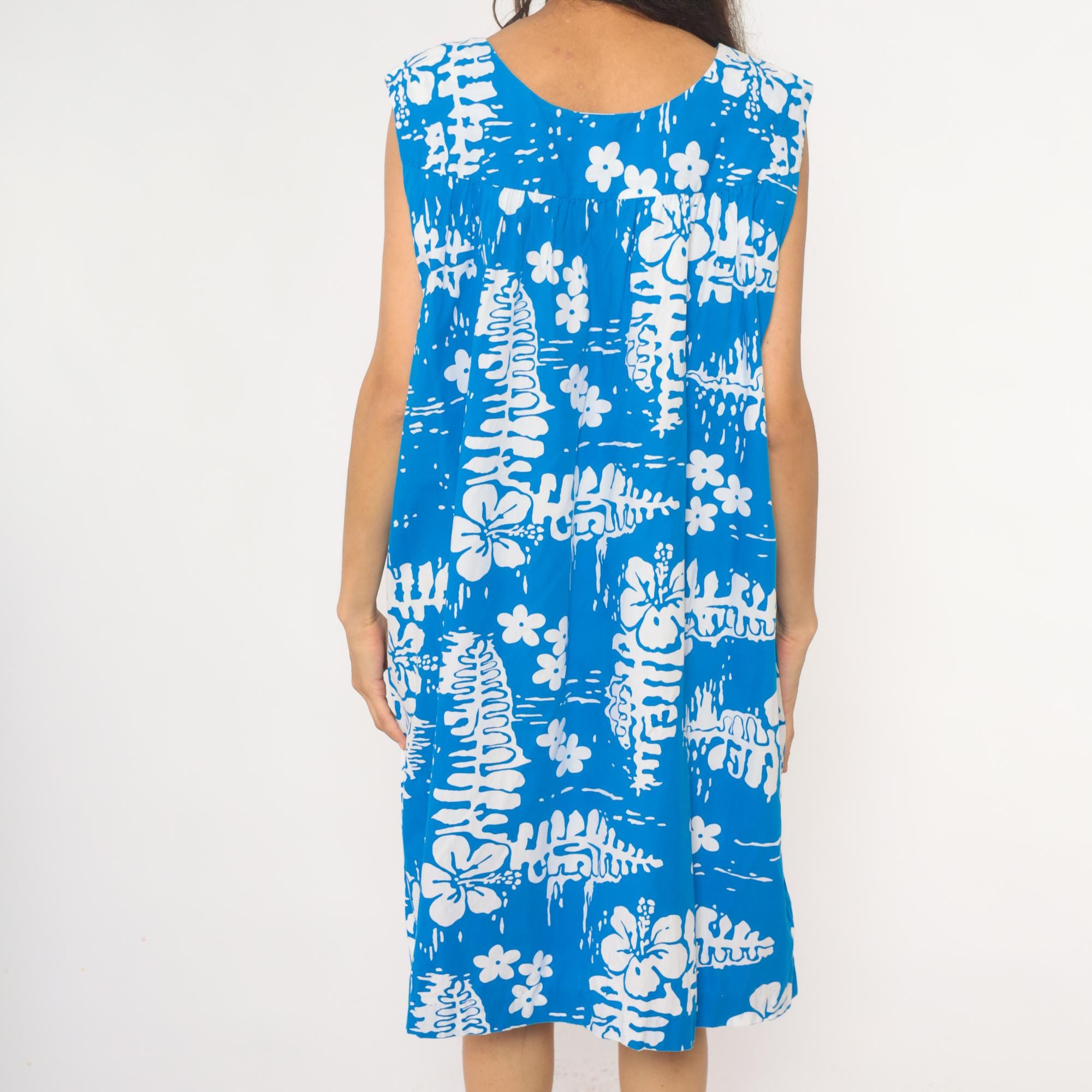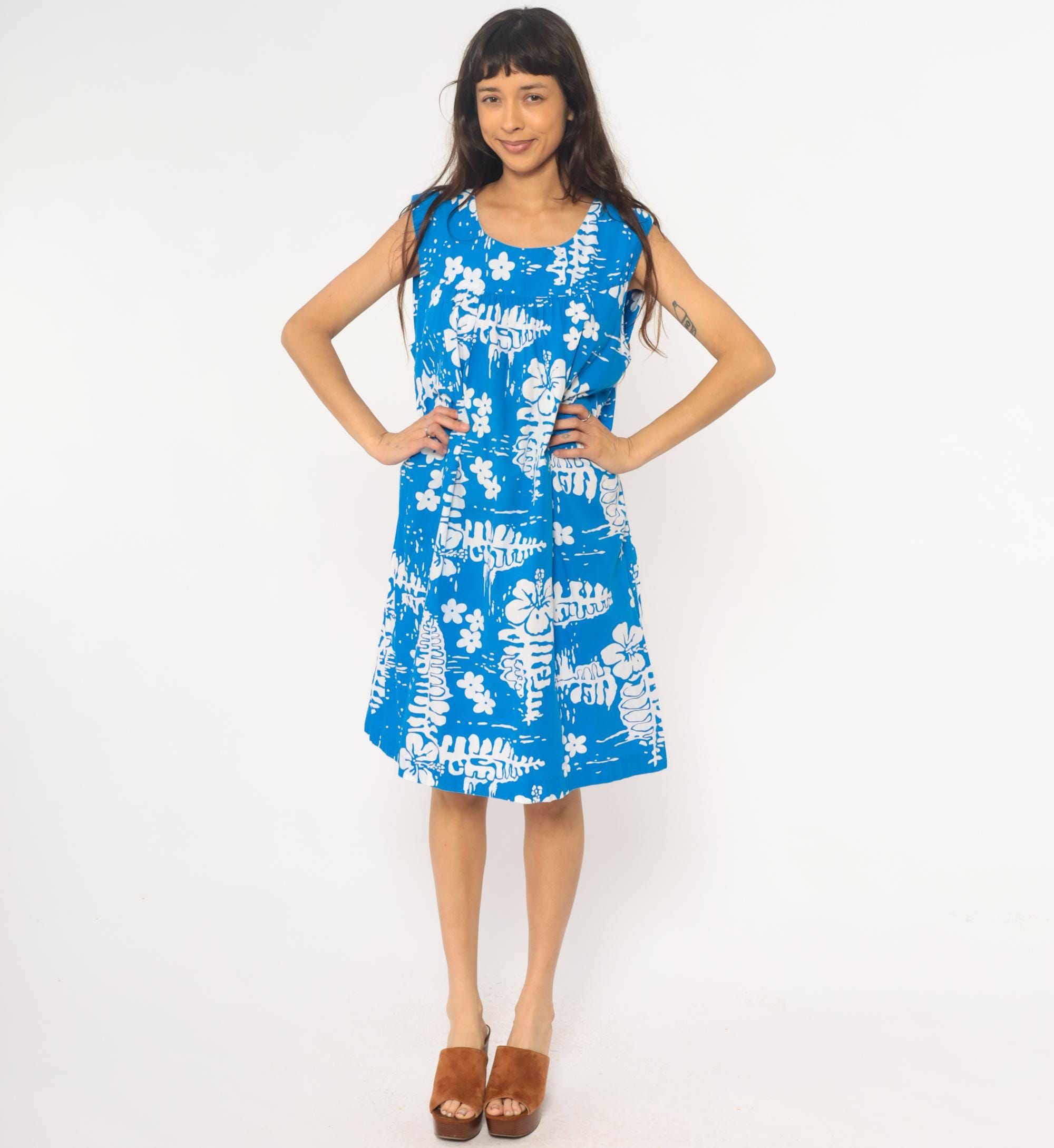 90s blue sleeveless dress from ui-maikai with white Hawaiian tropical print of hibiscus flowers, plumeria, ferns, and Hawaii text across the fabric. Scoop neckline, empire waist with gathering under bust, A-line skirt.
