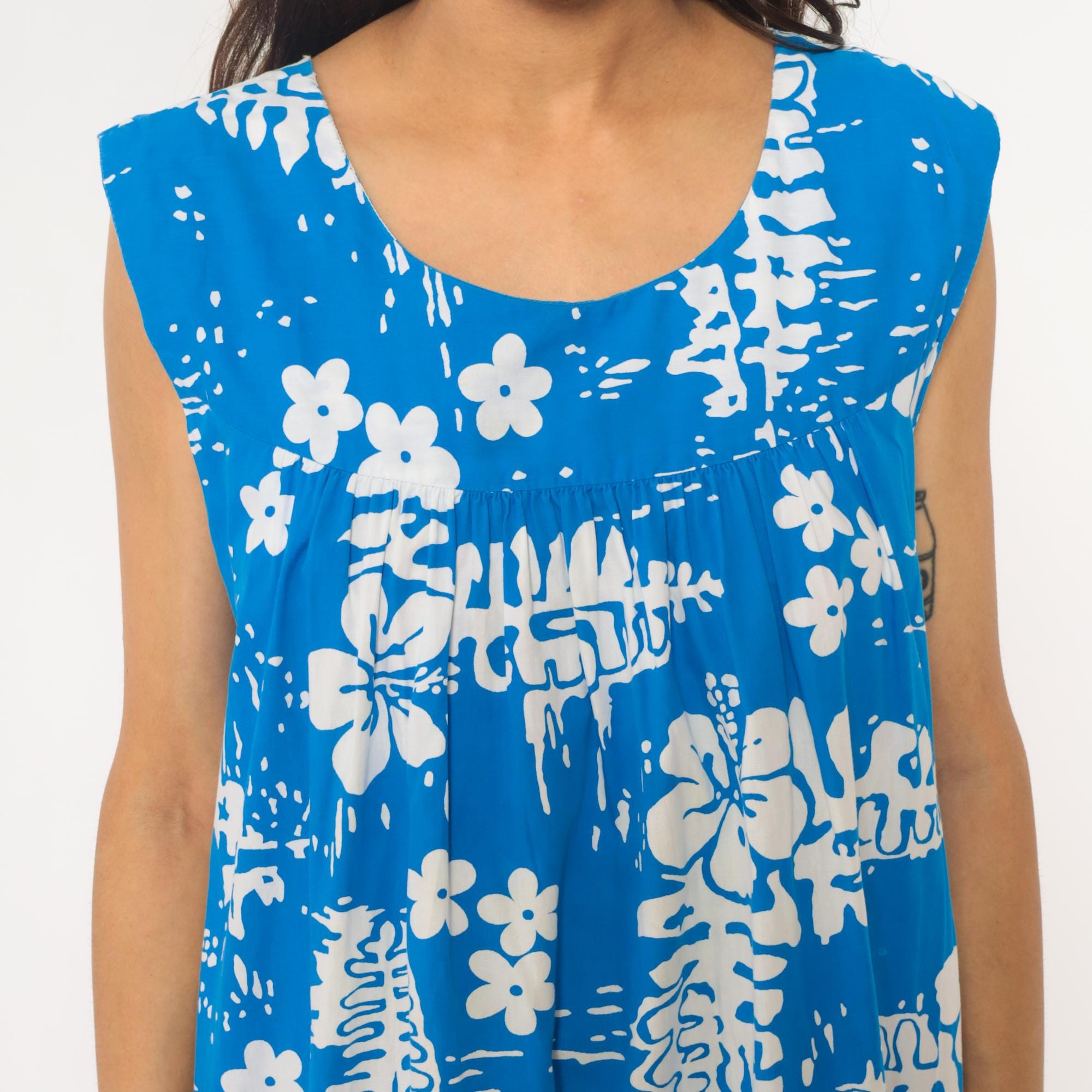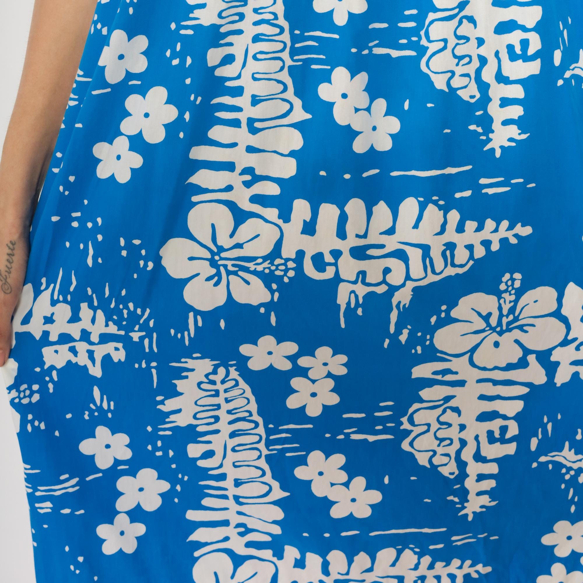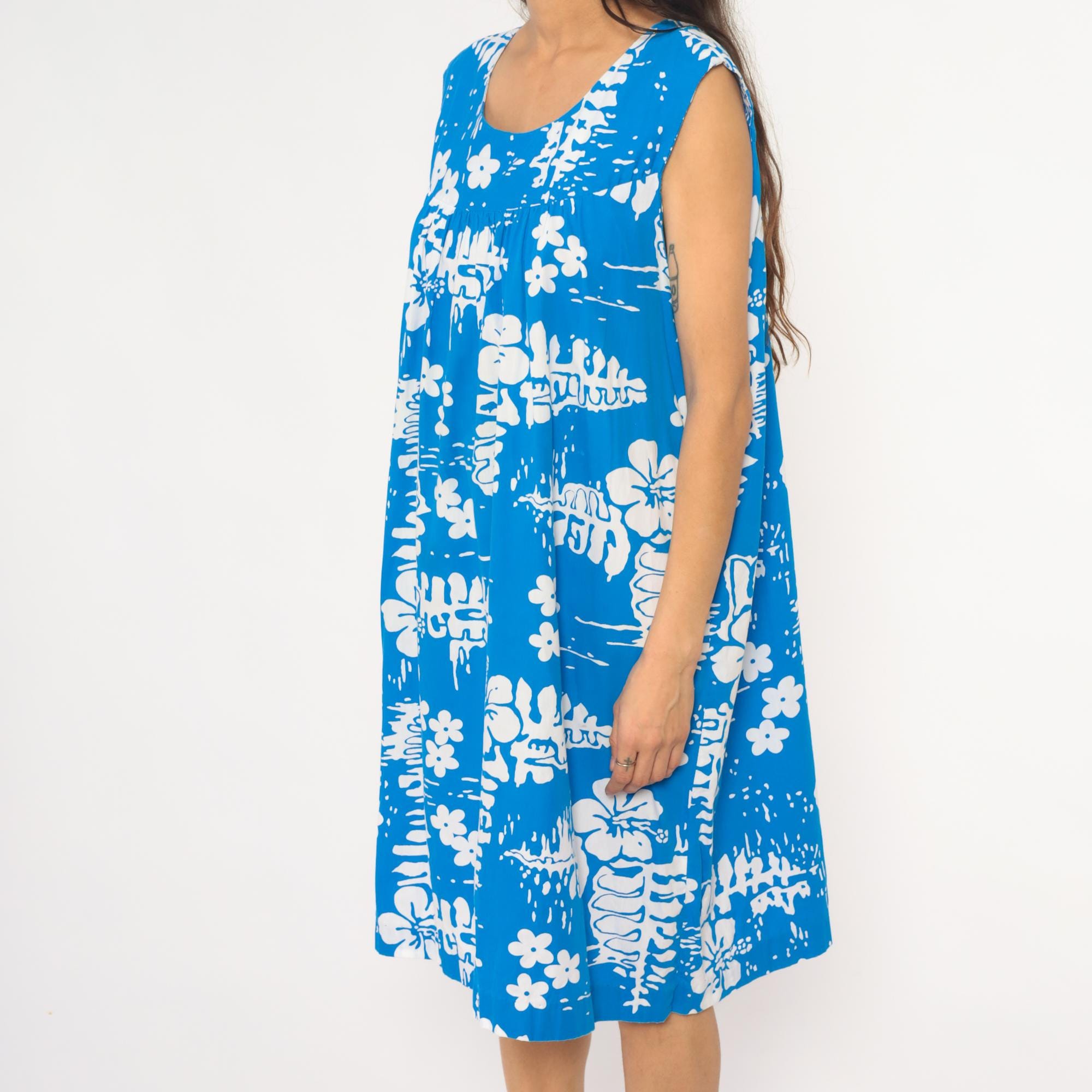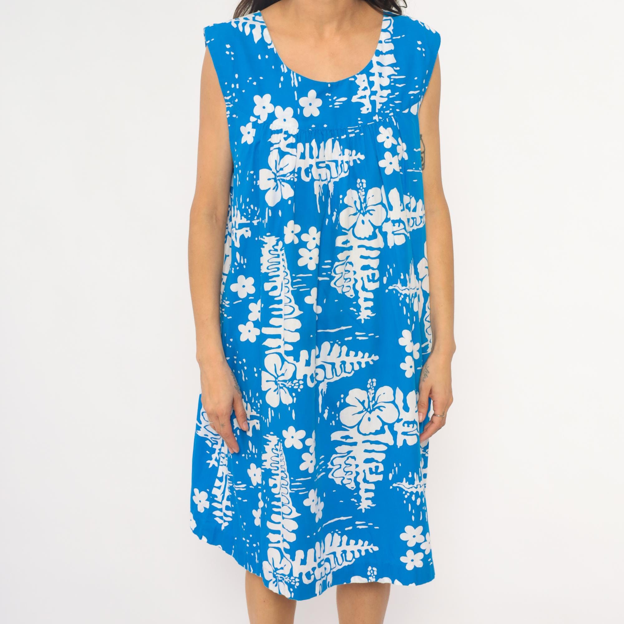 90s blue sleeveless dress from ui-maikai with white Hawaiian tropical print of hibiscus flowers, plumeria, ferns, and Hawaii text across the fabric. Scoop neckline, empire waist with gathering under bust, A-line skirt.