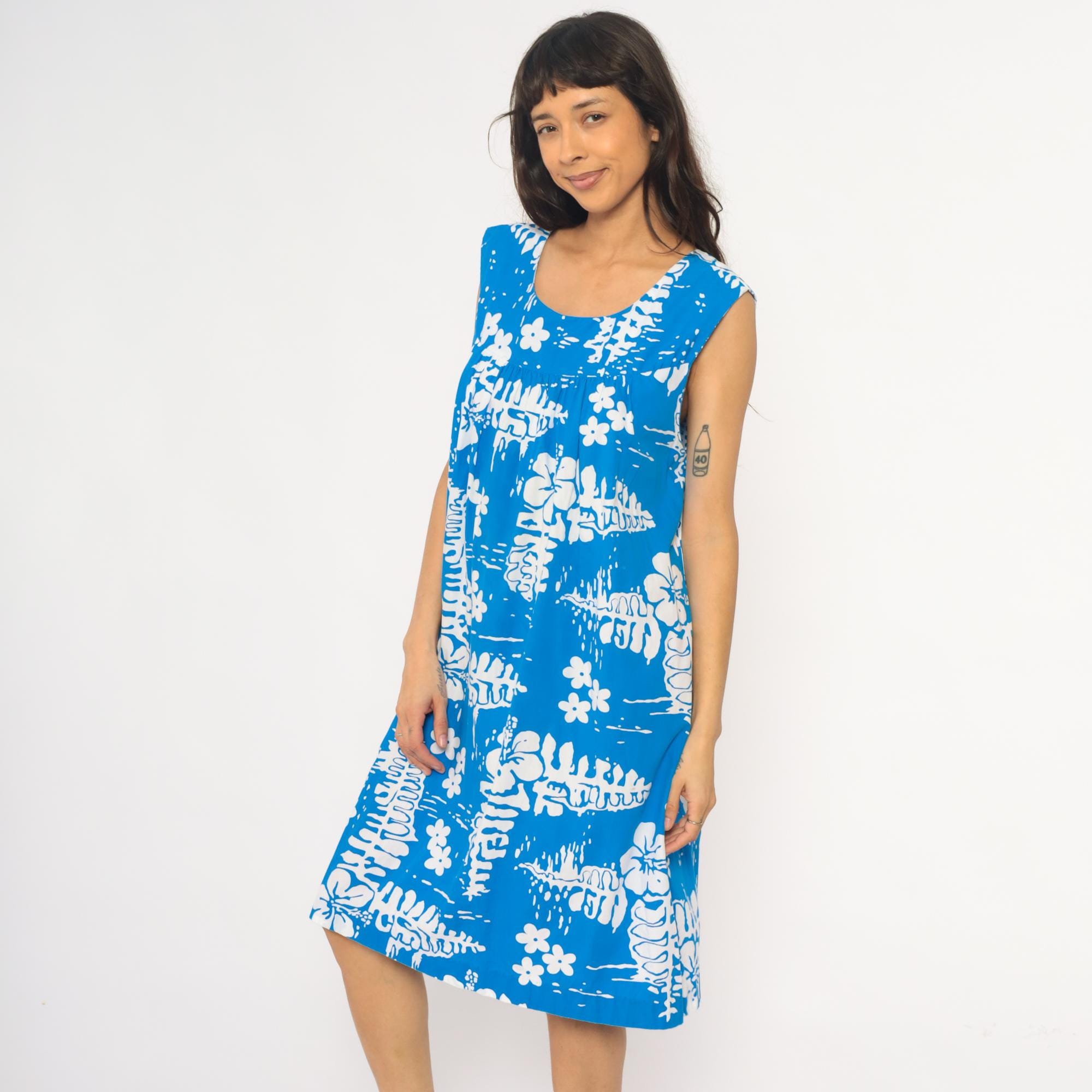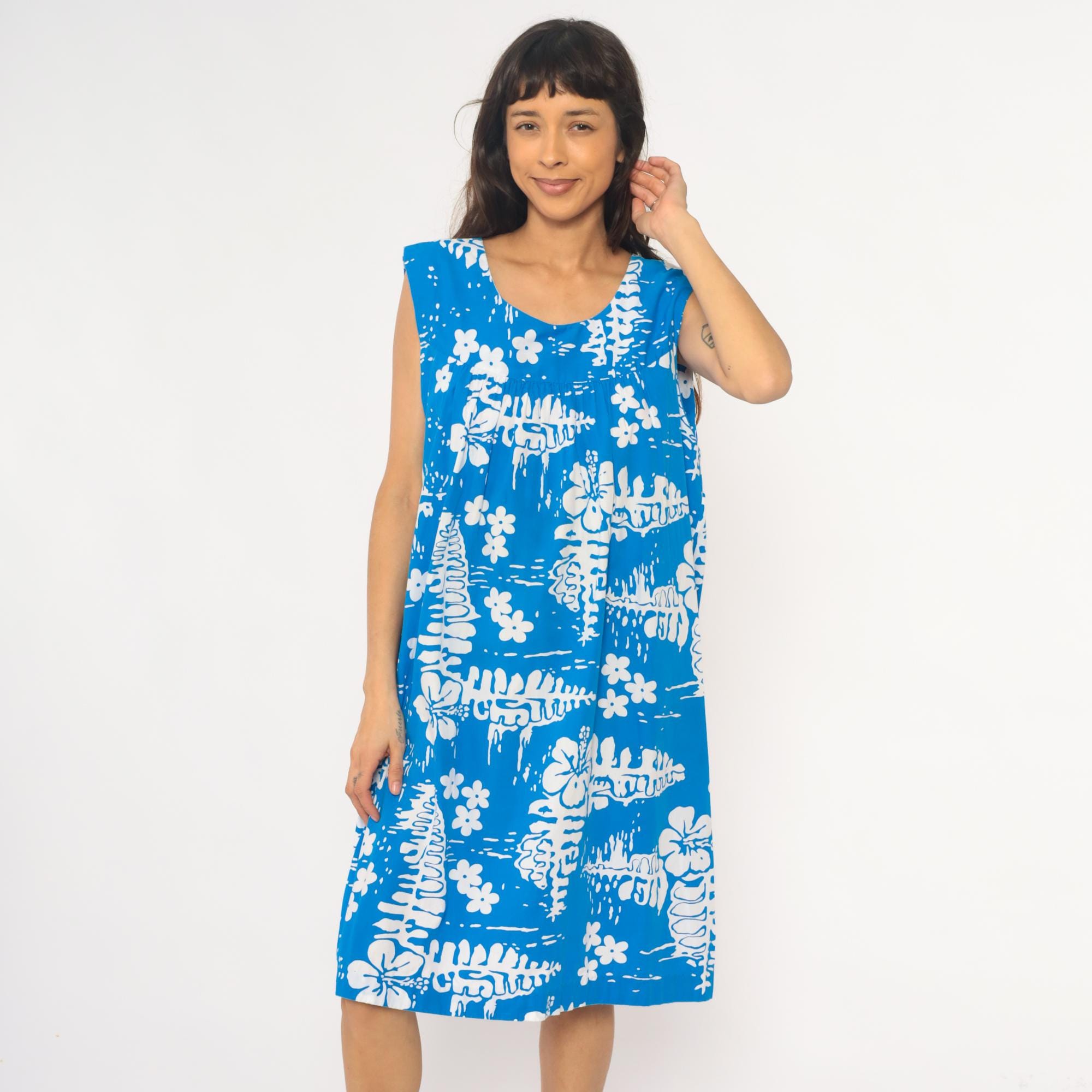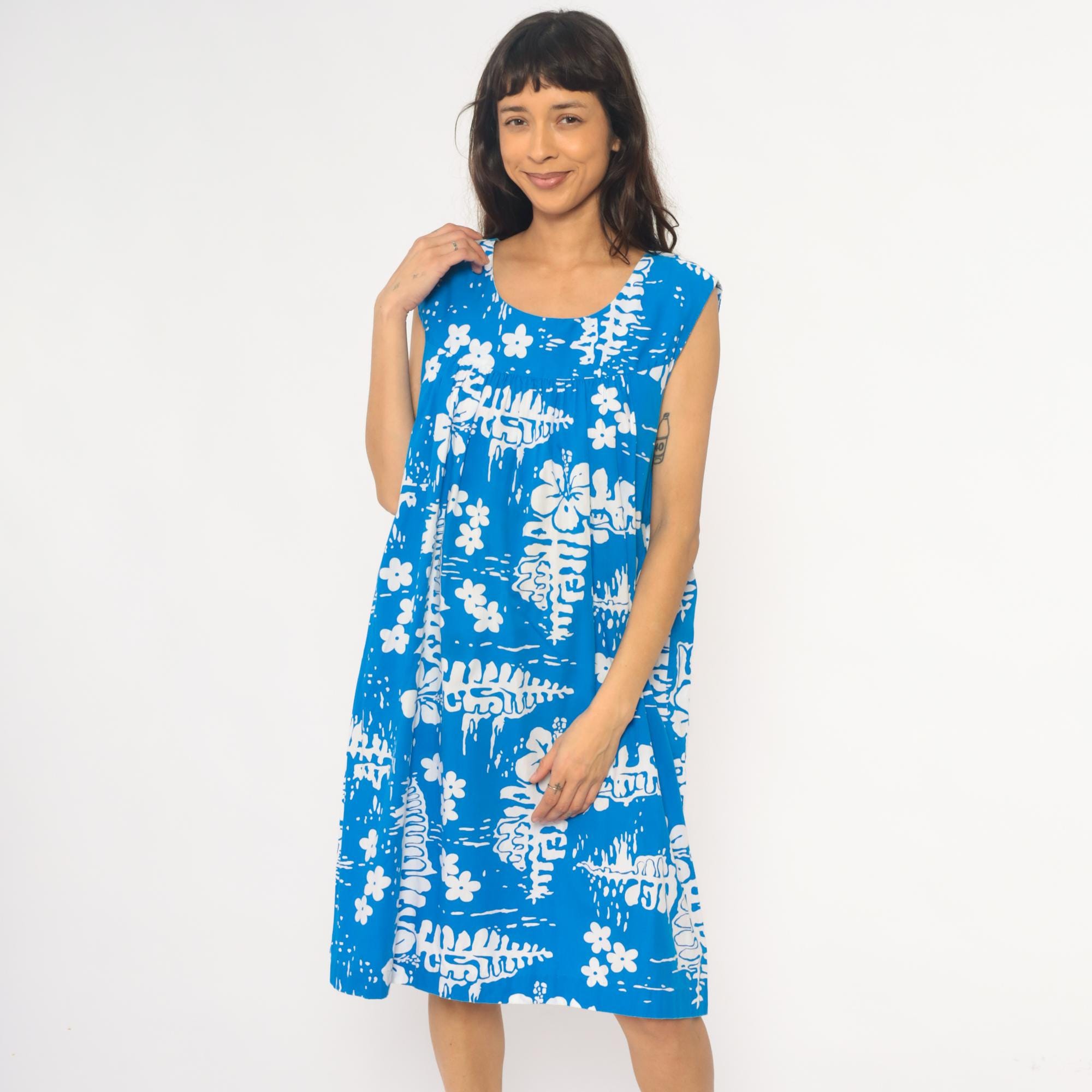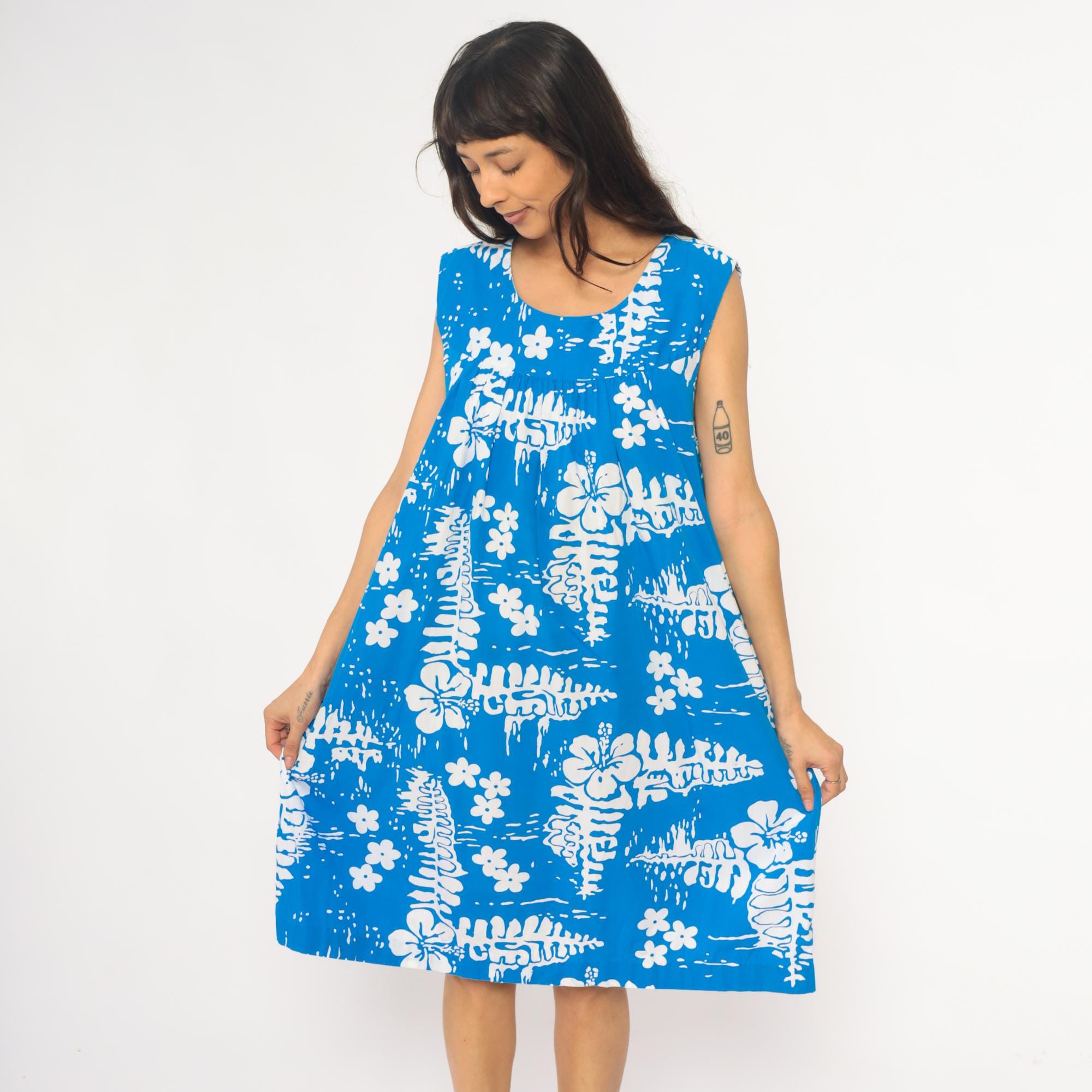 90s blue sleeveless dress from ui-maikai with white Hawaiian tropical print of hibiscus flowers, plumeria, ferns, and Hawaii text across the fabric. Scoop neckline, empire waist with gathering under bust, A-line skirt.