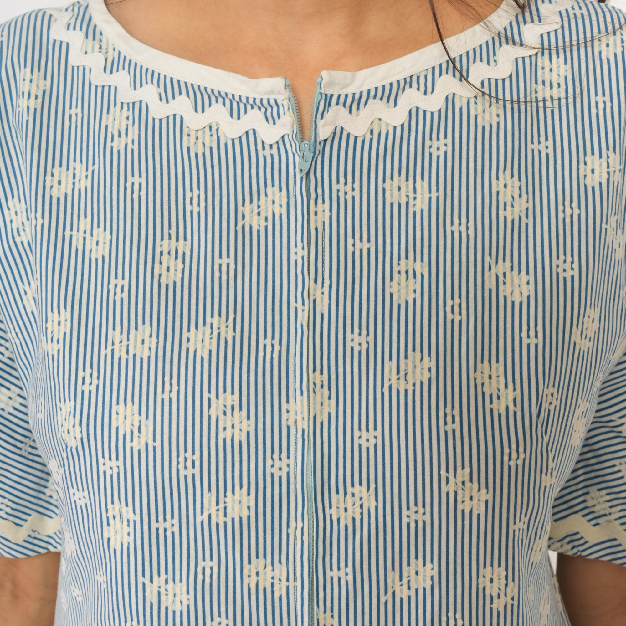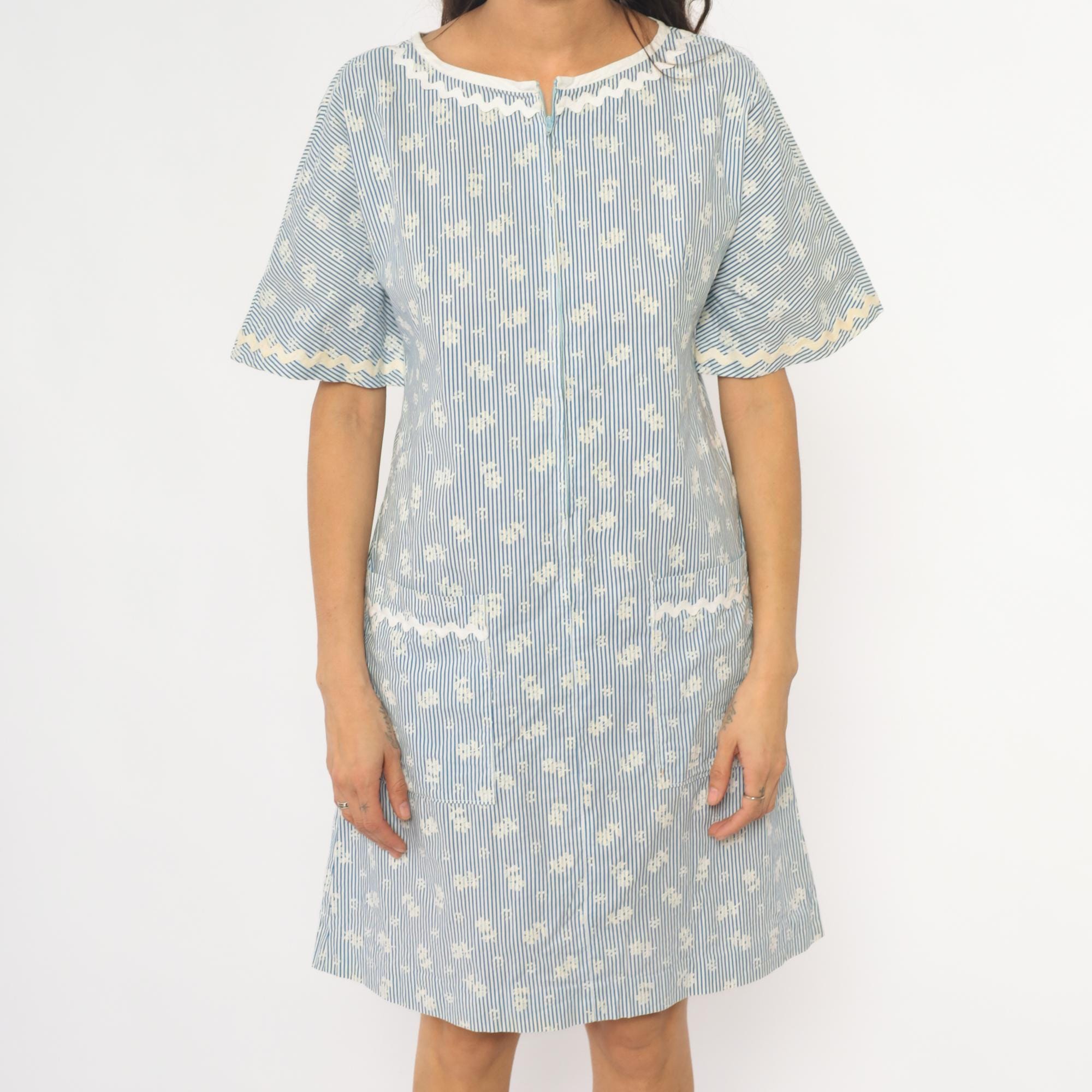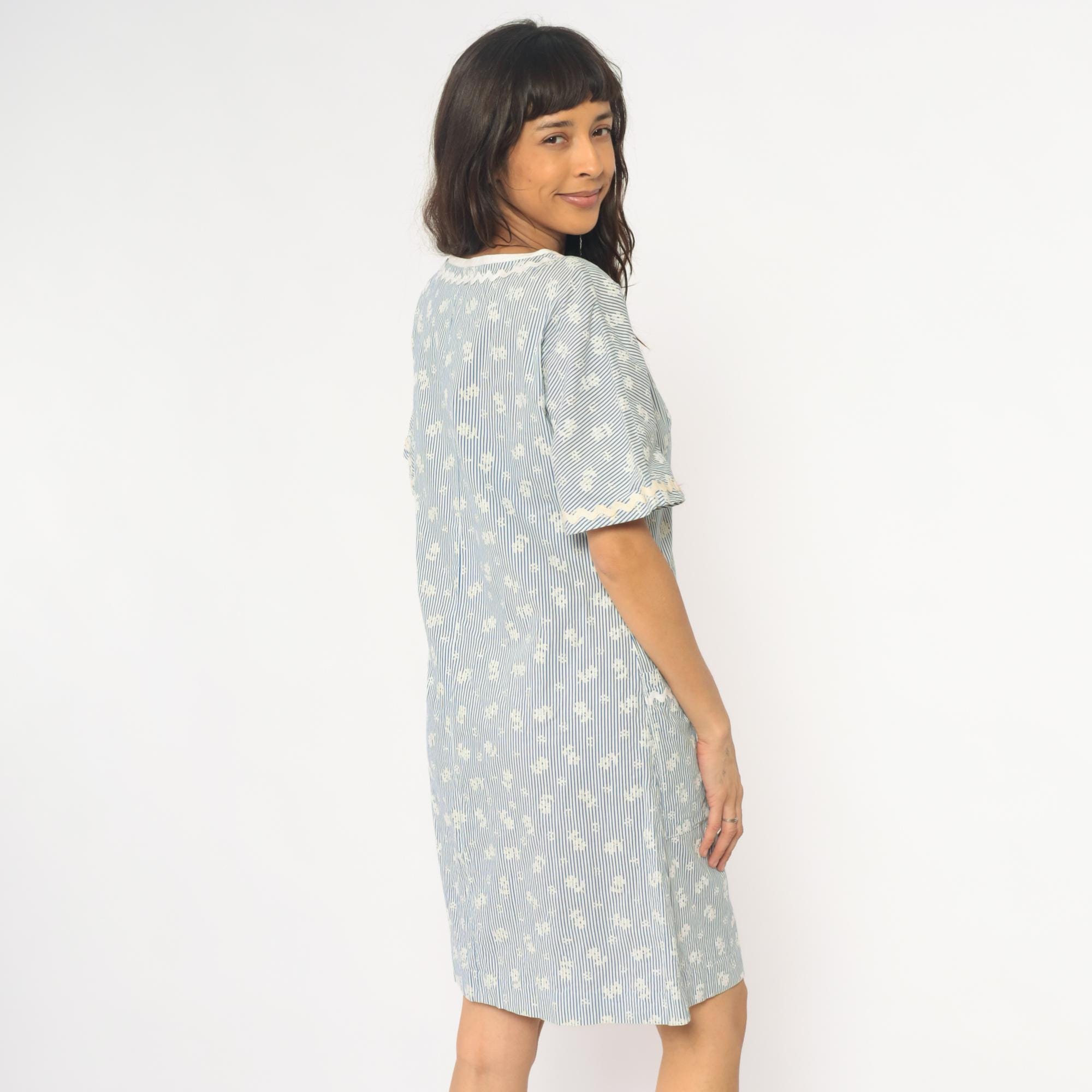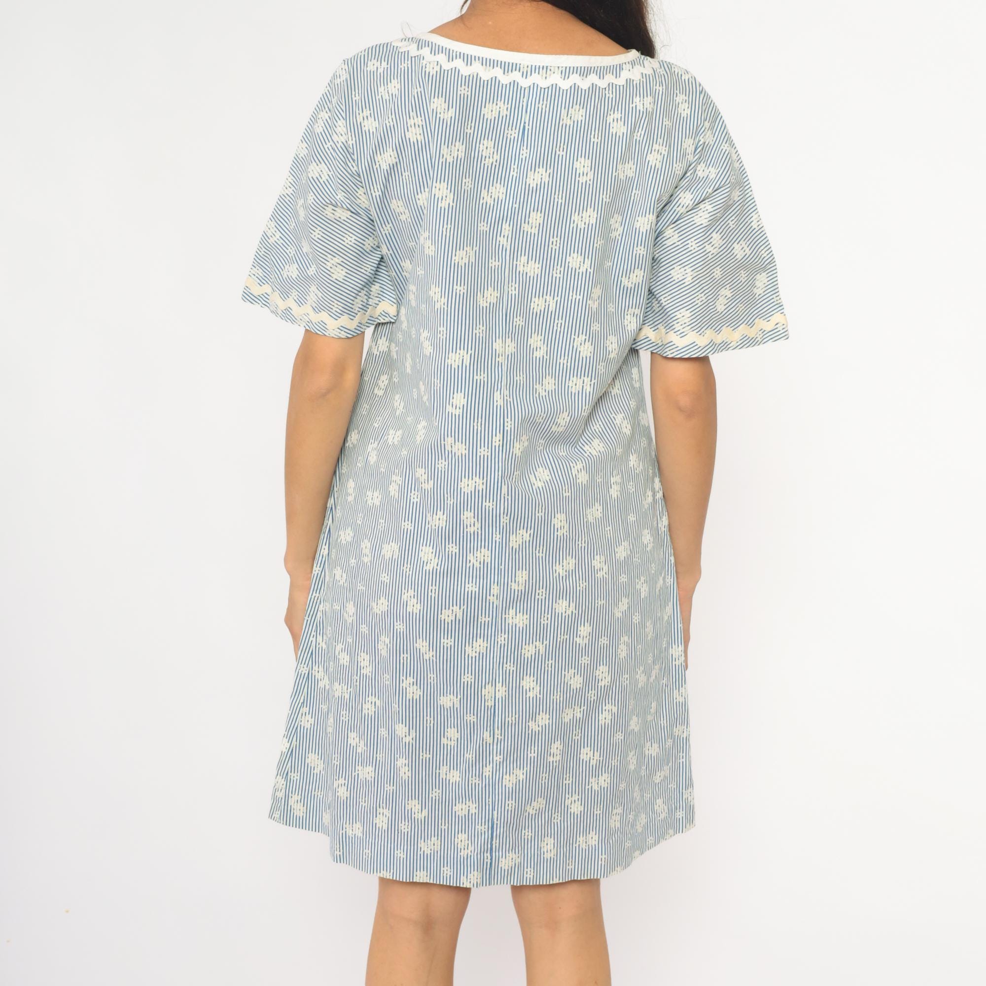 60s blue and white striped shift dress with scattered white floral pattern across the fabric. Scalloped white trim frames the neckline with keyhole closure, short sleeves with yellow embroidered trim at the edges.