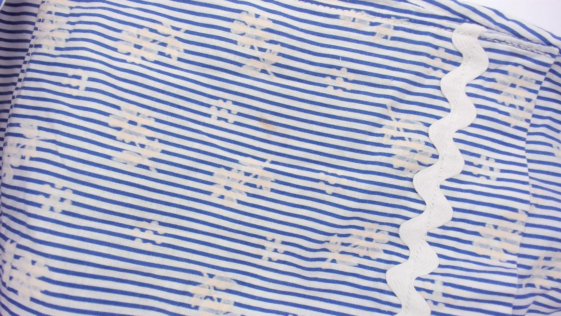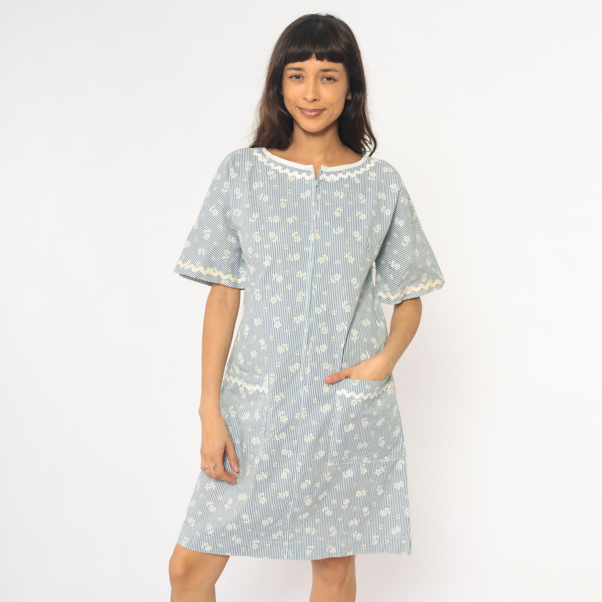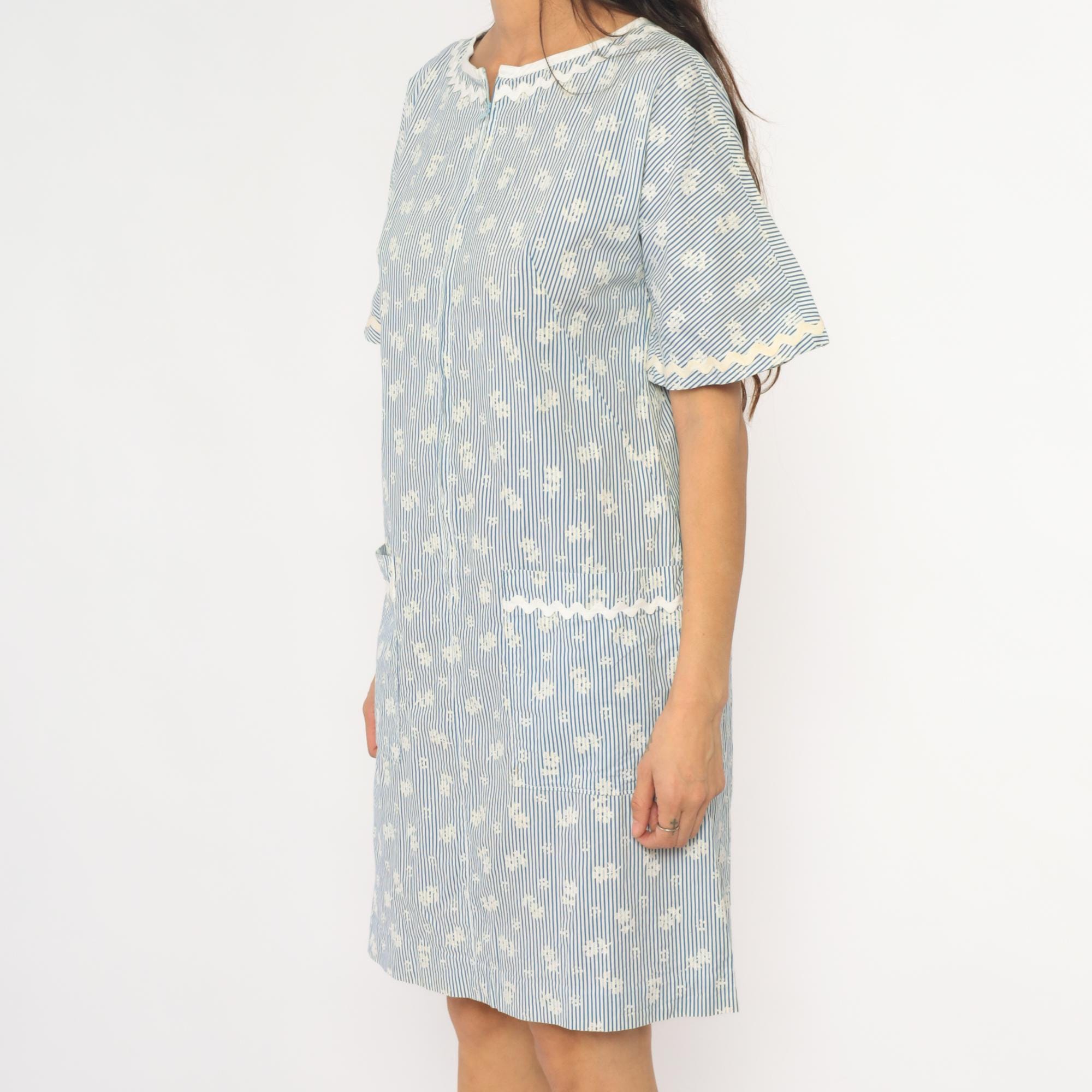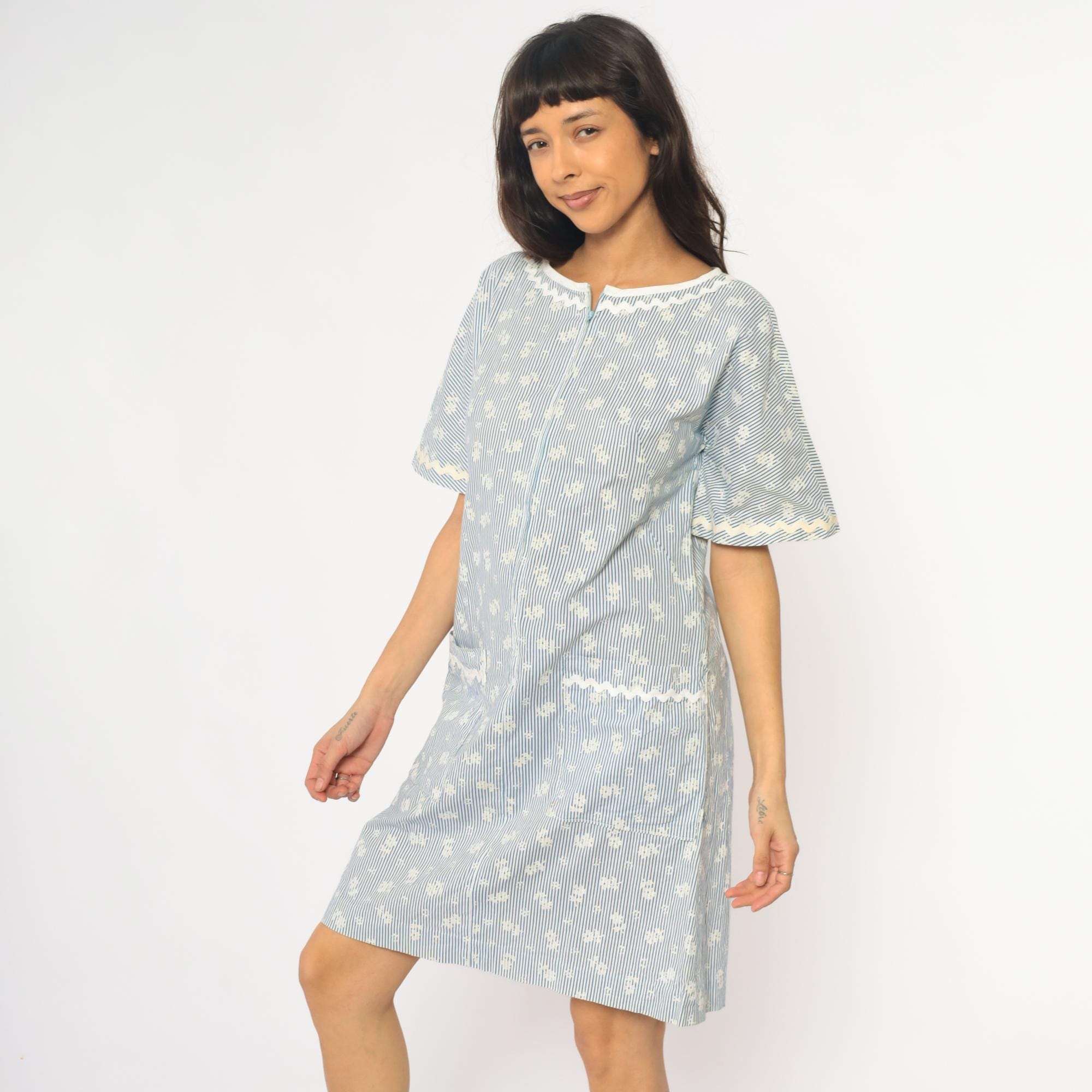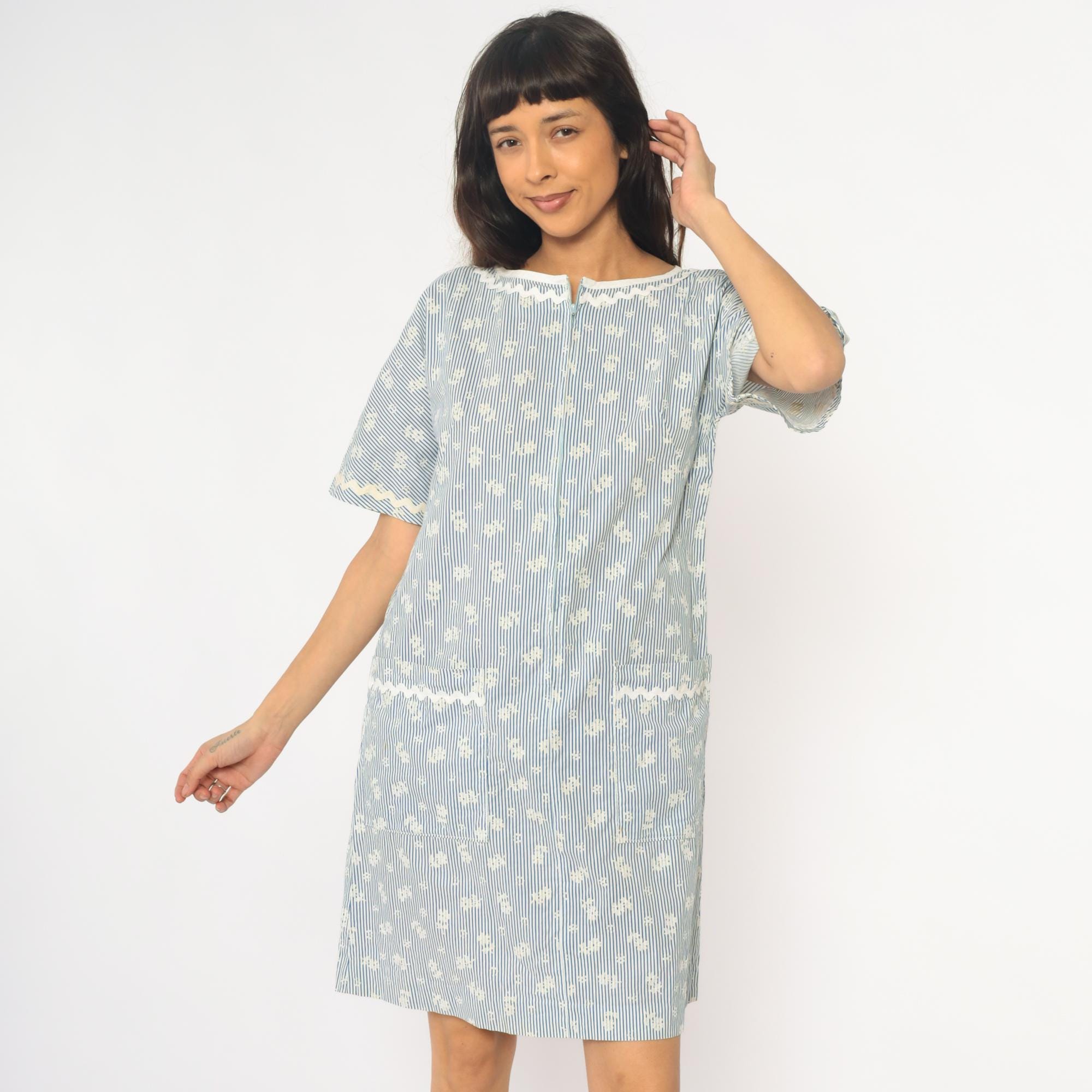 60s blue and white striped shift dress with scattered white floral pattern across the fabric. Scalloped white trim frames the neckline with keyhole closure, short sleeves with yellow embroidered trim at the edges.