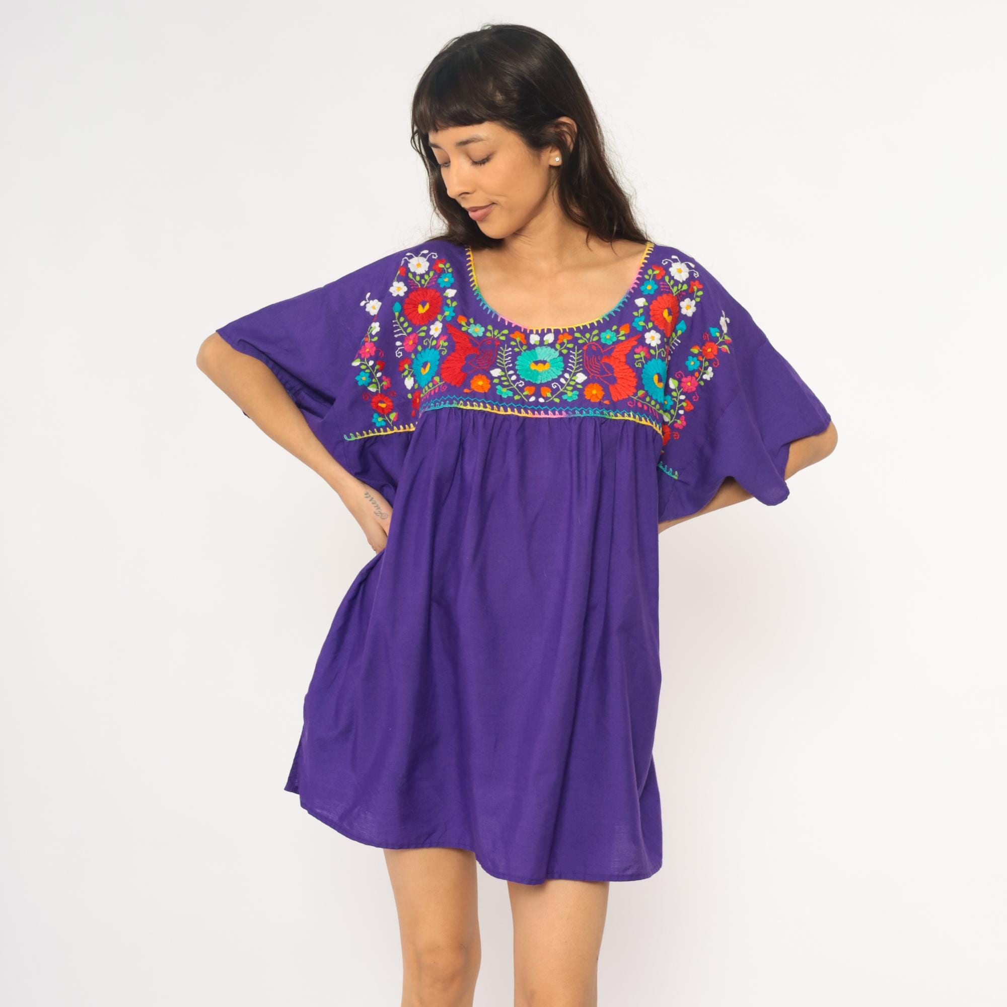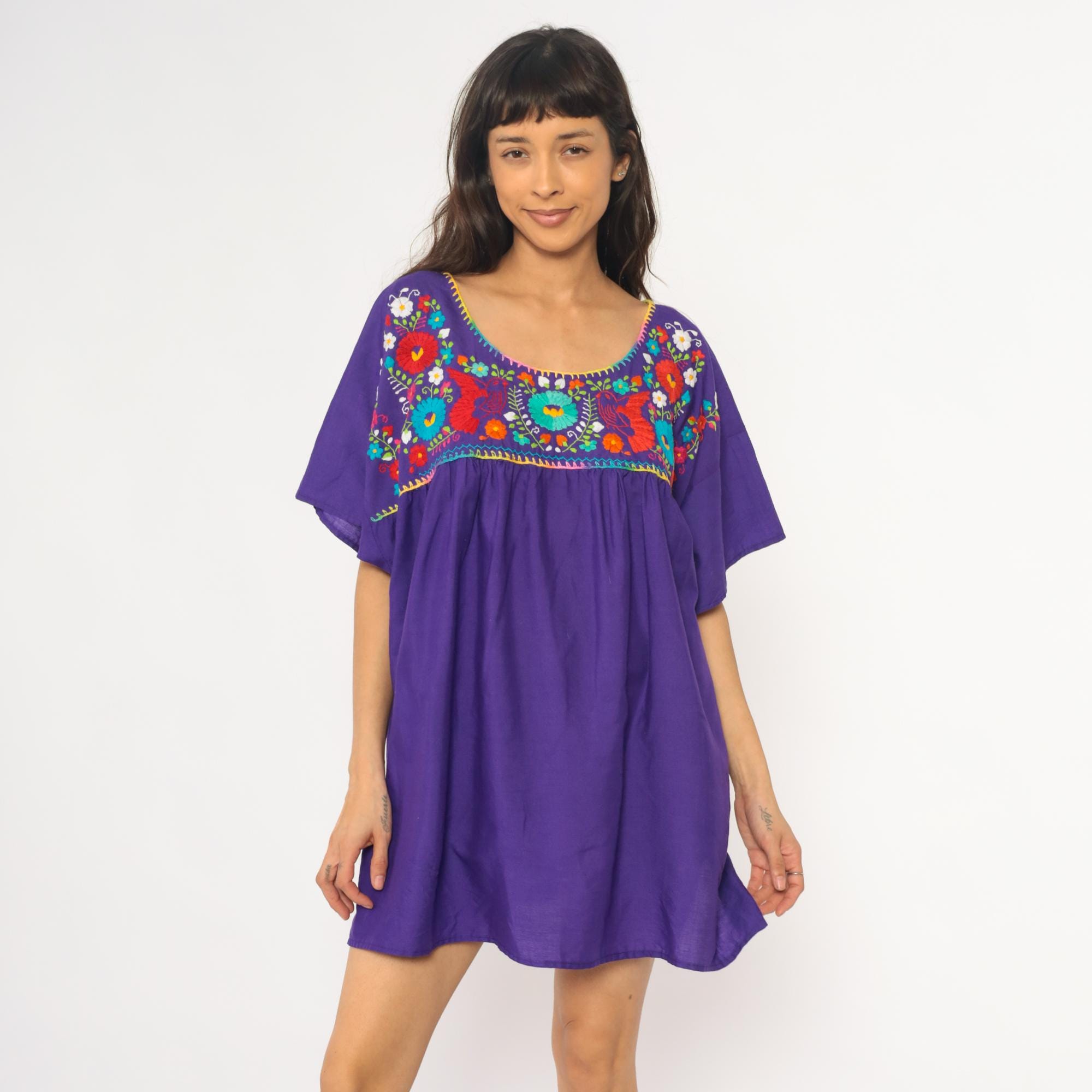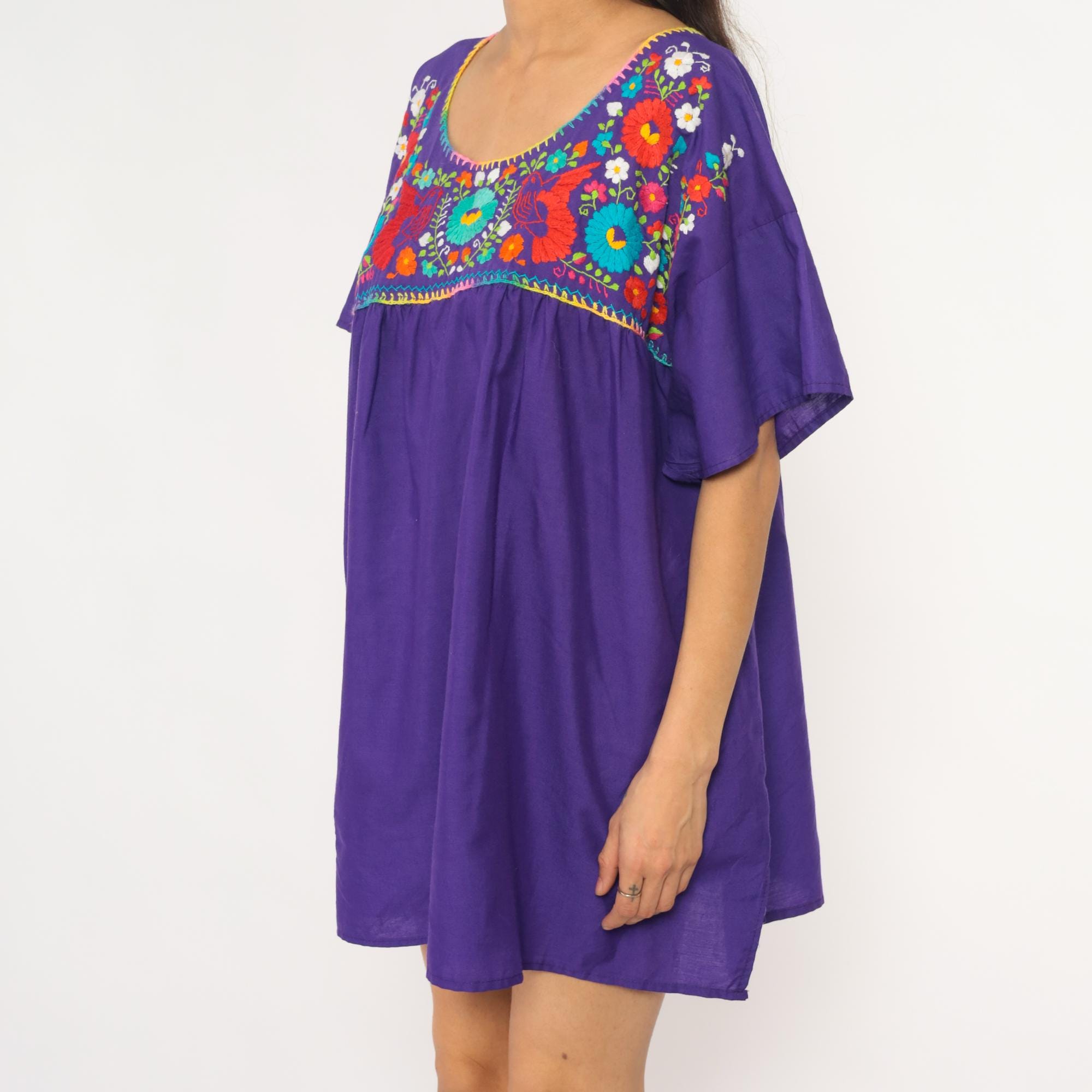 90s purple cotton tunic dress with Mexican embroidery across the front yoke and upper back. Multicolored floral and bird motifs in red, turquoise, white, yellow, orange, lime green, and pink thread, with rainbow blanket stitch trim around the scoop neckline and yoke edge. Short kimono-style sleeves, empire waist with gathered skirt below the embroidered panel.