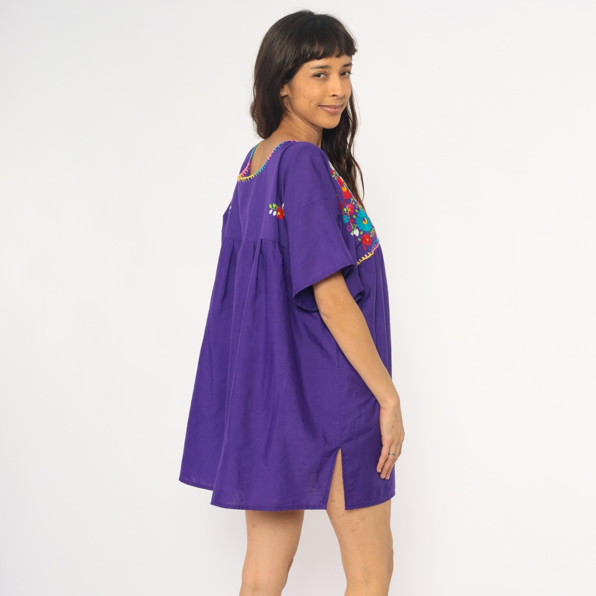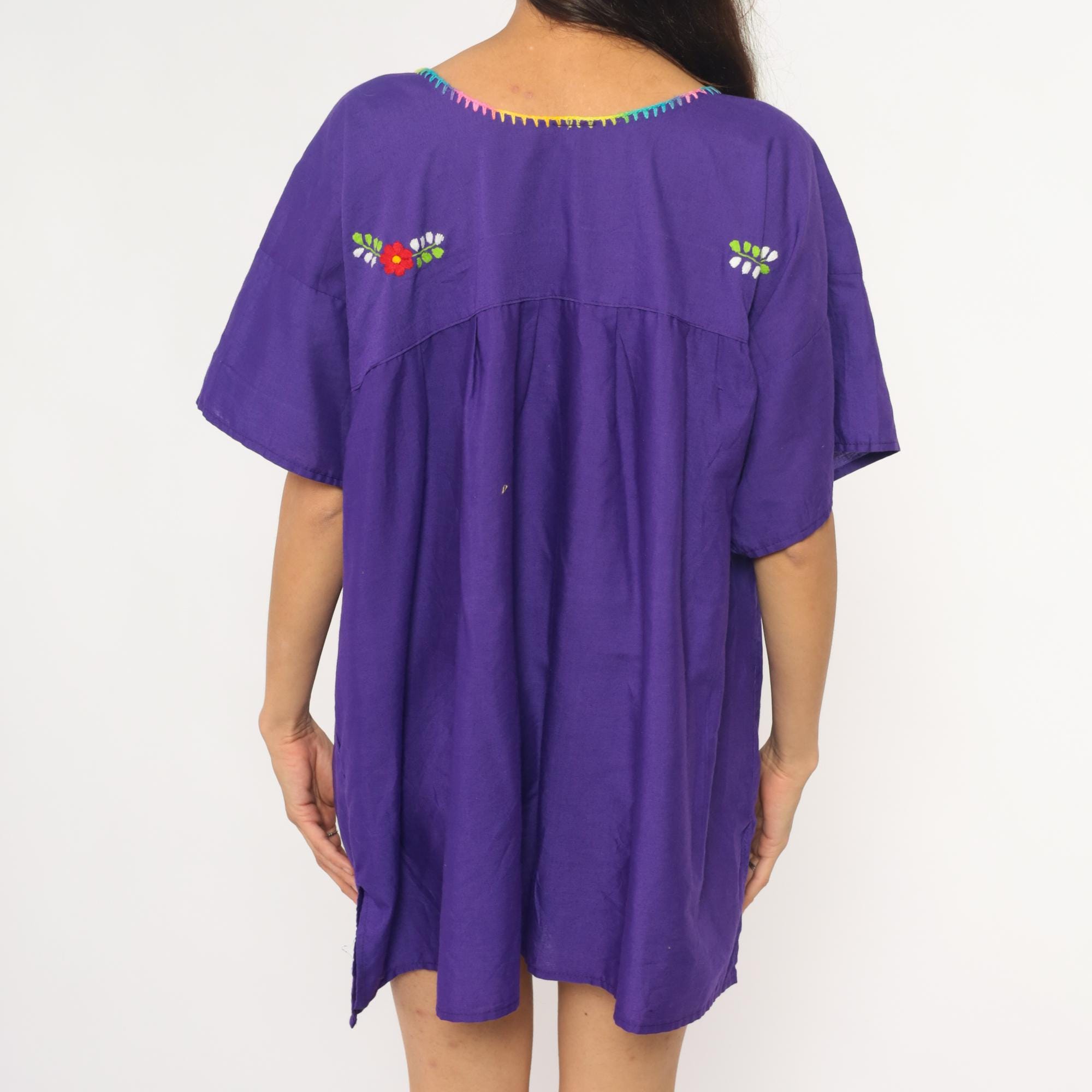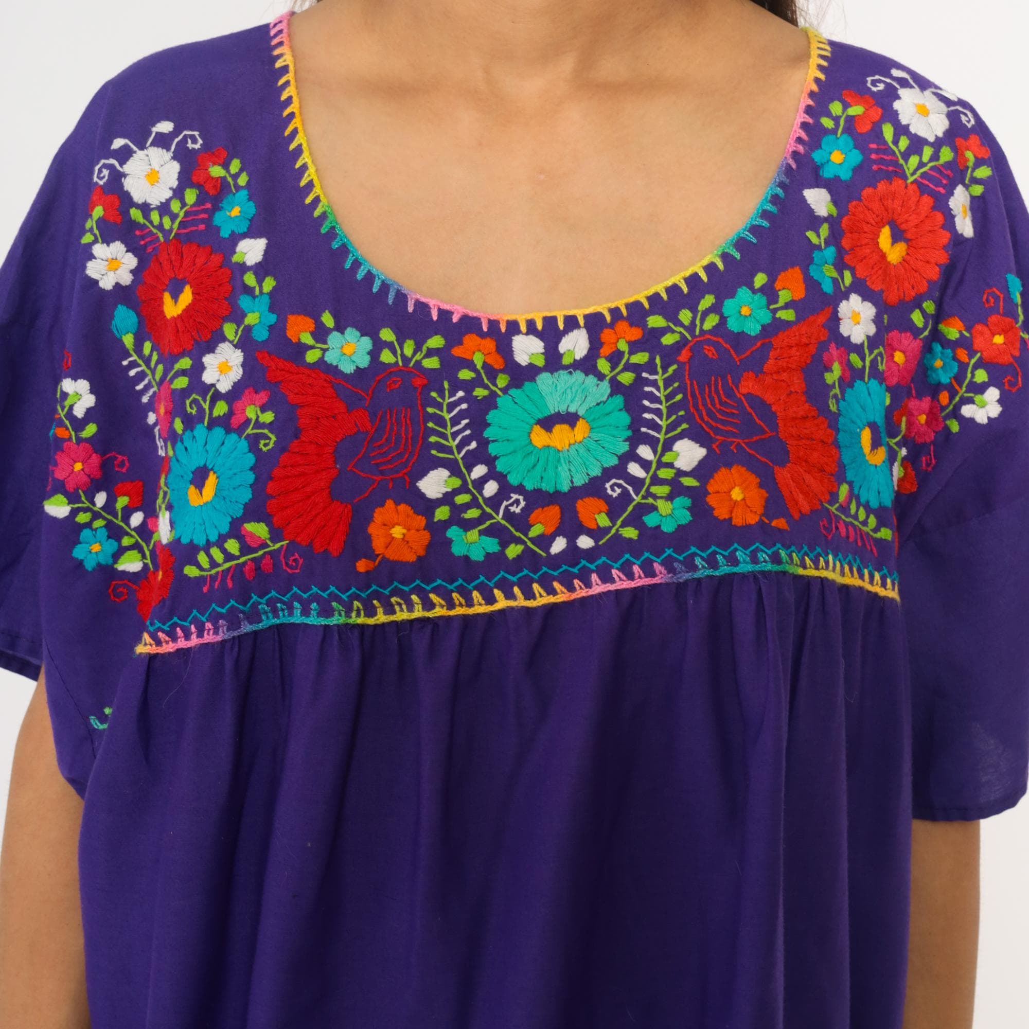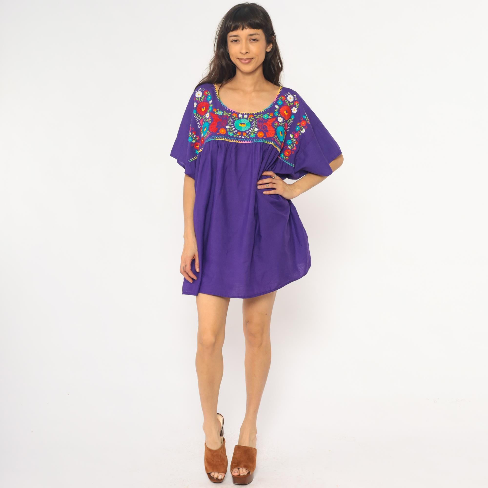 90s purple cotton tunic dress with Mexican embroidery across the front yoke and upper back. Multicolored floral and bird motifs in red, turquoise, white, yellow, orange, lime green, and pink thread, with rainbow blanket stitch trim around the scoop neckline and yoke edge. Short kimono-style sleeves, empire waist with gathered skirt below the embroidered panel.