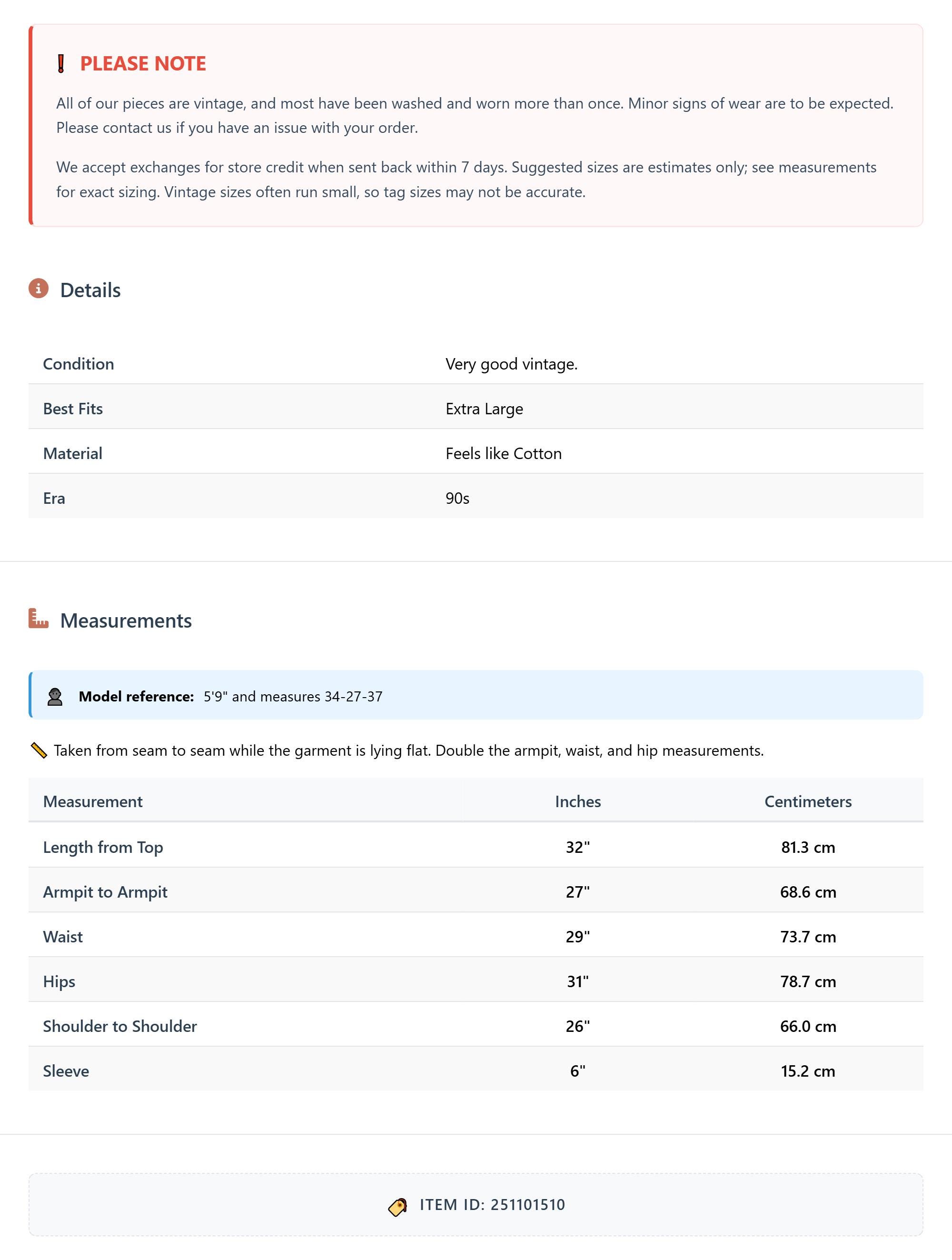 All of our pieces are vintage, and most have been washed and worn more than once. Minor signs of wear are to be expected. Please contact us if you have an issue with your order. We accept exchanges for store credit when sent back within 7 days.