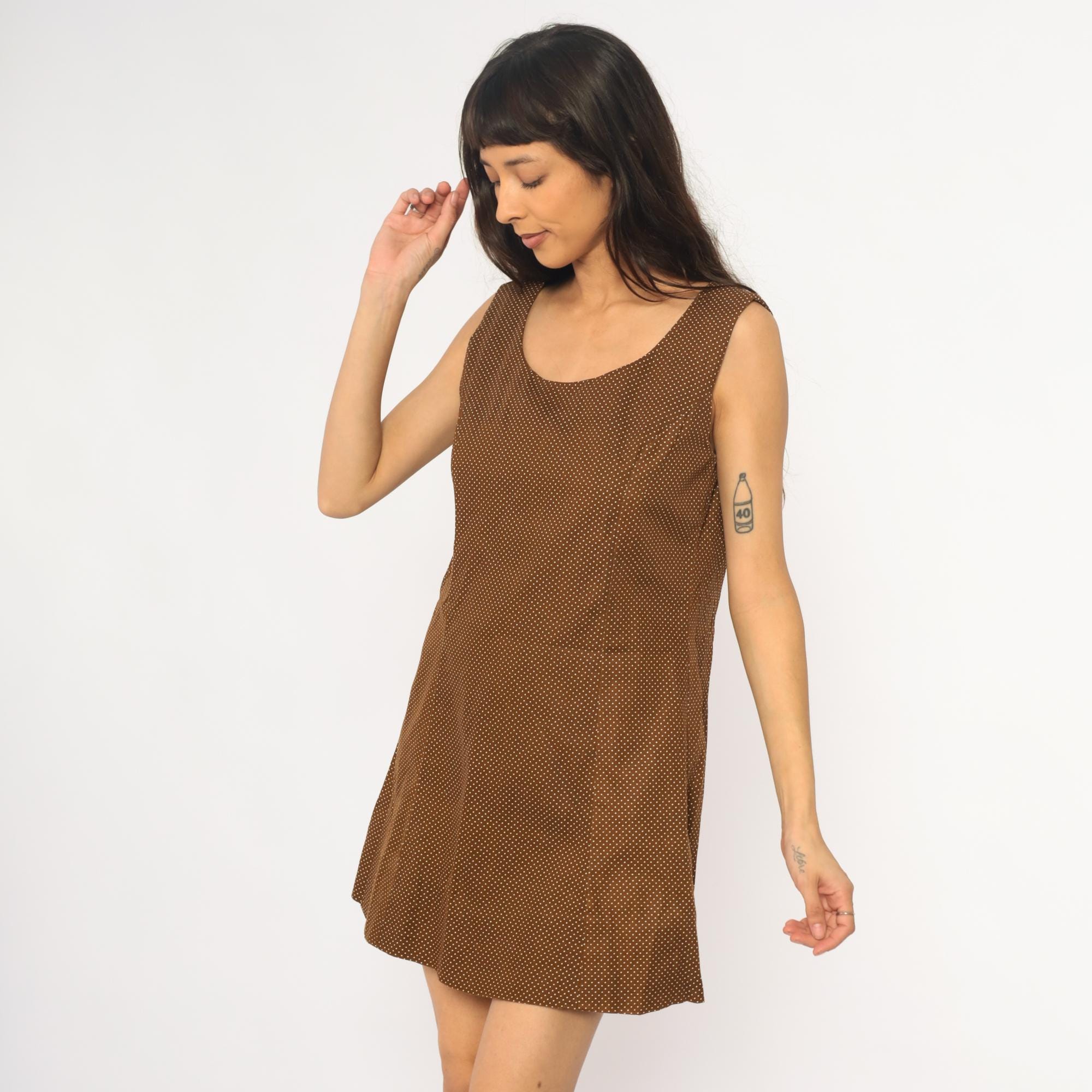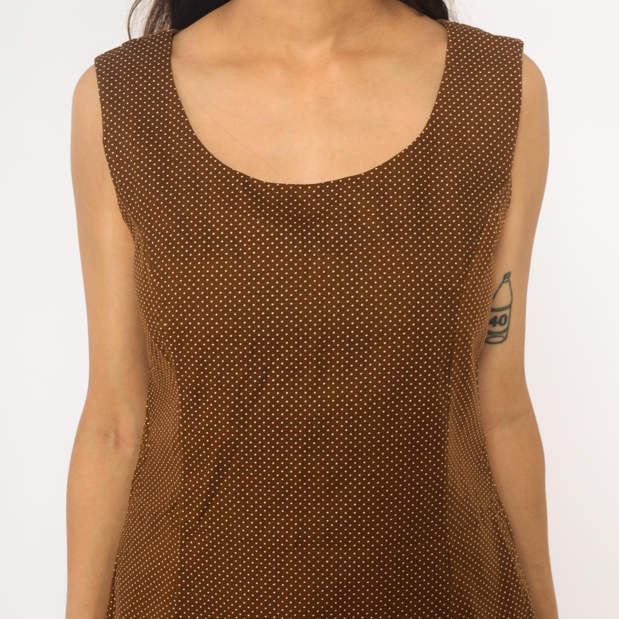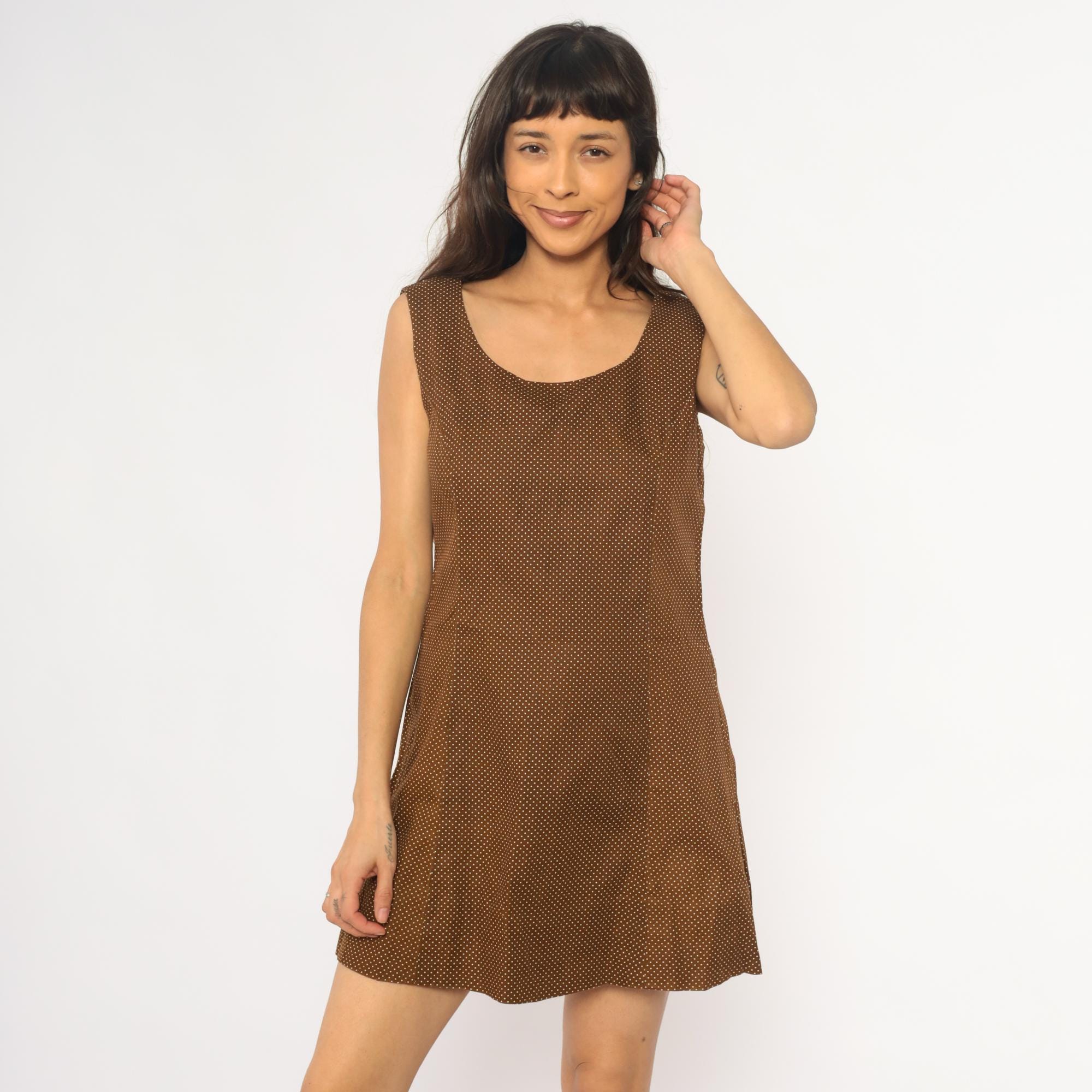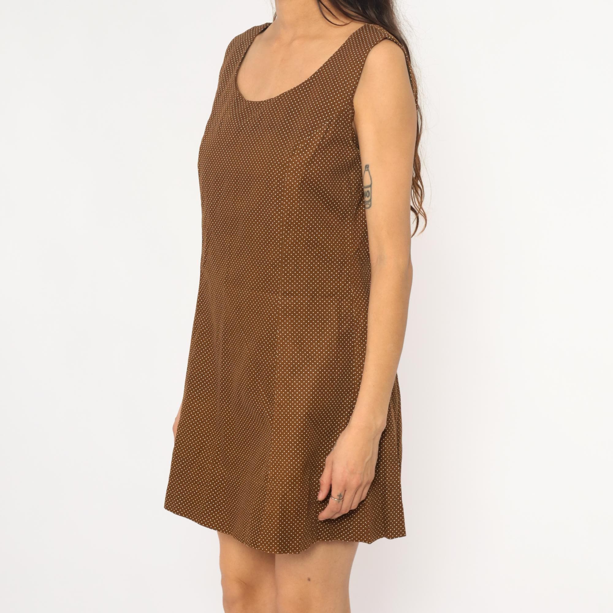 70s brown mini dress with small white polka dots across the fabric. Sleeveless shift style with scoop neckline and back zipper closure. Straight silhouette with slightly flared hem.