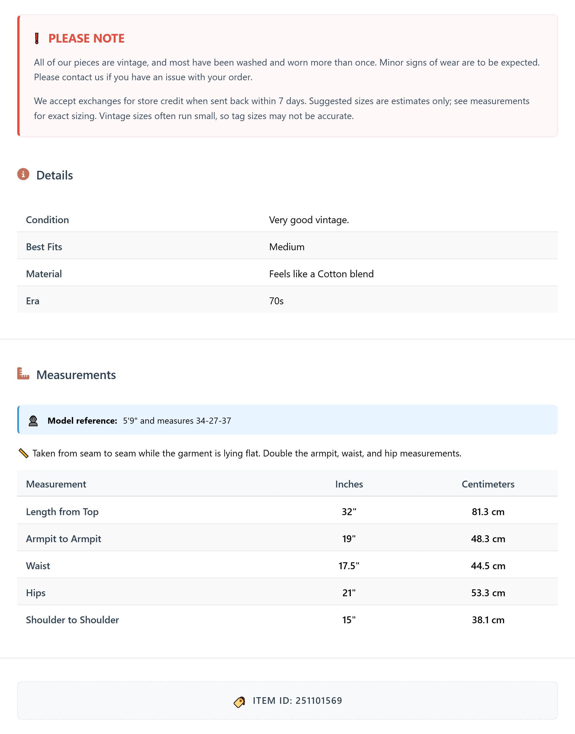 All of our pieces are vintage, and most have been washed and worn more than once. Minor signs of wear are to be expected. Please contact us if you have an issue with your order. We accept exchanges for store credit when sent back within 7 days.