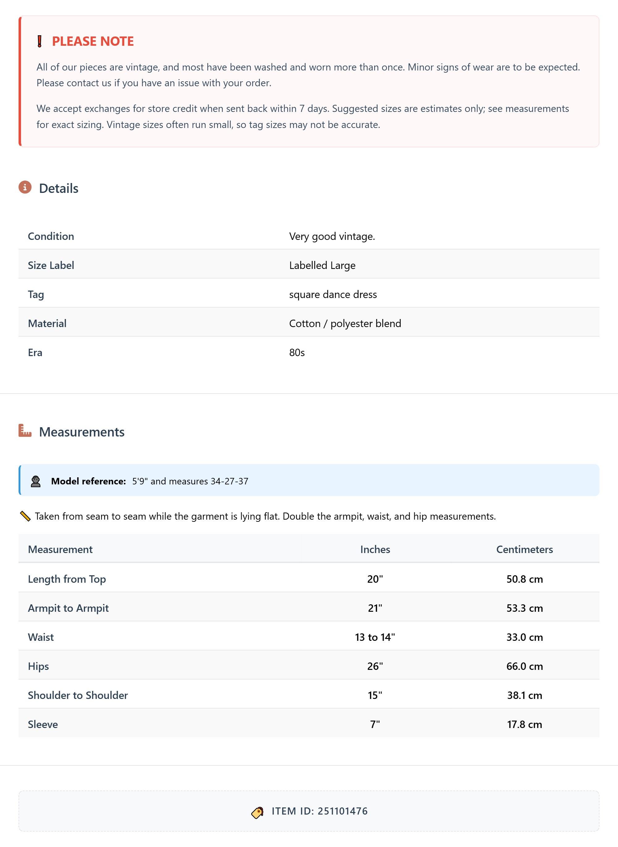 All of our pieces are vintage, and most have been washed and worn more than once. Minor signs of wear are to be expected. Please contact us if you have an issue with your order. We accept exchanges for store credit when sent back within 7 days.