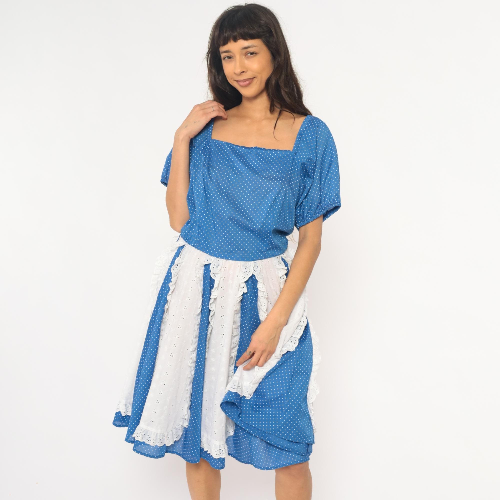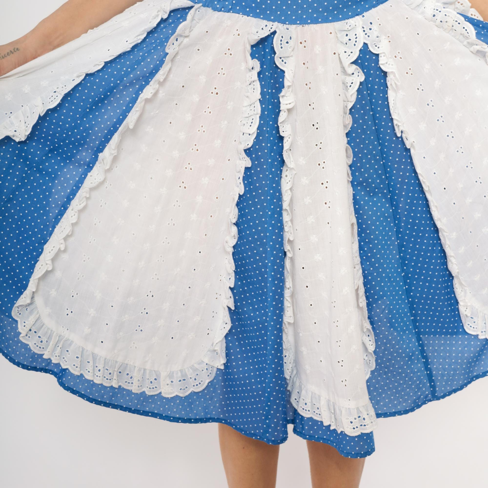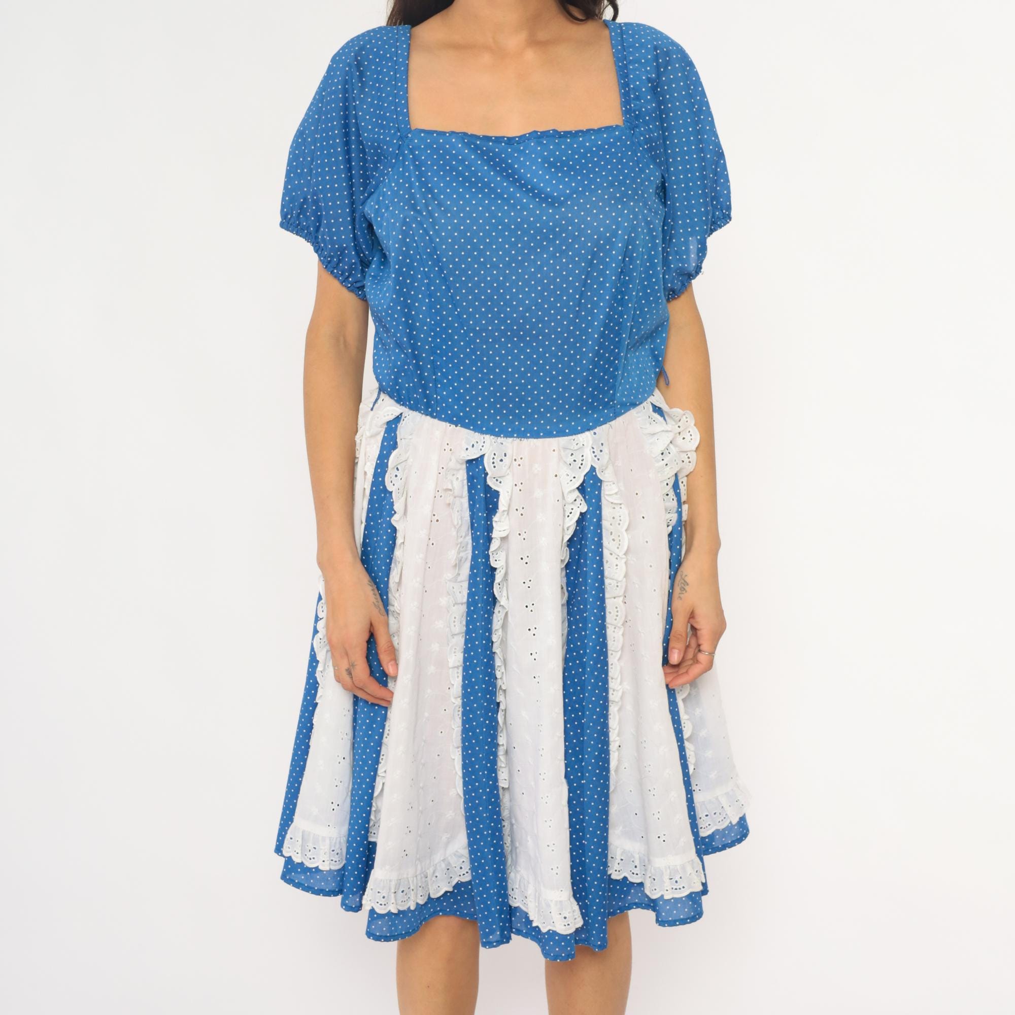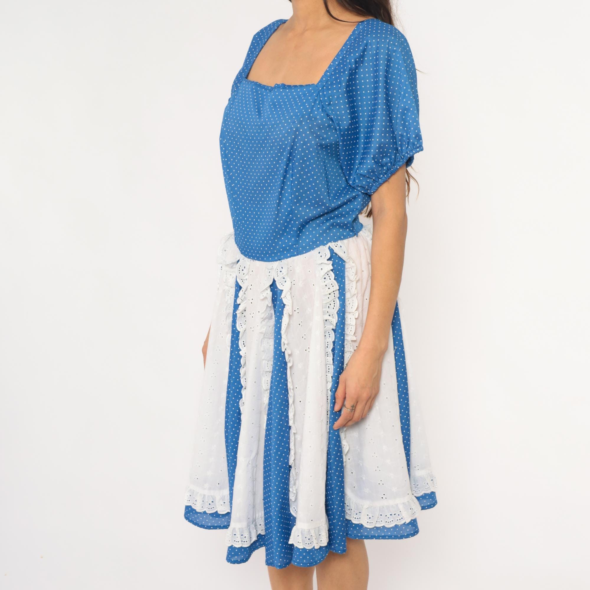 80s blue polka dot square dance dress with white eyelet lace panel inserts and square neckline. Short puff sleeves with gathered cuffs, fitted bodice with back zipper, full gathered skirt with alternating vertical panels of blue polka dot fabric and white scalloped-edge eyelet lace.