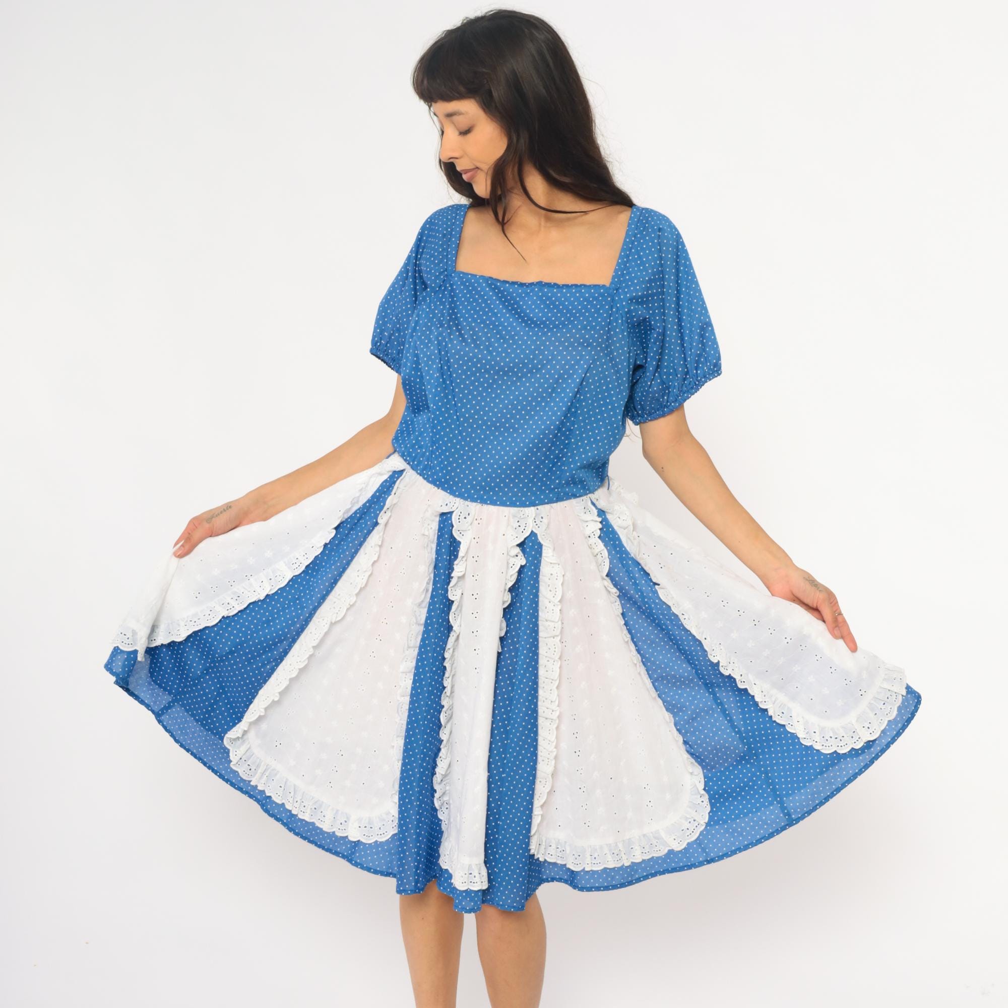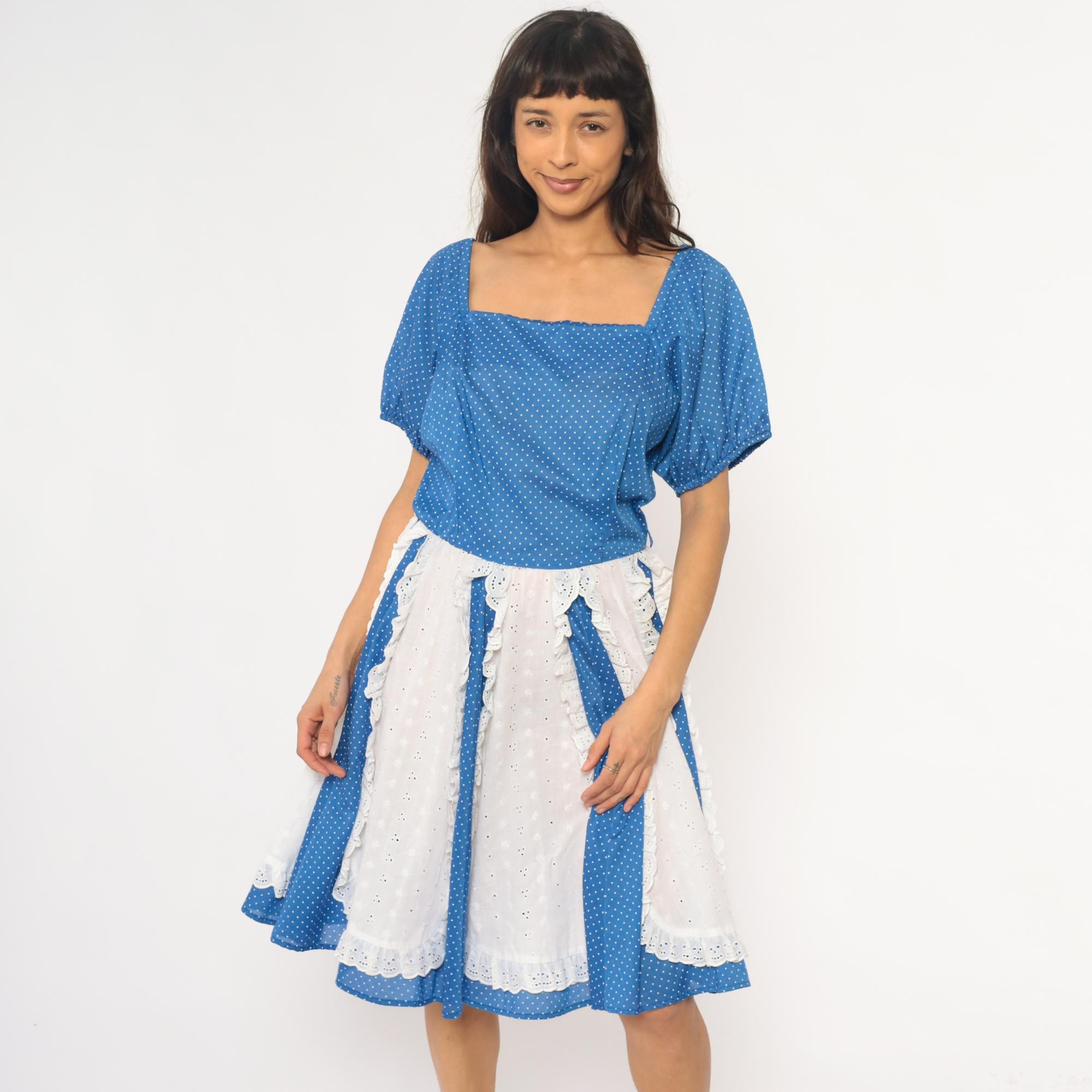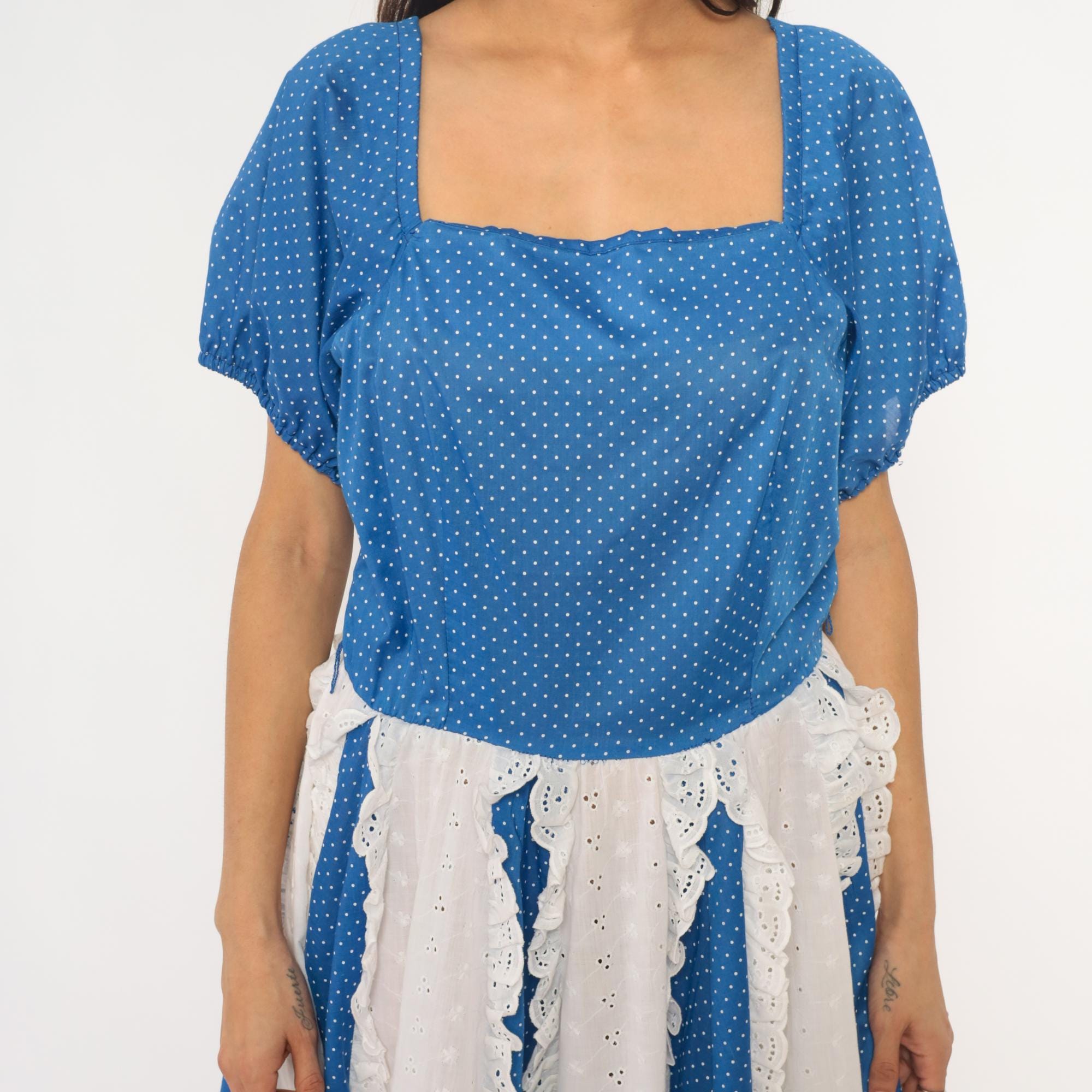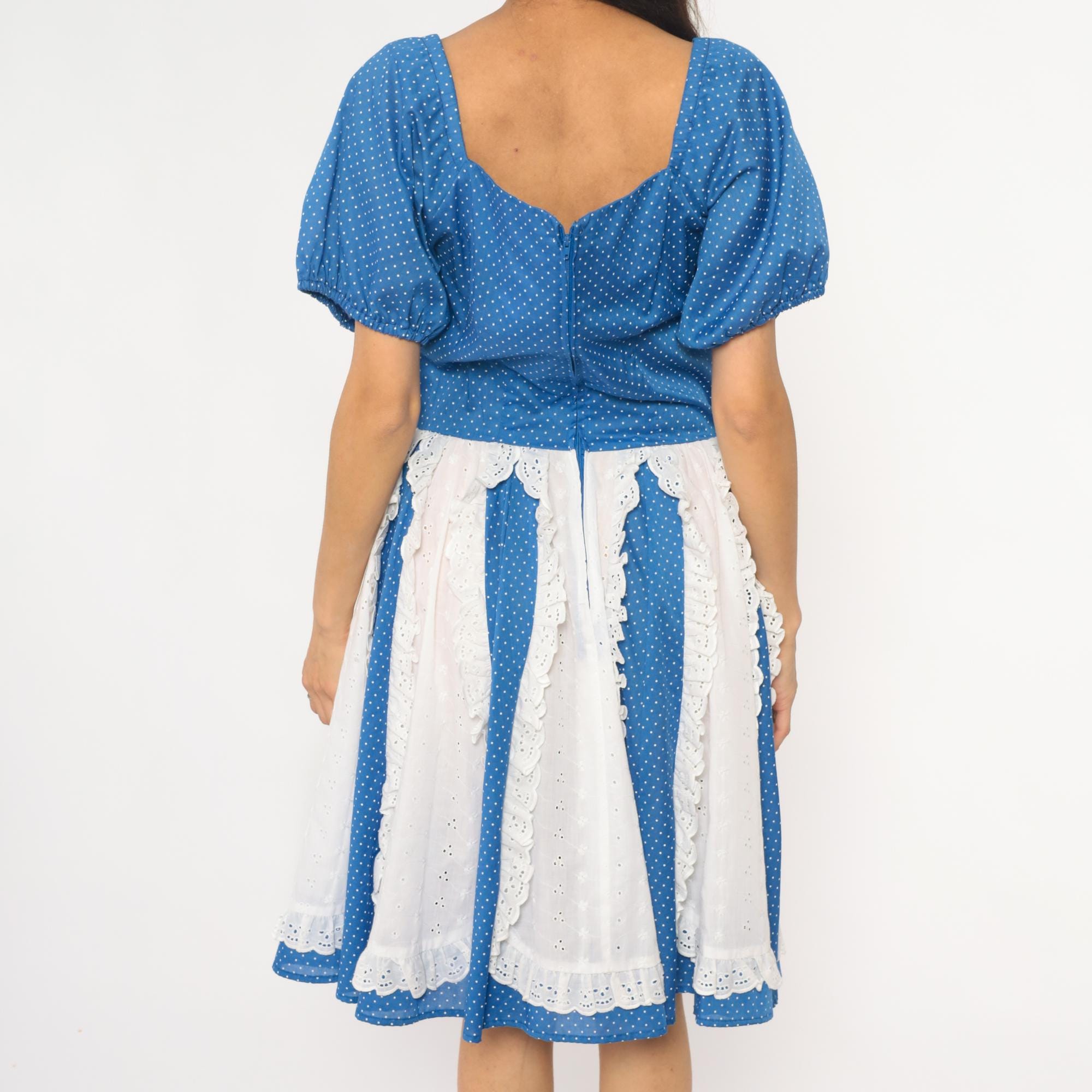 80s blue polka dot square dance dress with white eyelet lace panel inserts and square neckline. Short puff sleeves with gathered cuffs, fitted bodice with back zipper, full gathered skirt with alternating vertical panels of blue polka dot fabric and white scalloped-edge eyelet lace.