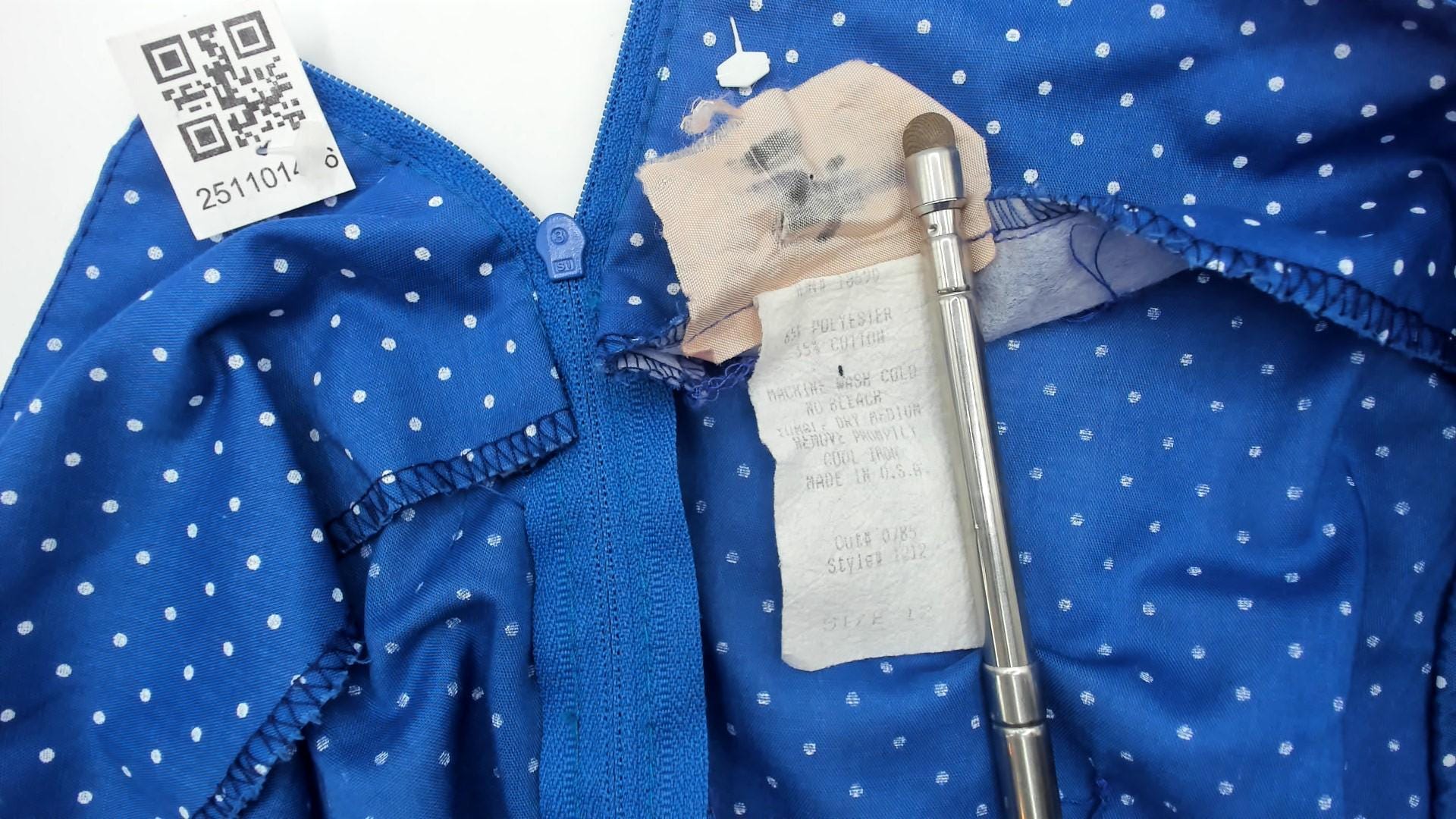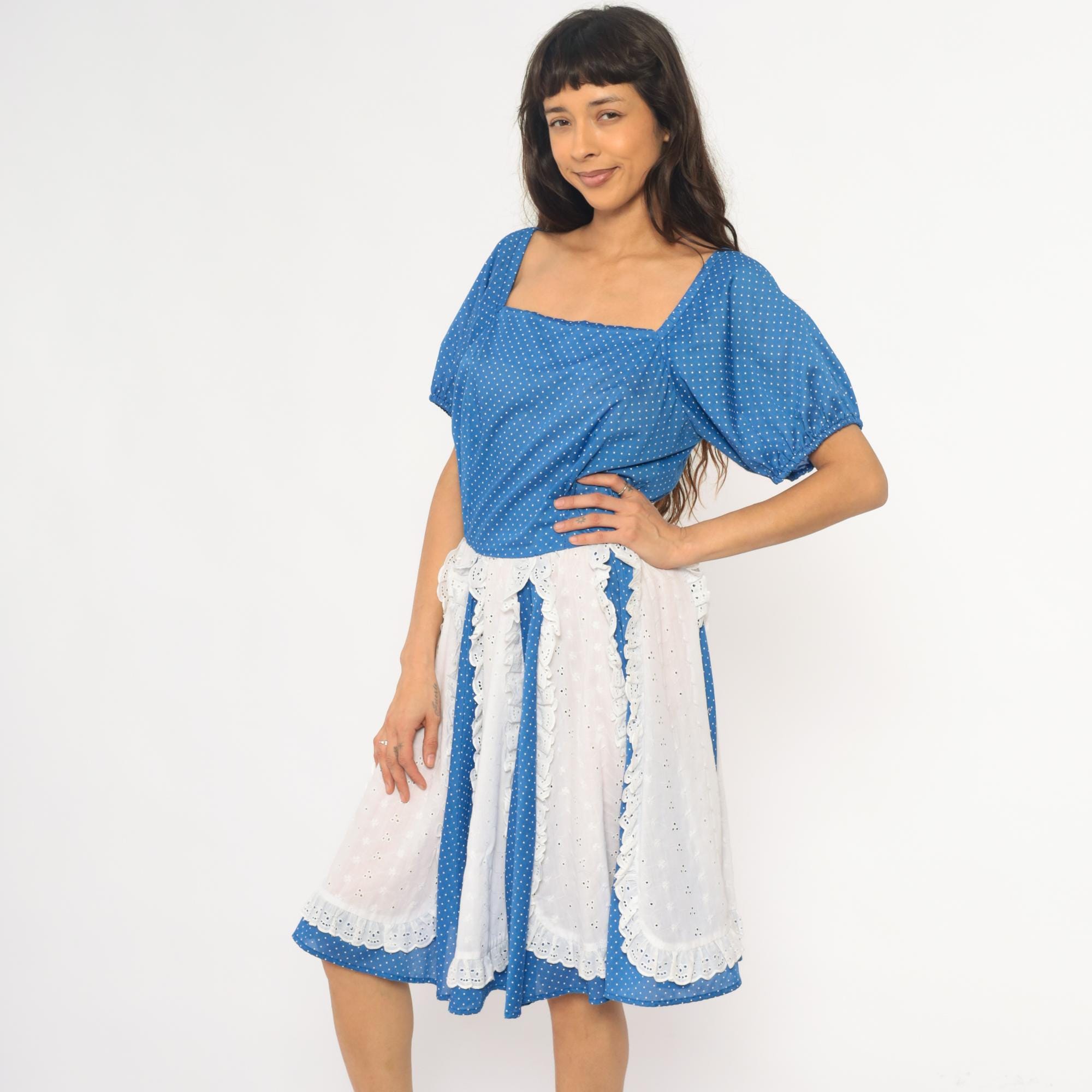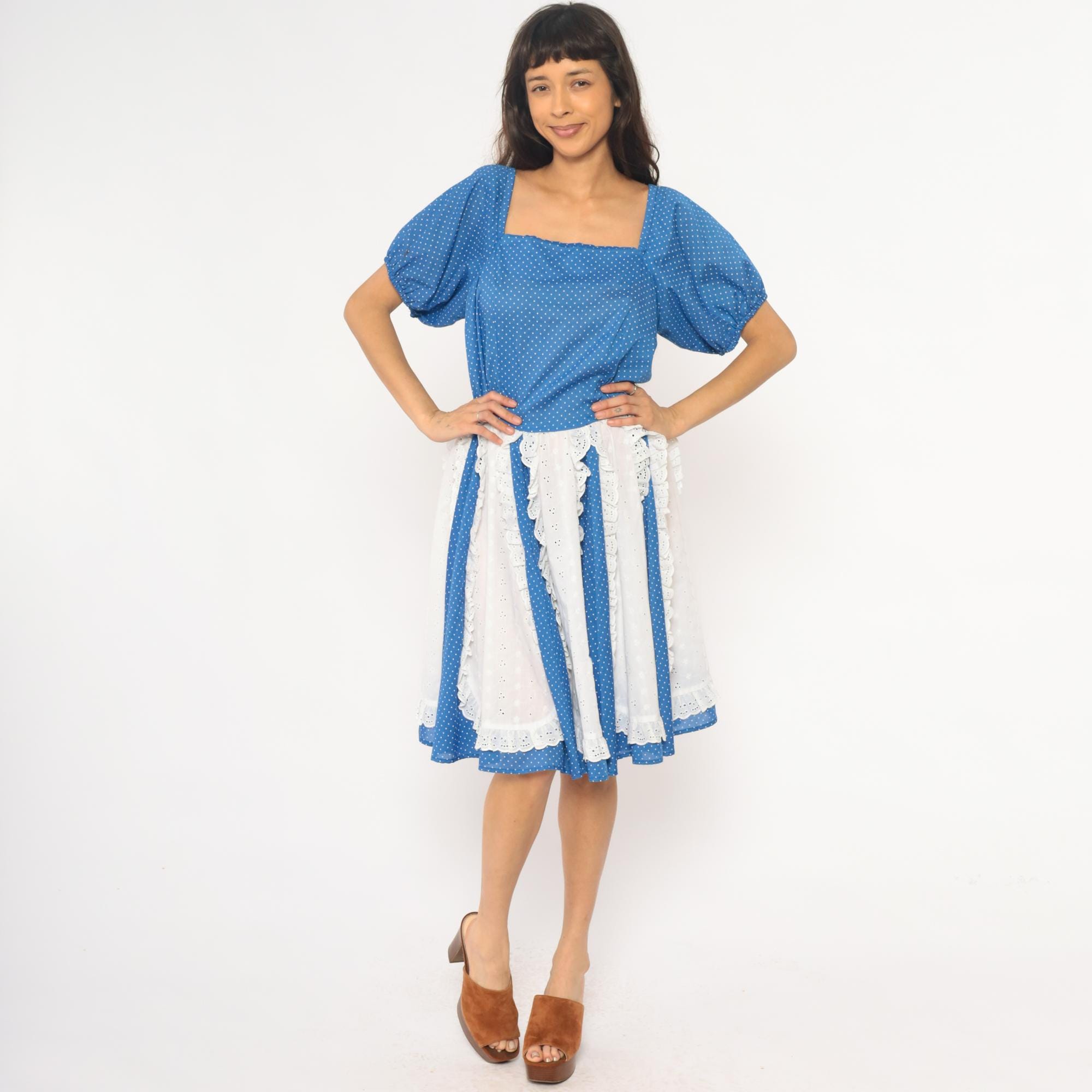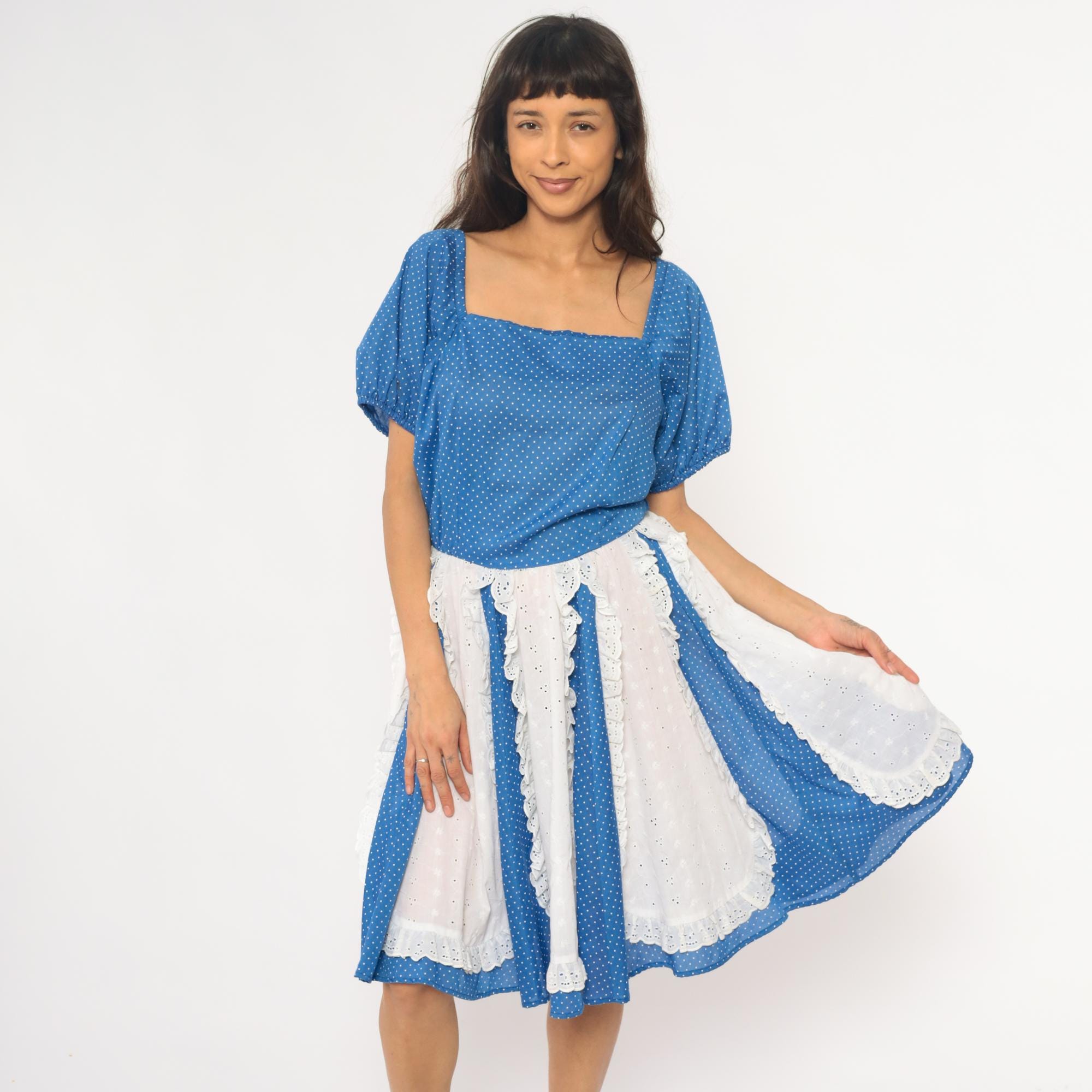 80s blue polka dot square dance dress with white eyelet lace panel inserts and square neckline. Short puff sleeves with gathered cuffs, fitted bodice with back zipper, full gathered skirt with alternating vertical panels of blue polka dot fabric and white scalloped-edge eyelet lace.