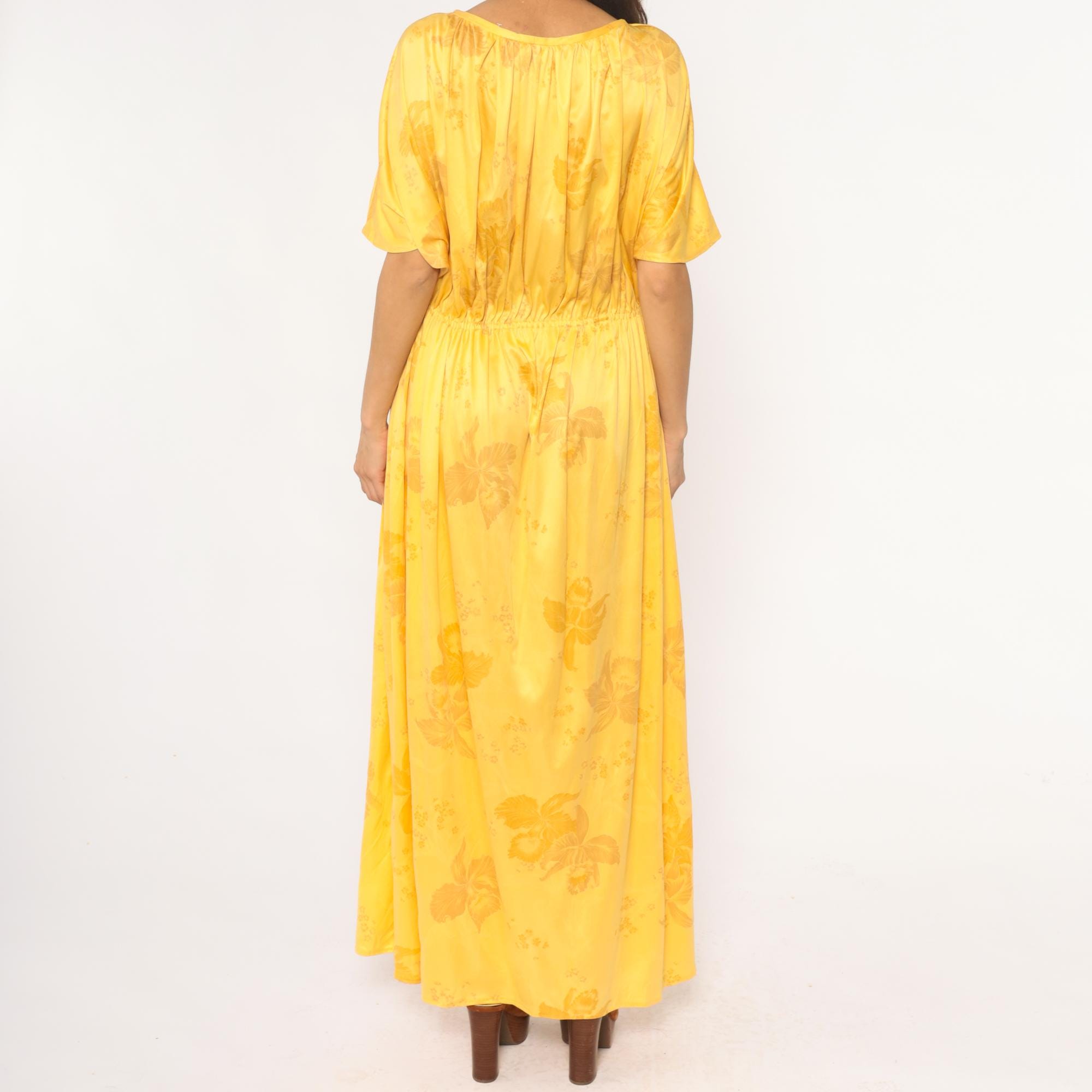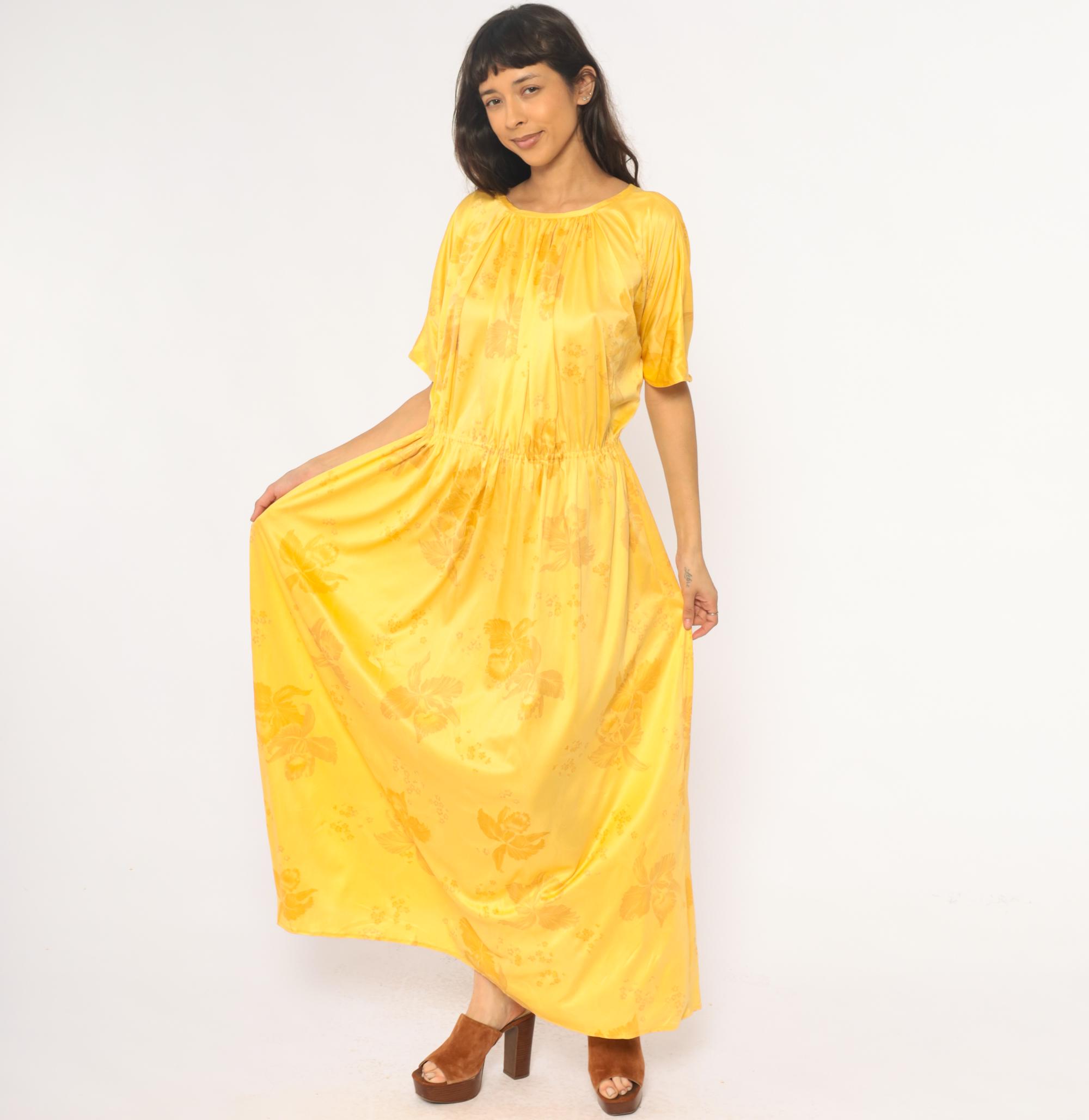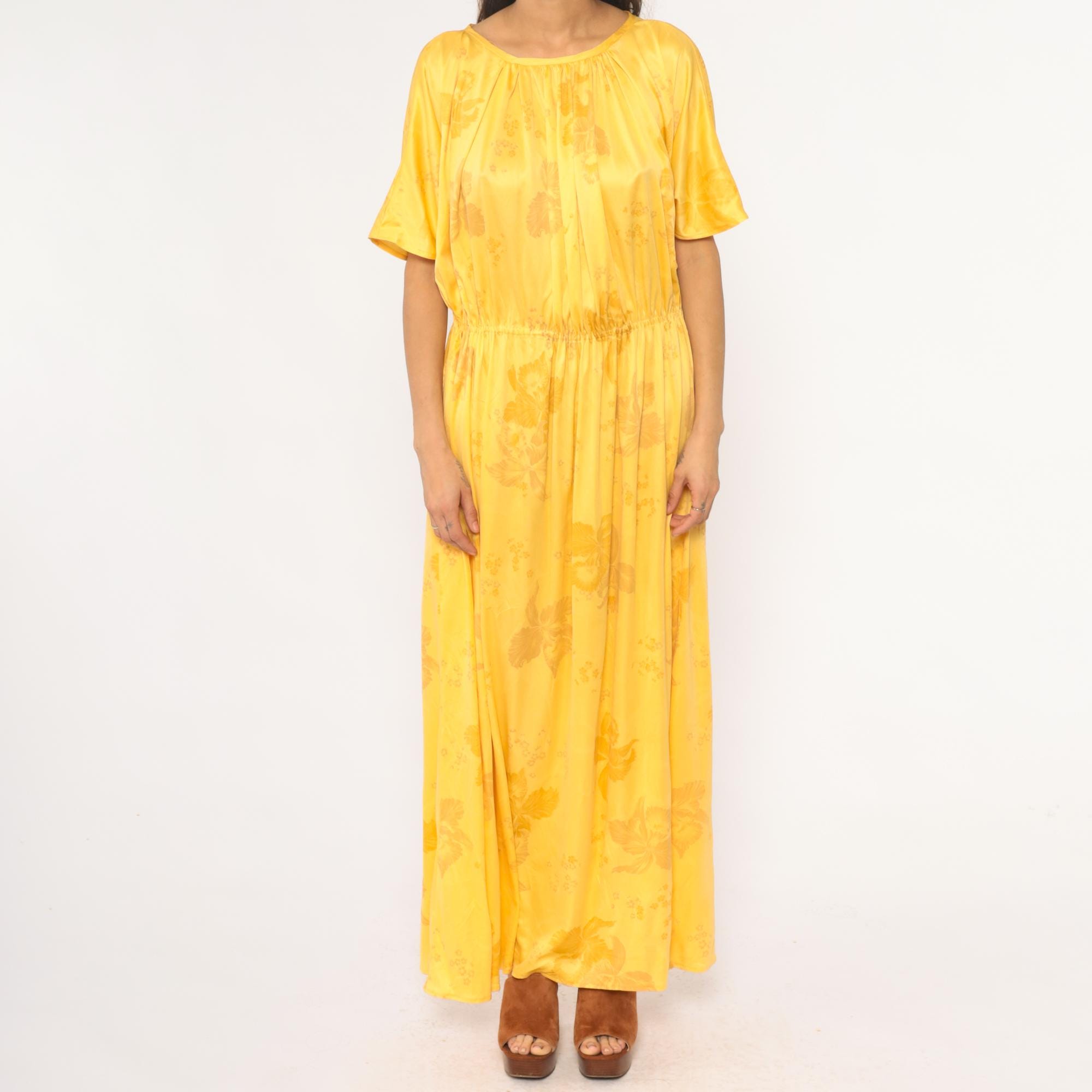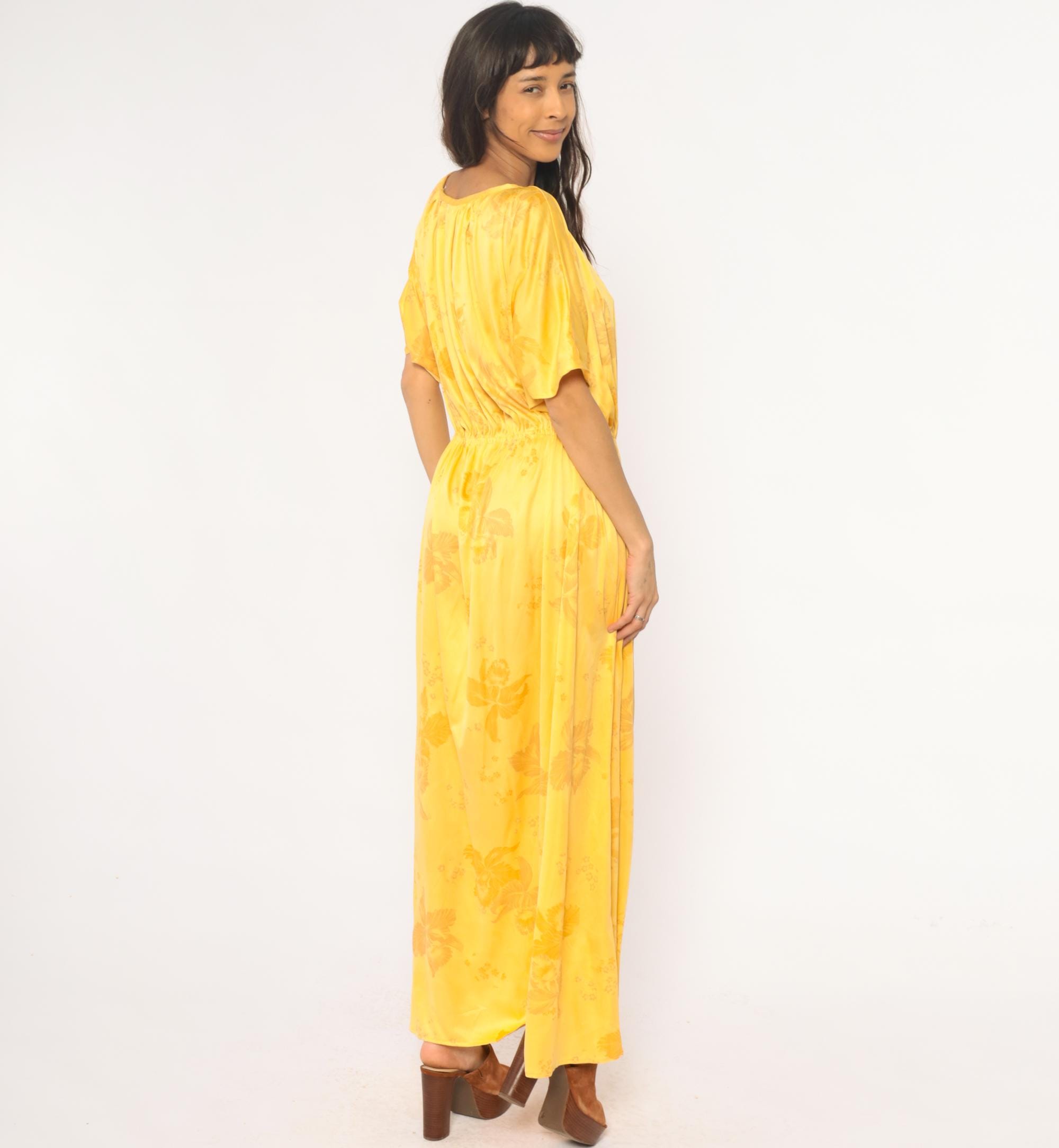 70s yellow maxi dress with tone-on-tone floral jacquard pattern across the entire fabric. Round gathered neckline, short flutter sleeves, elastic gathered waist. Full length A-line skirt.