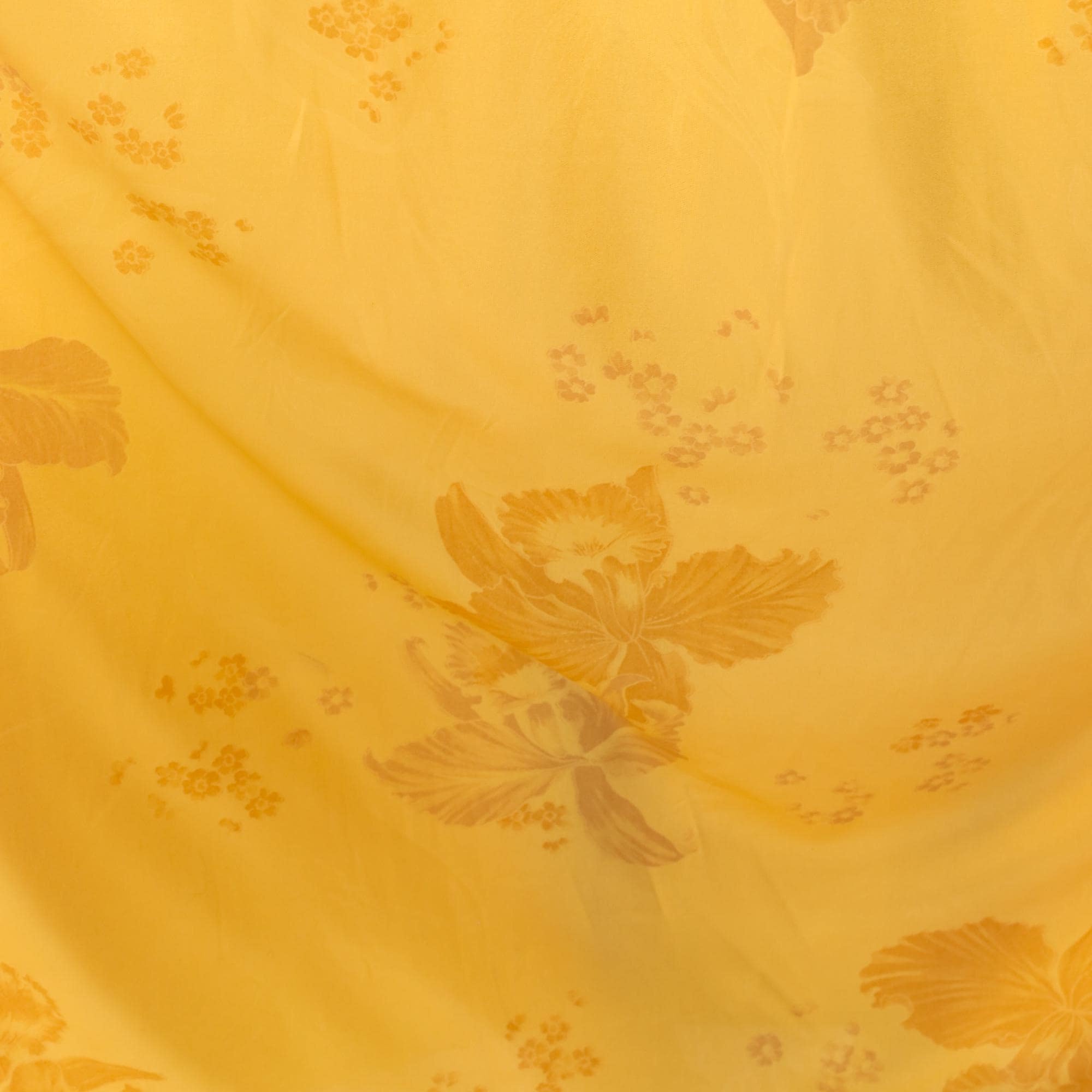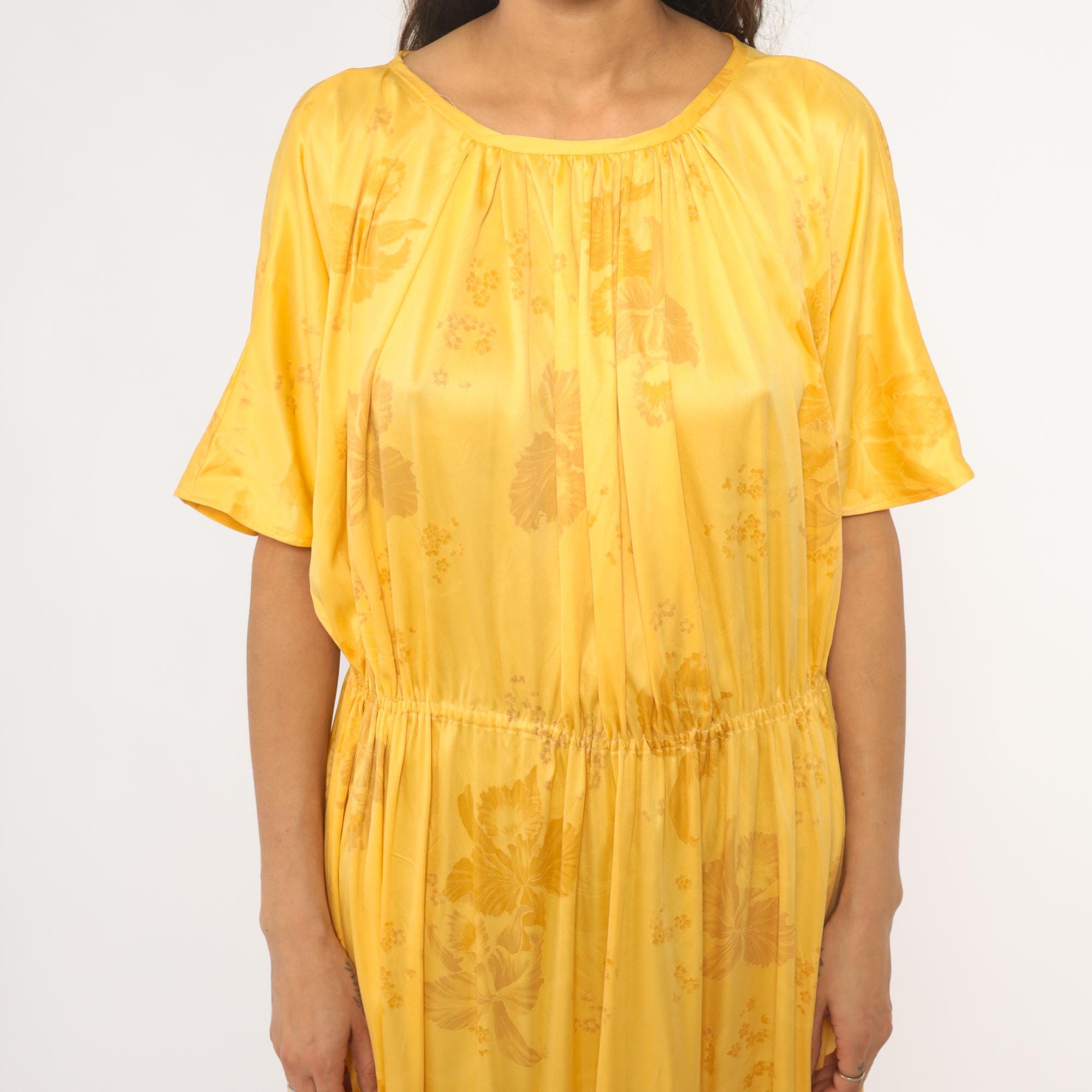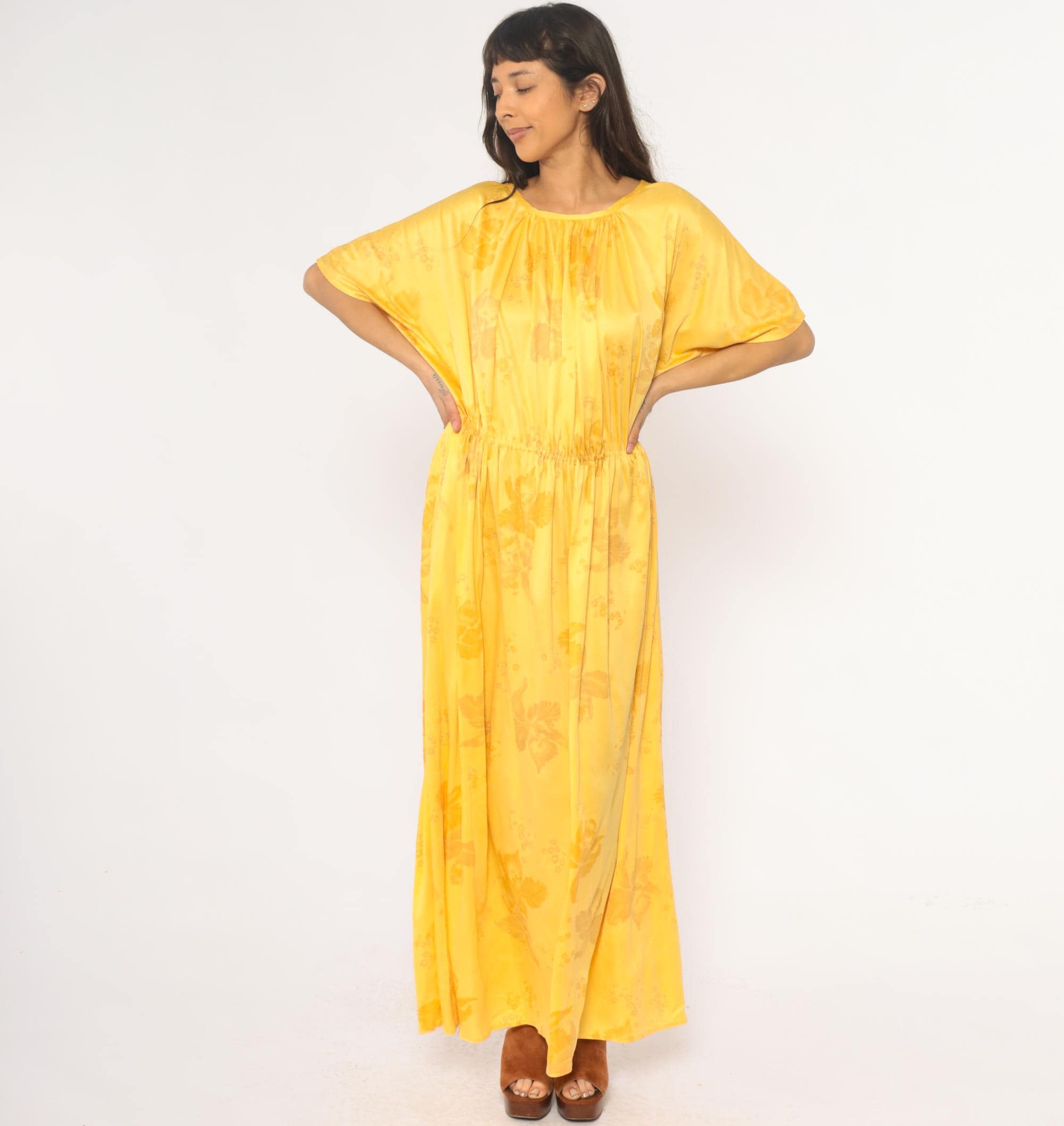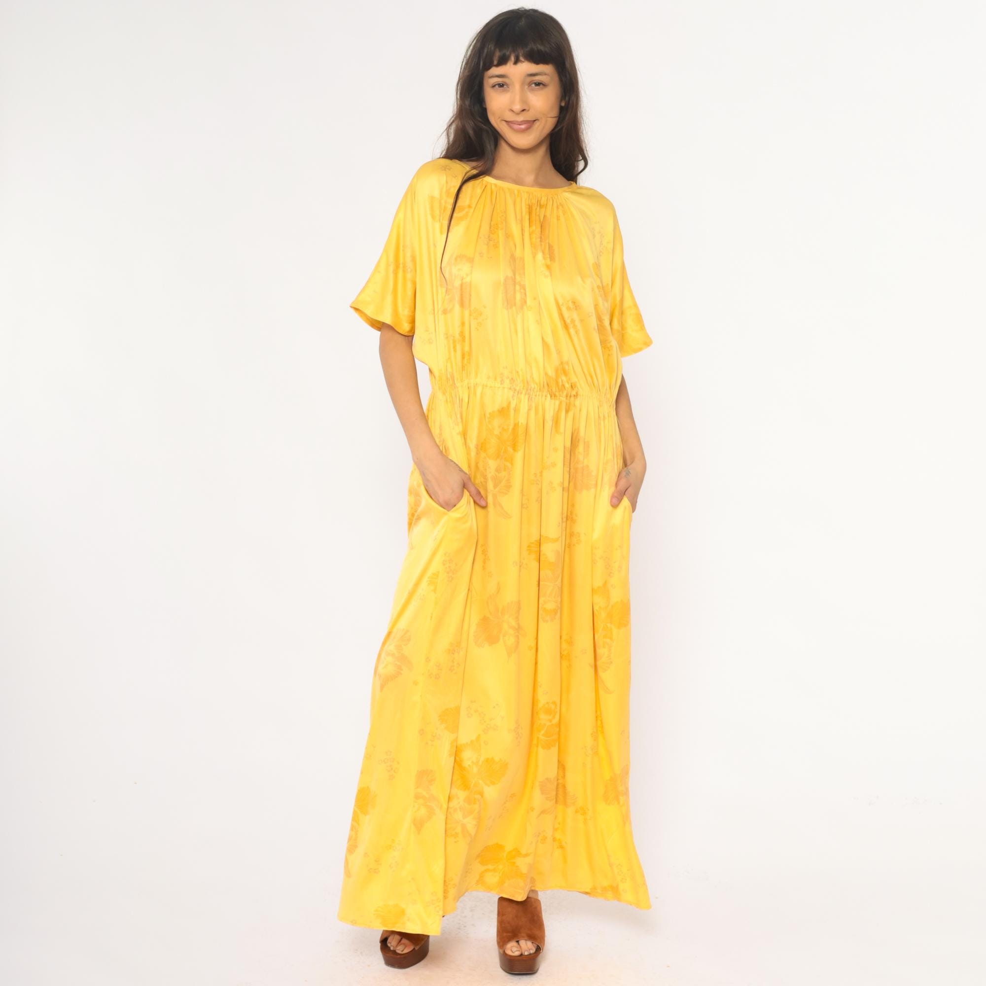 70s yellow maxi dress with tone-on-tone floral jacquard pattern across the entire fabric. Round gathered neckline, short flutter sleeves, elastic gathered waist. Full length A-line skirt.
