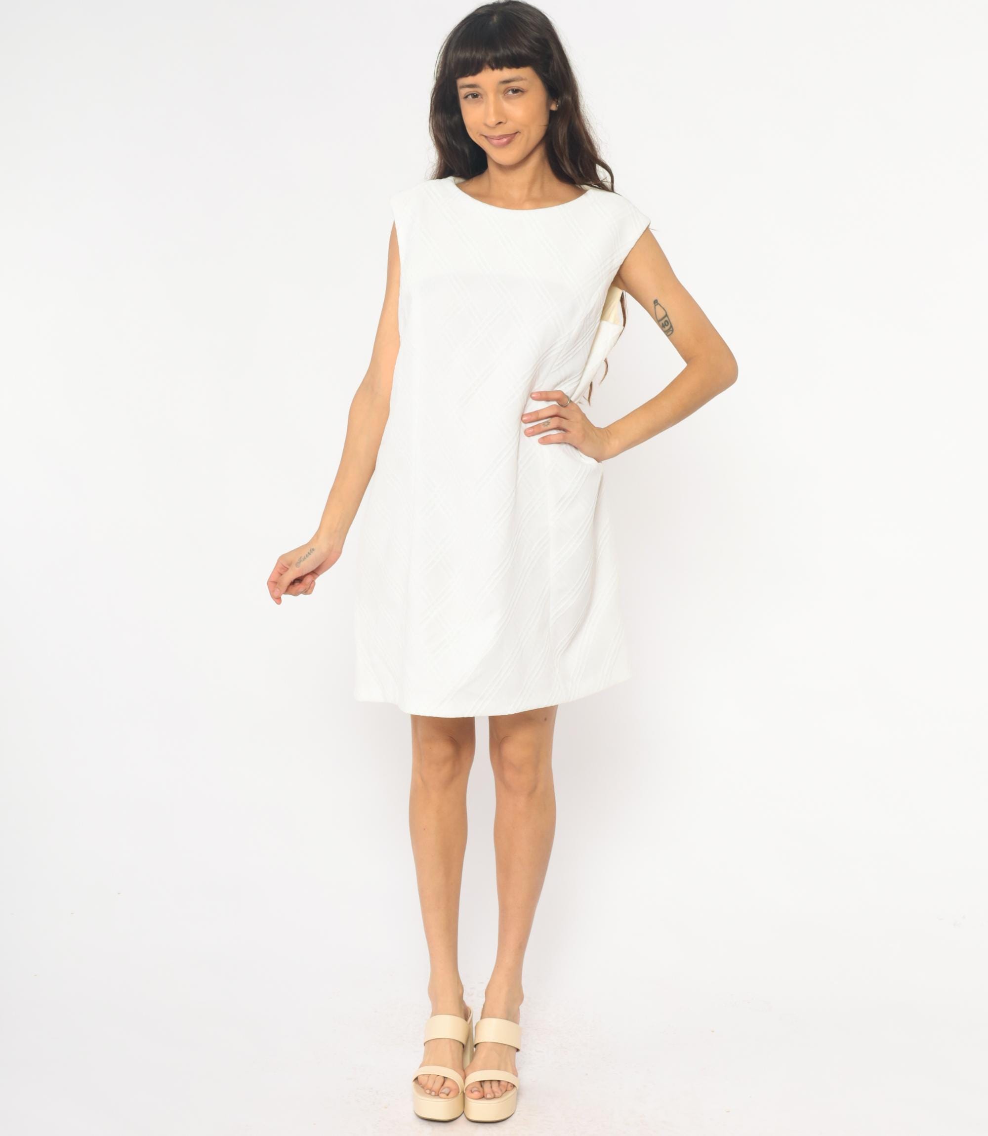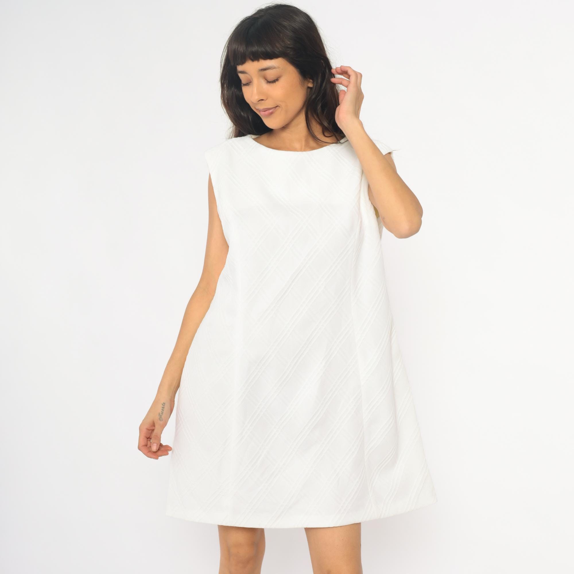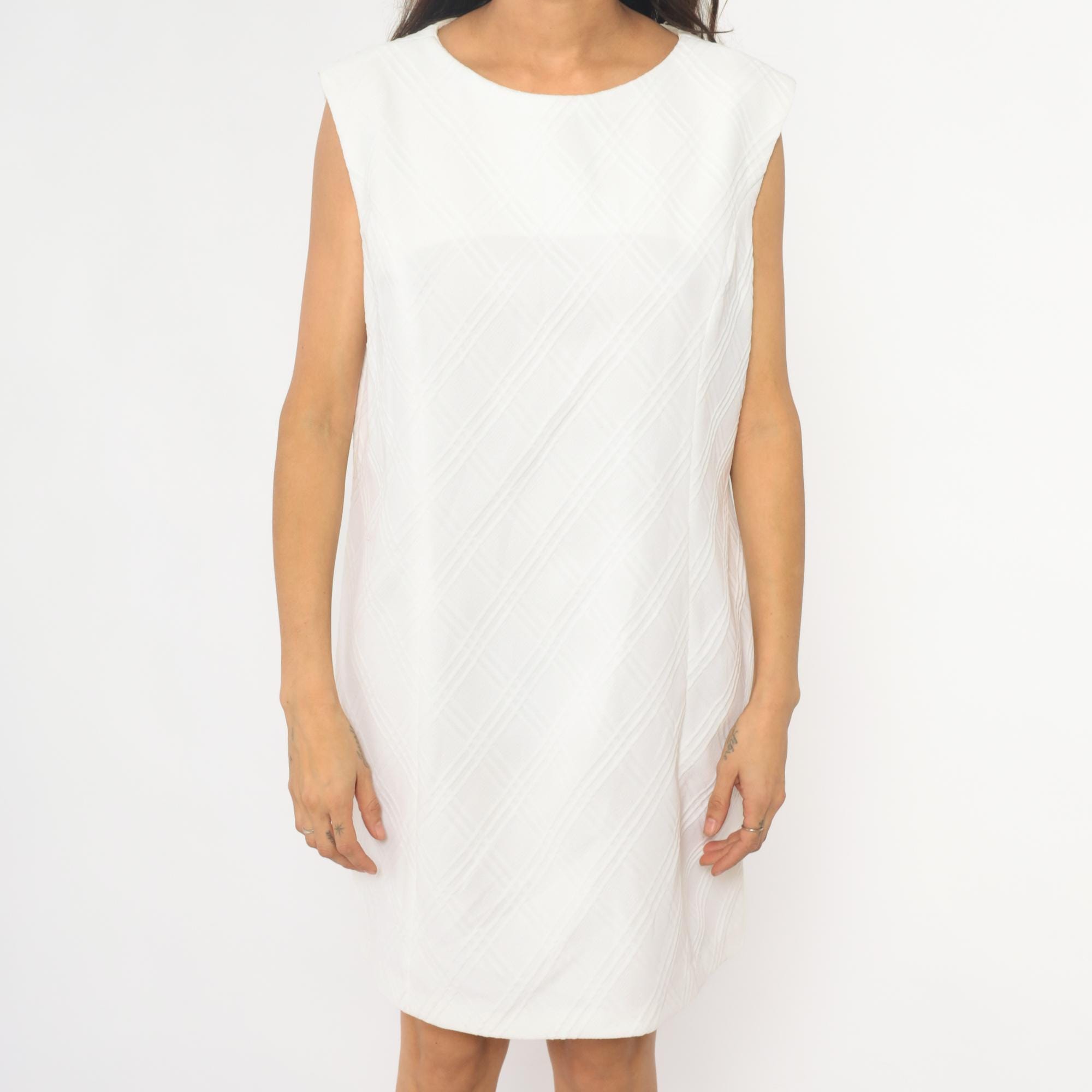 70s white shift dress with diagonal textured stripe pattern across the fabric. Sleeveless with round neckline and back zipper closure. Knee length silhouette with clean, straight lines.