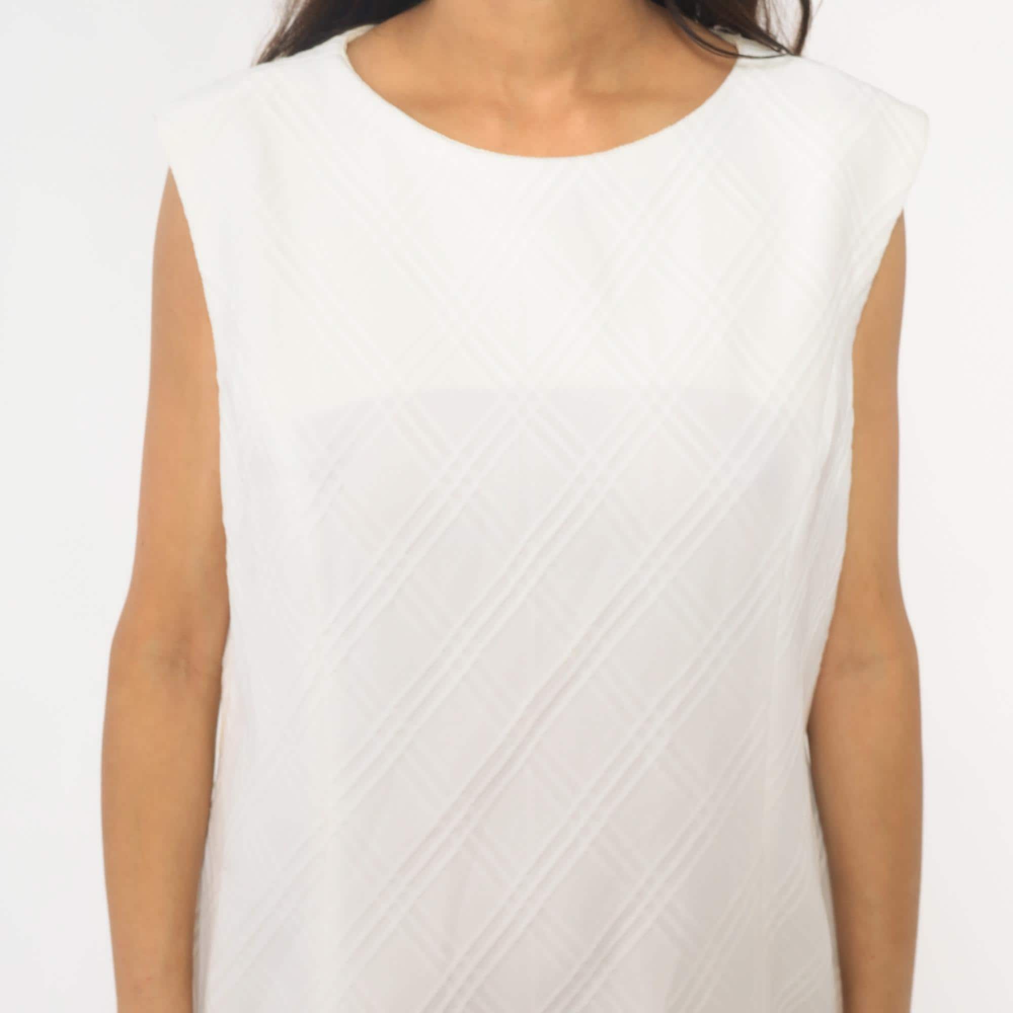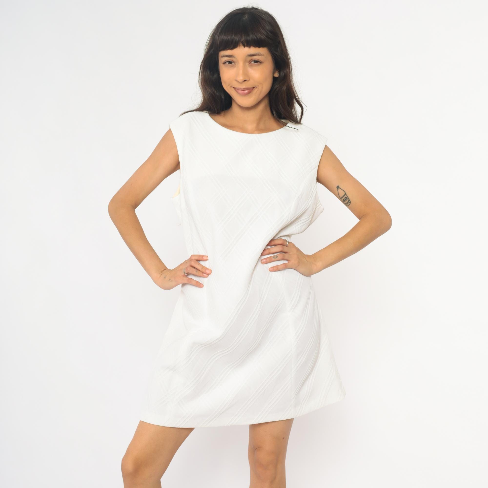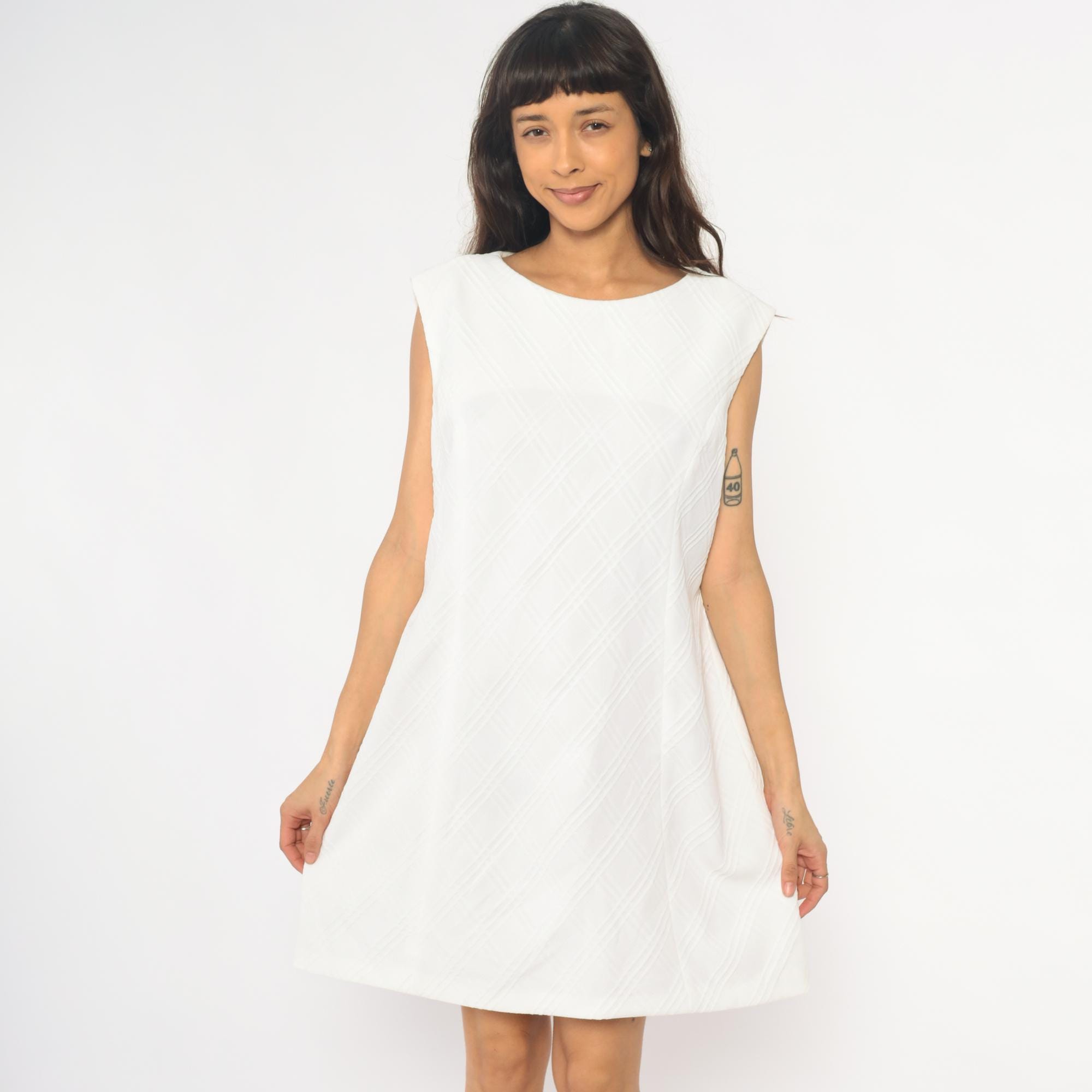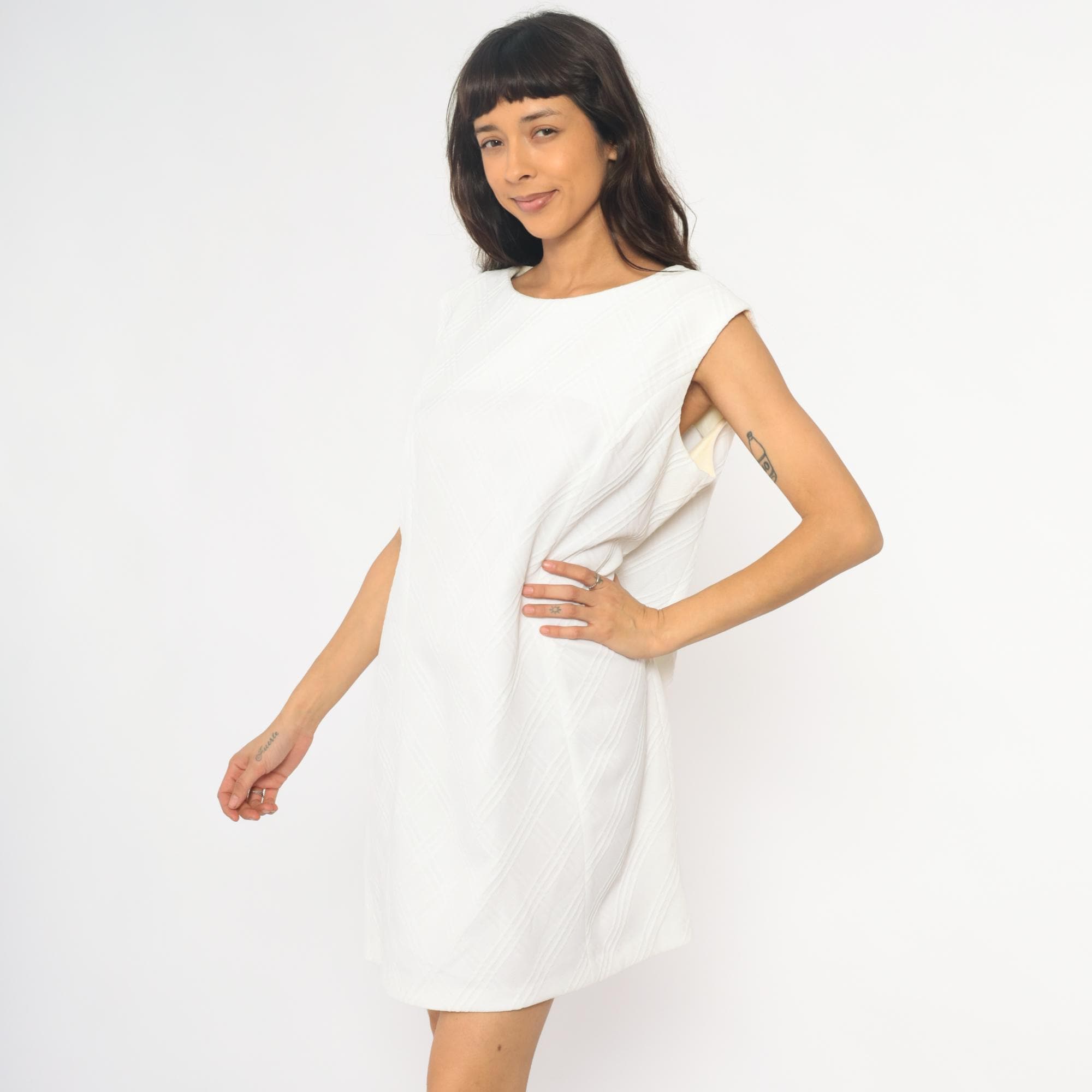 70s white shift dress with diagonal textured stripe pattern across the fabric. Sleeveless with round neckline and back zipper closure. Knee length silhouette with clean, straight lines.