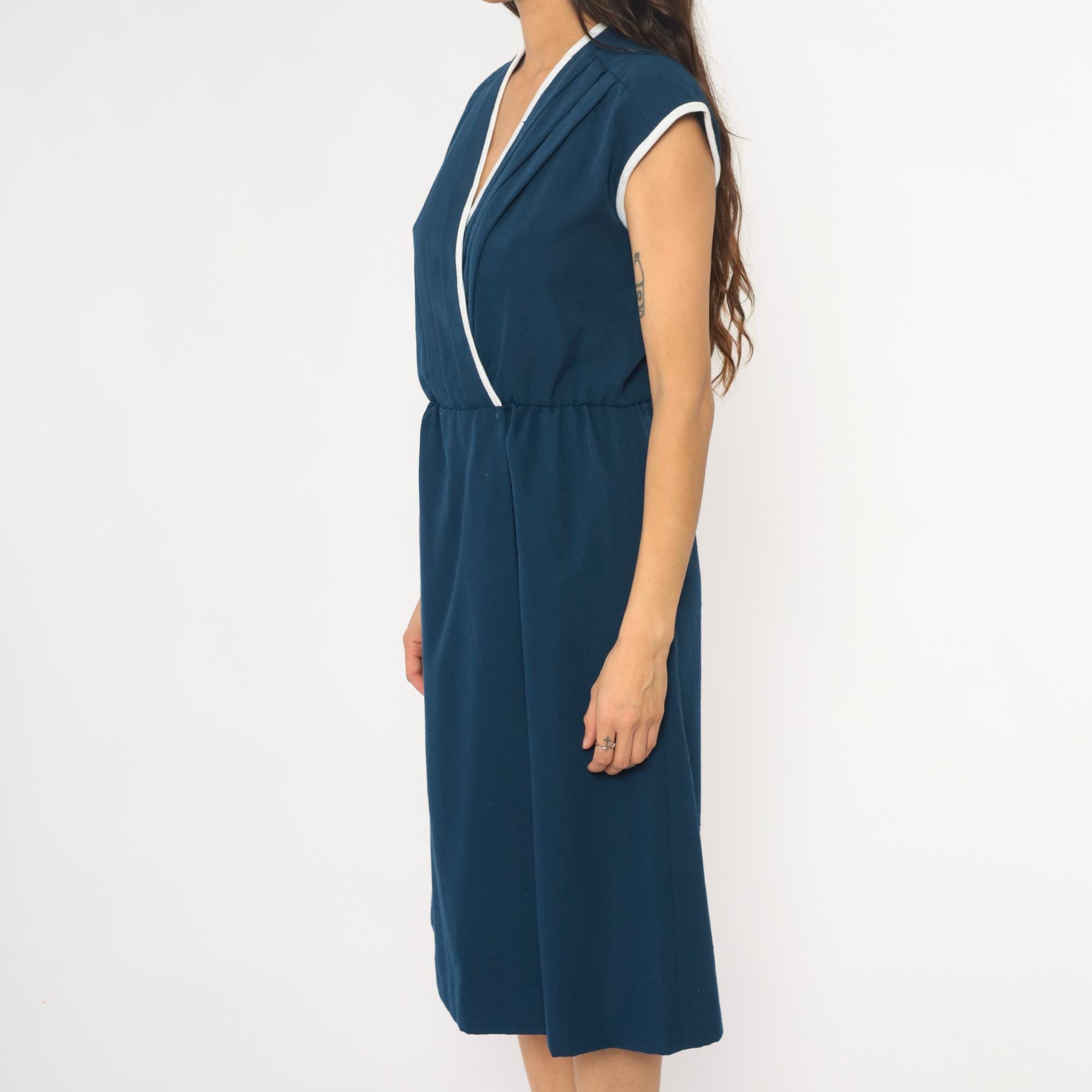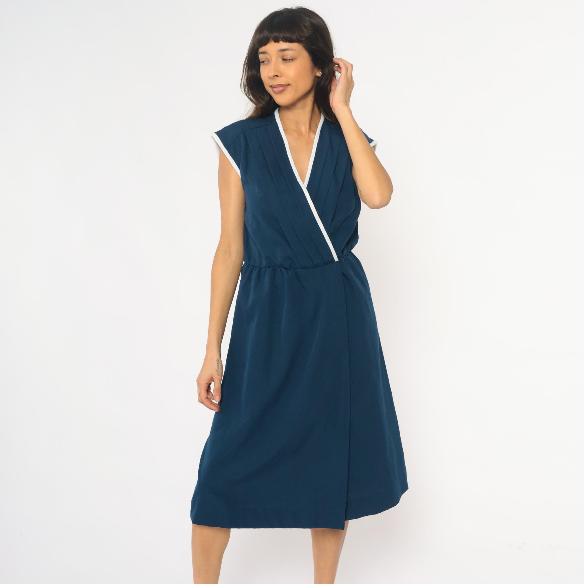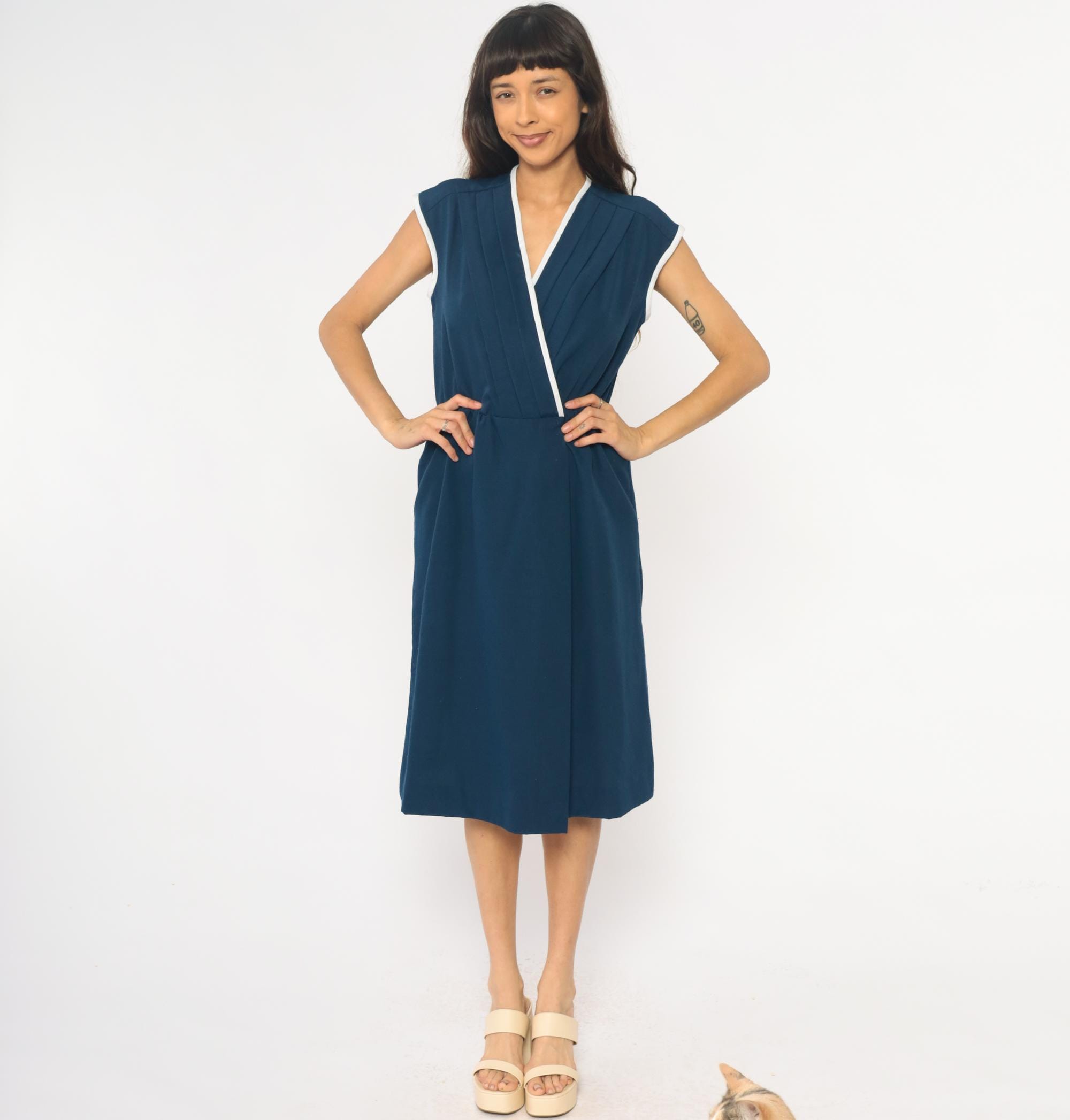 80s navy blue dress from toni todd with wrap-style bodice and white contrast trim along the neckline, sleeves, and closure. Diagonal pleated detail across the bodice, short cap sleeves, elastic gathered waist.