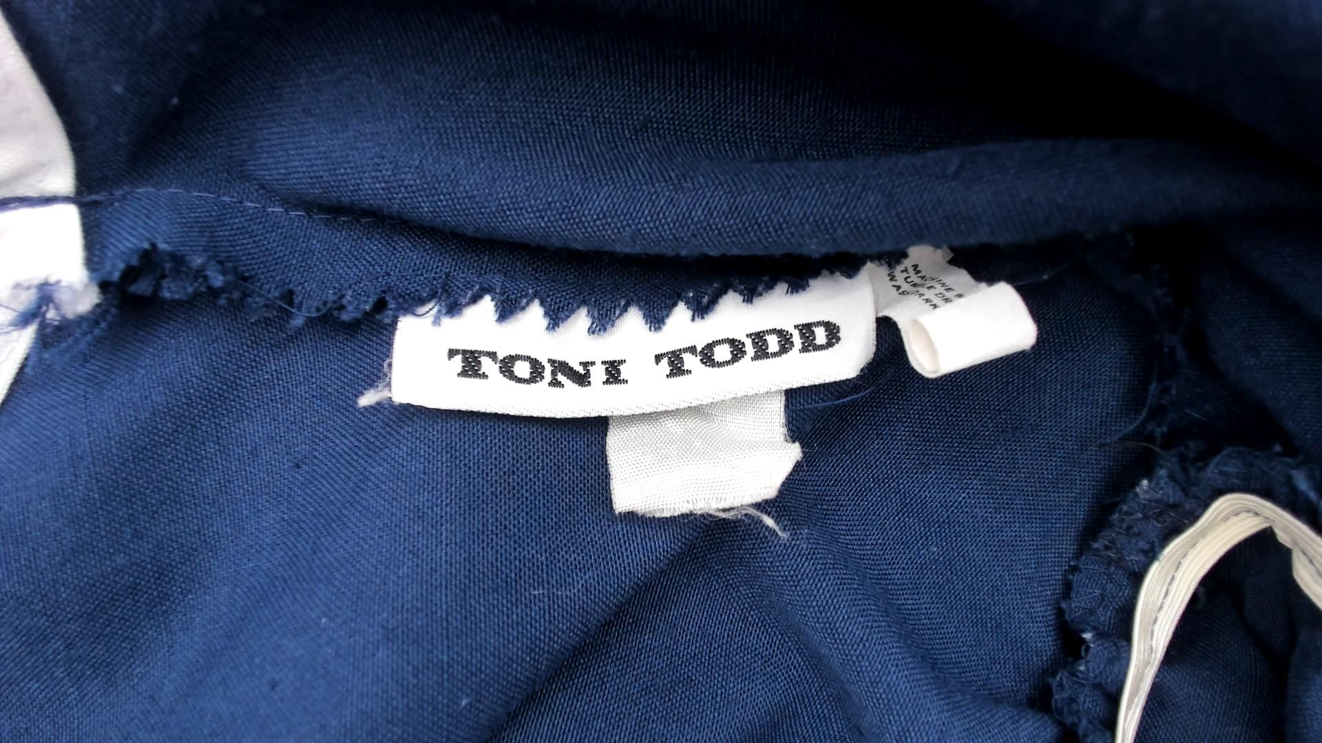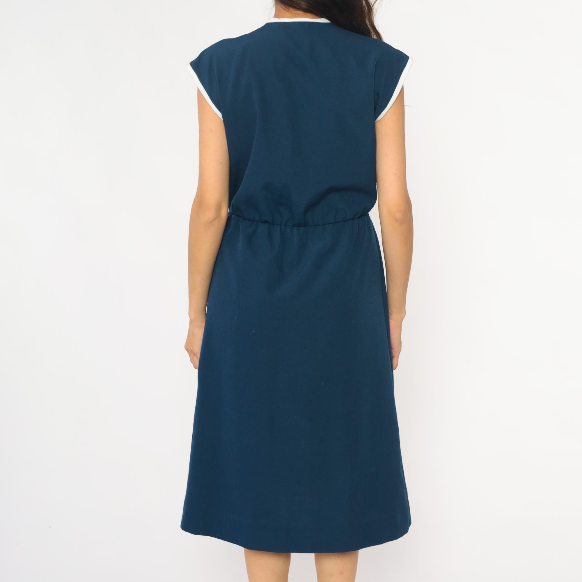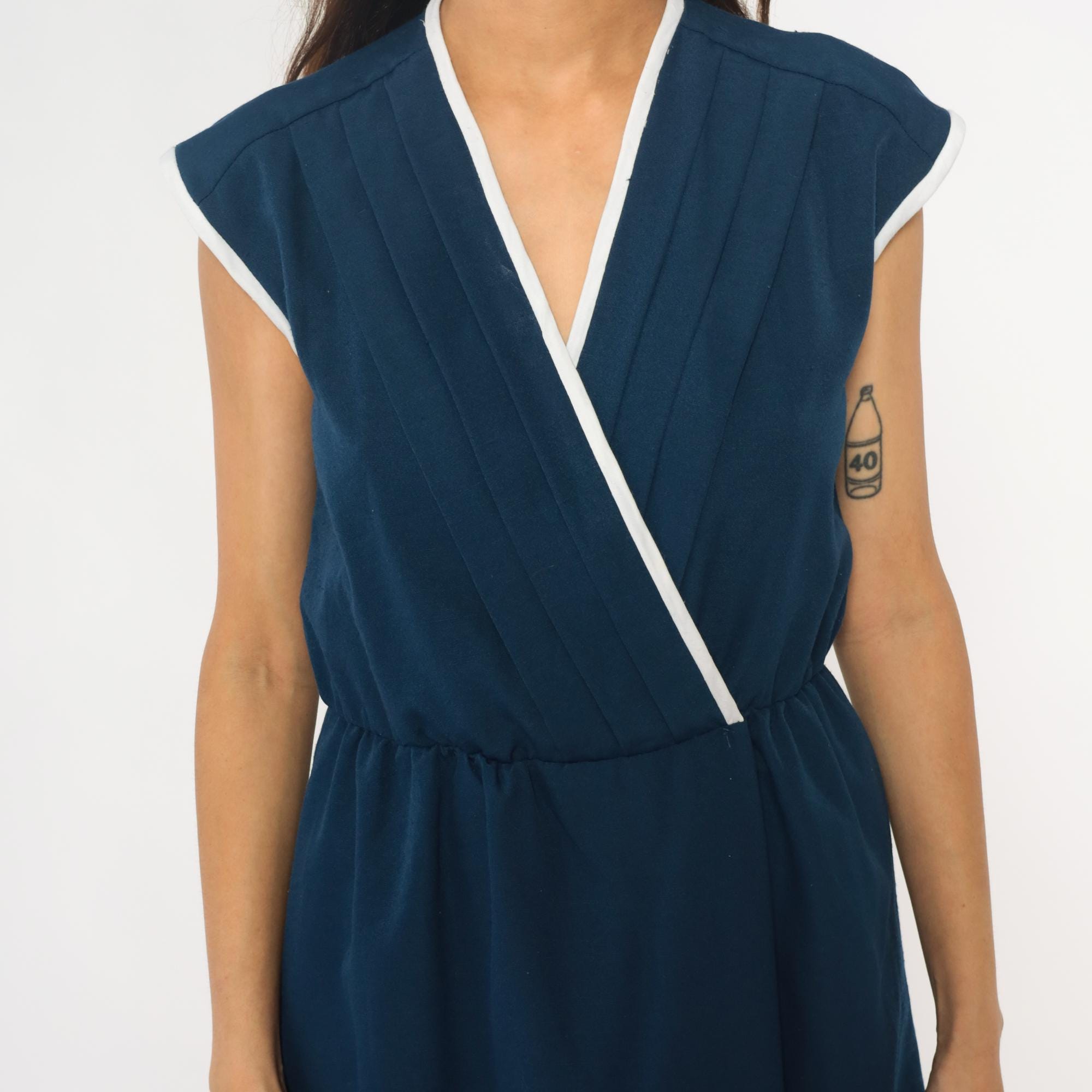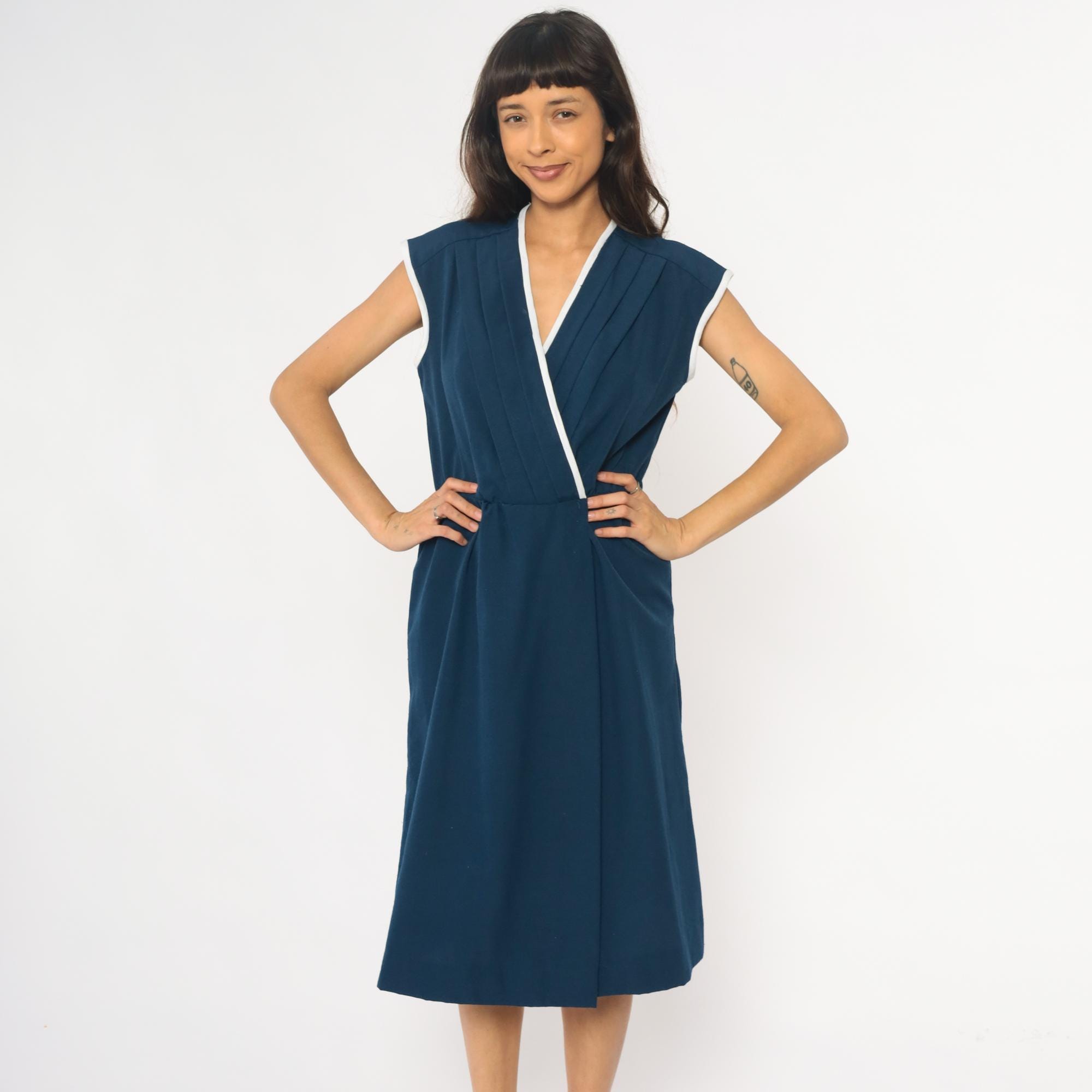 80s navy blue dress from toni todd with wrap-style bodice and white contrast trim along the neckline, sleeves, and closure. Diagonal pleated detail across the bodice, short cap sleeves, elastic gathered waist.