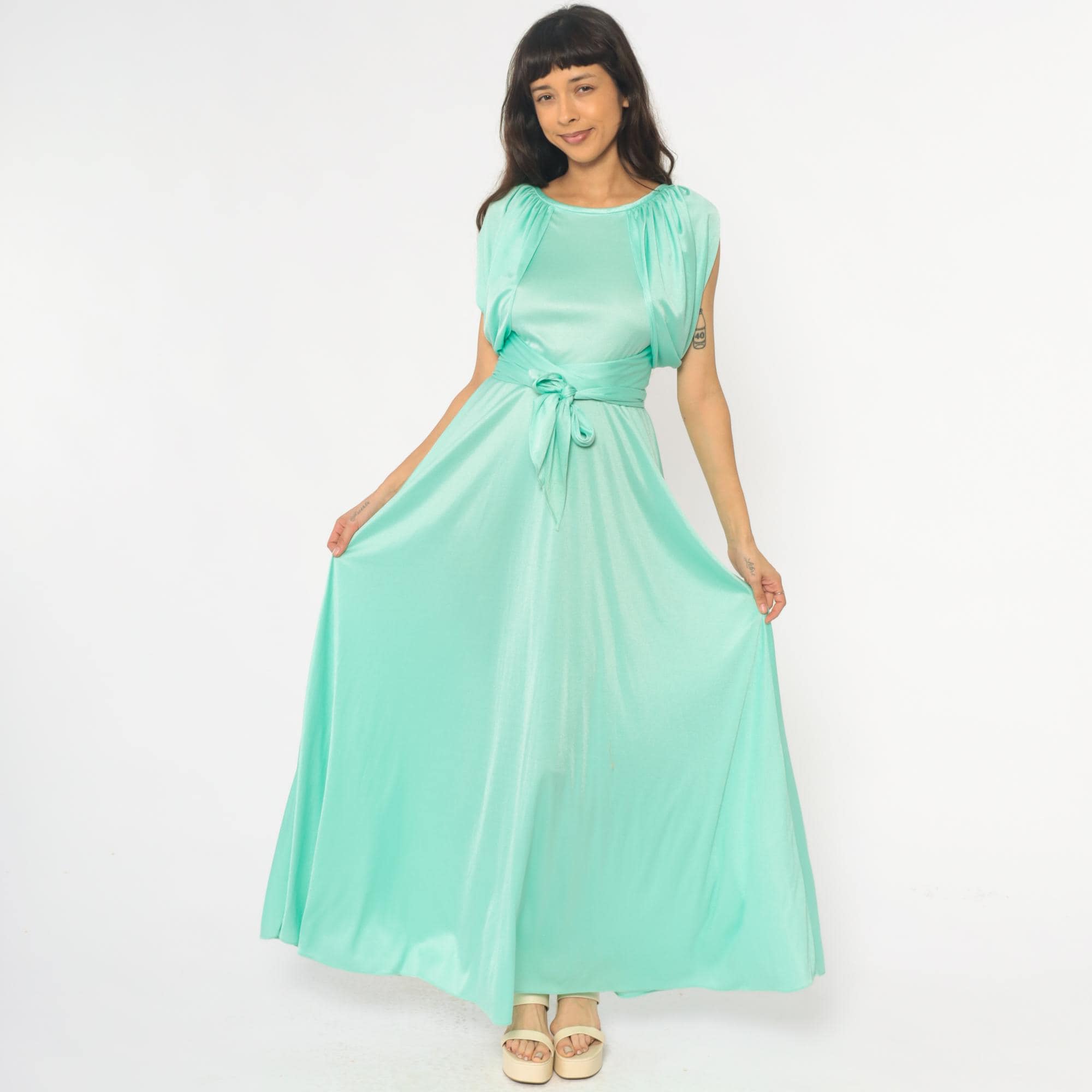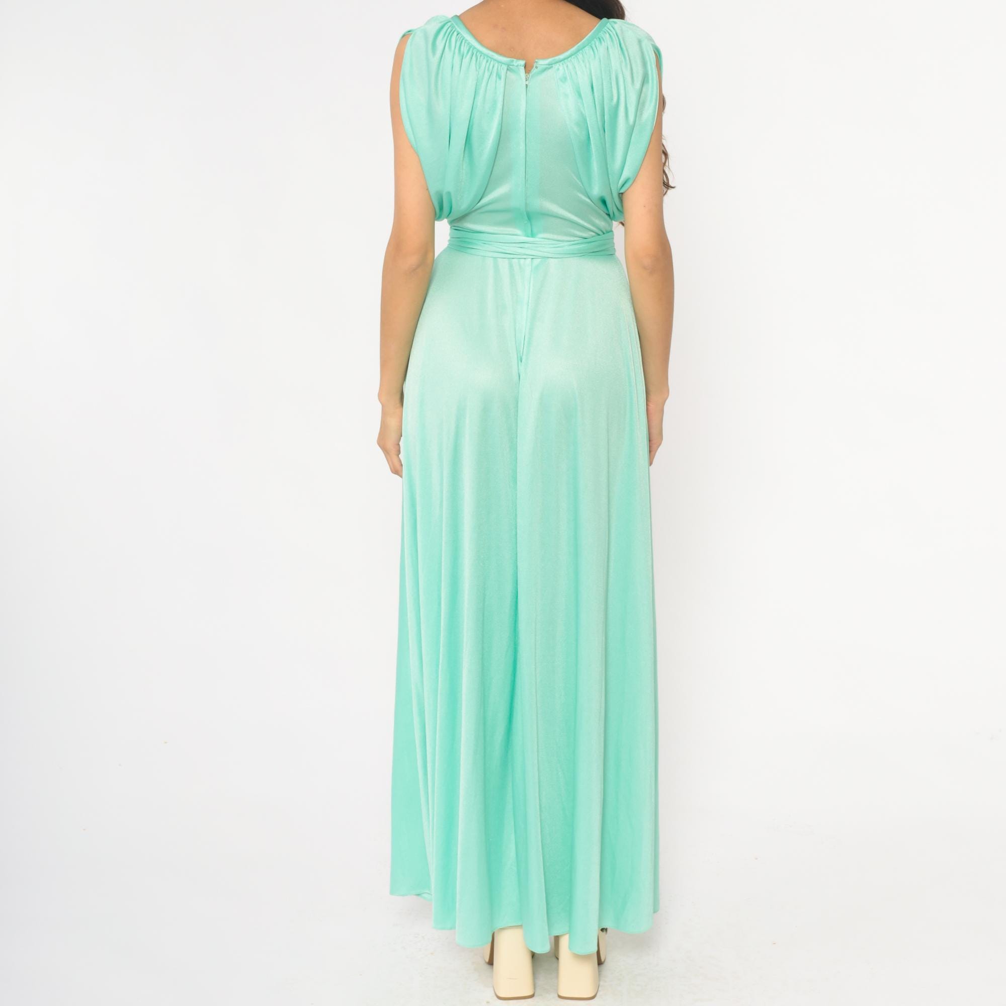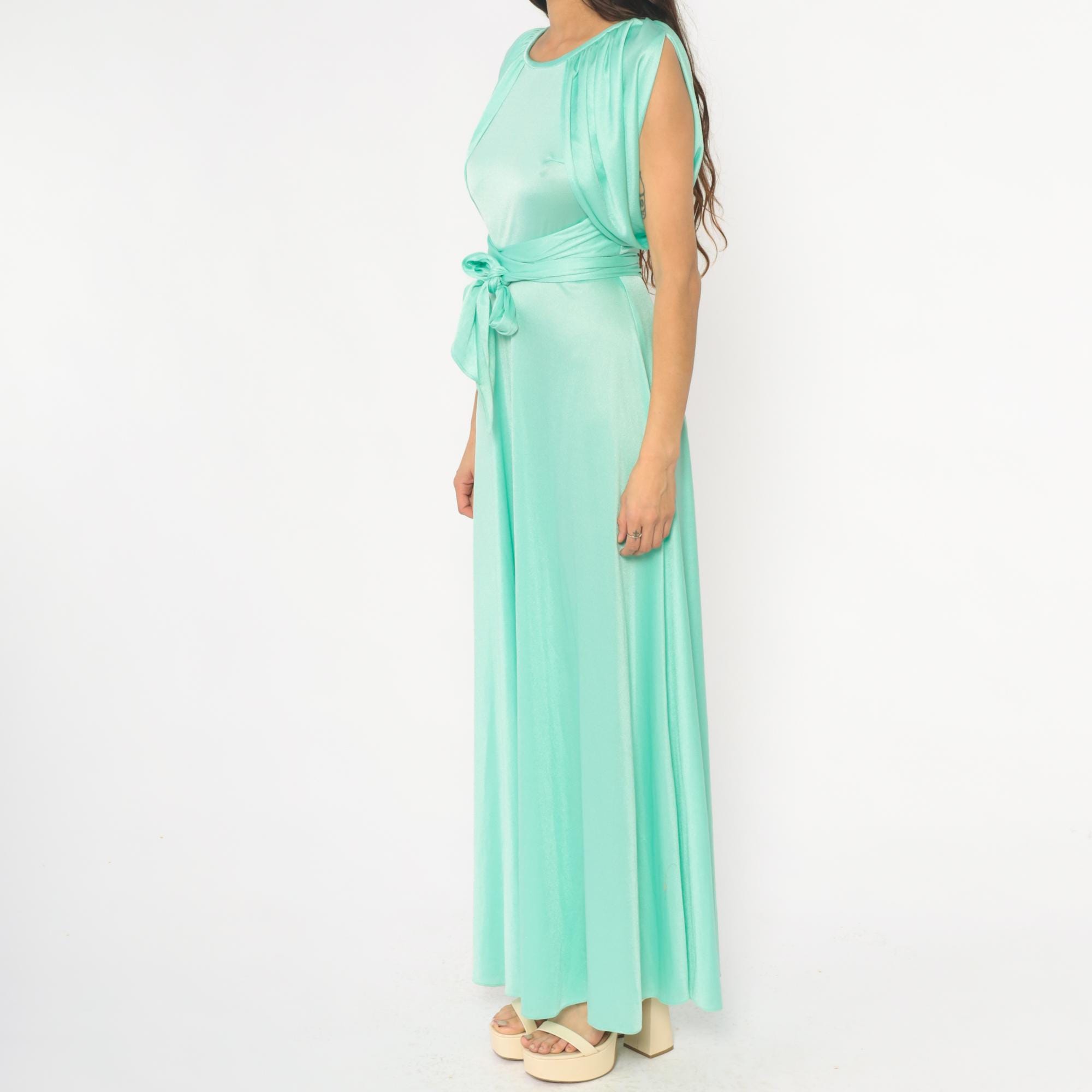 70s mint green maxi dress with gathered neckline creating ruched cap sleeve detail and matching fabric tie belt at waist. Sleeveless bodice with back zipper closure, floor-length skirt.