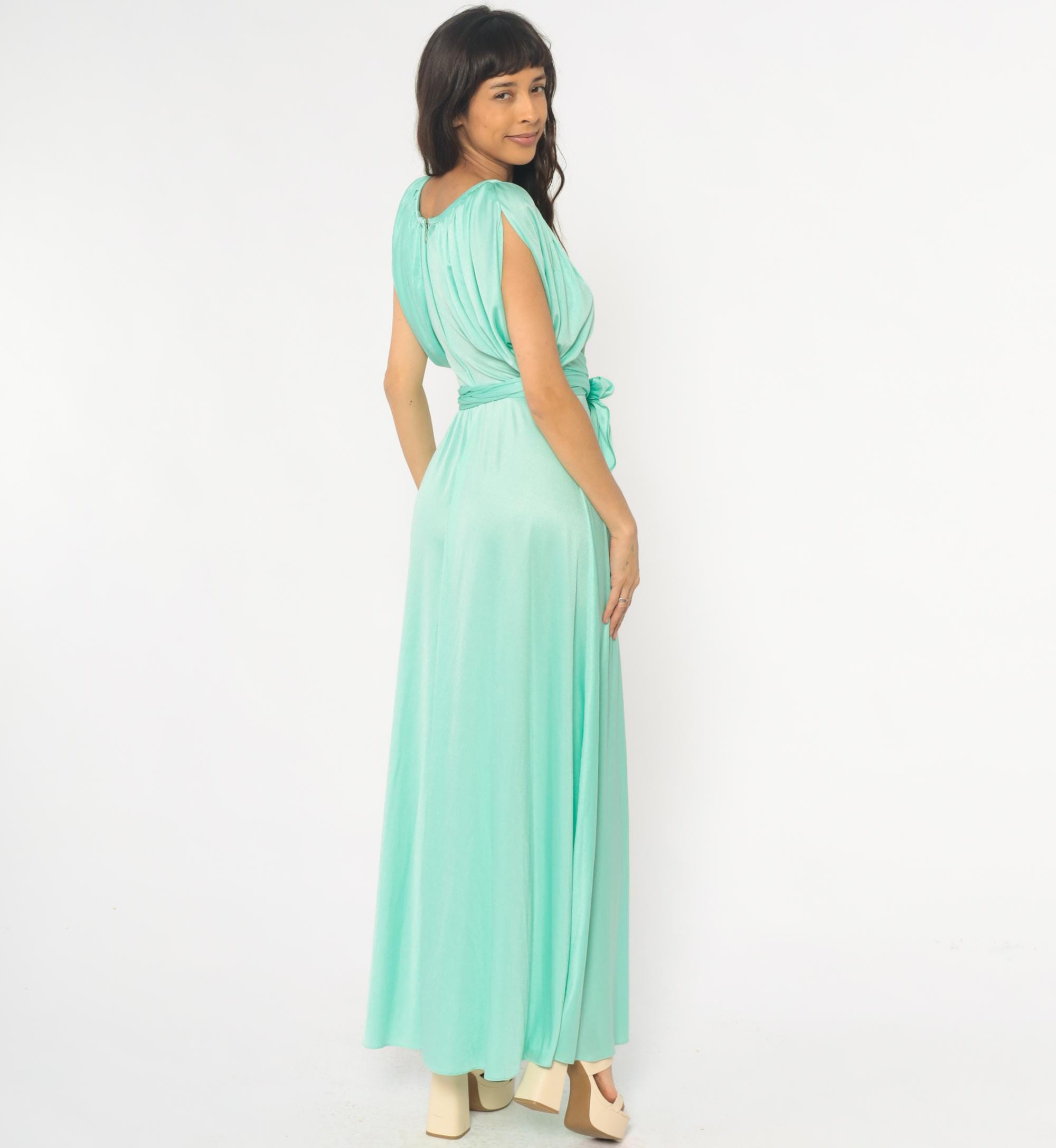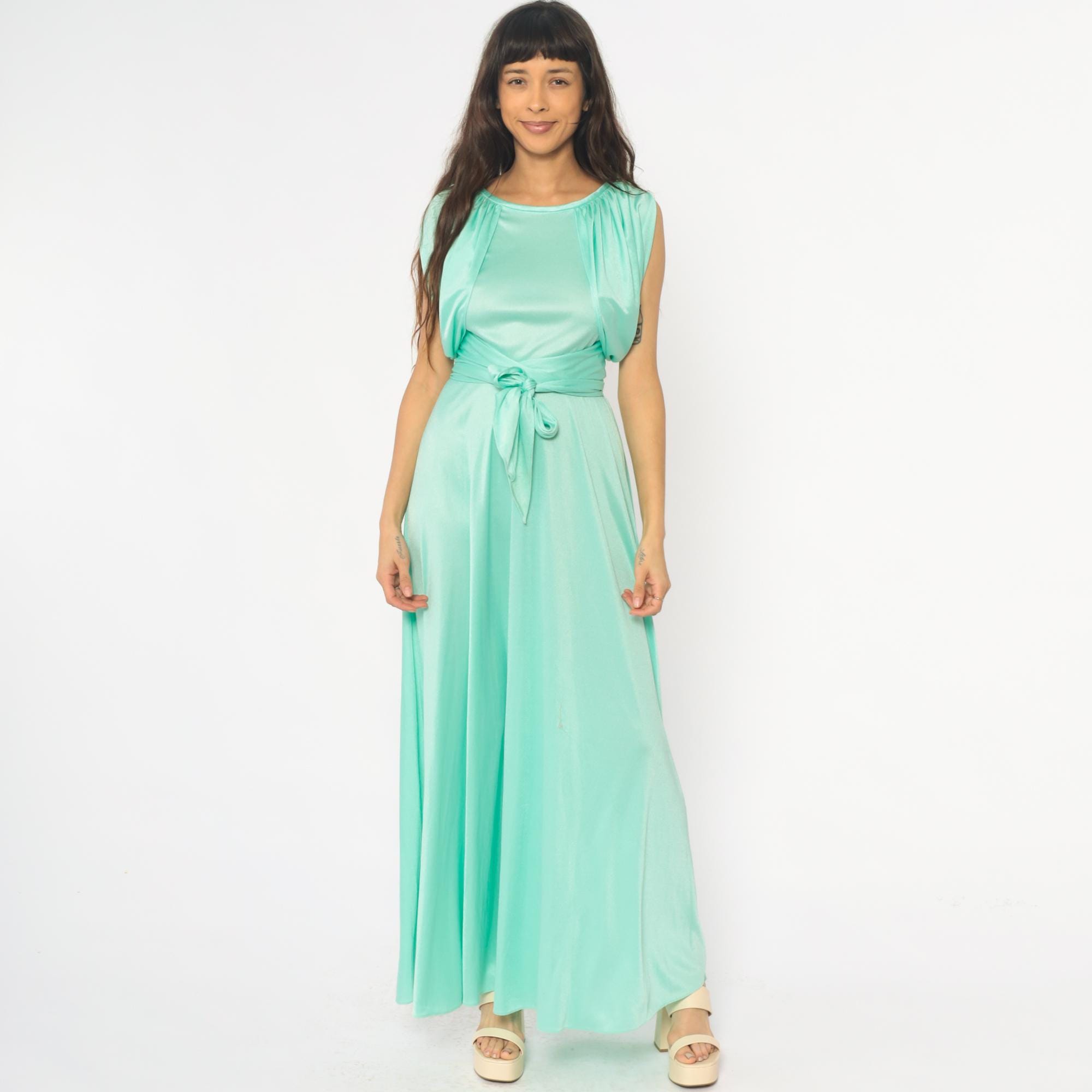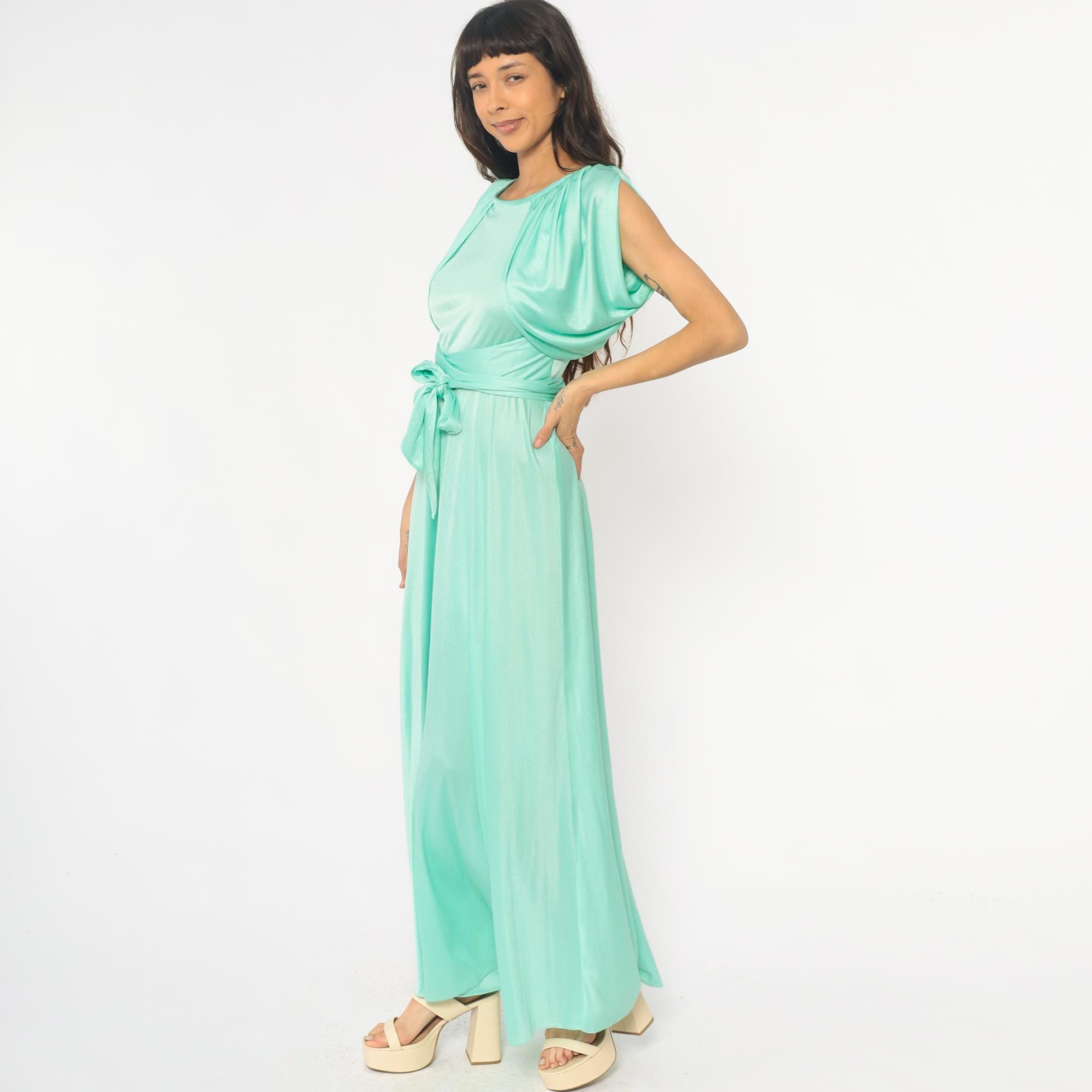 70s mint green maxi dress with gathered neckline creating ruched cap sleeve detail and matching fabric tie belt at waist. Sleeveless bodice with back zipper closure, floor-length skirt.