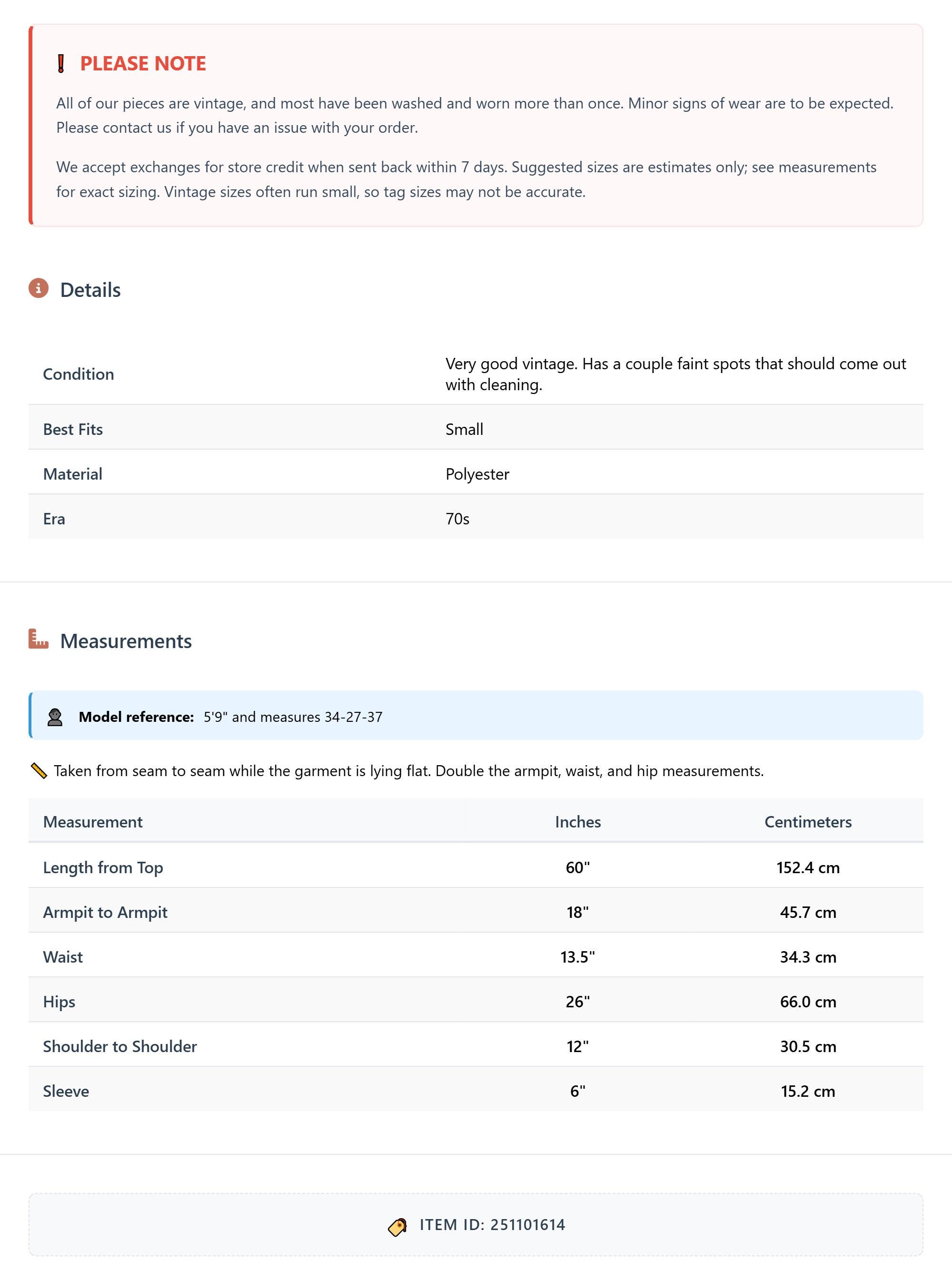 All of our pieces are vintage, and most have been washed and worn more than once. Minor signs of wear are to be expected. Please contact us if you have an issue with your order. We accept exchanges for store credit when sent back within 7 days.