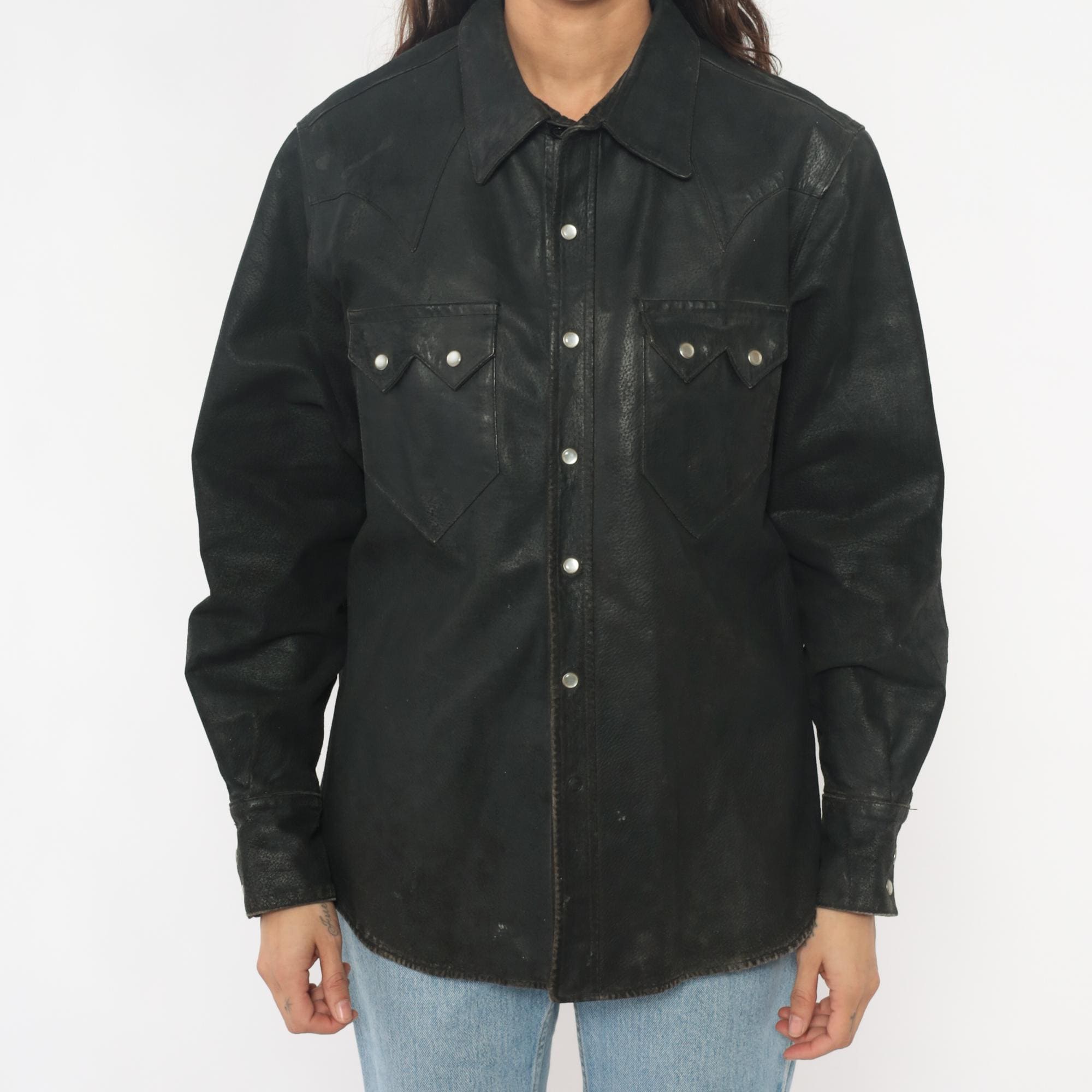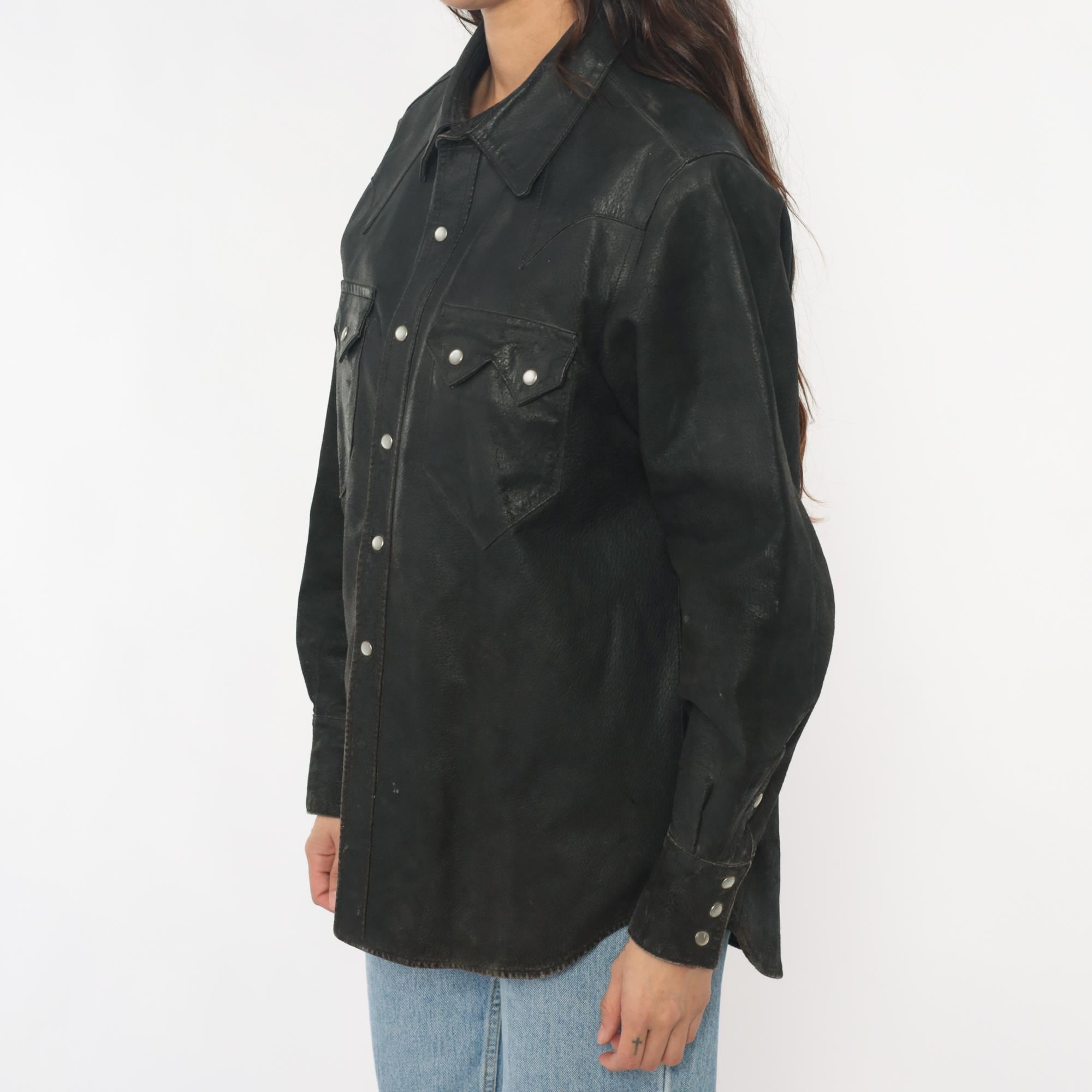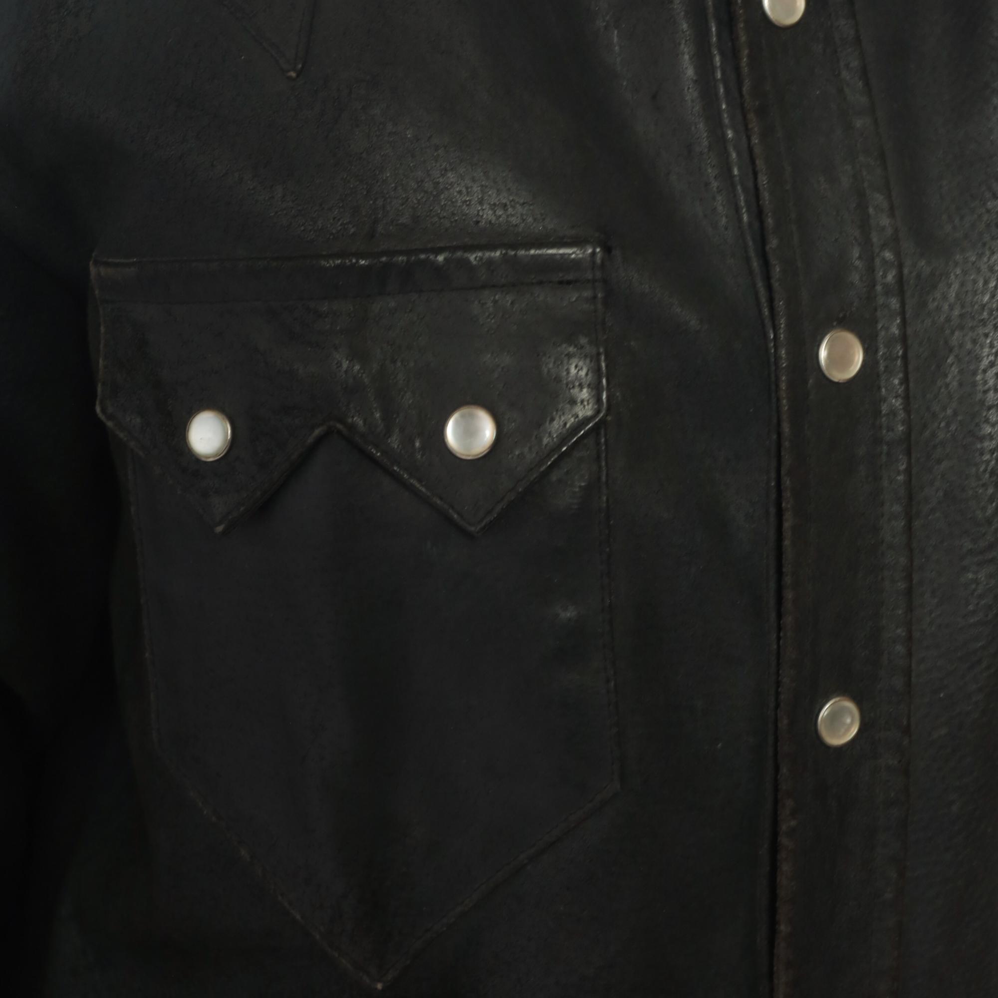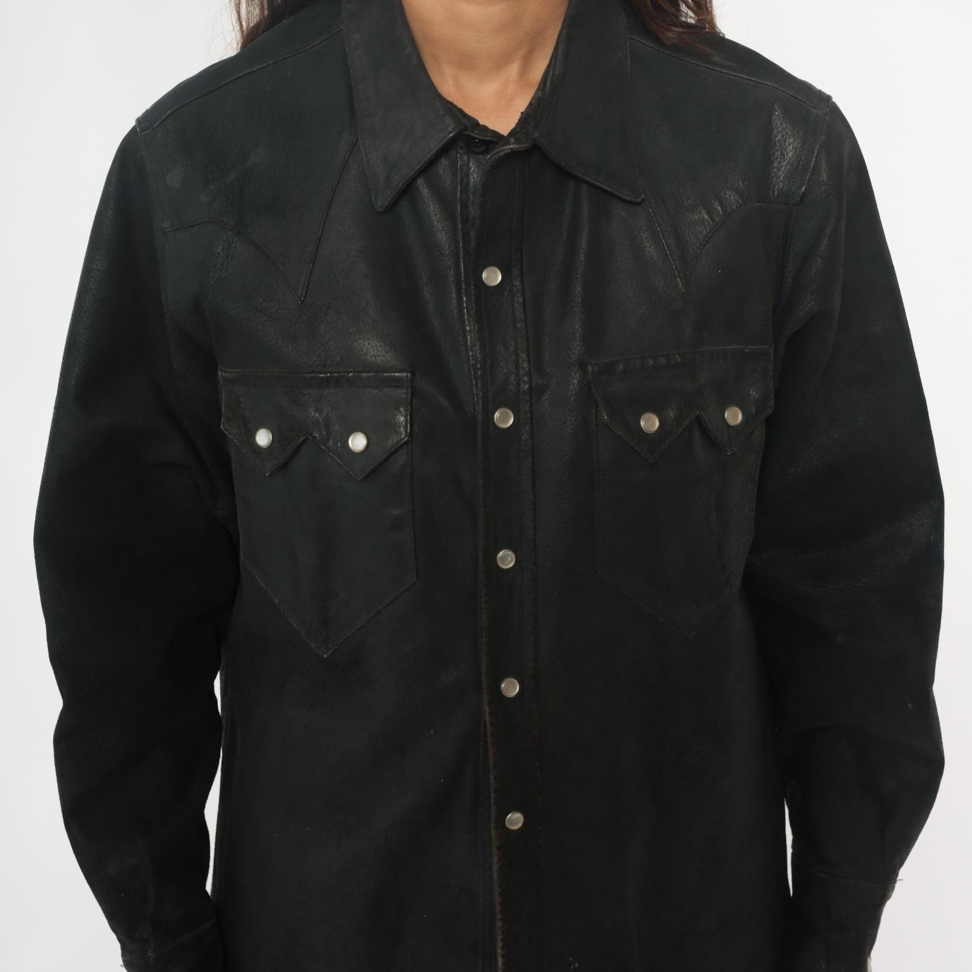 90s black leather Western shirt from neyries clothing with pointed yoke detailing across shoulders and back, snap front closure with silver snaps. Two chest pockets with pointed flaps and snap closures, pointed collar, long sleeves with snap cuffs.